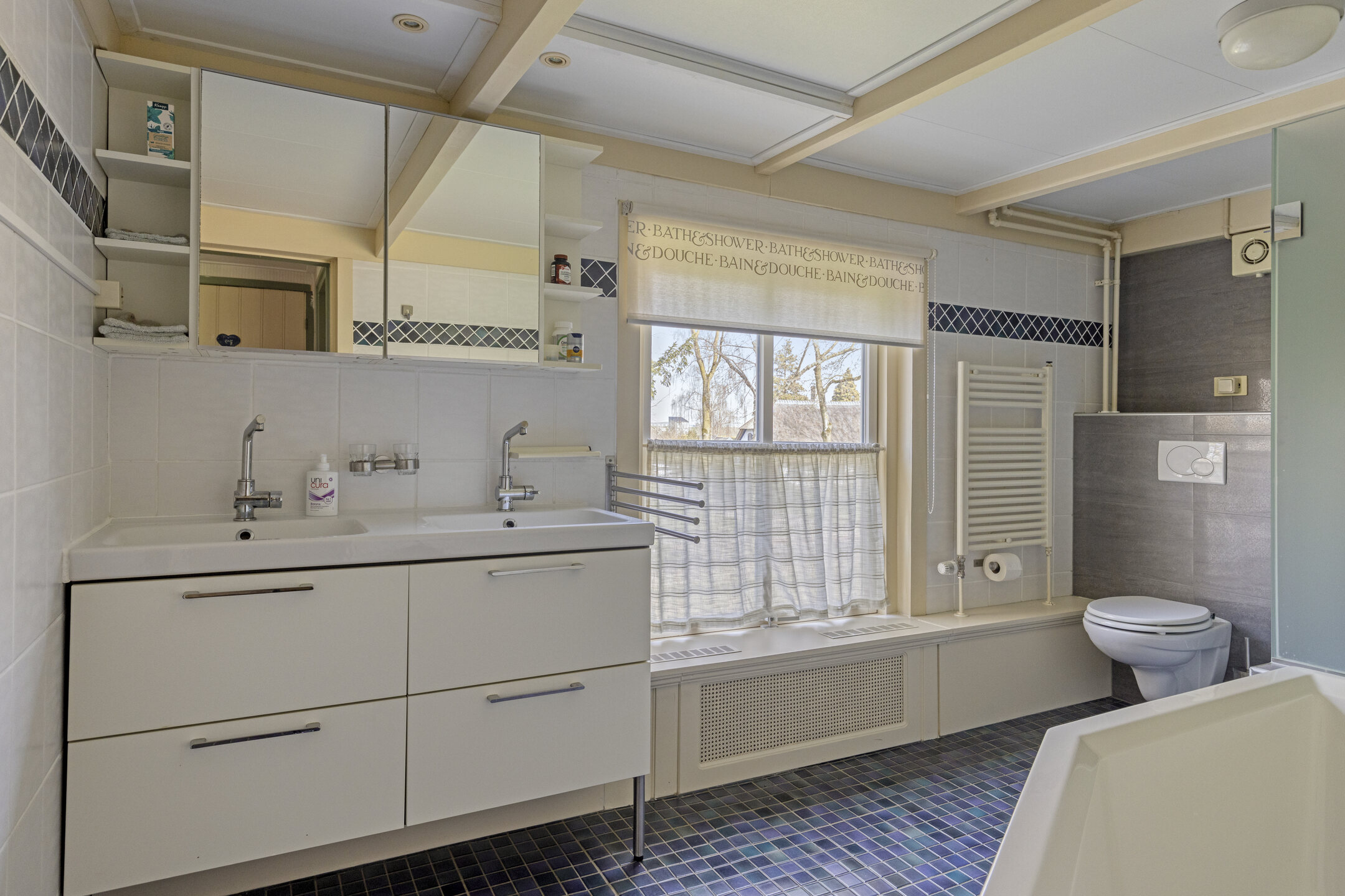 Op de eerste verdieping bevinden zich twee ruime slaapkamers, één voorzien van inbouwkast. De badkamer is compleet uitgevoerd met een dubbele wastafel met meubel, douche met sunshower, ligbad en toilet.