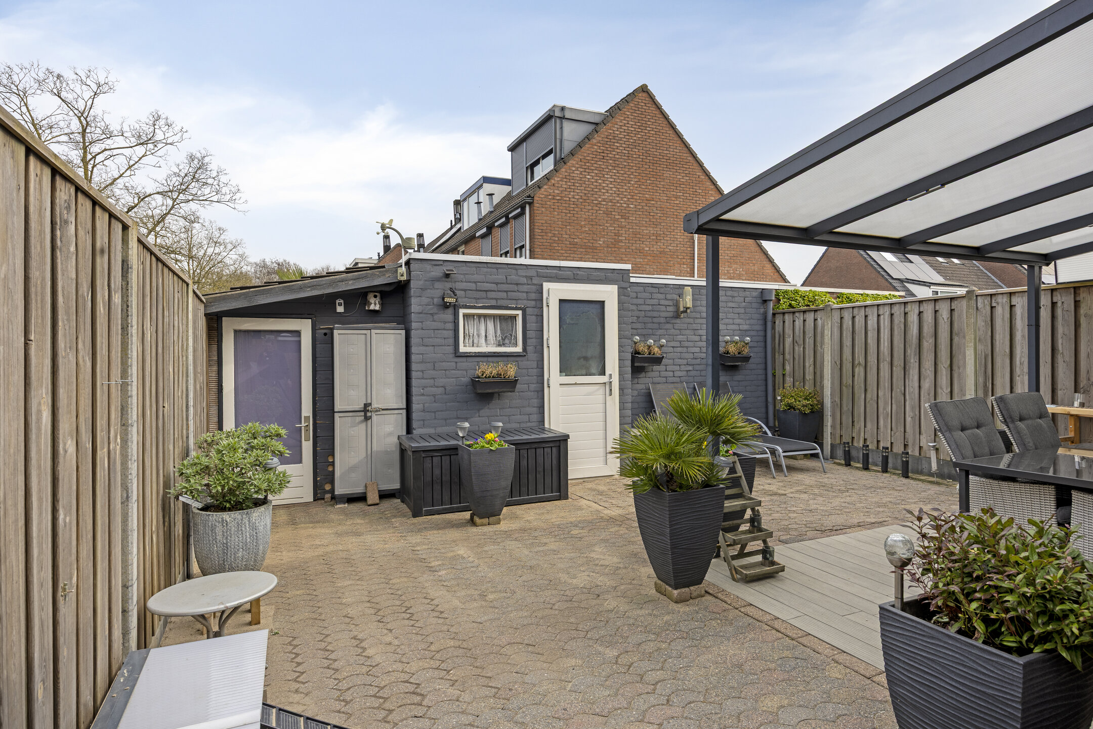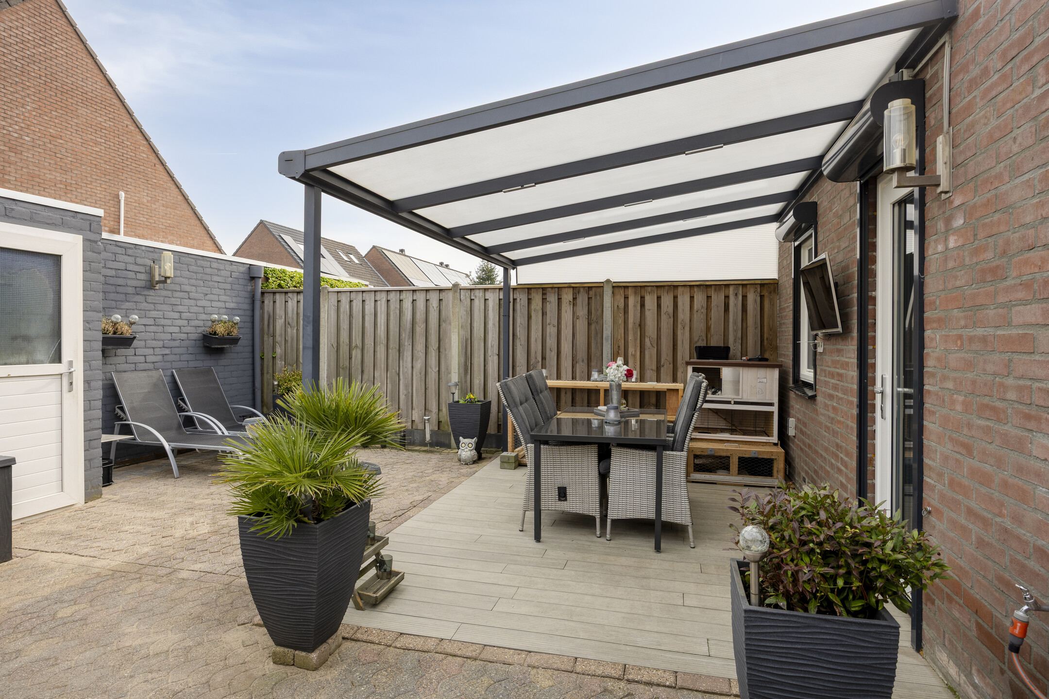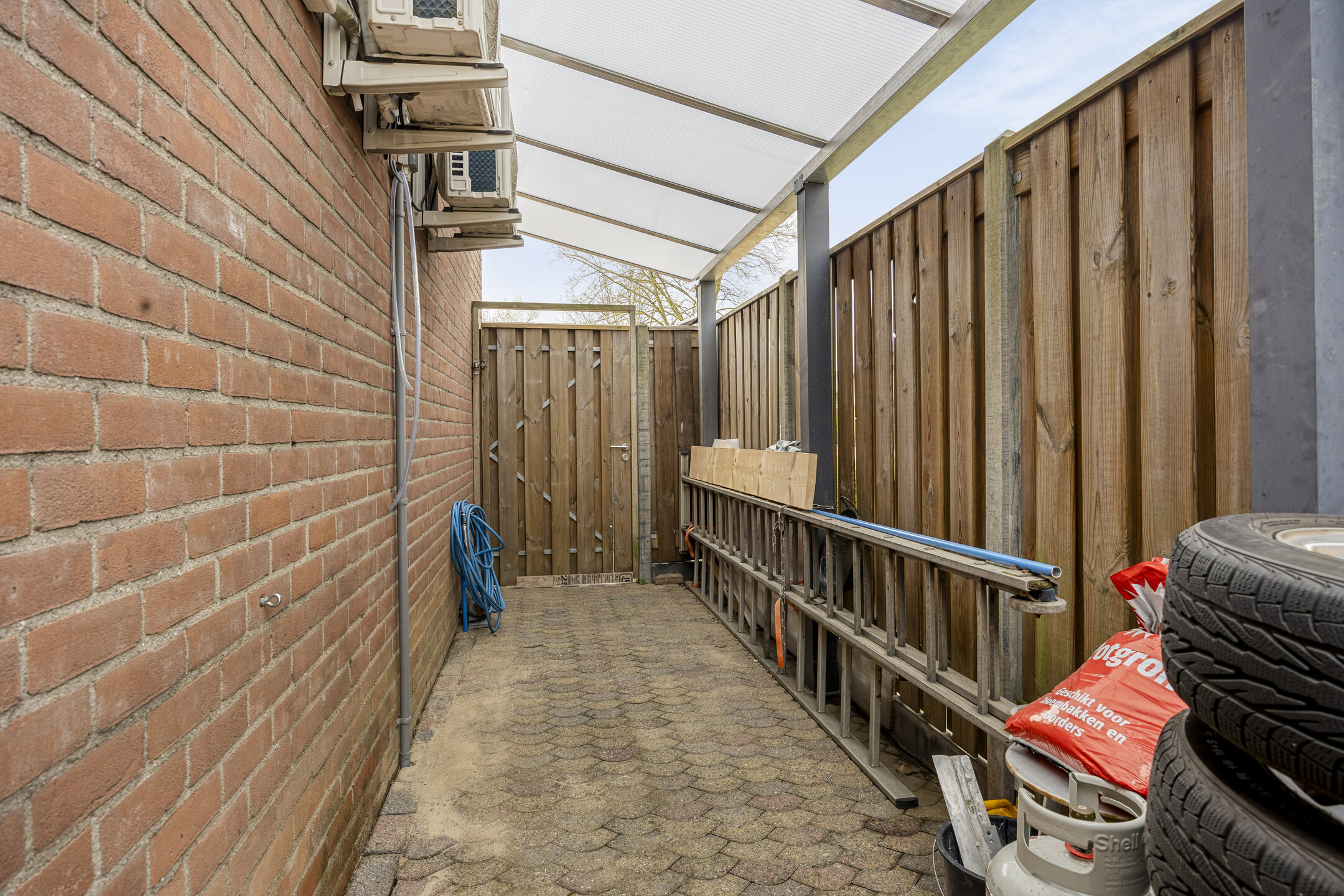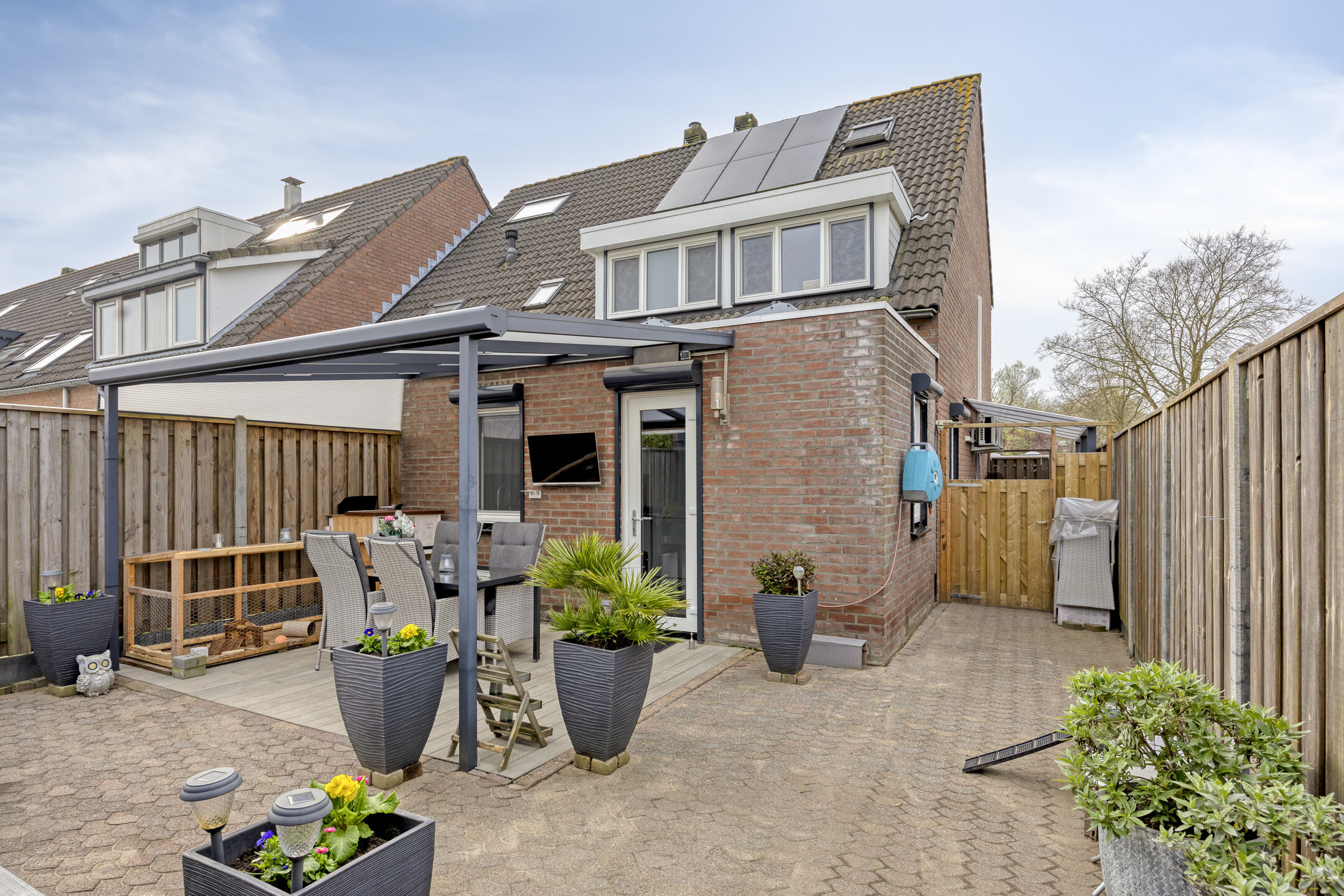 De woning beschikt over een voortuin met oprit, voldoende ruimte voor twee auto’s. De achtertuin ligt op het noorden en is voorzien van twee bergingen. De zijtuin met poort biedt tevens een praktische toegang tot de berging om eventueel de fietsen in te plaatsen.