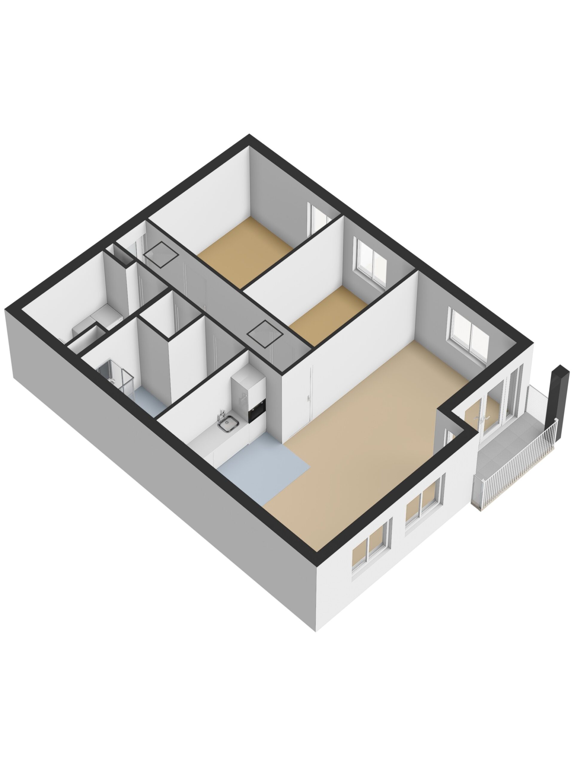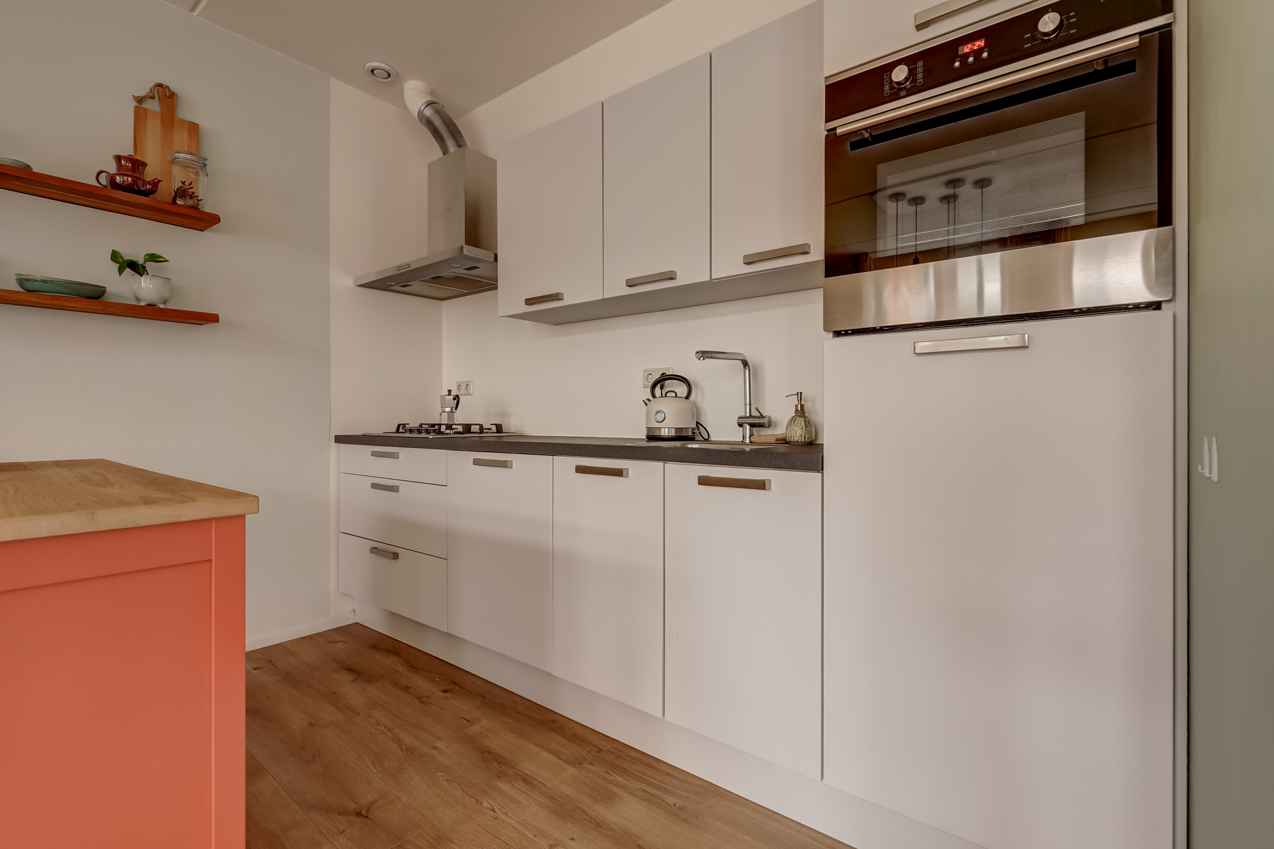 Vervolgens bereik je de lichte woonkamer, waar de openslaande deuren zorgen voor een directe verbinding met de loggia — een fijne plek om te genieten van de ochtendzon of even tot rust te komen na een lange dag. De open keuken staat in wandopstelling en is voorzien van diverse inbouwapparatuur, waaronder een vaatwasser, 4-pits gaskookplaat, afzuigkap, spoelbak, koelkast en oven.