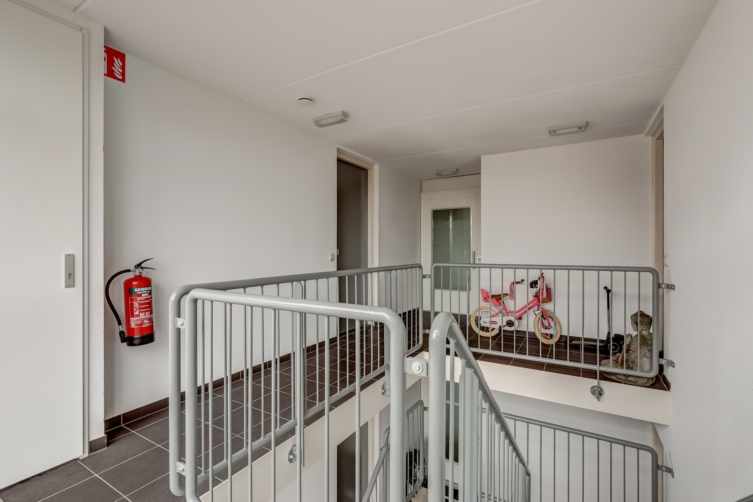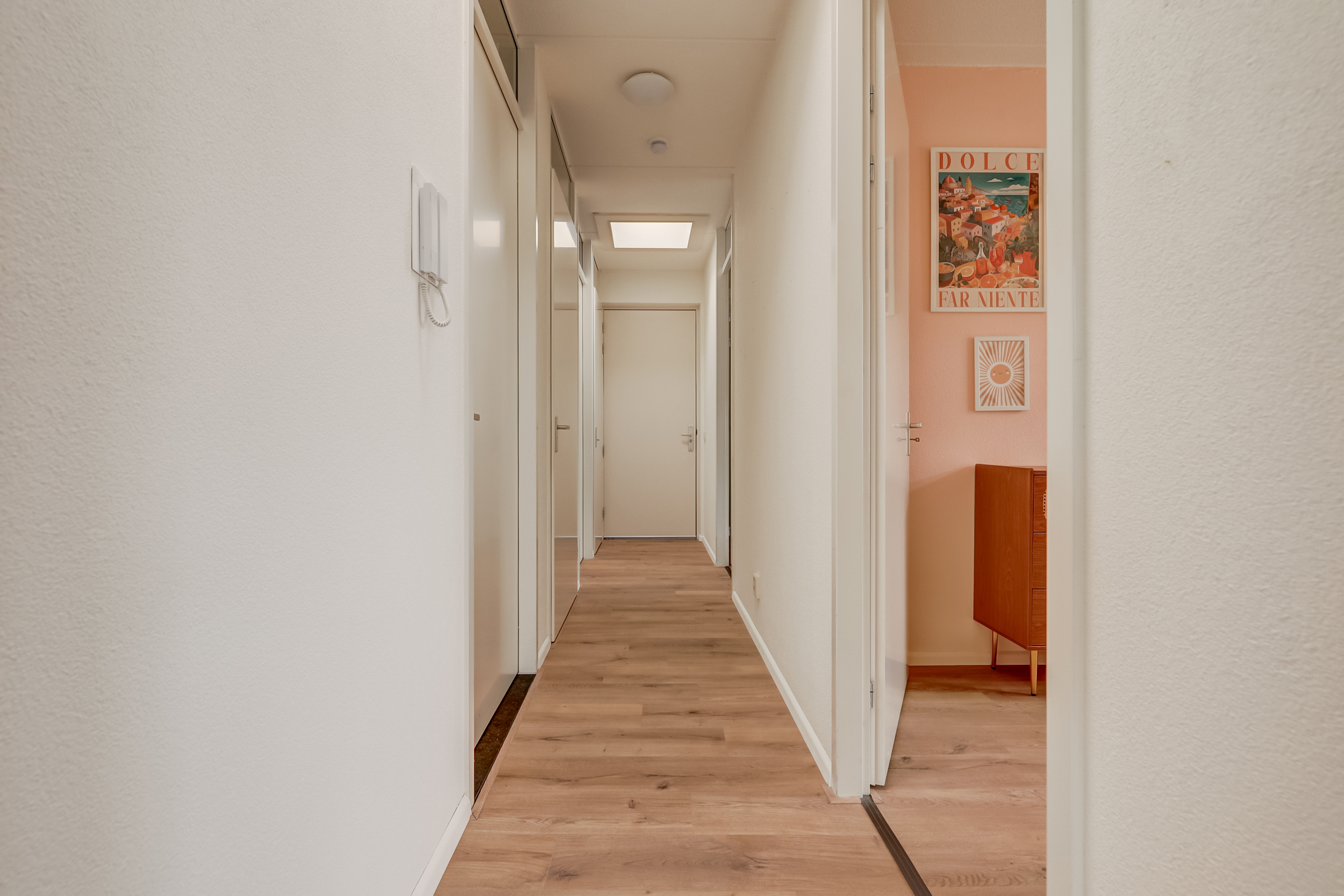 Via de gezamenlijke entree met brievenbussen, intercom, trappenhuis en lift kom je uit op de tweede verdieping van het complex. Achter de voordeur valt meteen op hoeveel licht er binnenvalt door de aanwezige lichtkoepel. De hal vormt het hart van de woning en geeft toegang tot alle vertrekken.