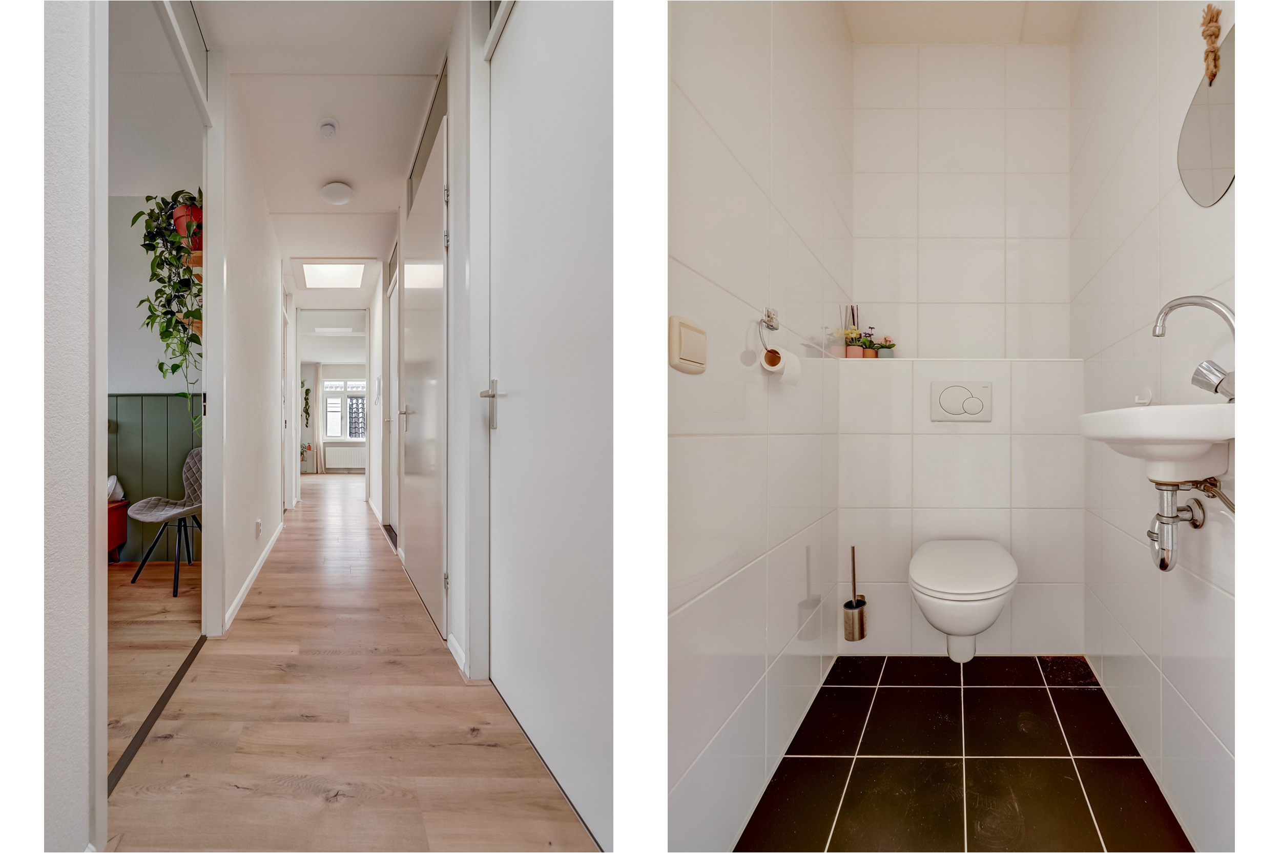 Aan de rechterzijde bevindt zich de berging met opstelplaats voor de cv-ketel (Remeha, eigendom) en aansluitingen voor witgoed en direct daarnaast het toilet met fontein. De badkamer die daar op volgt is praktisch ingericht met een douche en wastafel. De twee slaapkamers liggen aan de voorzijde van het appartement; de hoofdslaapkamer is ruim van formaat, de tweede kamer is perfect te gebruiken als logeer-/werk- of hobbykamer.