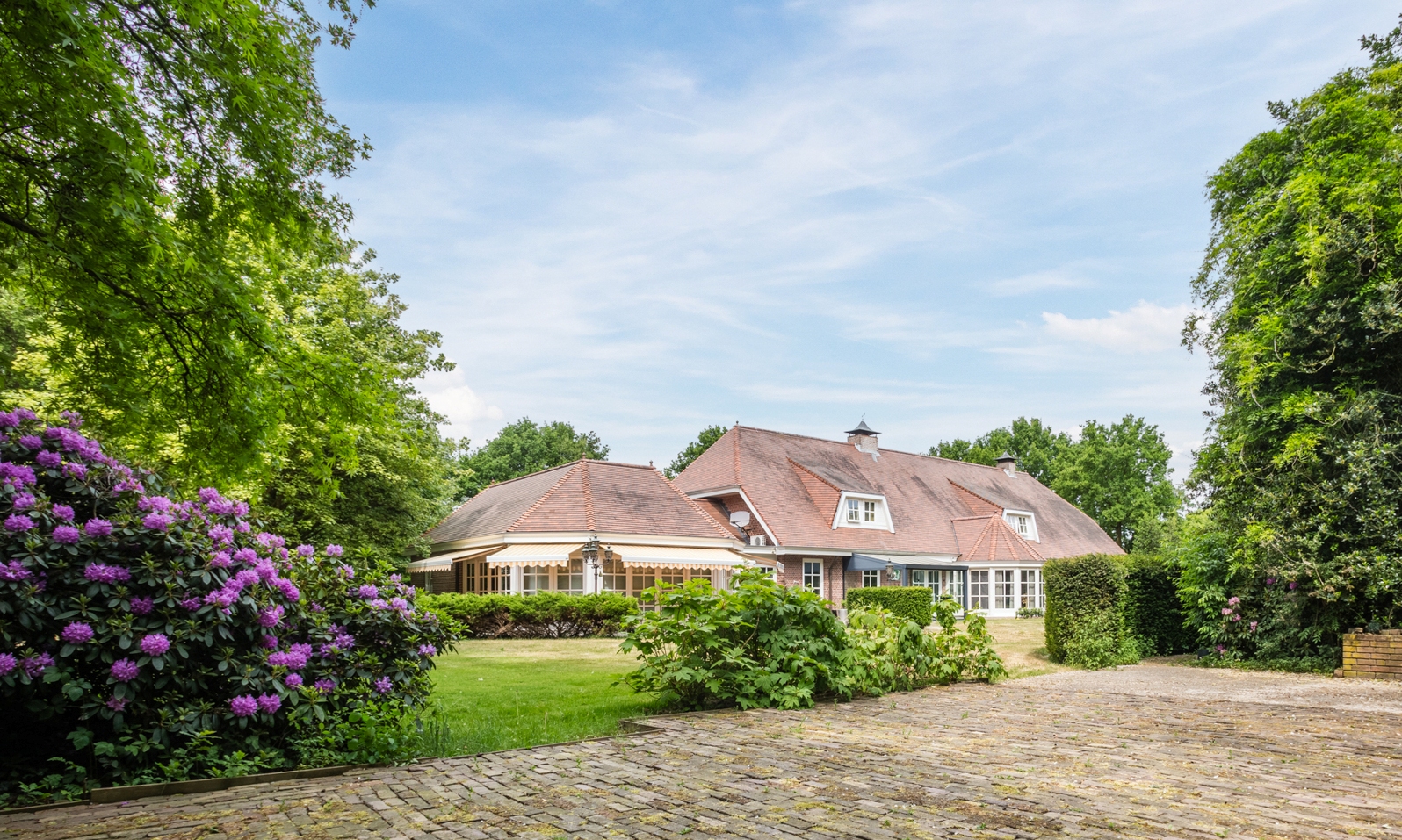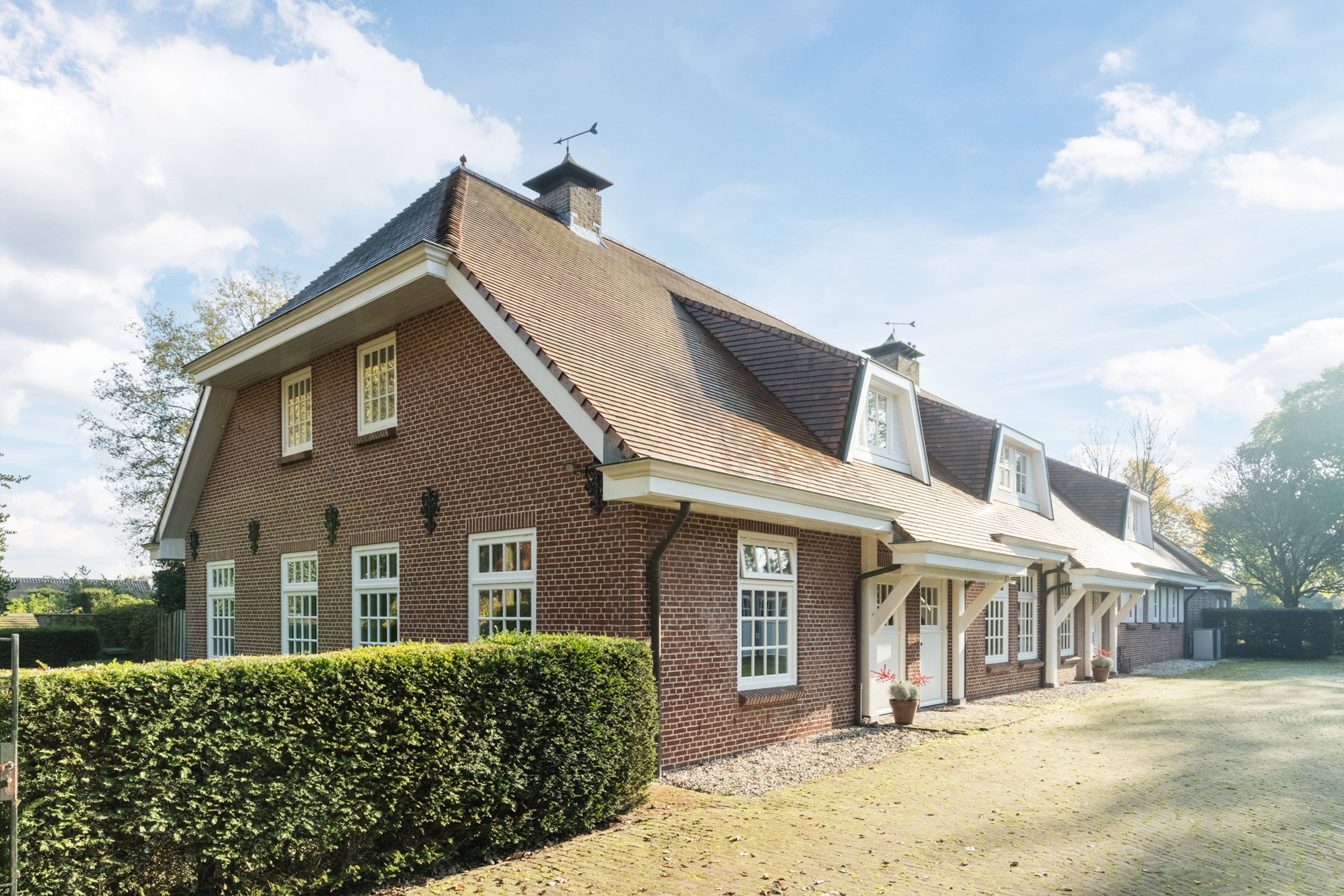 De voorzijde van het landhuis ademt warmte en stijl.