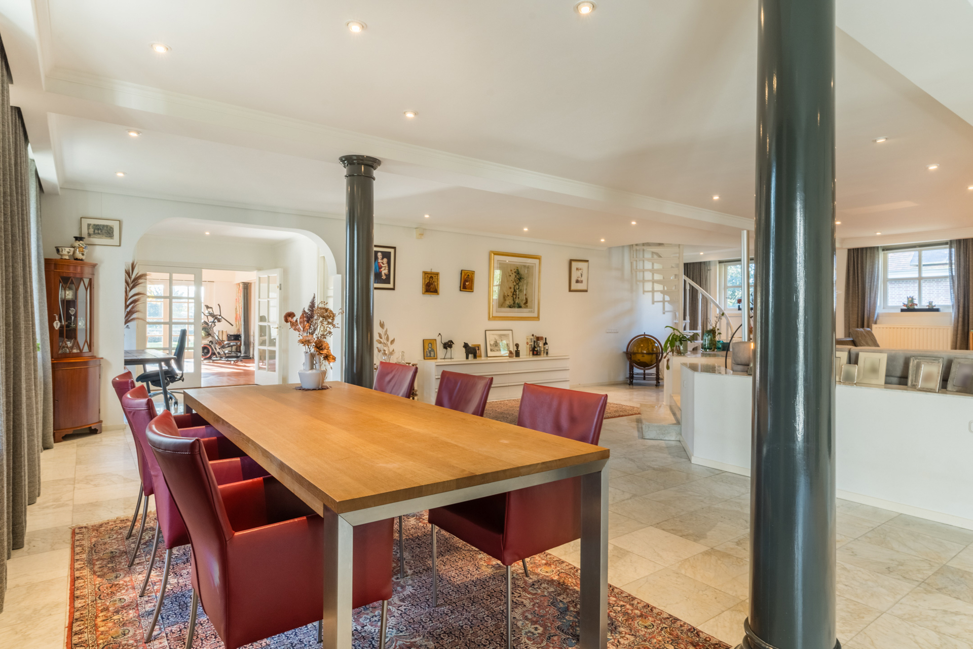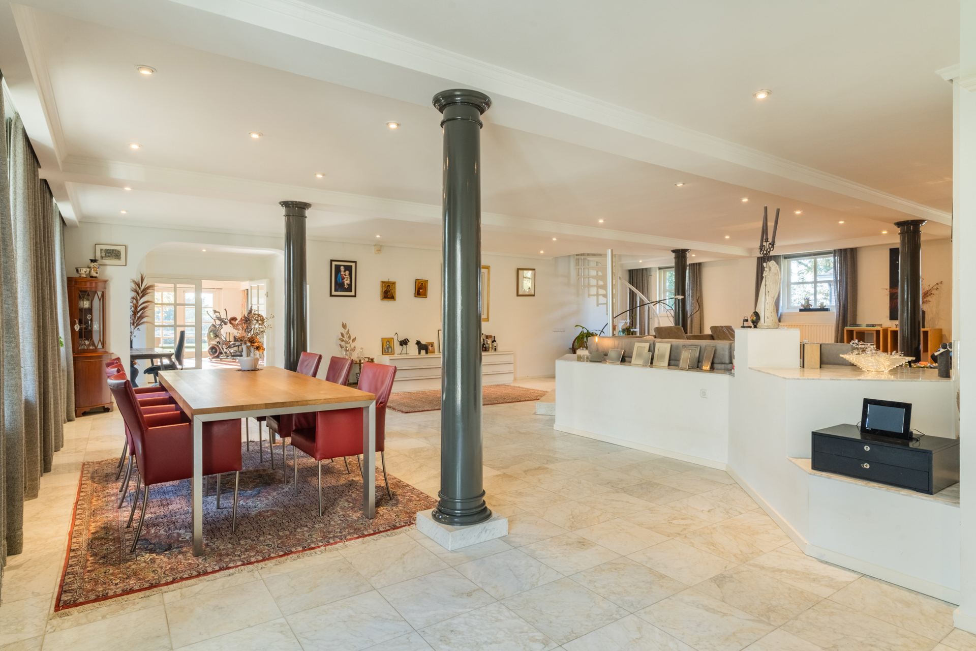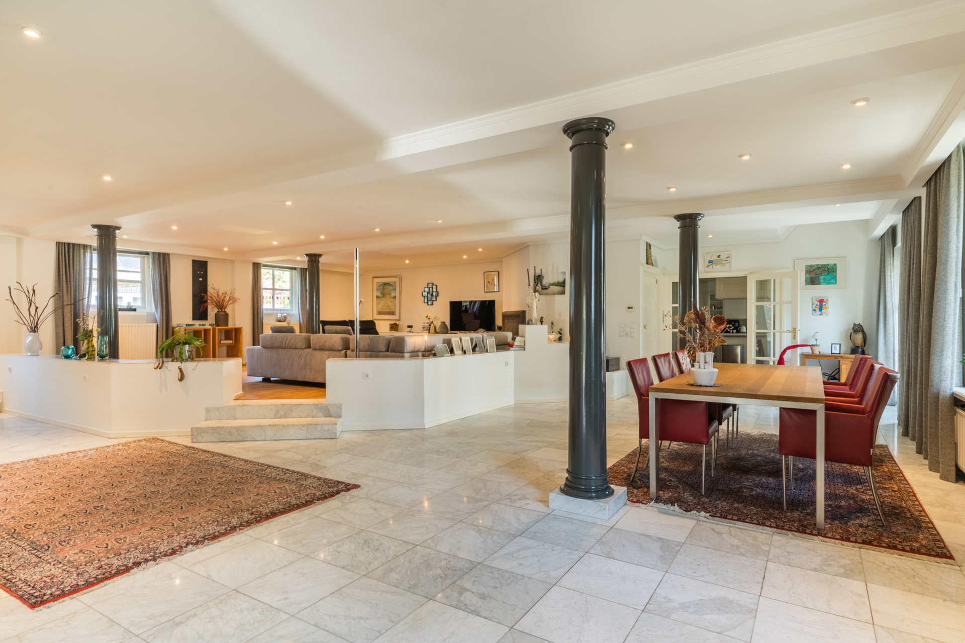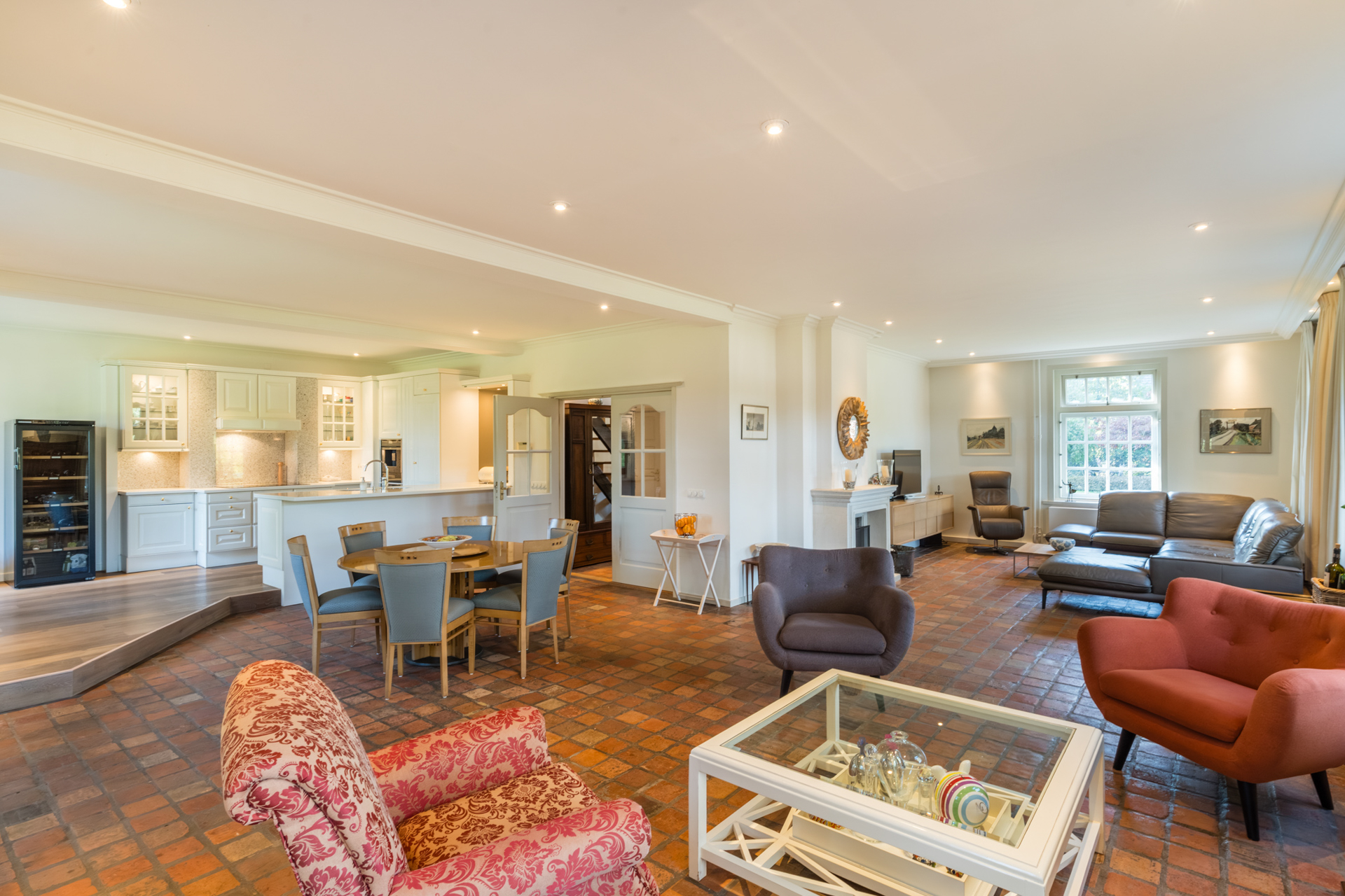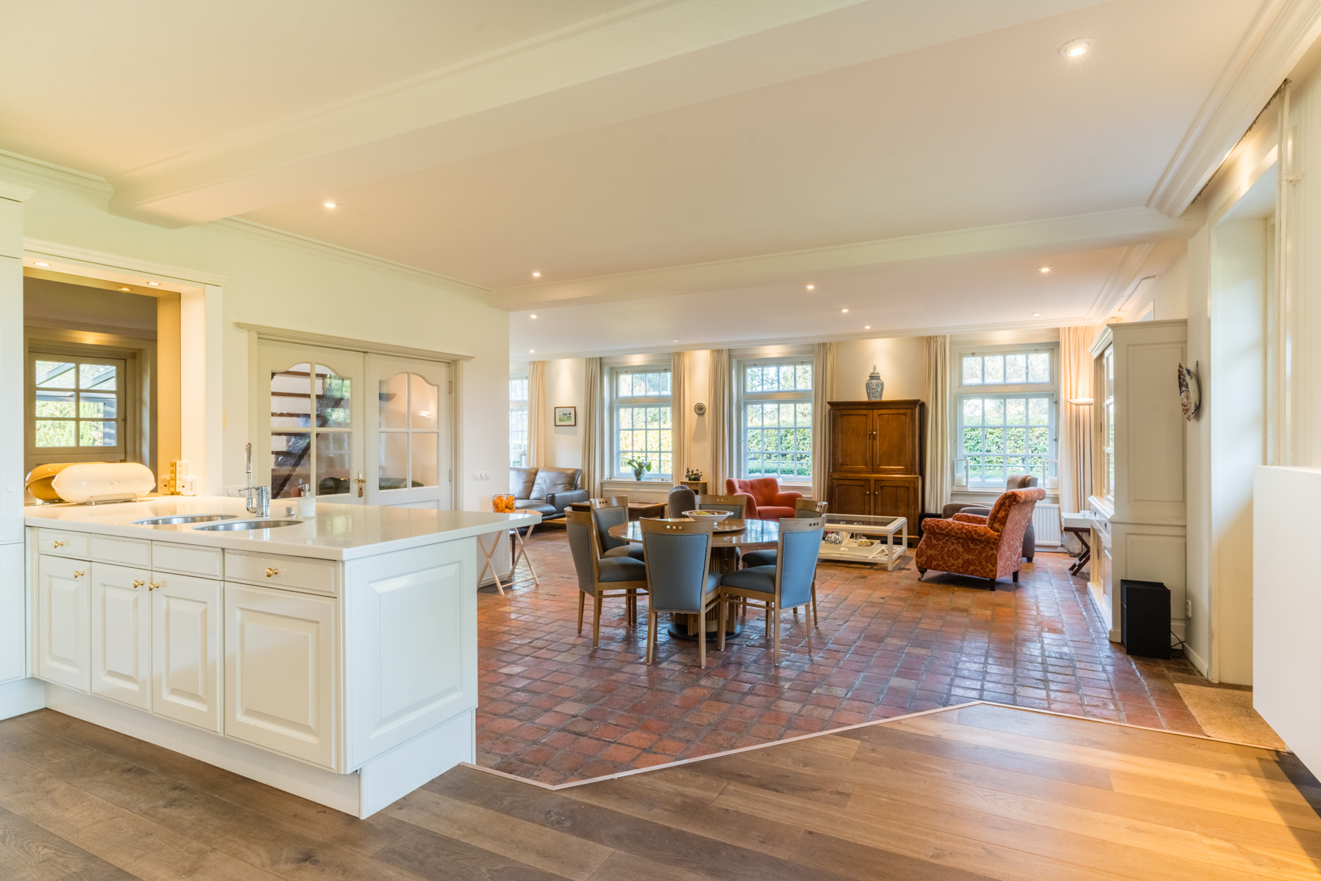 De keuken loopt over in een lichte ronde serre, een elegante eetkamer en een verhoogd zitgedeelte met marmeren en parketvloeren.