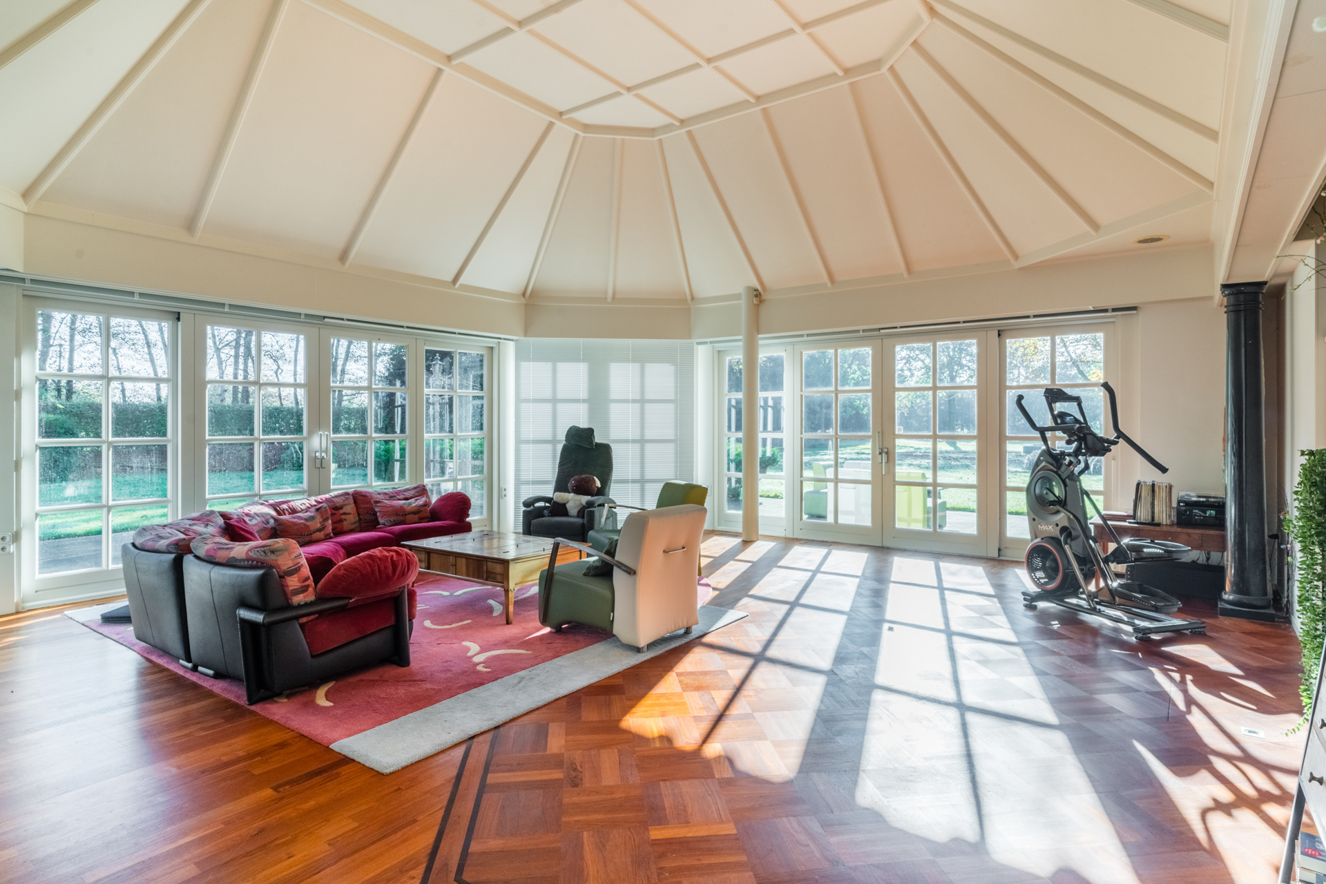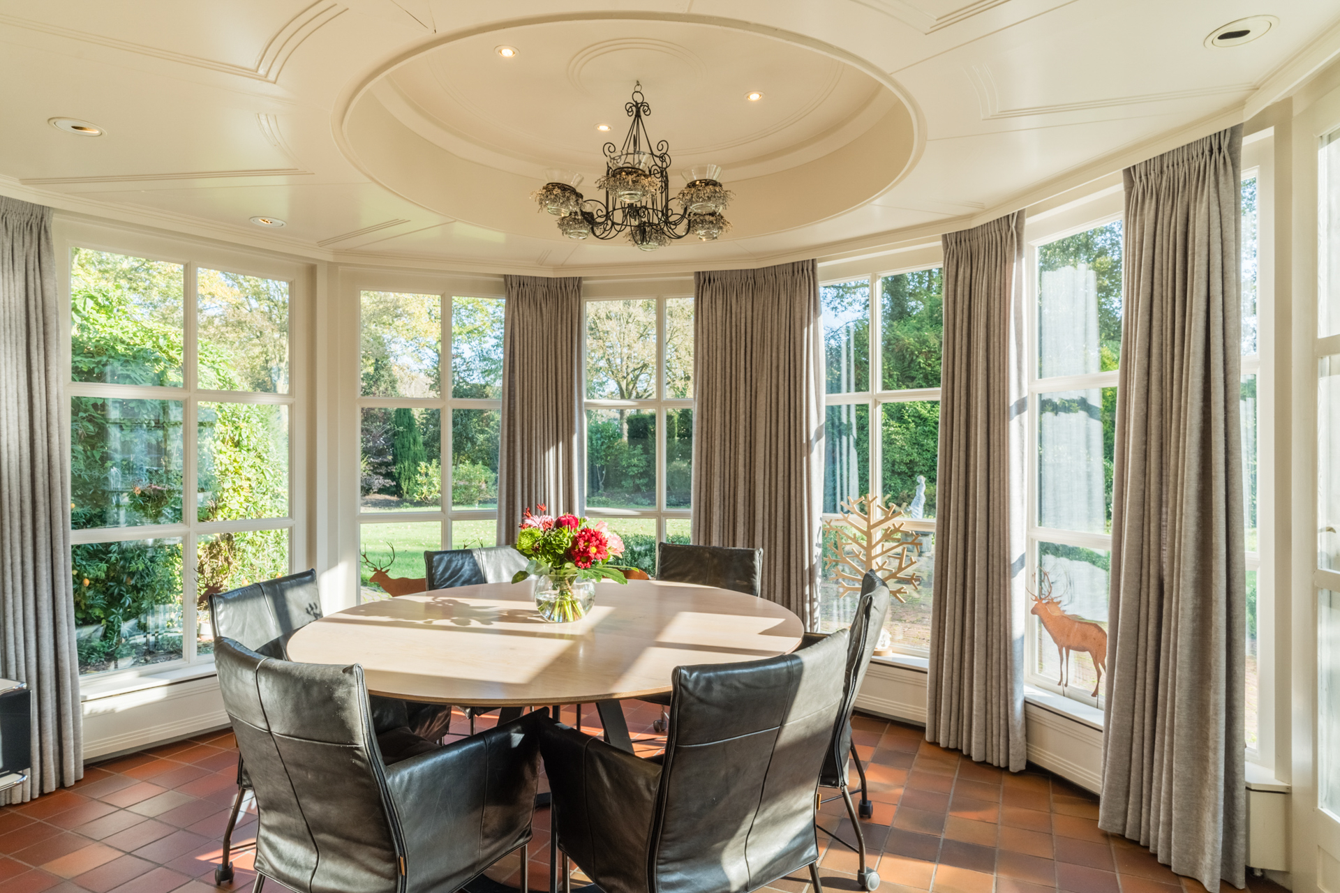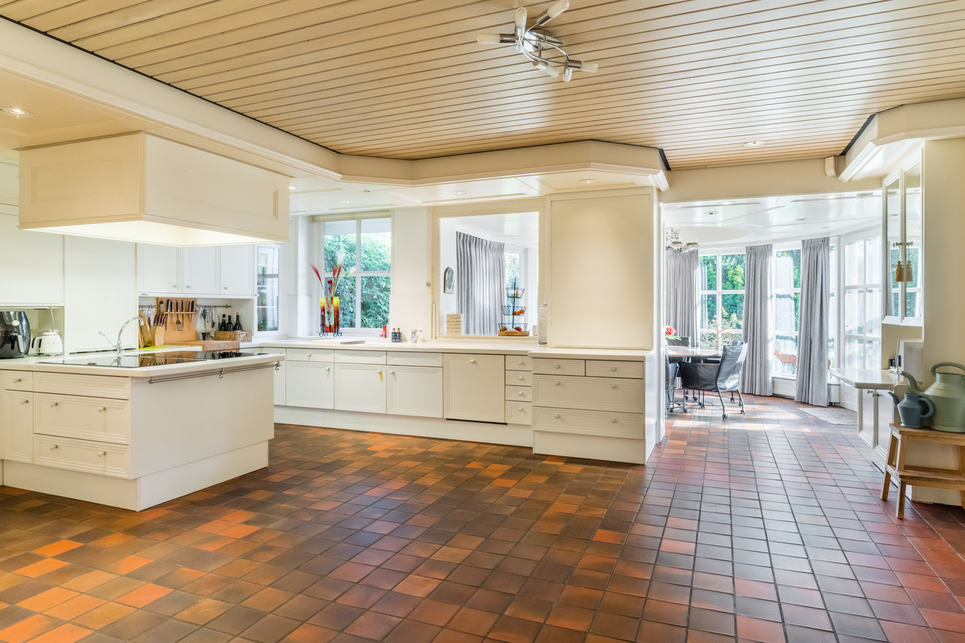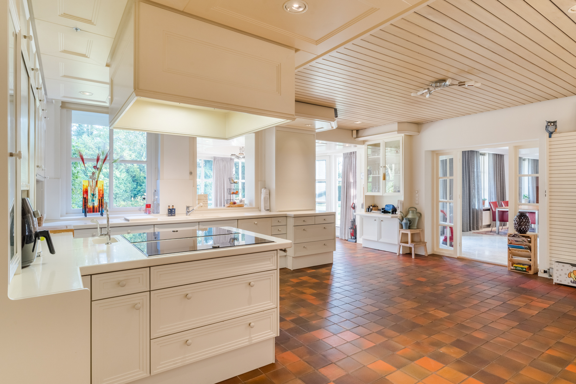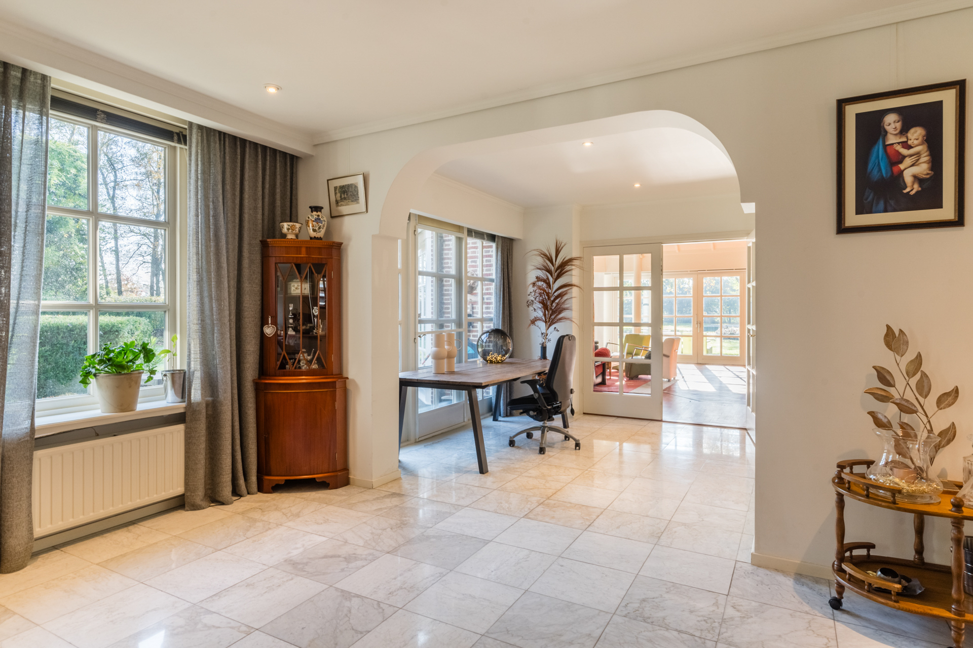 De keuken loopt over in een lichte ronde serre, een elegante eetkamer en een verhoogd zitgedeelte met marmeren en parketvloeren.