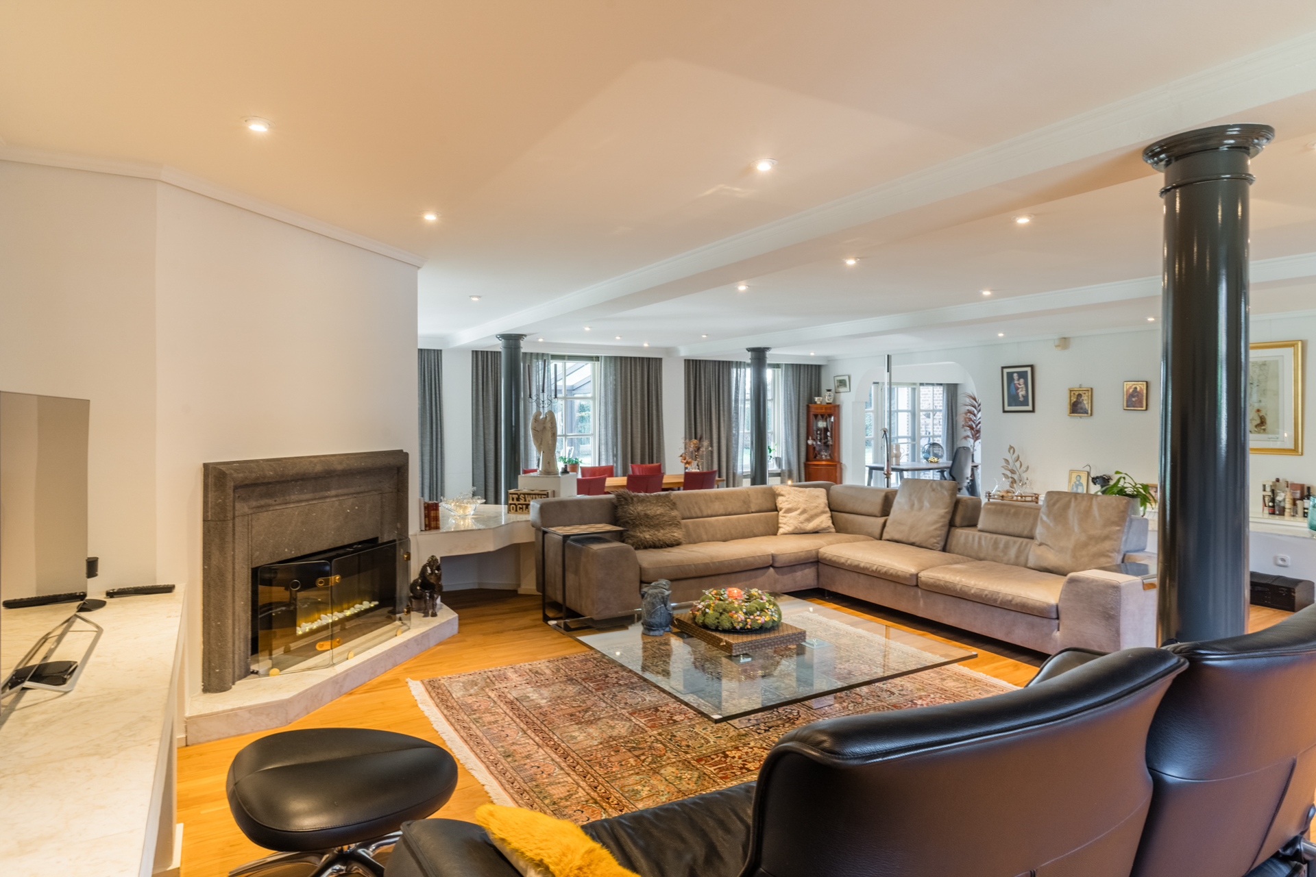Aan de achterzijde bevindt zich een moderner woonconcept met een indrukwekkende Bulthaup-keuken, voorzien van dubbele inductiekookplaten, ovens, koffiemachine en wijnkoelkast.