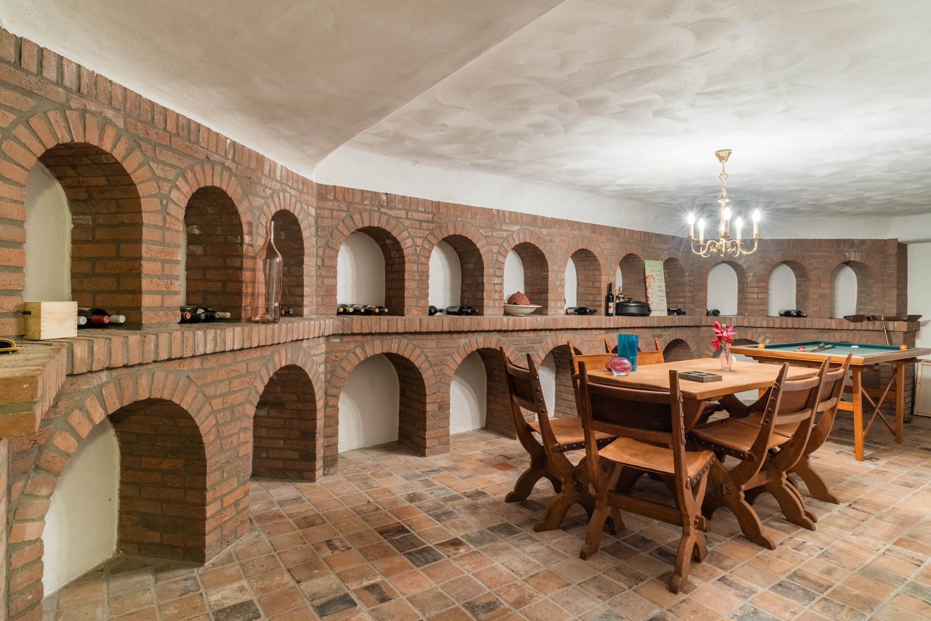 De kelder omvat een stijlvolle recreatieruimte, wijnopslag en de technische installatie voor zwembad en beregening.