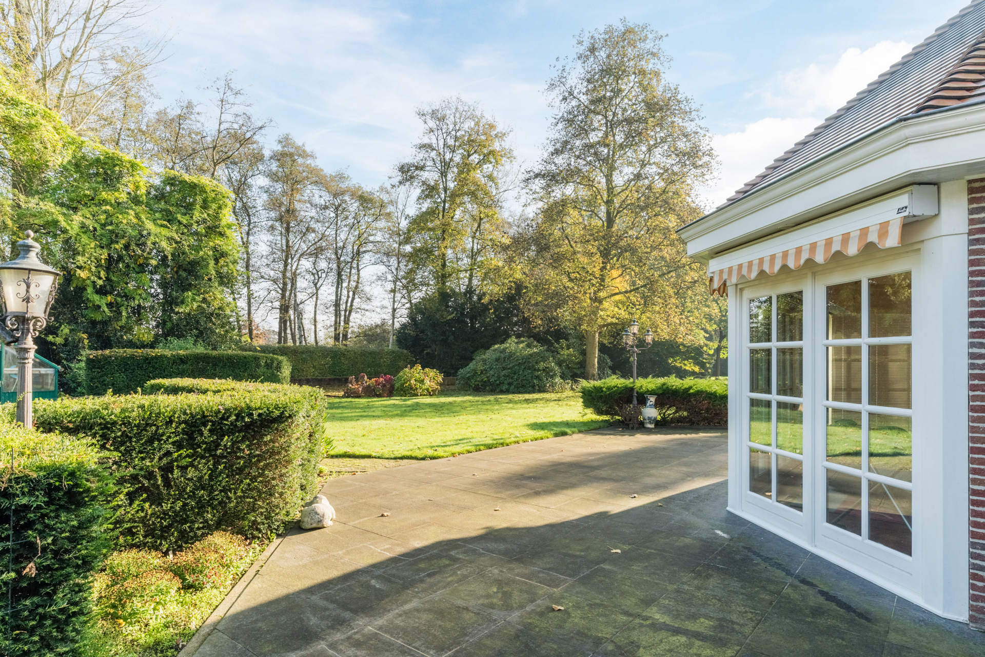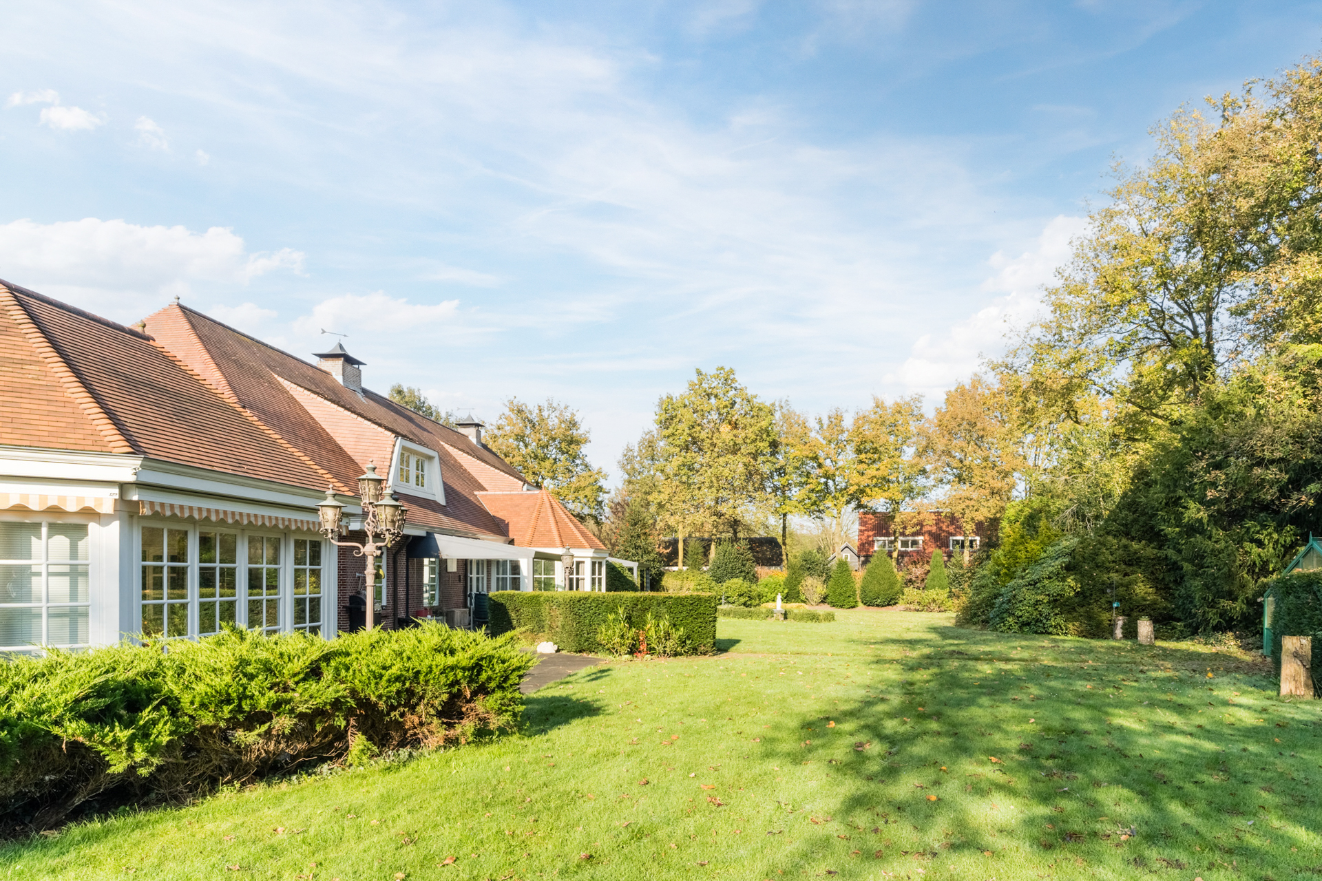 Rondom de woning liggen diverse terrassen en serres, voorzien van elektrisch bedienbare zonneluifels.