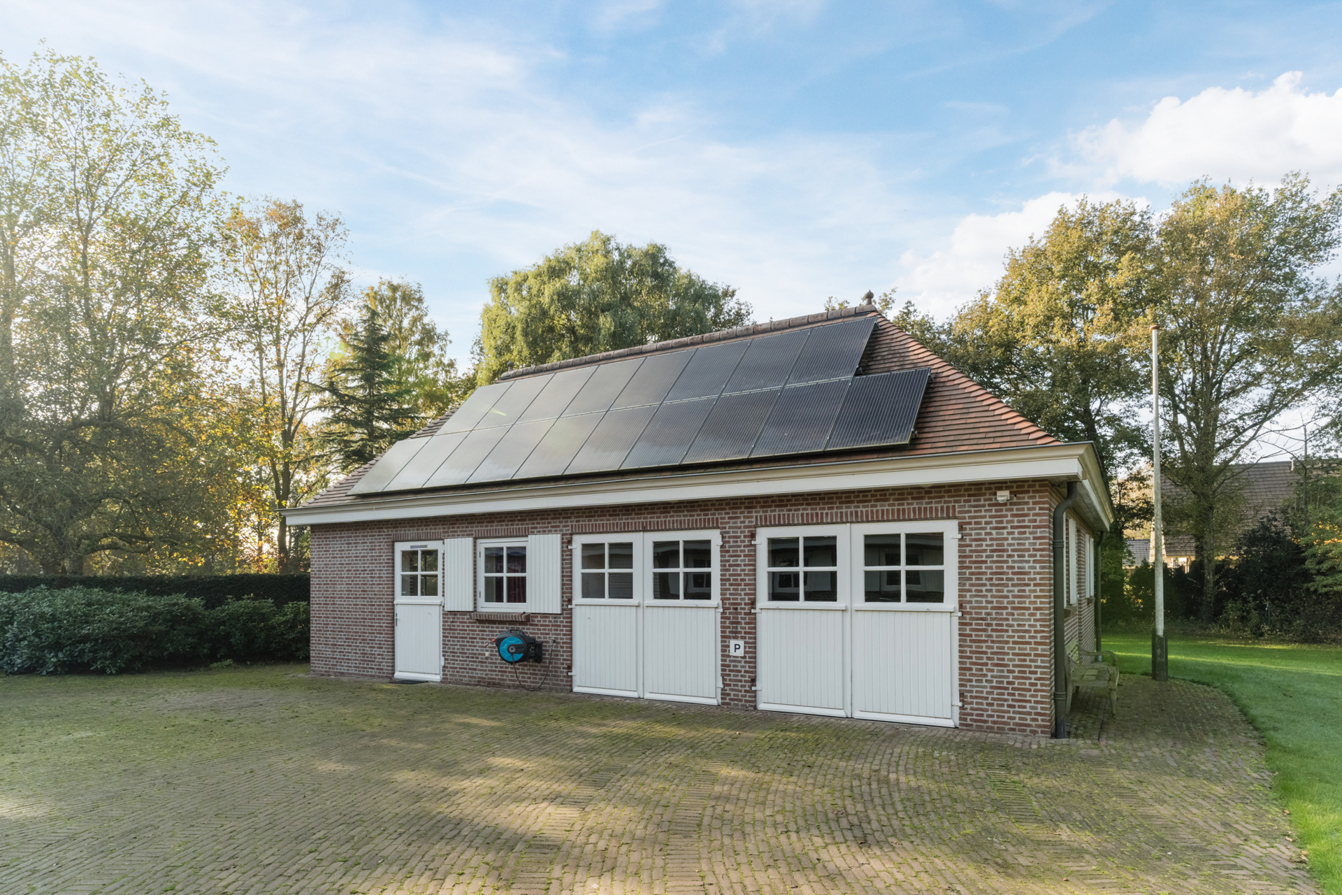 Het aparte bijgebouw herbergt twee dubbele garages en een verwarmde atelierruimte met toilet – ideaal als kantoor, hobbyruimte of studio.