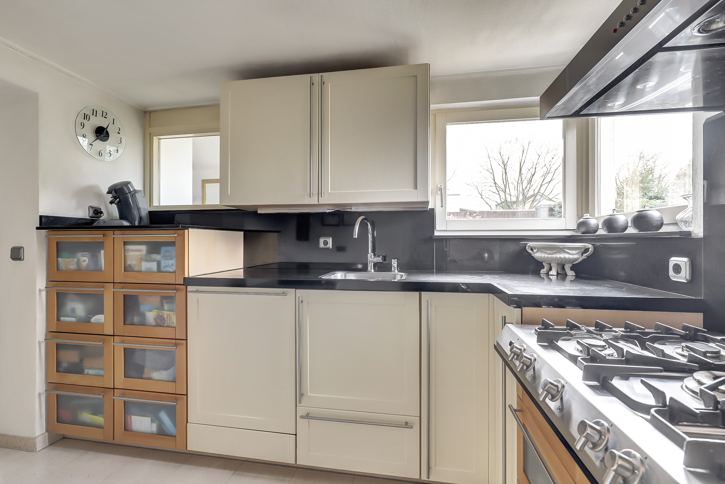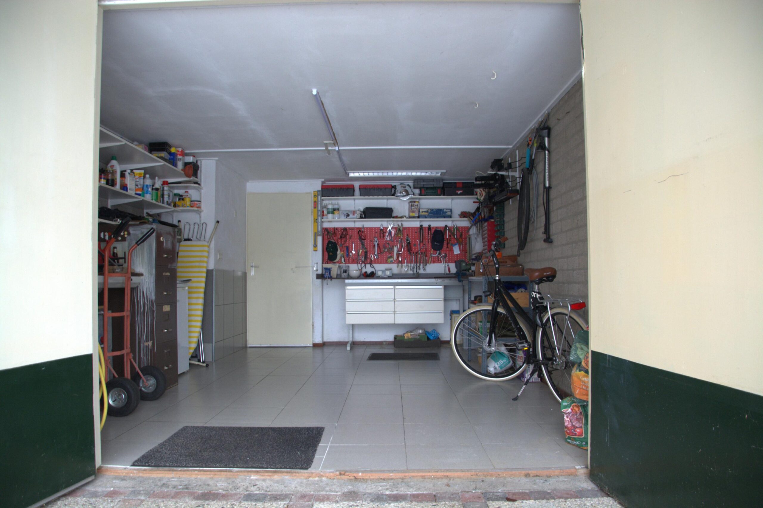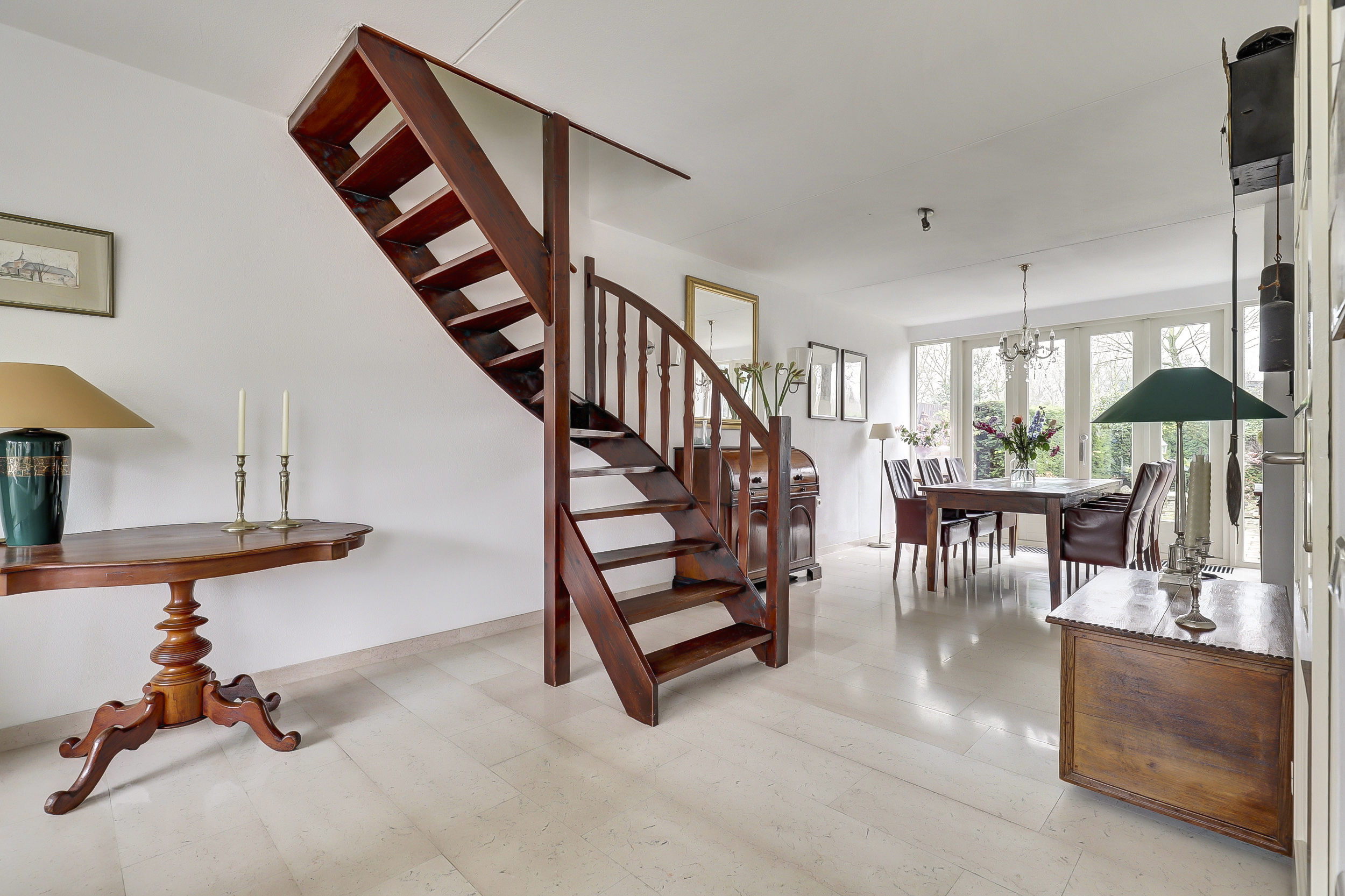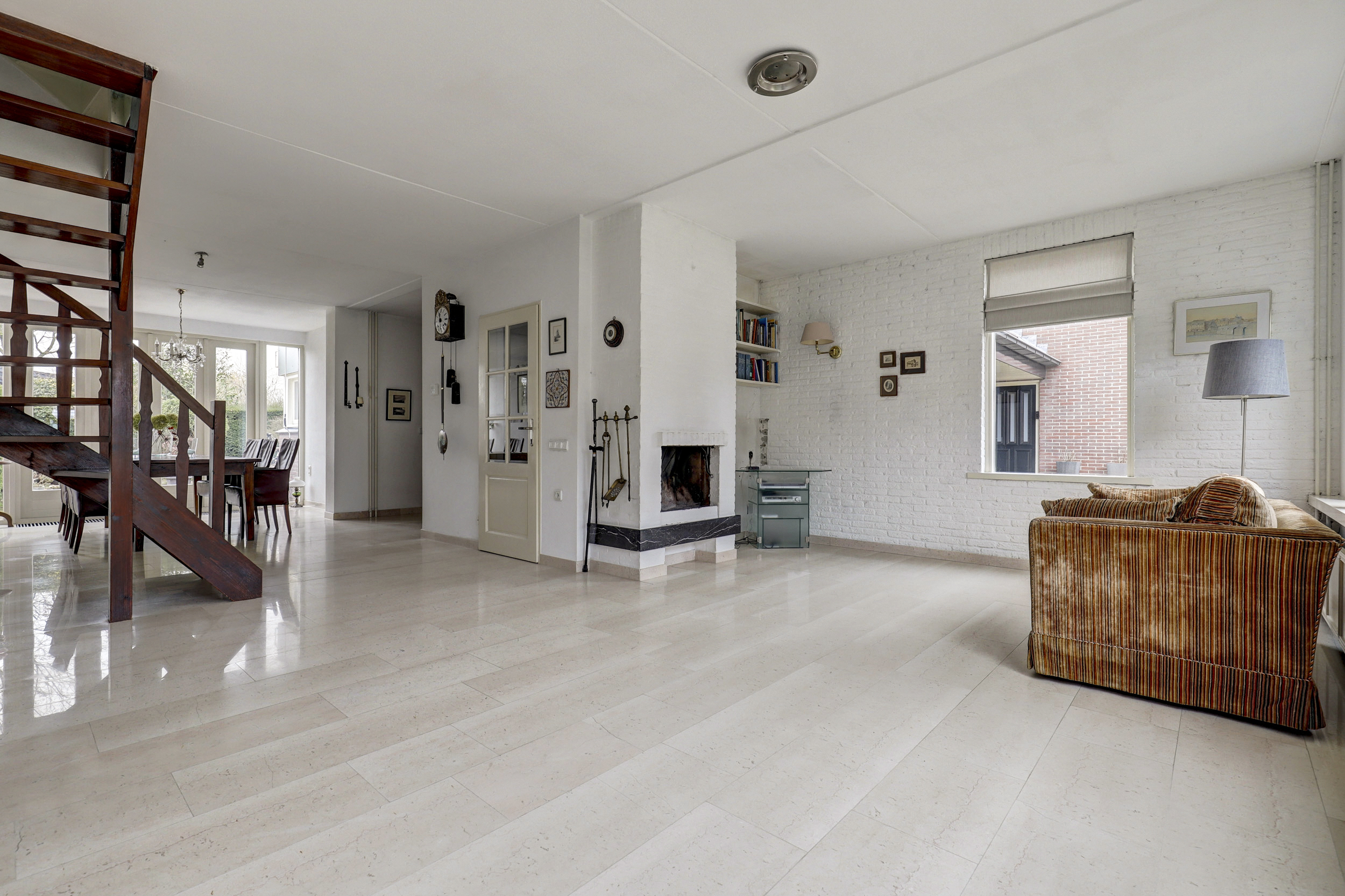 Via de entree kom je in de hal met luxe toiletruimte (wandcloset en fontein) en toegang tot de lichte woonkamer. De woonkamer is in 1995 uitgebouwd aan de achterzijde en wat direct opvalt, is het prettige lichtinval dankzij ramen aan meerdere zijden en via de openslaande deuren loop je zo de verzorgde achtertuin in. De open haard zorgt voor extra sfeer en warmte. De open trappartij geeft de ruimte een speels en open karakter. Tussen de eetkamer en de keuken bevindt zich nog voldoende ruimte om bijvoorbeeld een bureau te plaatsen of voor een speelhoek. De verzorgde keuken is uitgevoerd in een praktische L-opstelling en biedt ruimte voor een kleine eettafel, volop werk- en bergruimte en is voorzien van 5-pits gasfornuis, afzuigkap, oven en vaatwasser. Aangrenzend bevindt zich de bijkeuken met witgoedaansluitingen, ruimte voor koelkast en/of vriezer, bergruimte en een deur naar de achtertuin en de garage. De garage ca. 17 m² heeft openslaande deuren naar de oprit, betegelde vloer en wasbak. De gehele begane grond is afgewerkt met een stijlvolle travertinvloer.