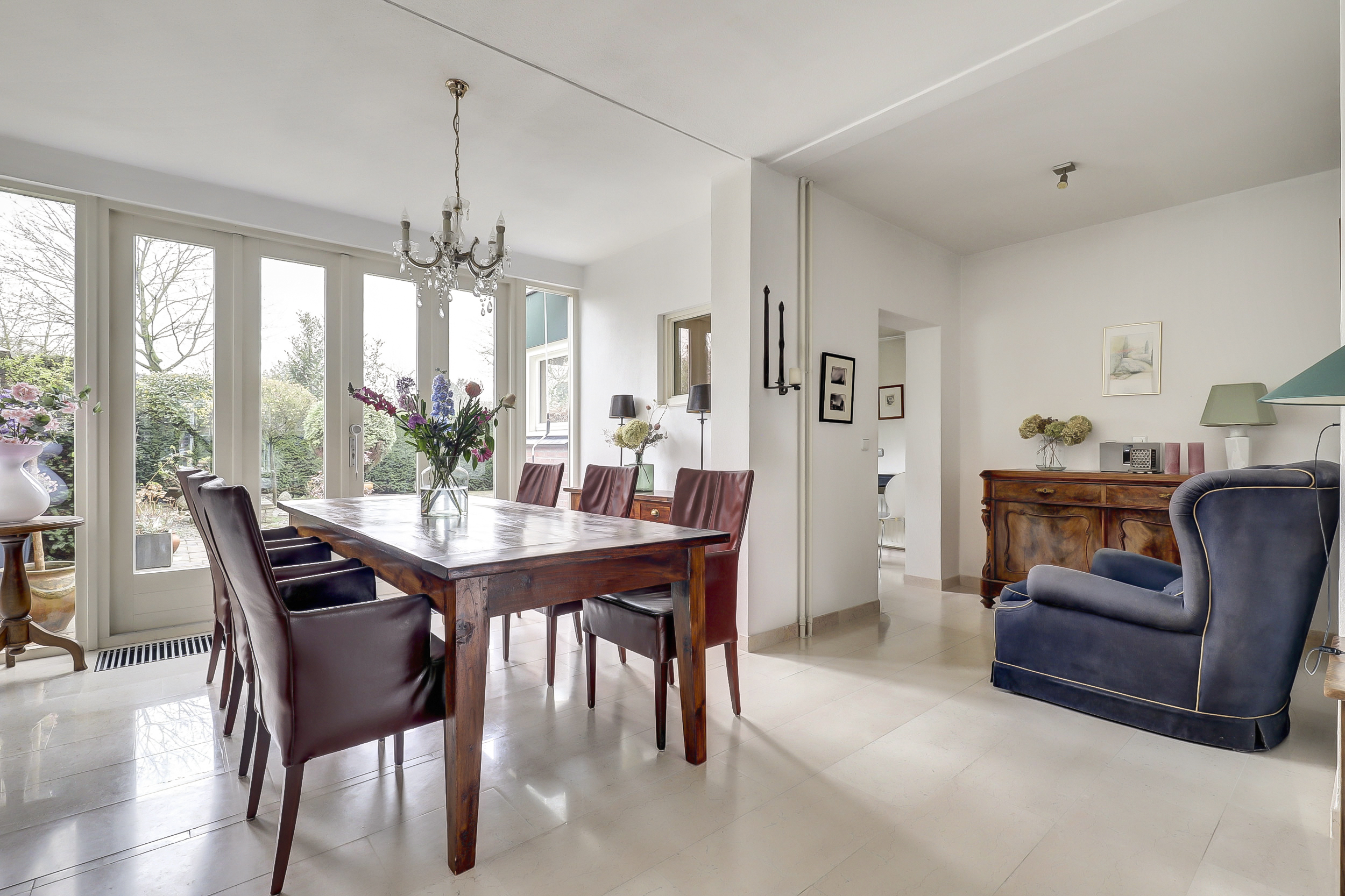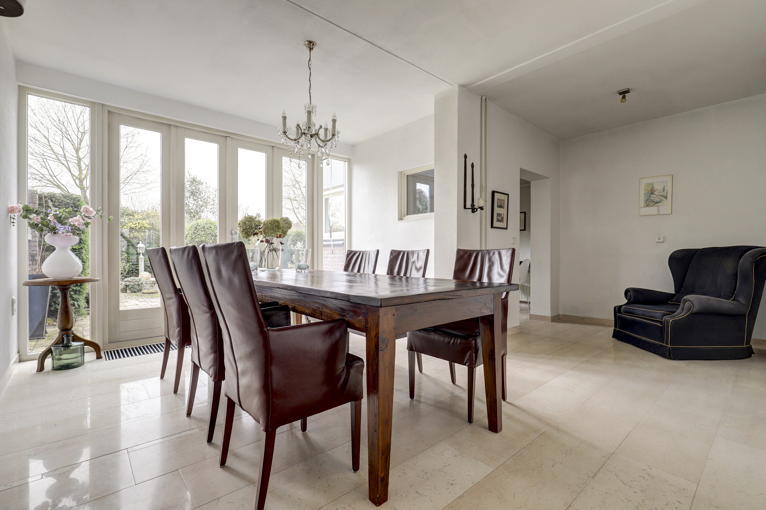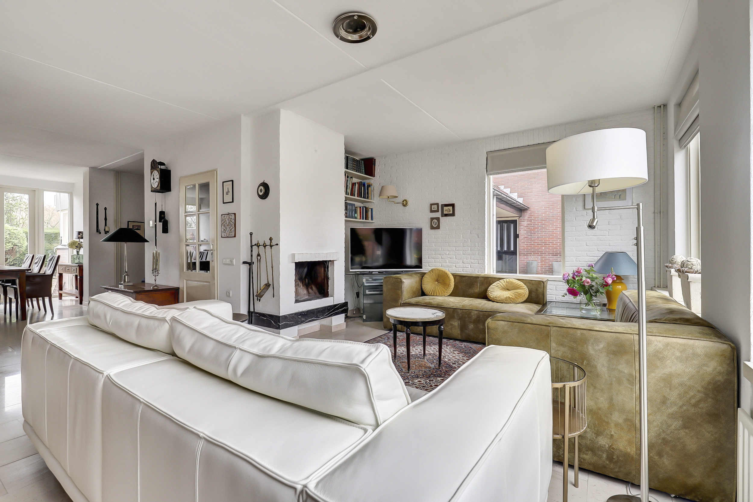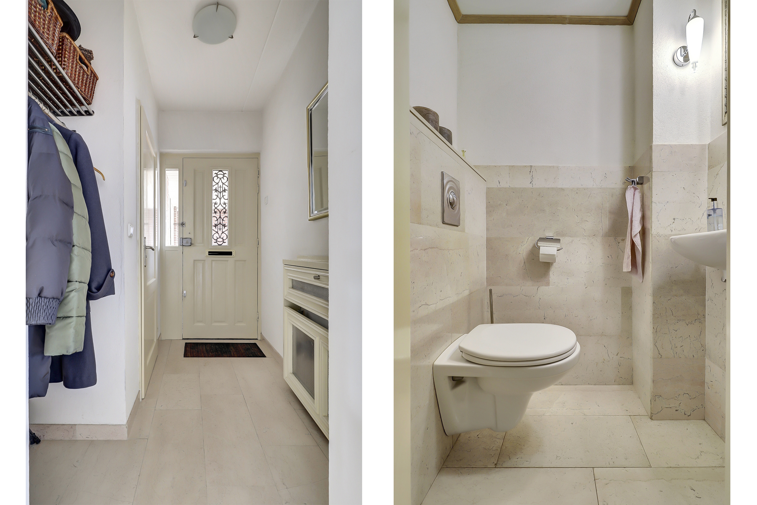 Via de entree kom je in de hal met luxe toiletruimte (wandcloset en fontein) en toegang tot de lichte woonkamer. De woonkamer is in 1995 uitgebouwd aan de achterzijde en wat direct opvalt, is het prettige lichtinval dankzij ramen aan meerdere zijden en via de openslaande deuren loop je zo de verzorgde achtertuin in. De open haard zorgt voor extra sfeer en warmte. De open trappartij geeft de ruimte een speels en open karakter. Tussen de eetkamer en de keuken bevindt zich nog voldoende ruimte om bijvoorbeeld een bureau te plaatsen of voor een speelhoek. De verzorgde keuken is uitgevoerd in een praktische L-opstelling en biedt ruimte voor een kleine eettafel, volop werk- en bergruimte en is voorzien van 5-pits gasfornuis, afzuigkap, oven en vaatwasser. Aangrenzend bevindt zich de bijkeuken met witgoedaansluitingen, ruimte voor koelkast en/of vriezer, bergruimte en een deur naar de achtertuin en de garage. De garage ca. 17 m² heeft openslaande deuren naar de oprit, betegelde vloer en wasbak. De gehele begane grond is afgewerkt met een stijlvolle travertinvloer.