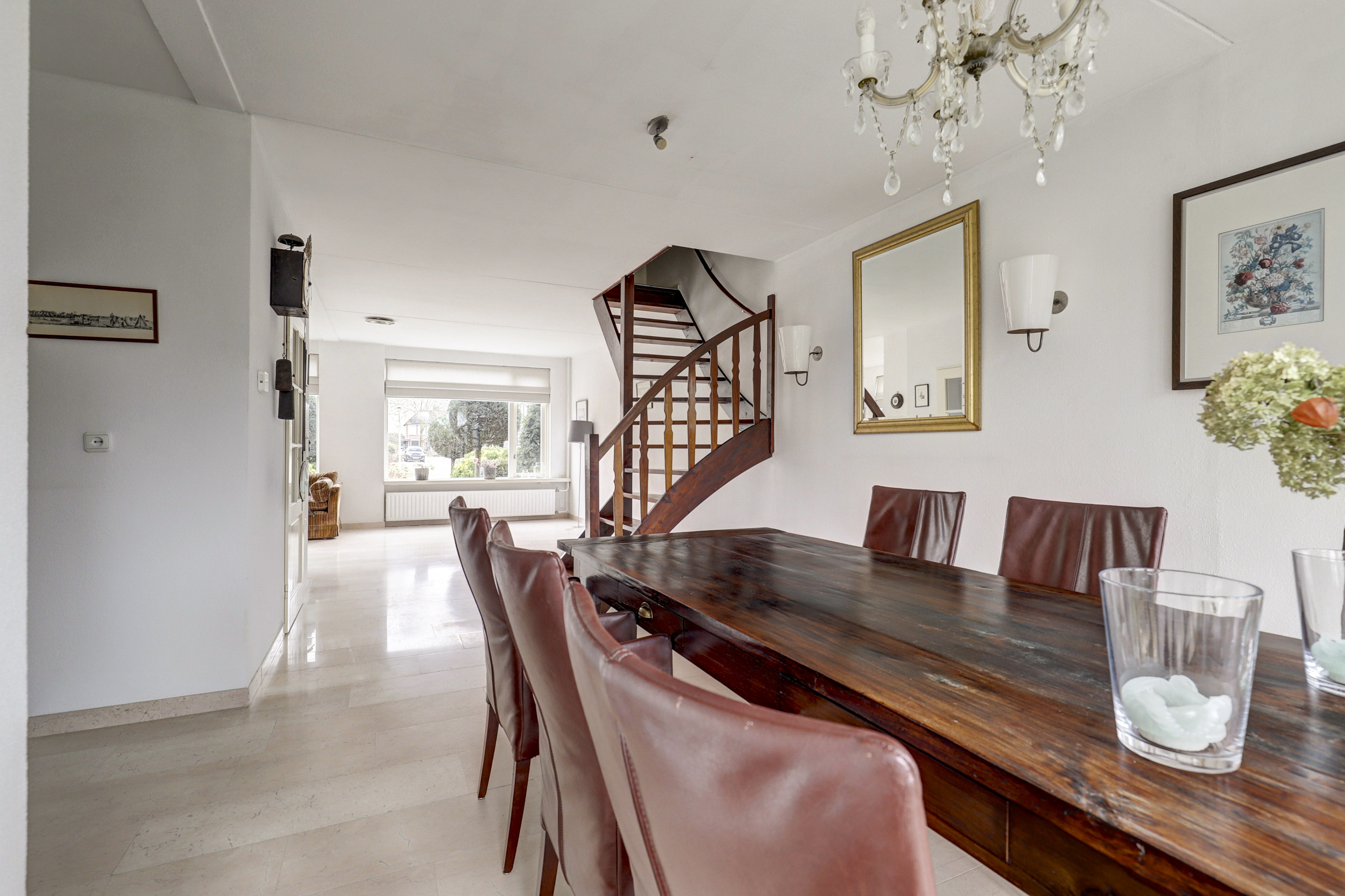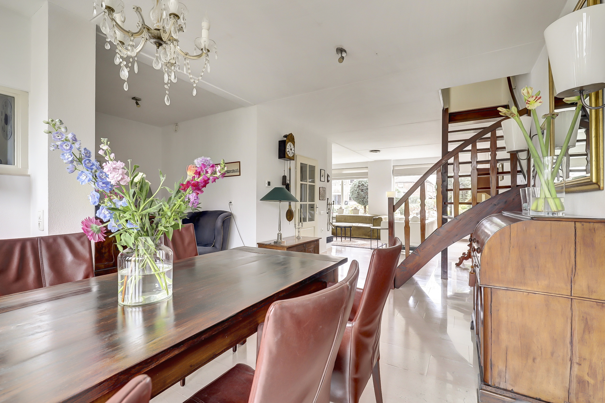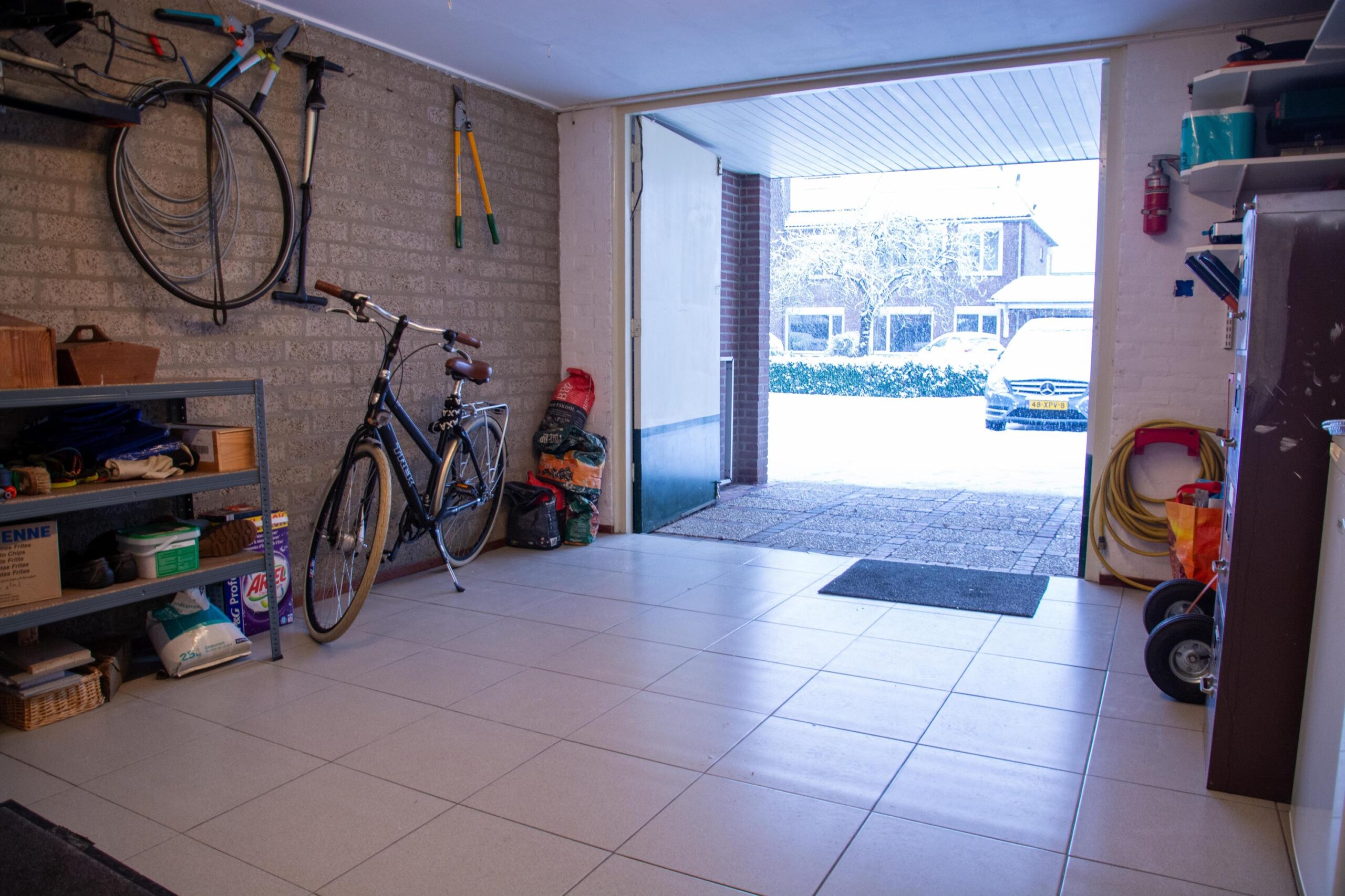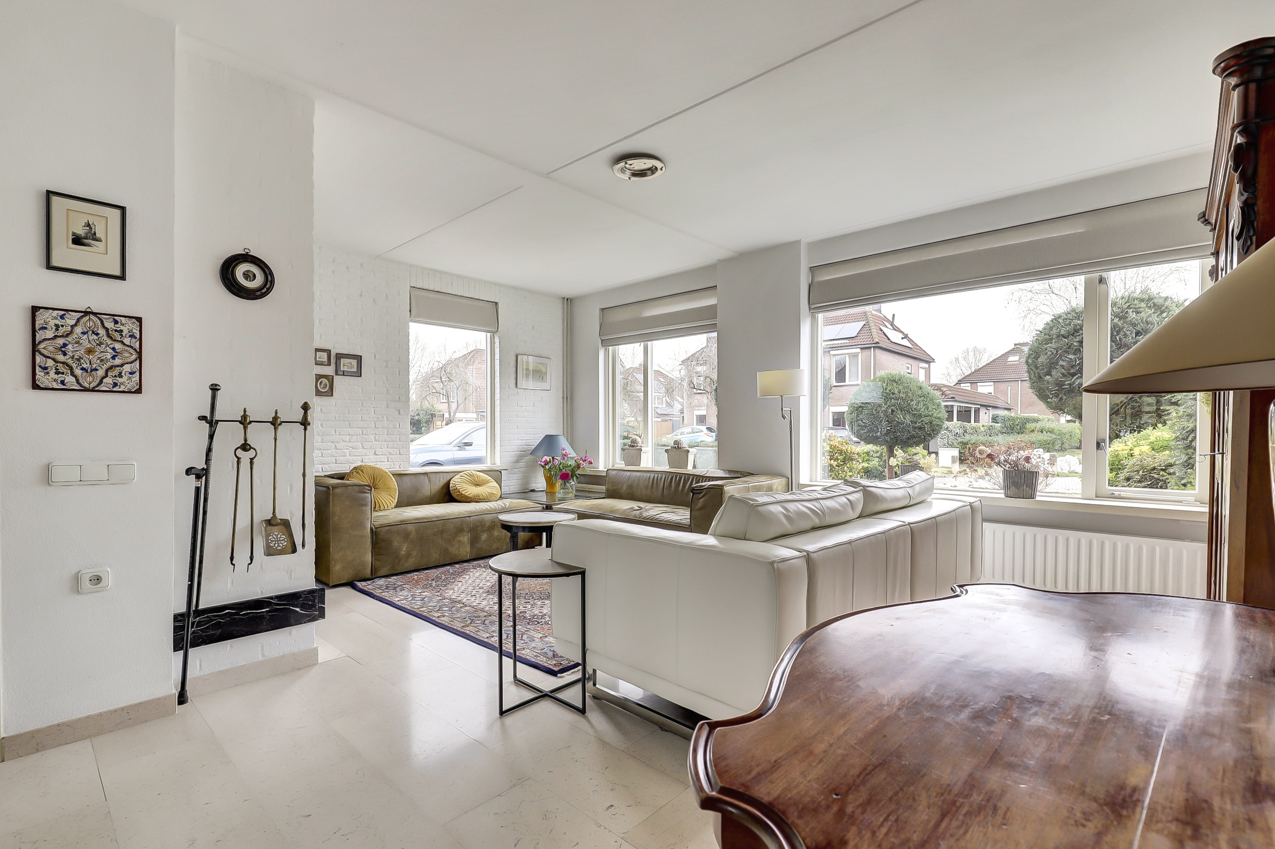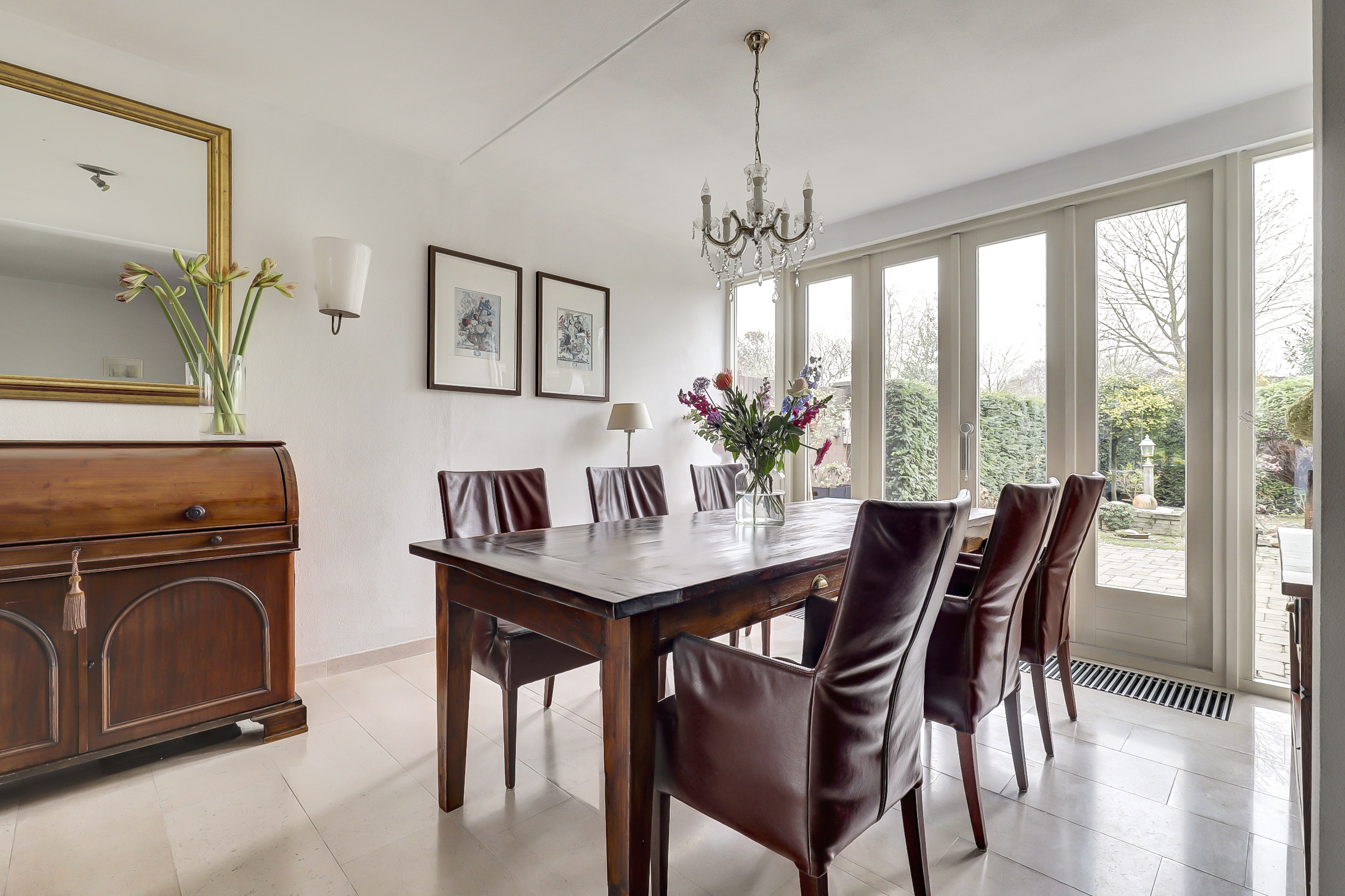 Via de entree kom je in de hal met luxe toiletruimte (wandcloset en fontein) en toegang tot de lichte woonkamer. De woonkamer is in 1995 uitgebouwd aan de achterzijde en wat direct opvalt, is het prettige lichtinval dankzij ramen aan meerdere zijden en via de openslaande deuren loop je zo de verzorgde achtertuin in. De open haard zorgt voor extra sfeer en warmte. De open trappartij geeft de ruimte een speels en open karakter. Tussen de eetkamer en de keuken bevindt zich nog voldoende ruimte om bijvoorbeeld een bureau te plaatsen of voor een speelhoek. De verzorgde keuken is uitgevoerd in een praktische L-opstelling en biedt ruimte voor een kleine eettafel, volop werk- en bergruimte en is voorzien van 5-pits gasfornuis, afzuigkap, oven en vaatwasser. Aangrenzend bevindt zich de bijkeuken met witgoedaansluitingen, ruimte voor koelkast en/of vriezer, bergruimte en een deur naar de achtertuin en de garage. De garage ca. 17 m² heeft openslaande deuren naar de oprit, betegelde vloer en wasbak. De gehele begane grond is afgewerkt met een stijlvolle travertinvloer.