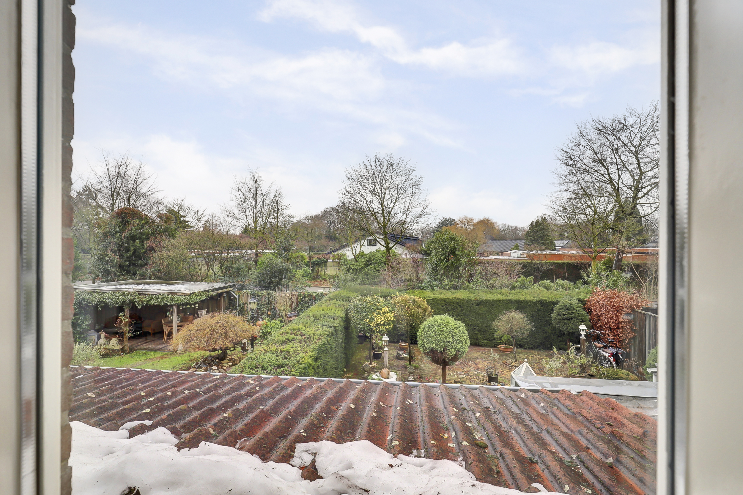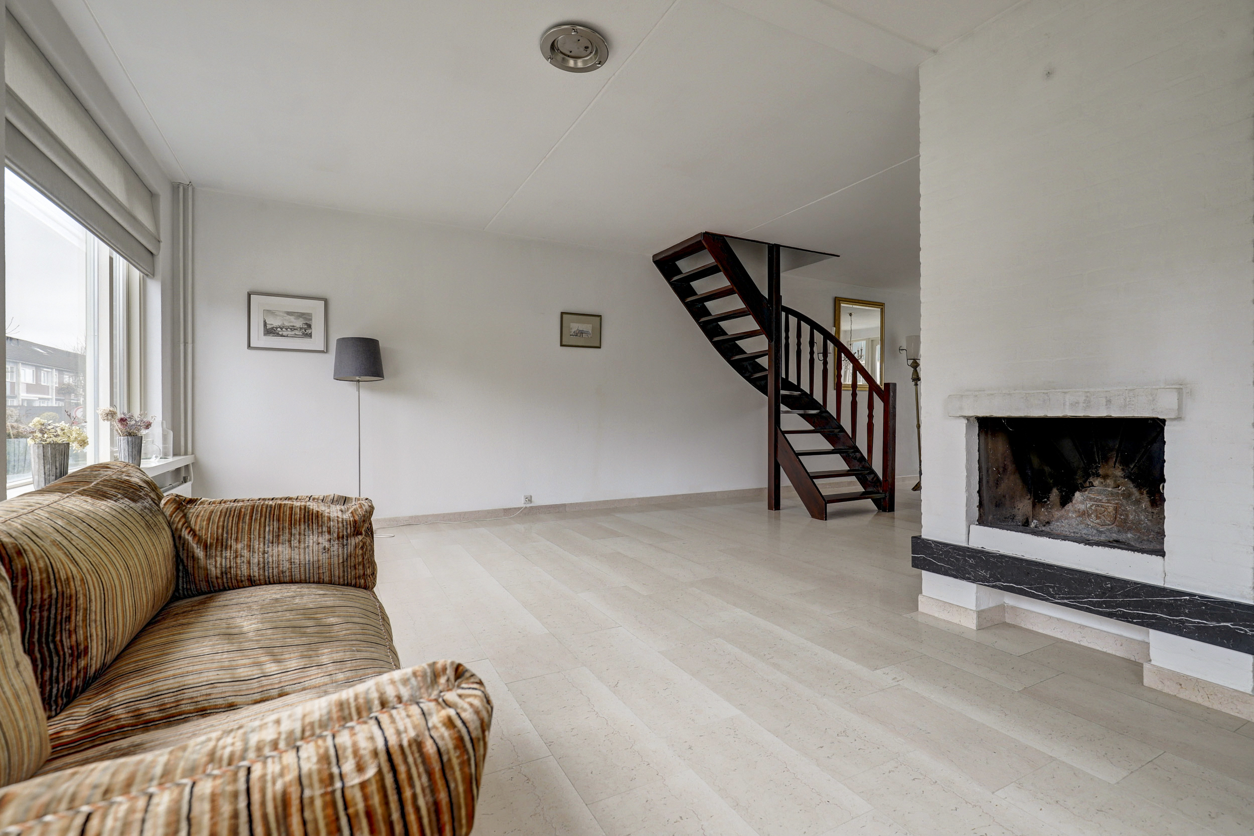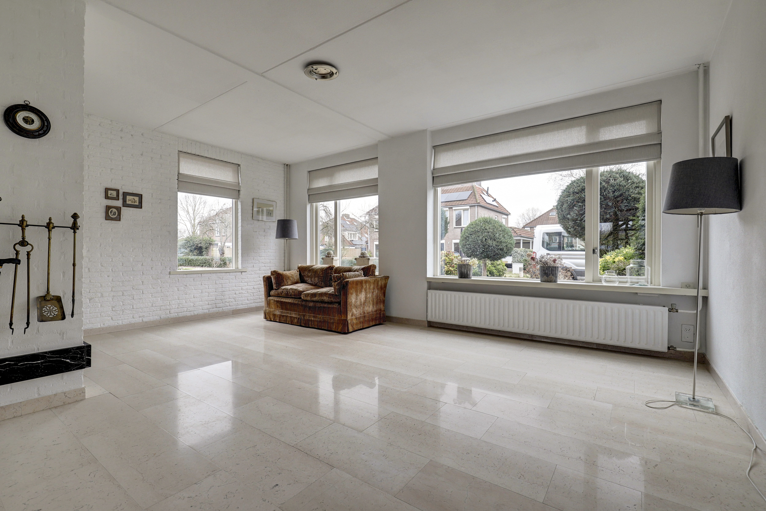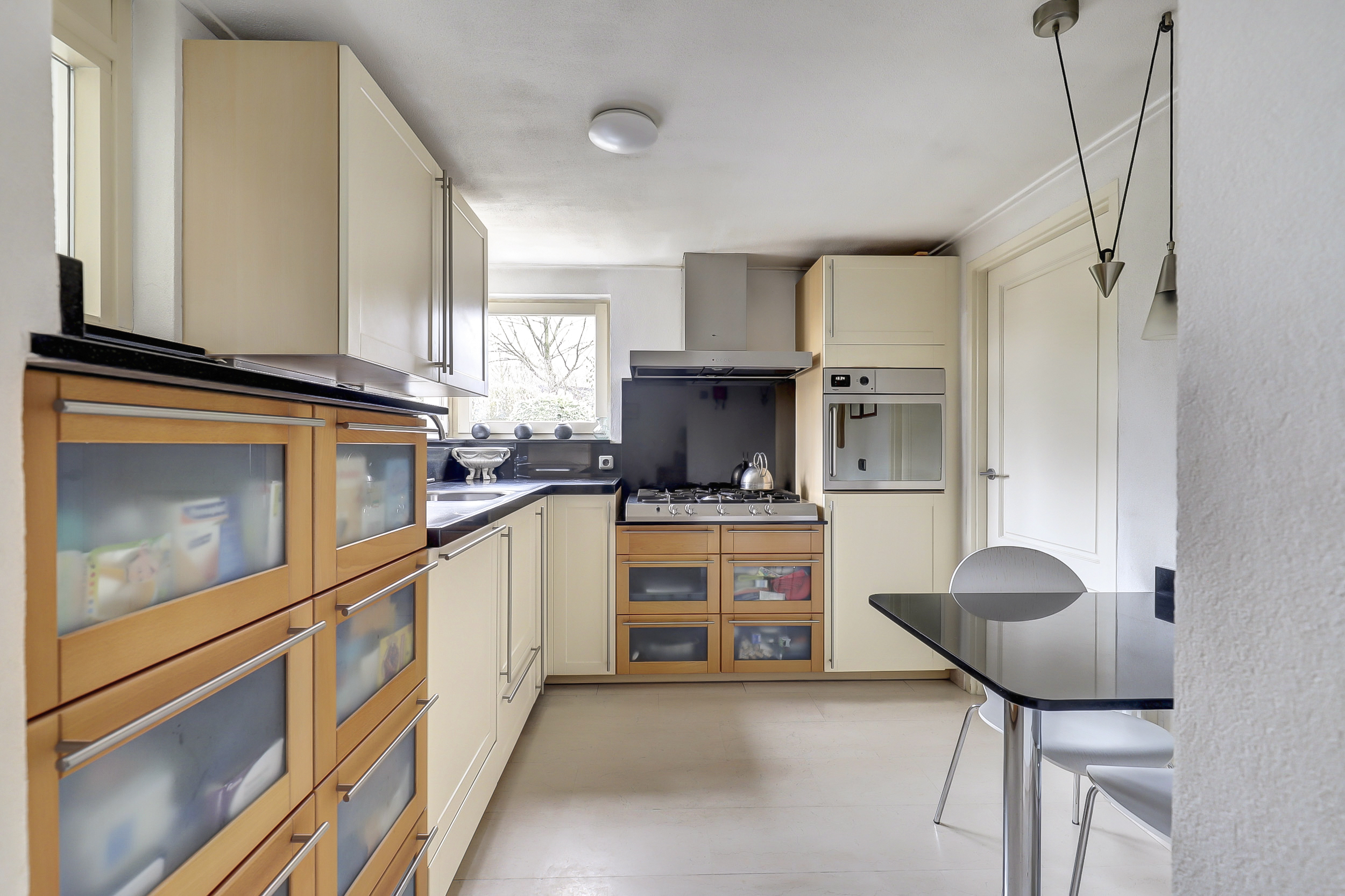 Via de entree kom je in de hal met luxe toiletruimte (wandcloset en fontein) en toegang tot de lichte woonkamer. De woonkamer is in 1995 uitgebouwd aan de achterzijde en wat direct opvalt, is het prettige lichtinval dankzij ramen aan meerdere zijden en via de openslaande deuren loop je zo de verzorgde achtertuin in. De open haard zorgt voor extra sfeer en warmte. De open trappartij geeft de ruimte een speels en open karakter. Tussen de eetkamer en de keuken bevindt zich nog voldoende ruimte om bijvoorbeeld een bureau te plaatsen of voor een speelhoek. De verzorgde keuken is uitgevoerd in een praktische L-opstelling en biedt ruimte voor een kleine eettafel, volop werk- en bergruimte en is voorzien van 5-pits gasfornuis, afzuigkap, oven en vaatwasser. Aangrenzend bevindt zich de bijkeuken met witgoedaansluitingen, ruimte voor koelkast en/of vriezer, bergruimte en een deur naar de achtertuin en de garage. De garage ca. 17 m² heeft openslaande deuren naar de oprit, betegelde vloer en wasbak. De gehele begane grond is afgewerkt met een stijlvolle travertinvloer.
