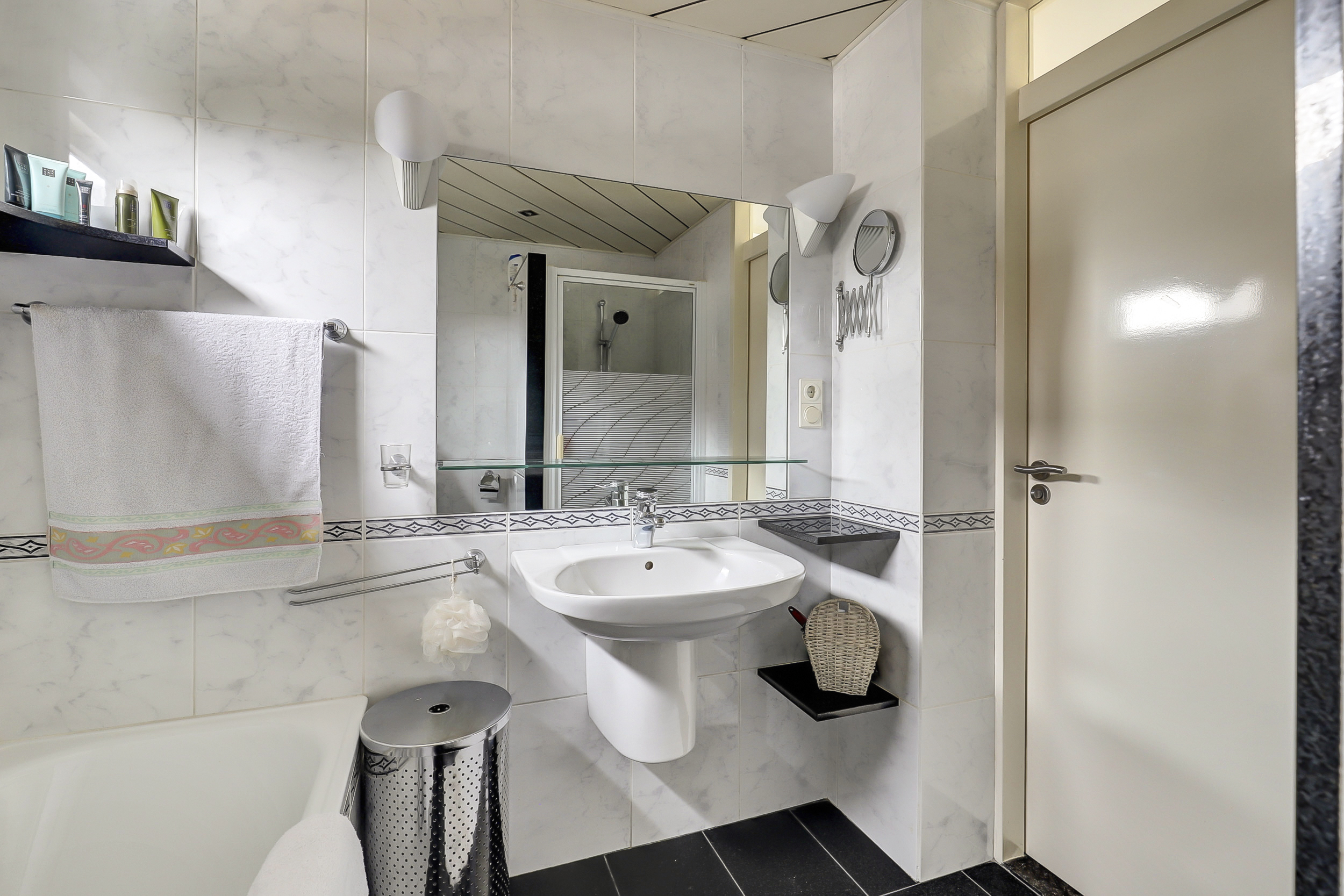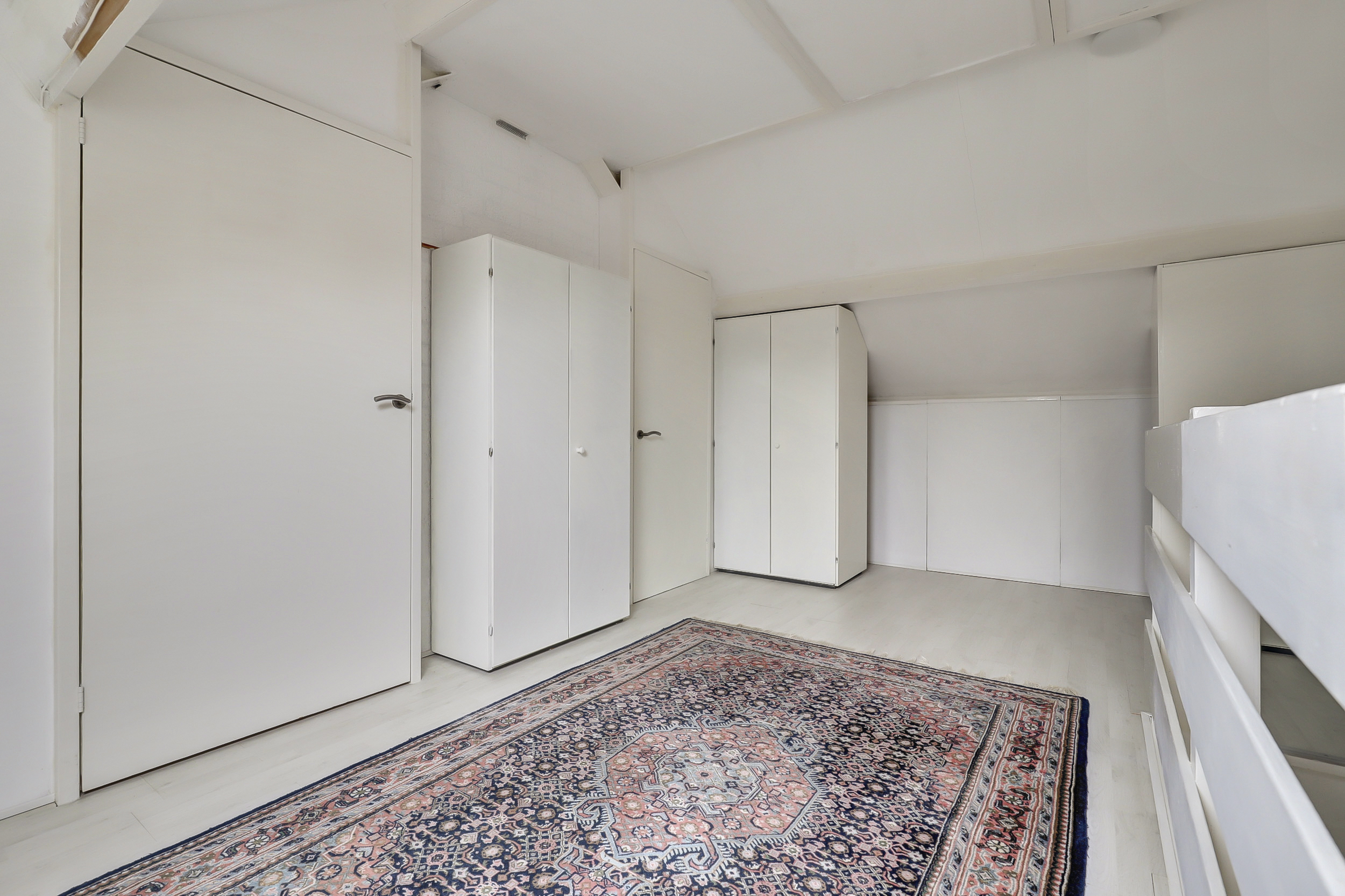 Op deze verdieping bevinden zich twee slaapkamers en de badkamer. Oorspronkelijk waren hier drie slaapkamers; deze zijn samengevoegd tot een royale master bedroom met een grote inloopkast en rolluiken. Beide slaapkamerdeuren en verlichting zijn nog aanwezig, waardoor je er weer eenvoudig 2 slaapkamers van kunt maken. Aan de tuinzijde bevindt zich de andere slaapkamer, welke over de volledige breedte van de woning is gesitueerd. De badkamer is compleet uitgevoerd met ligbad, douche, wastafel, wandcloset, designradiator, spotjes, raam en is geheel betegeld.
