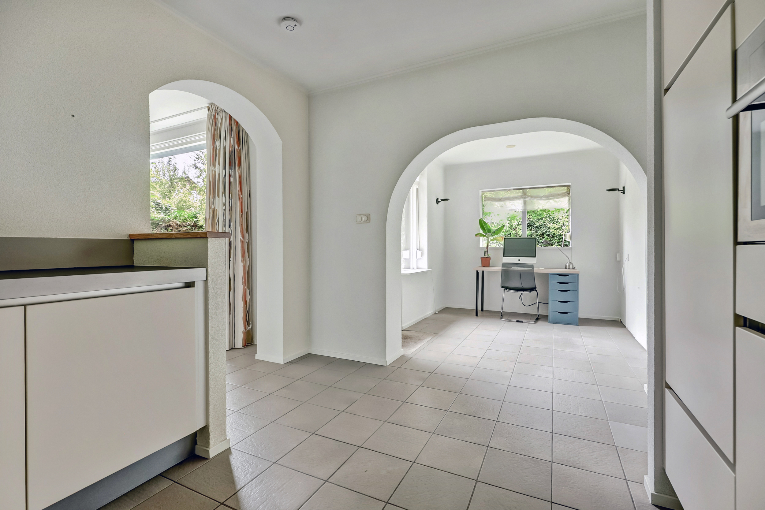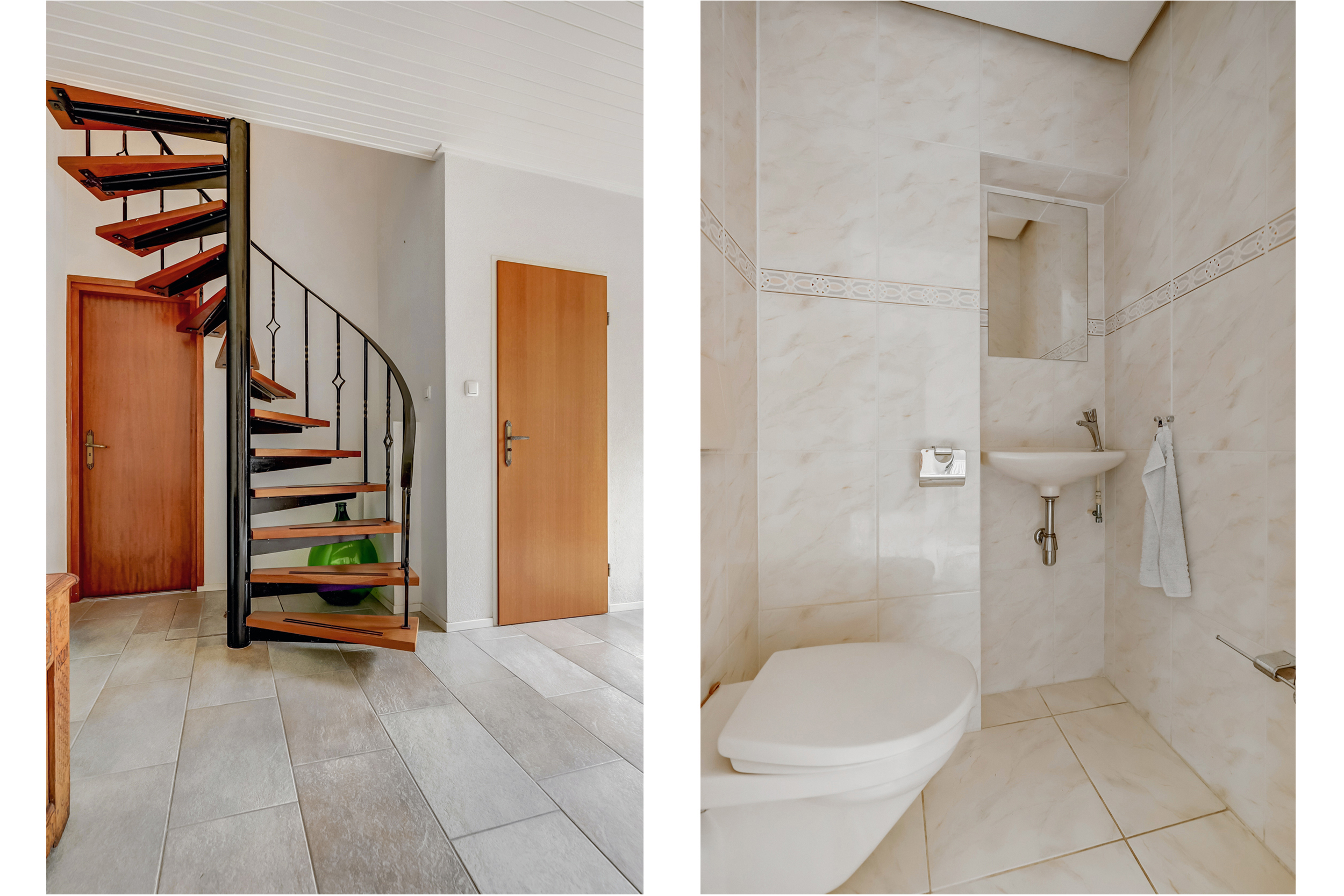 Via de ruime entree/hal kom je de woning binnen en kun je naar de woonkamer, garage en via de open trap naar de 1ste verdieping. De entree is voorzien van tegelvloer, meterkast en toiletruimte met wandcloset en fontein. De fijne woonkamer is aan de voorzijde gelegen en is lekker licht dankzij de grote ramen. Een openhaard zorgt voor extra gezelligheid. De eetkamer is aan de achterzijde gelegen en biedt uitzicht op de groene achtertuin. De muur tussen de eetkamer en de keuken is een niet dragende wand, waardoor je eenvoudig van deze 2 ruimtes een zeer royale woonkeuken kunt maken. Zie de artist impression voor een indruk hoe deze ruimte er dan uit zou zien. De halfopen U-vormig opgestelde keuken is in lichte kleurstelling uitgevoerd, is praktisch ingedeeld met veel lades/kastruimte en uitgerust met o.a. een koelkast, combioven, vaatwasser, afzuigkap en 4-pits inductiekookplaat. Vanuit de keuken zijn de inpandige garage en de extra ruimte/kamer die aan de achtertuin is gelegen te bereiken. Deze ruimte is zeer geschikt als bijv. werkruimte, hobbykamer of speelkamer. Deze ruimte heeft een deur naar de achtertuin en hier bevindt zich tevens een luik naar de kelderruimte van ca. 9 m². De woonkamer, eetkamer en keuken zijn voorzien van vloerverwarming en aan de achterzijde en zijkant zijn (deels elektrische) rolluiken aanwezig.