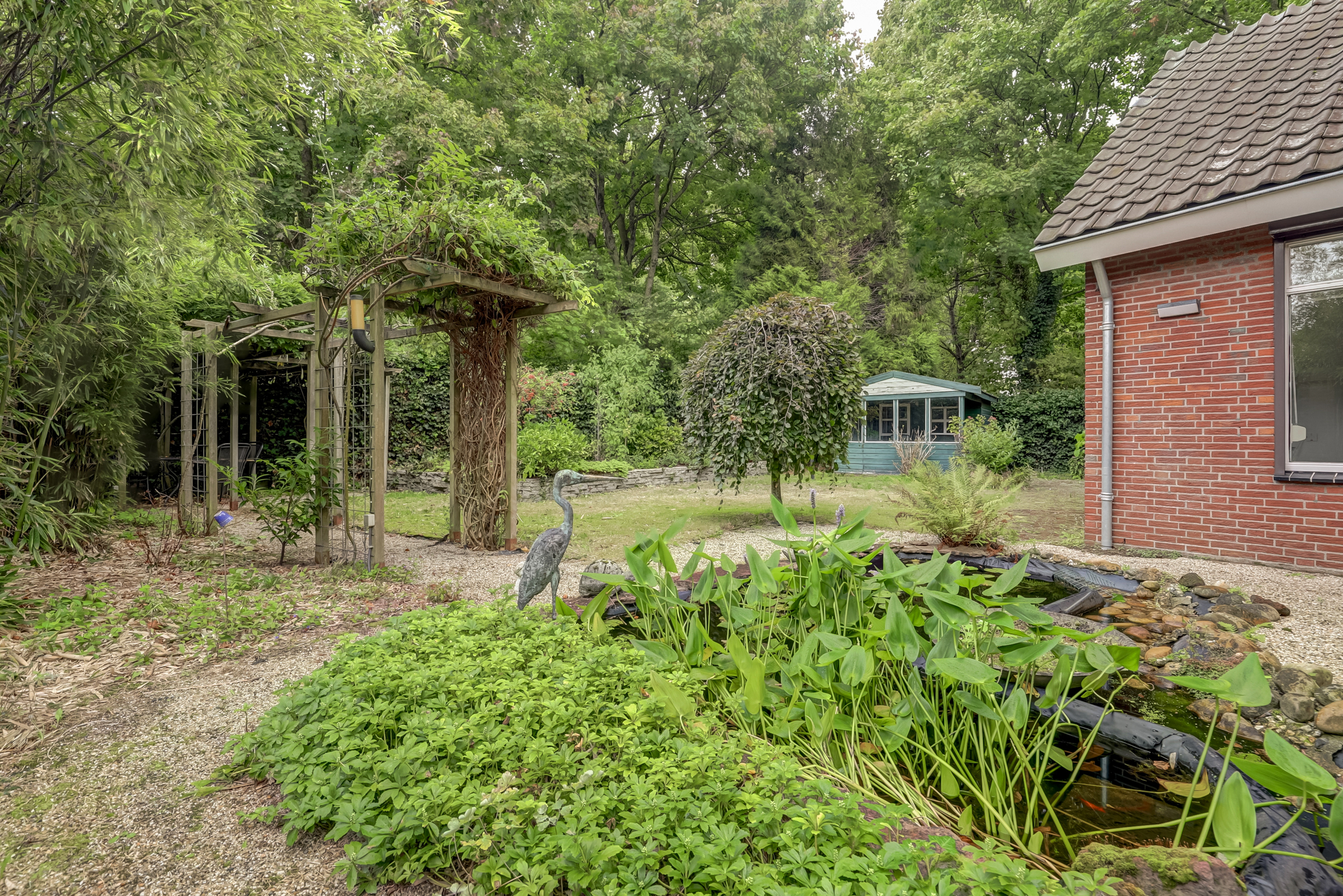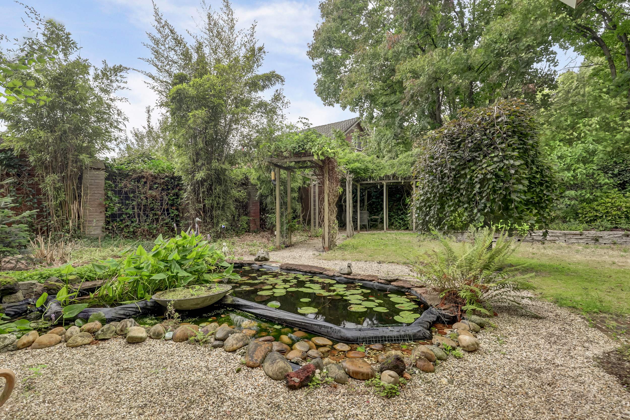+ Achtertuin met vijver, borders, meerdere terrassen, vrijstaande houten berging met veranda en natuurlijke pergola;