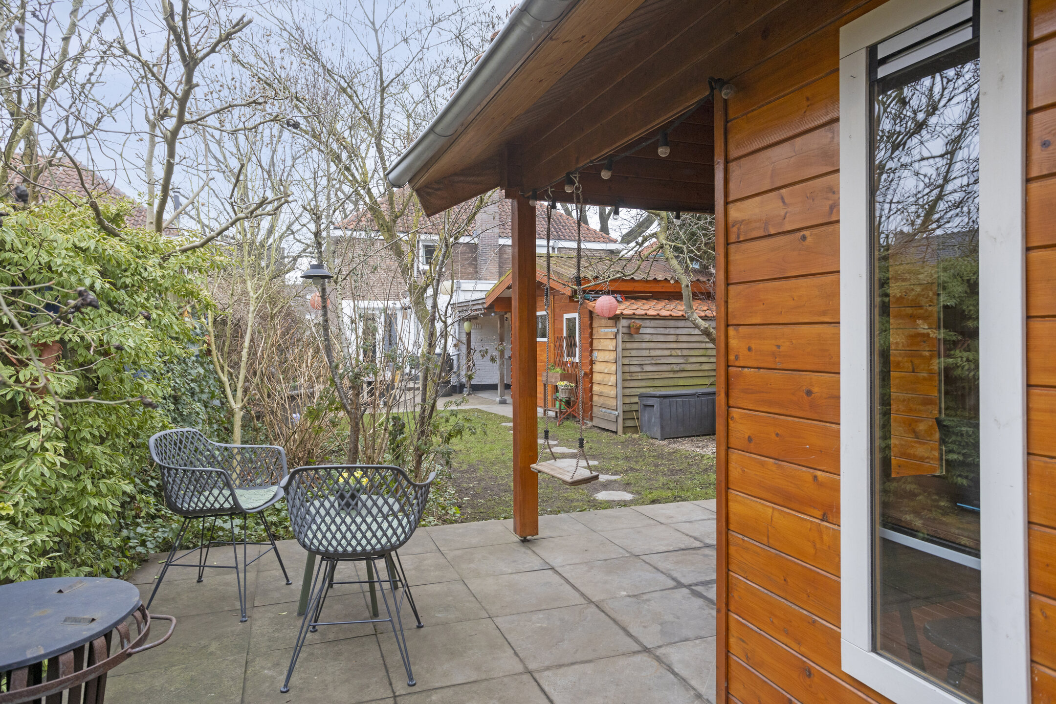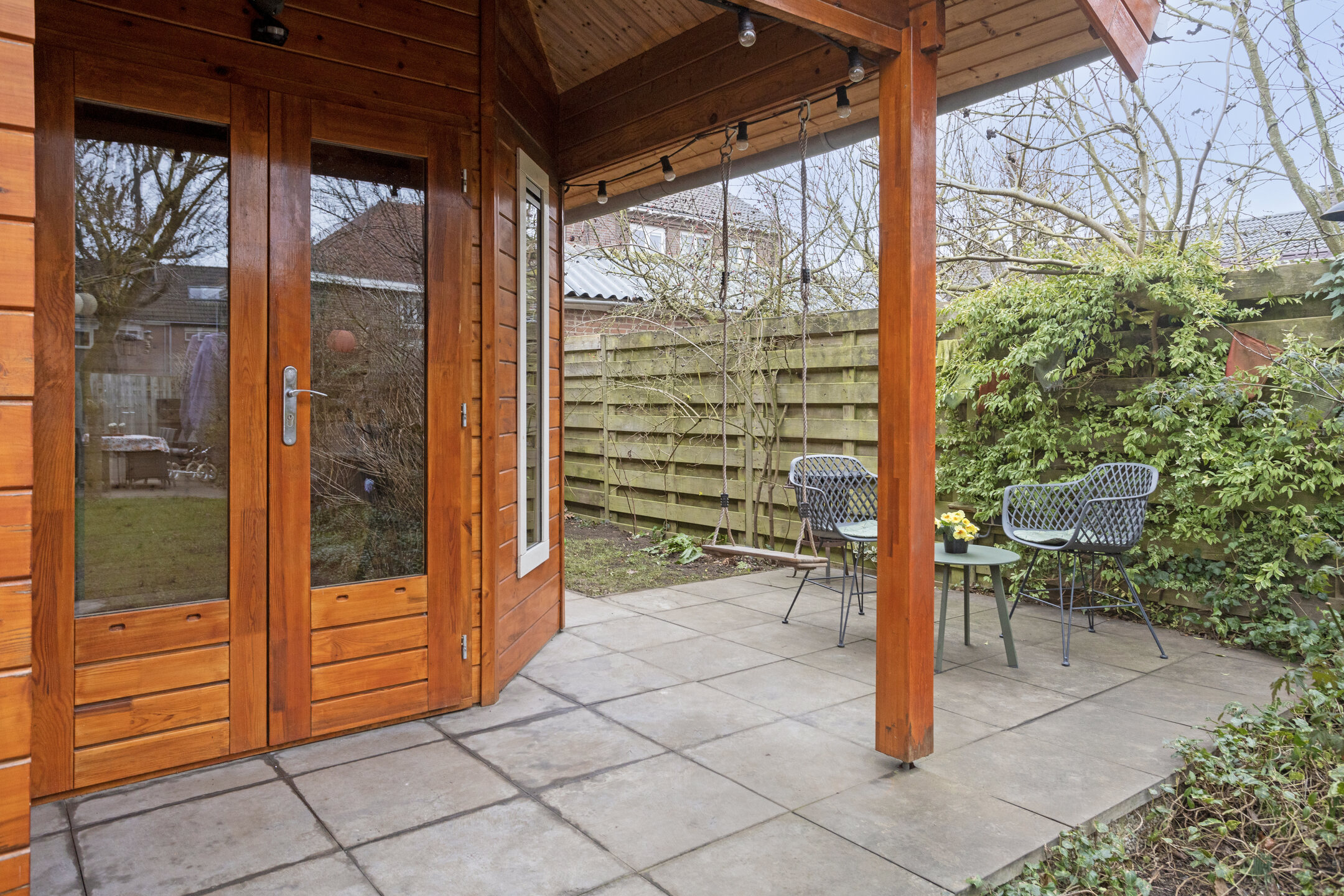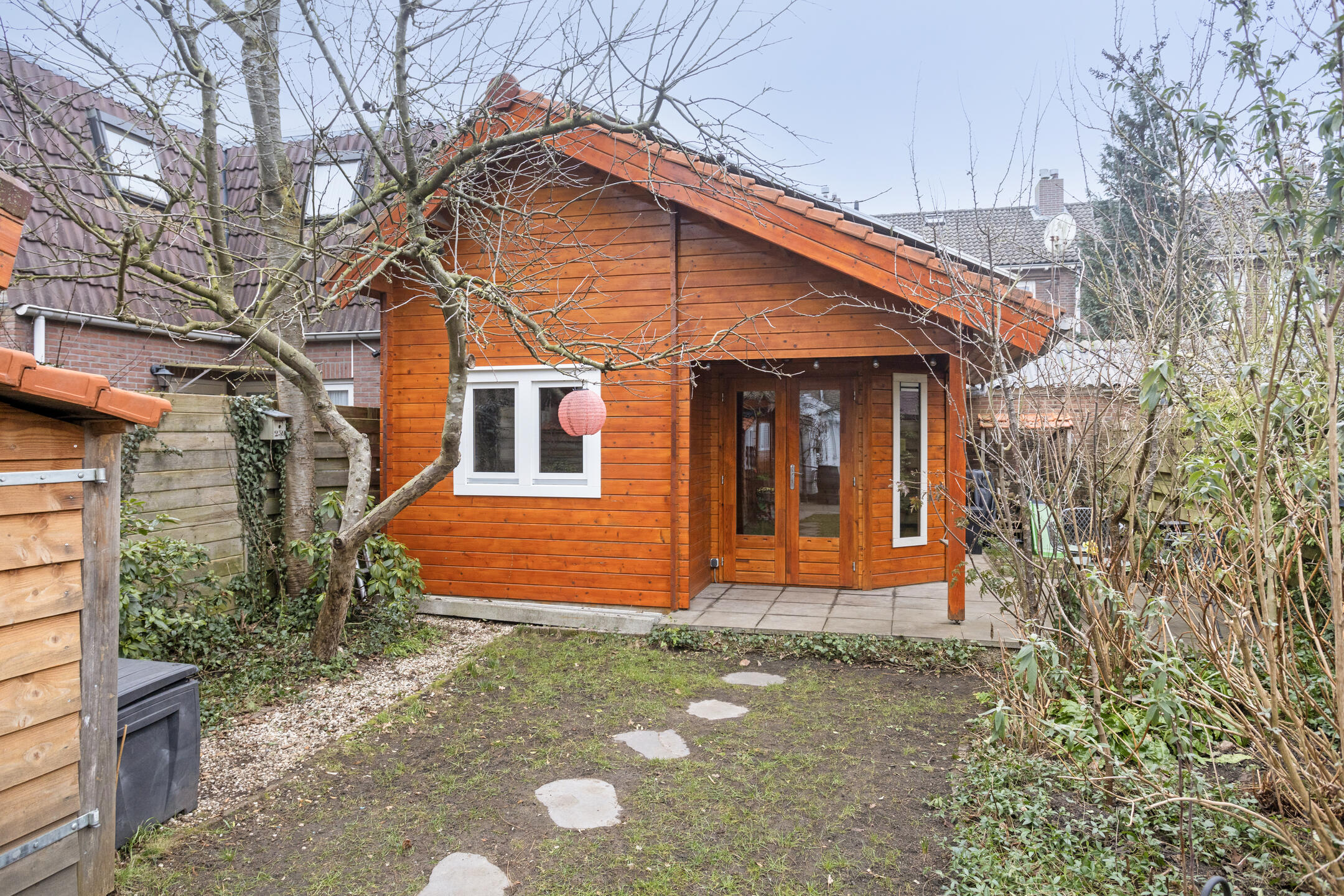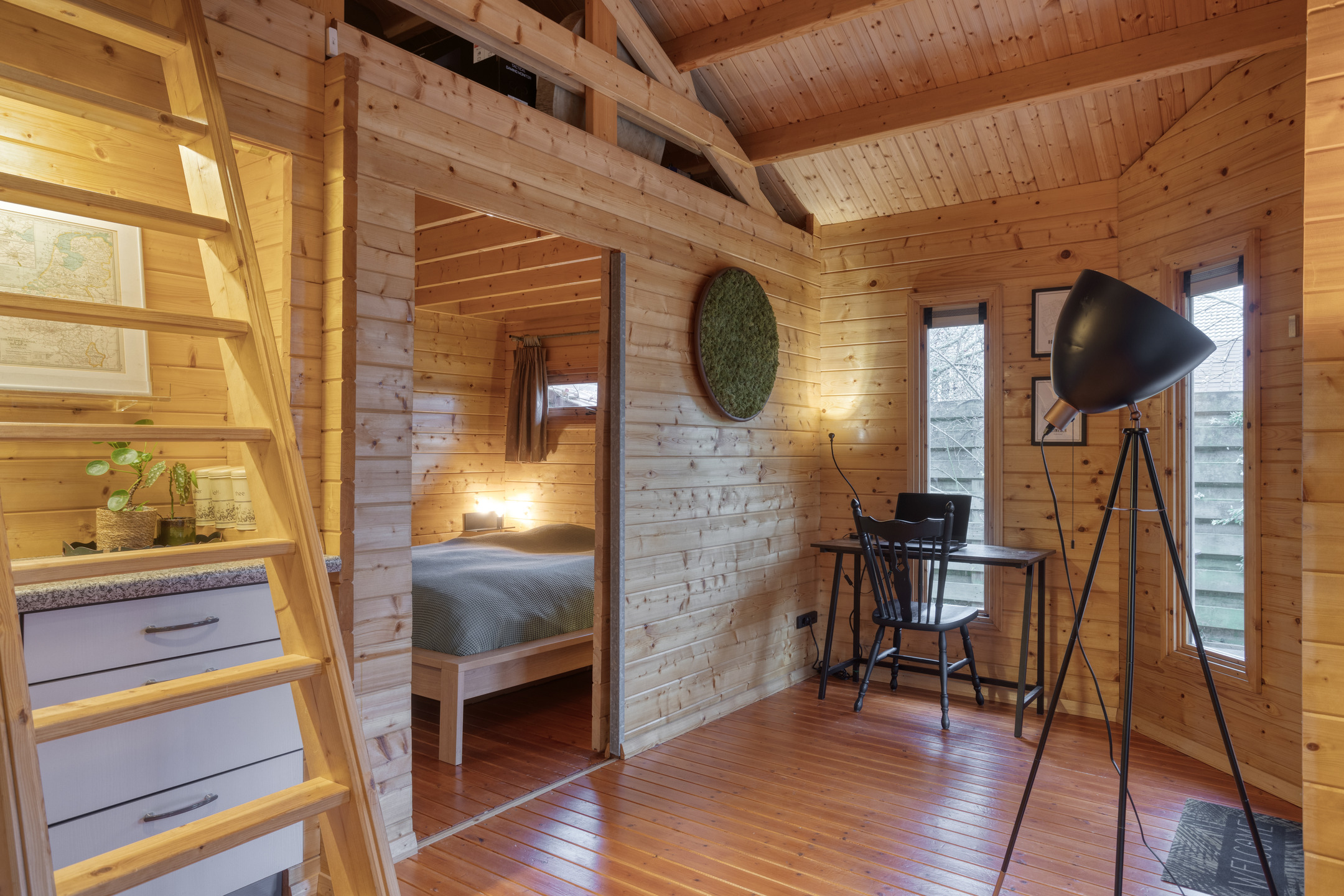 Achter in de tuin staat een grote houten gastenverblijf met eigen voorzieningen: o.a. zitgedeelte met keukenblok, aparte slaapkamer, badkamer met stoomcabine/douche, waskom en zwevend closet en een ruime vliering. Uitgerust met een elektrische boiler en een airco (verwarmen en koelen) waardoor dit een heerlijke plek is om zelf te genieten of gasten te laten verblijven.