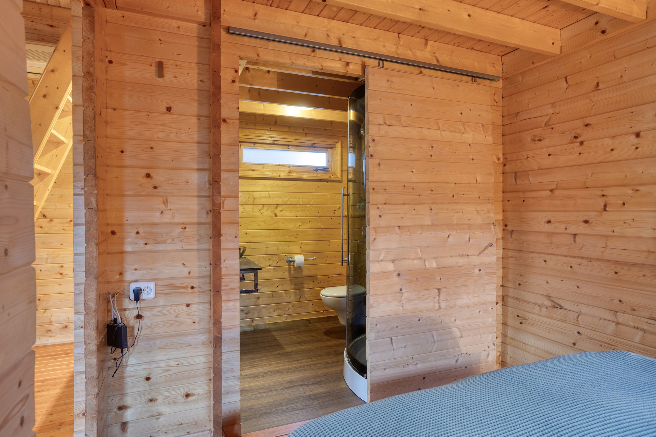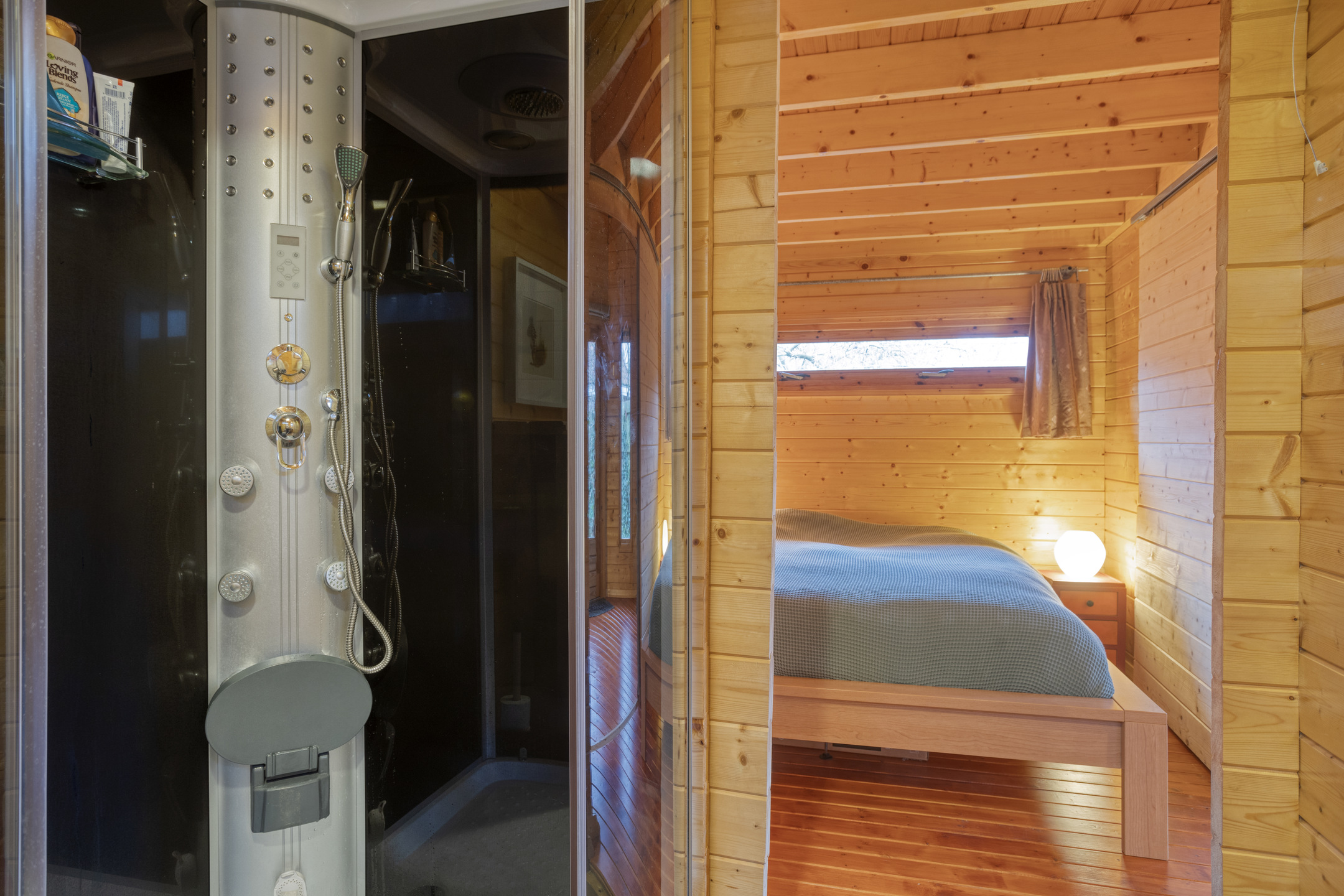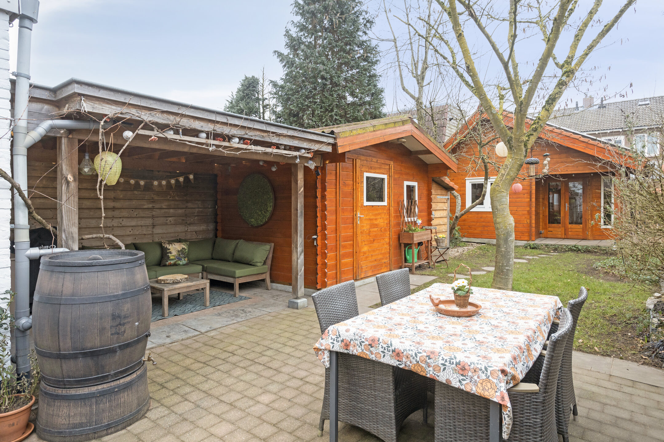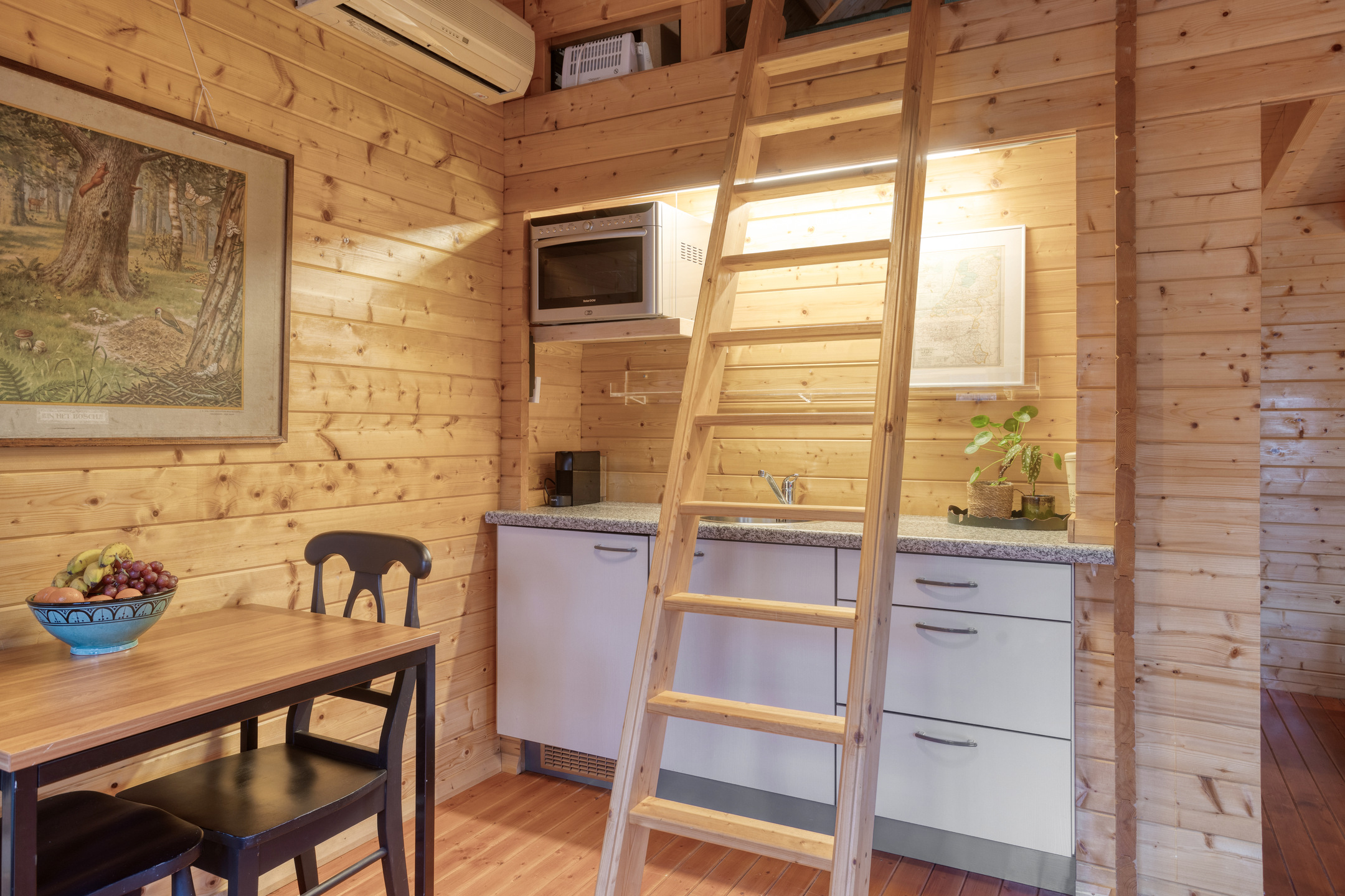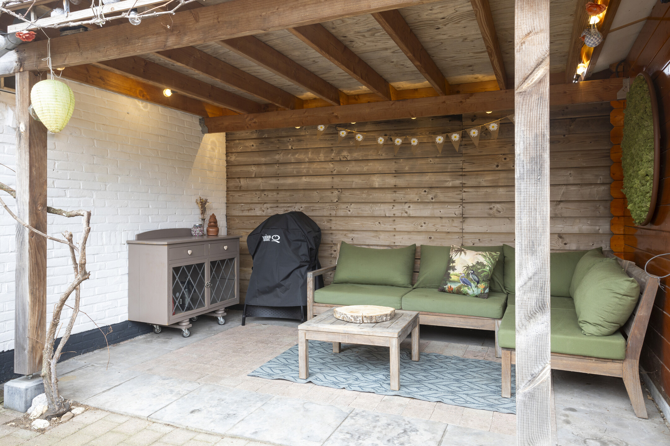 Achter in de tuin staat een grote houten gastenverblijf met eigen voorzieningen: o.a. zitgedeelte met keukenblok, aparte slaapkamer, badkamer met stoomcabine/douche, waskom en zwevend closet en een ruime vliering. Uitgerust met een elektrische boiler en een airco (verwarmen en koelen) waardoor dit een heerlijke plek is om zelf te genieten of gasten te laten verblijven.