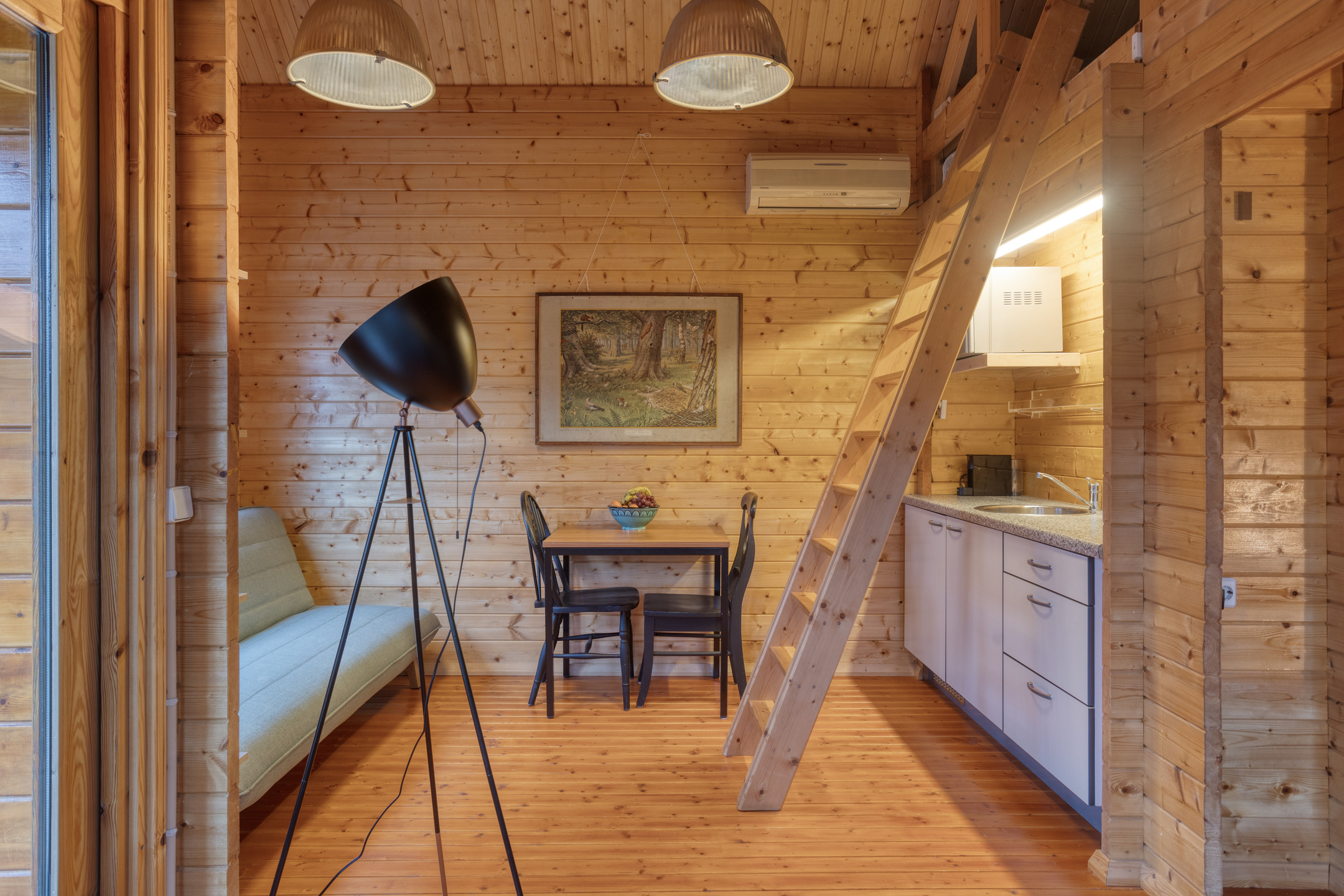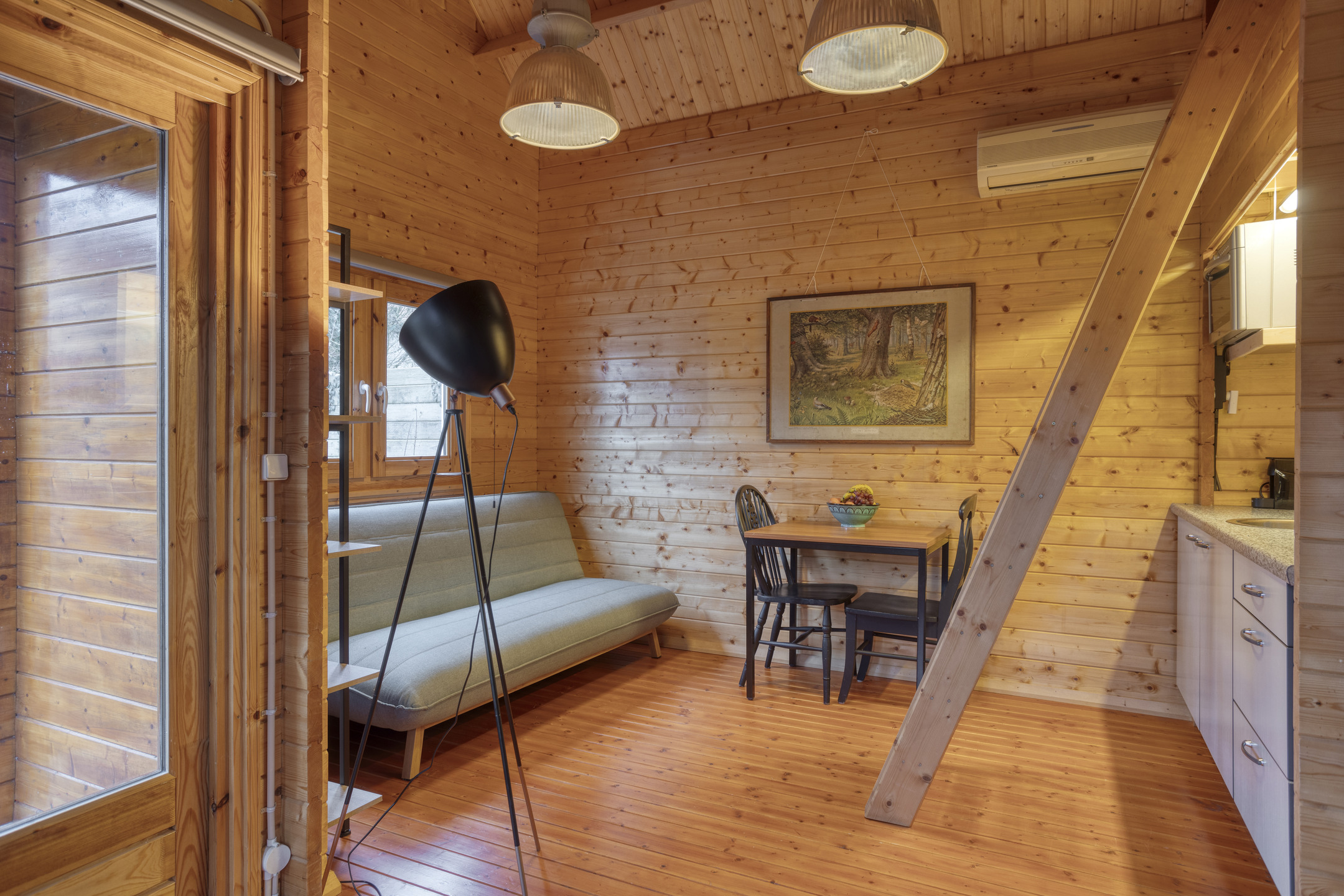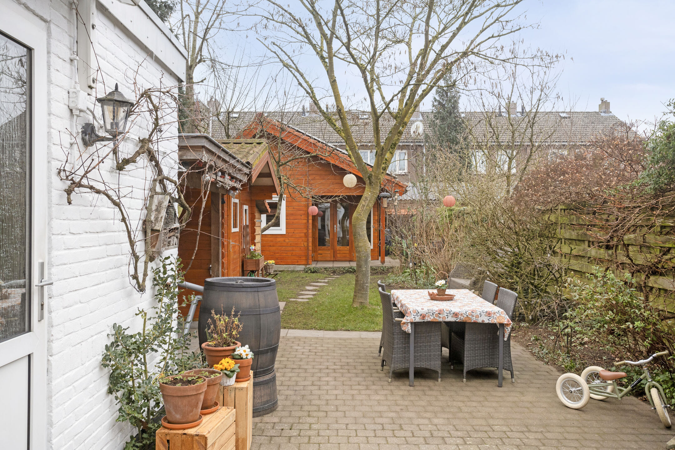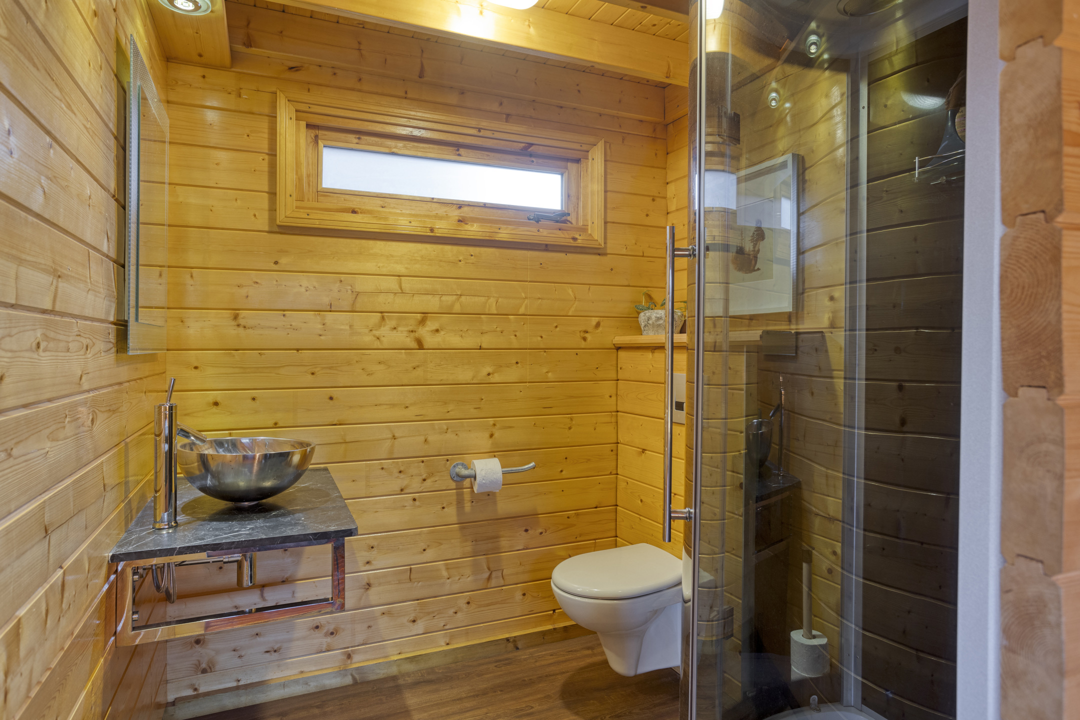 Achter in de tuin staat een grote houten gastenverblijf met eigen voorzieningen: o.a. zitgedeelte met keukenblok, aparte slaapkamer, badkamer met stoomcabine/douche, waskom en zwevend closet en een ruime vliering. Uitgerust met een elektrische boiler en een airco (verwarmen en koelen) waardoor dit een heerlijke plek is om zelf te genieten of gasten te laten verblijven.