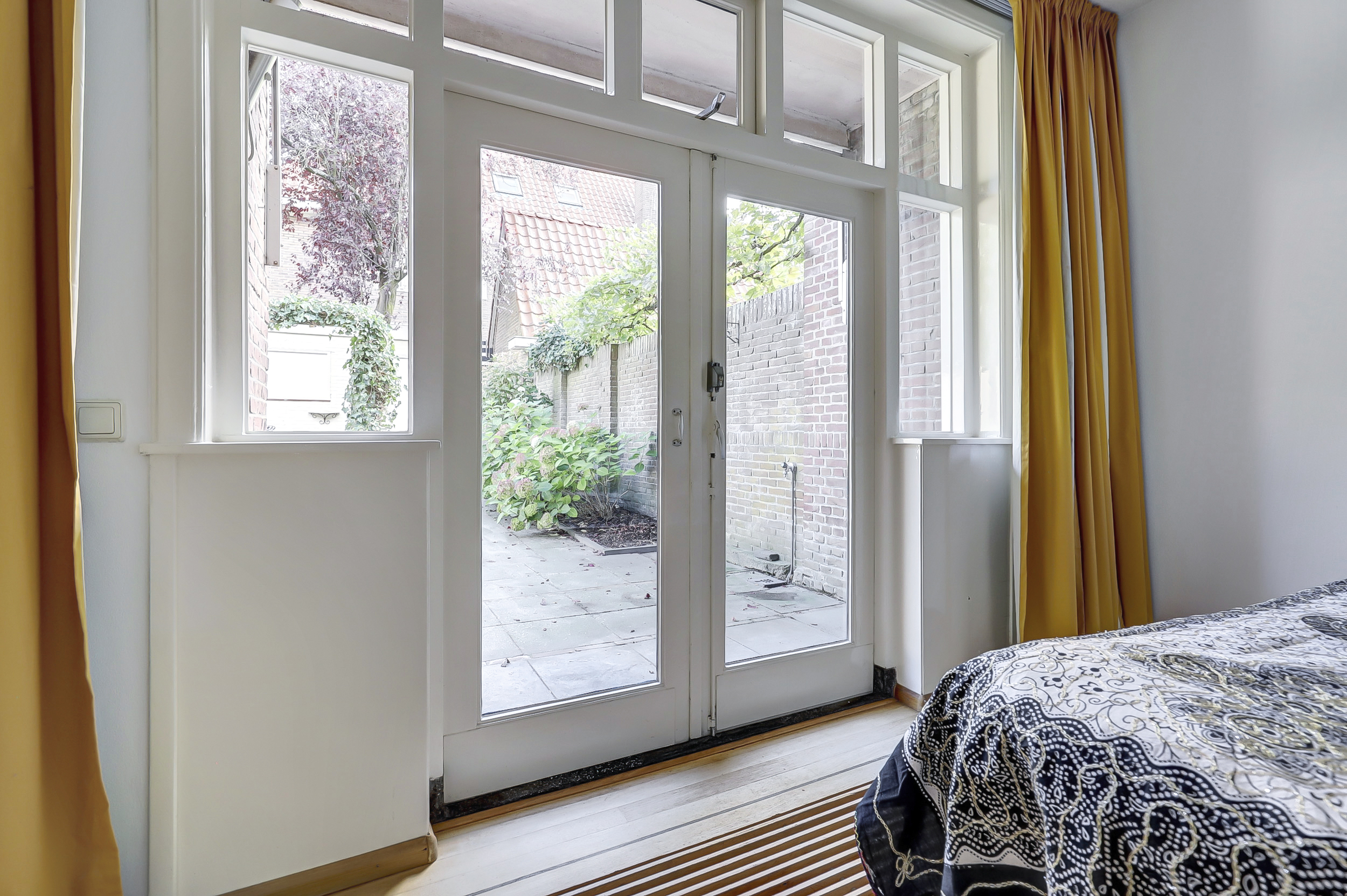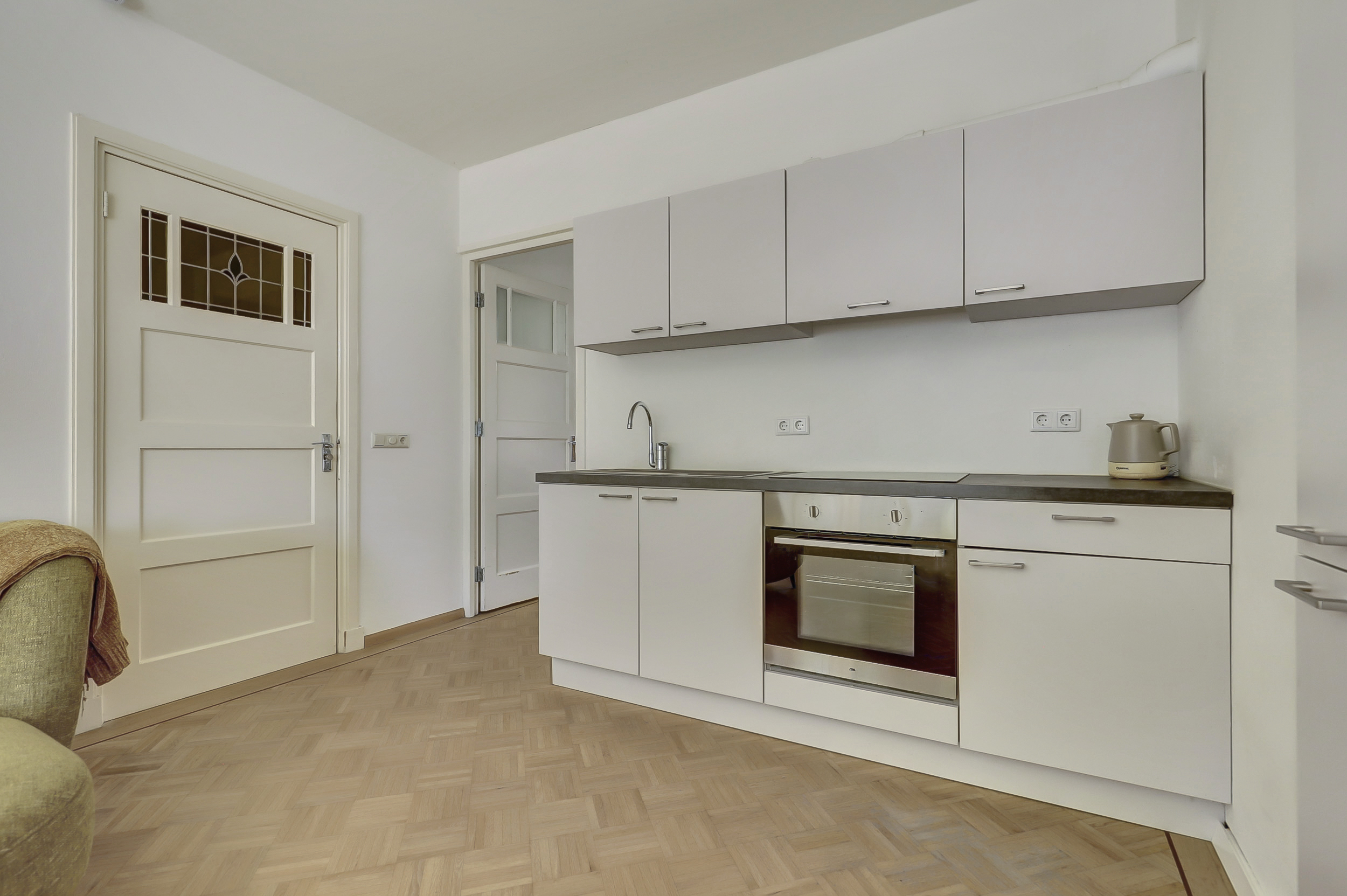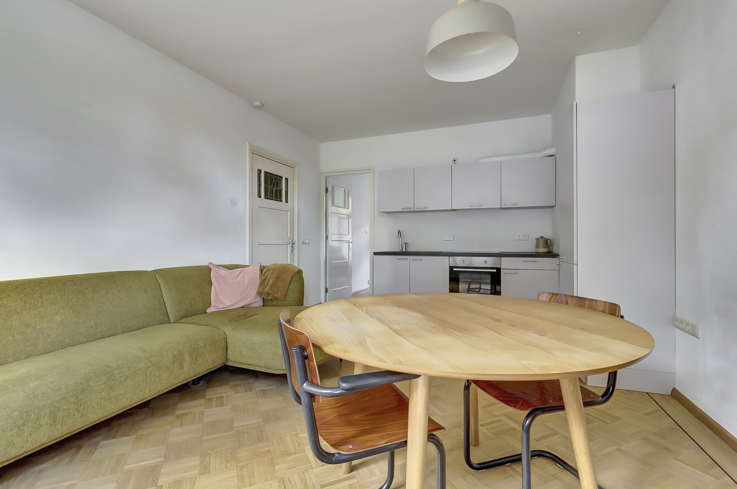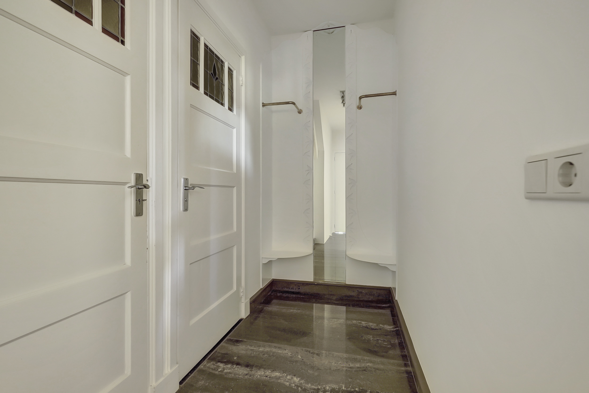 Je komt binnen via de gezamenlijke toegangsdeur en het imposante trappenhuis met prachtige glas-in-looddetails — echte jaren ’30-charme. Vanuit hier stap je je eigen hal binnen, met toegang tot het toilet en de trap naar de kelder. Aan de voorzijde bevindt zich de woonkamer met erker, waar het licht mooi binnenvalt. De woonkamer en slaapkamer zijn voorzien van een lichte eiken parketvloer, wat de ruimtes een warme en stijlvolle uitstraling geeft. De open keuken is uitgerust met een inductiekookplaat, spoelbak, combioven en koel-/vriescombinatie. Vanuit de slaapkamer aan de achterzijde heb je openslaande deuren naar de tuin, zodat binnen en buiten naadloos in elkaar overlopen. De badkamer beschikt over een inloopdouche, tweede toilet, wastafelmeubel en een handige muurkast, met eveneens toegang tot de tuin.