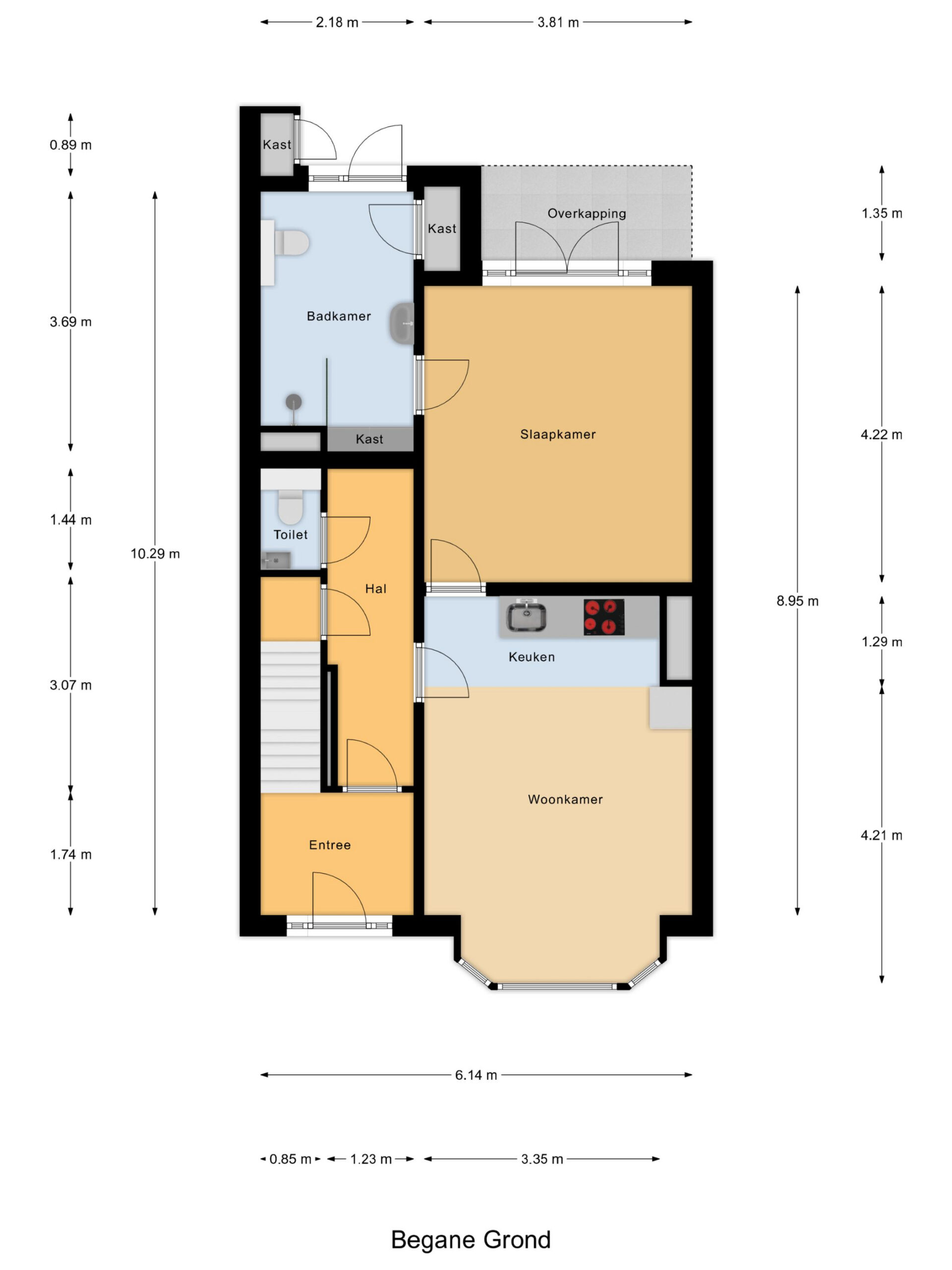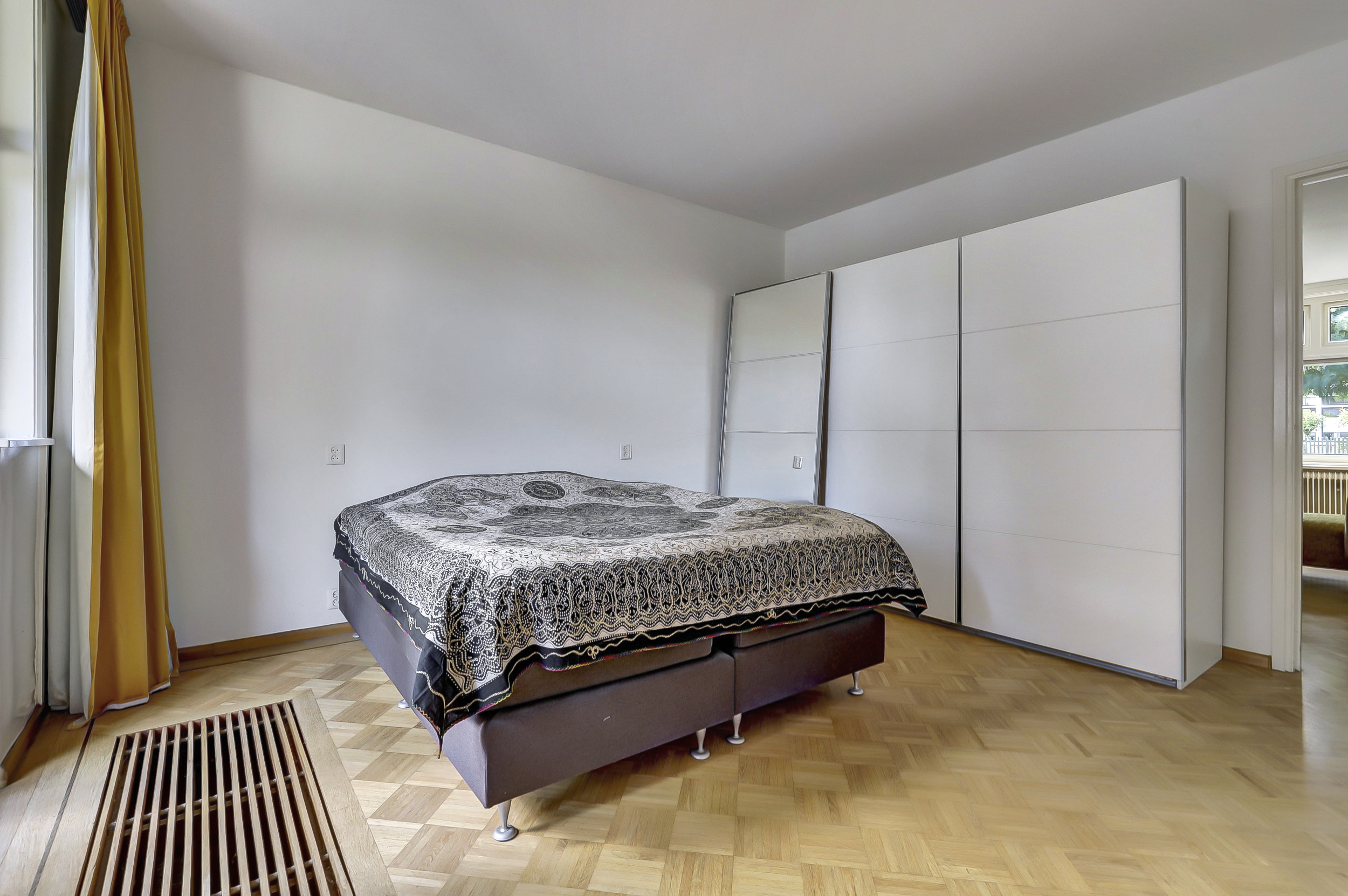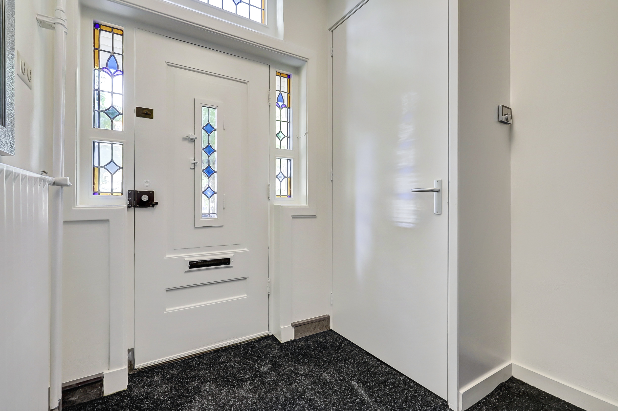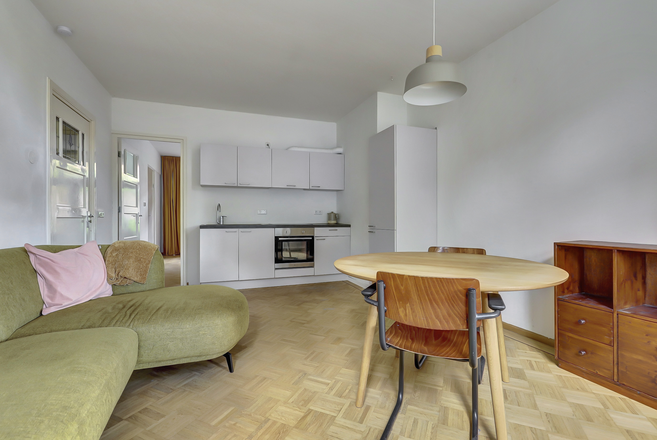 Je komt binnen via de gezamenlijke toegangsdeur en het imposante trappenhuis met prachtige glas-in-looddetails — echte jaren ’30-charme. Vanuit hier stap je je eigen hal binnen, met toegang tot het toilet en de trap naar de kelder. Aan de voorzijde bevindt zich de woonkamer met erker, waar het licht mooi binnenvalt. De woonkamer en slaapkamer zijn voorzien van een lichte eiken parketvloer, wat de ruimtes een warme en stijlvolle uitstraling geeft. De open keuken is uitgerust met een inductiekookplaat, spoelbak, combioven en koel-/vriescombinatie. Vanuit de slaapkamer aan de achterzijde heb je openslaande deuren naar de tuin, zodat binnen en buiten naadloos in elkaar overlopen. De badkamer beschikt over een inloopdouche, tweede toilet, wastafelmeubel en een handige muurkast, met eveneens toegang tot de tuin.