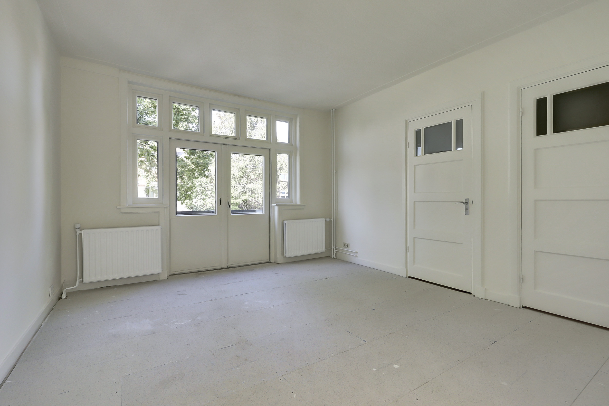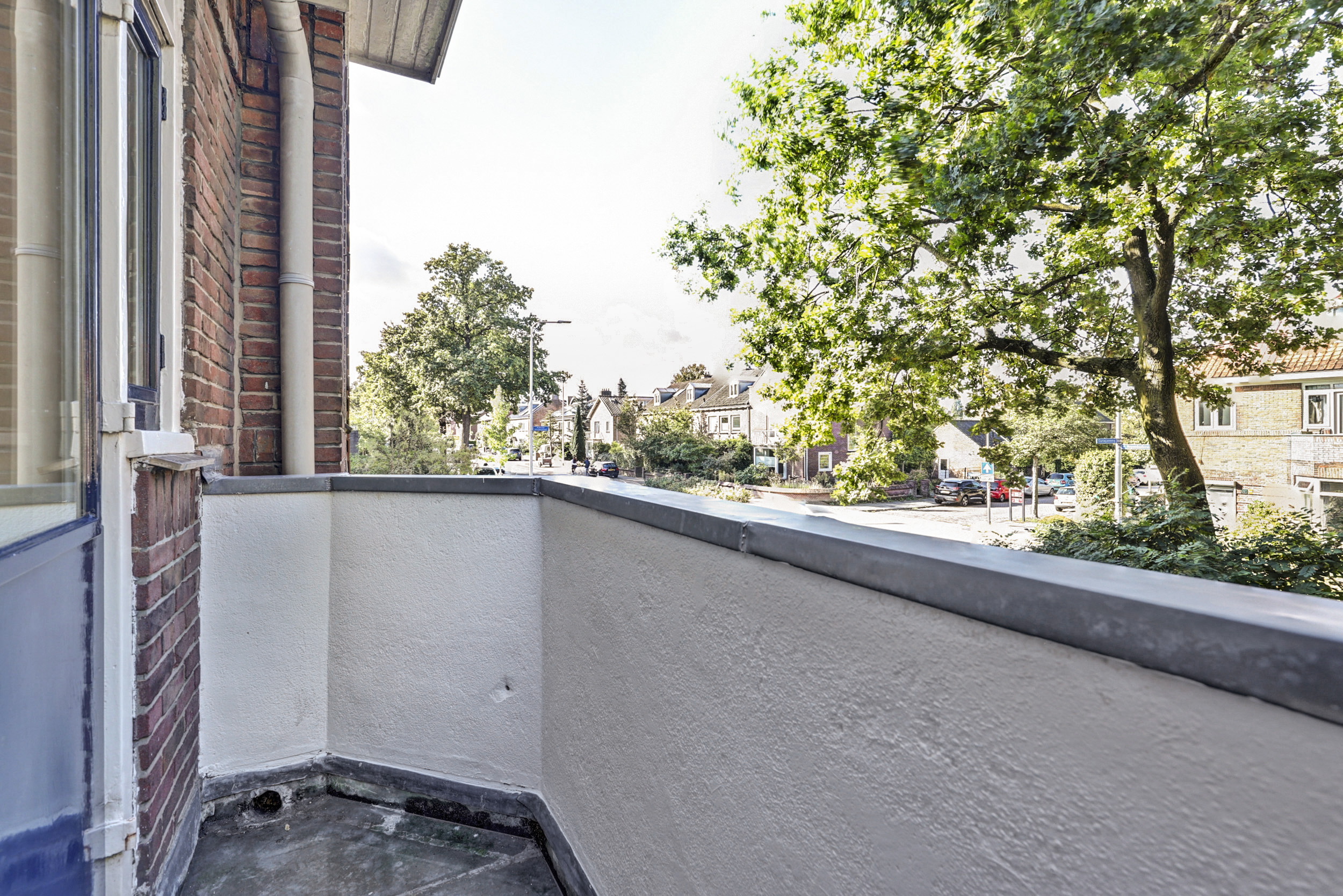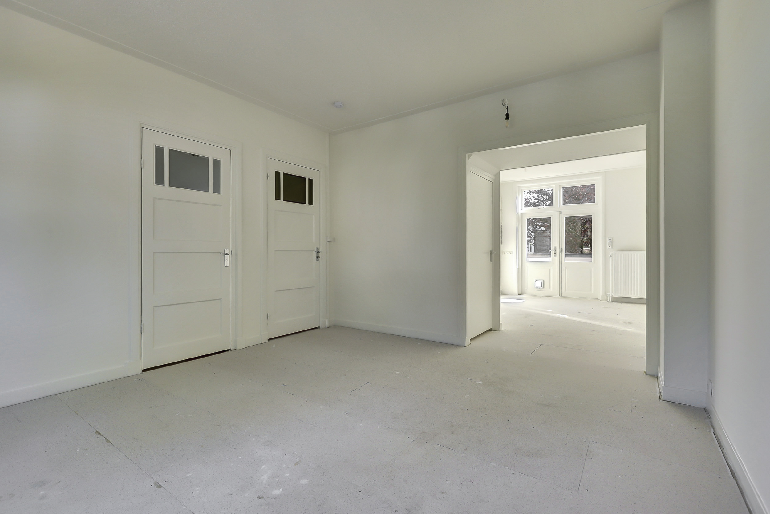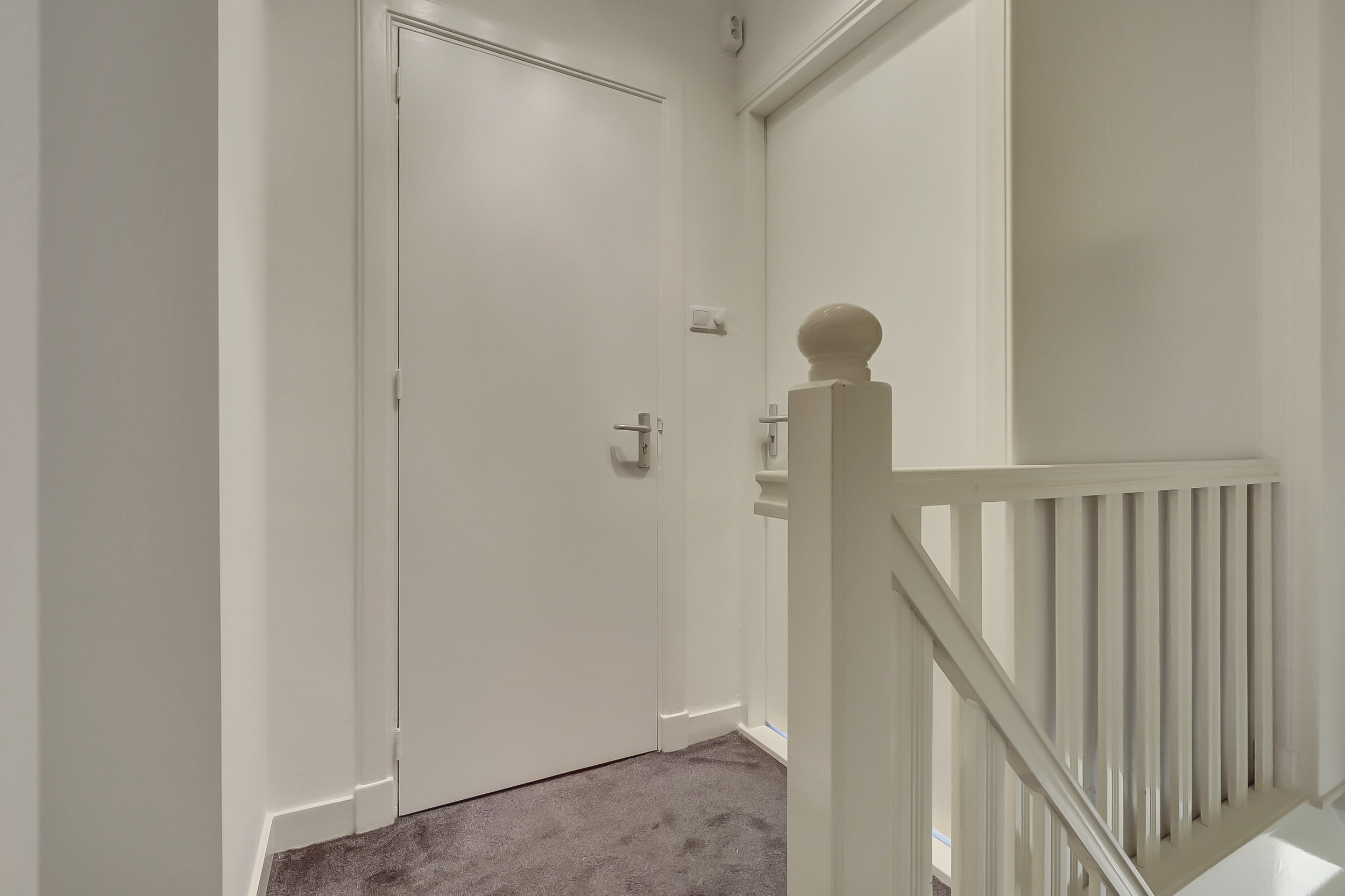 Je komt binnen via de gezamenlijke toegangsdeur en wordt meteen verrast door het imposante trappenhuis met prachtige glas-in-looddetails — echte jaren ’30-charme. Vanuit hier bereik je de eerste verdieping, waar het appartement is gelegen. Op de overloop krijg je toegang tot de royale woonkamer en suite. Dankzij de openslaande deuren naar de balkons aan zowel de voor- als achterzijde geniet je van een overvloed aan licht en een fijne, open sfeer. De woonkeuken is praktisch ingericht met een inductiekookplaat, spoelbak, koelkast met vriesvak en combioven, en biedt toegang tot het balkon aan de achterzijde. Tot slot beschikt de woning over een slaapkamer met vaste muurkast en een badkamer met ligbad, inloopdouche, wastafel en toilet.