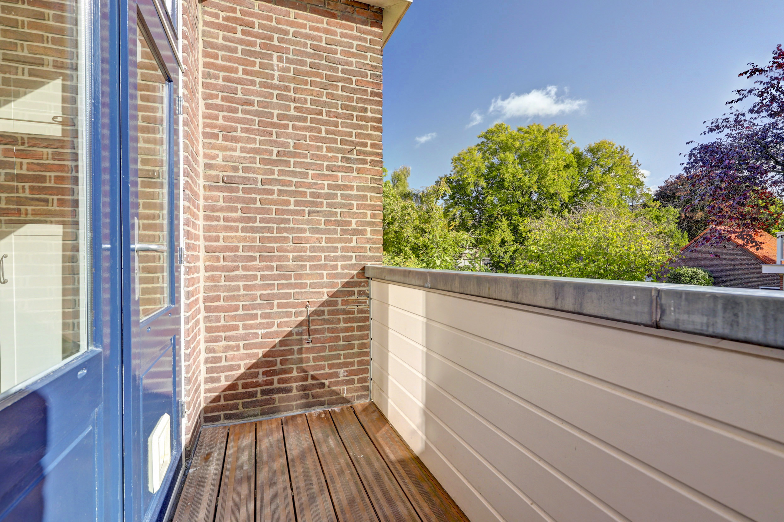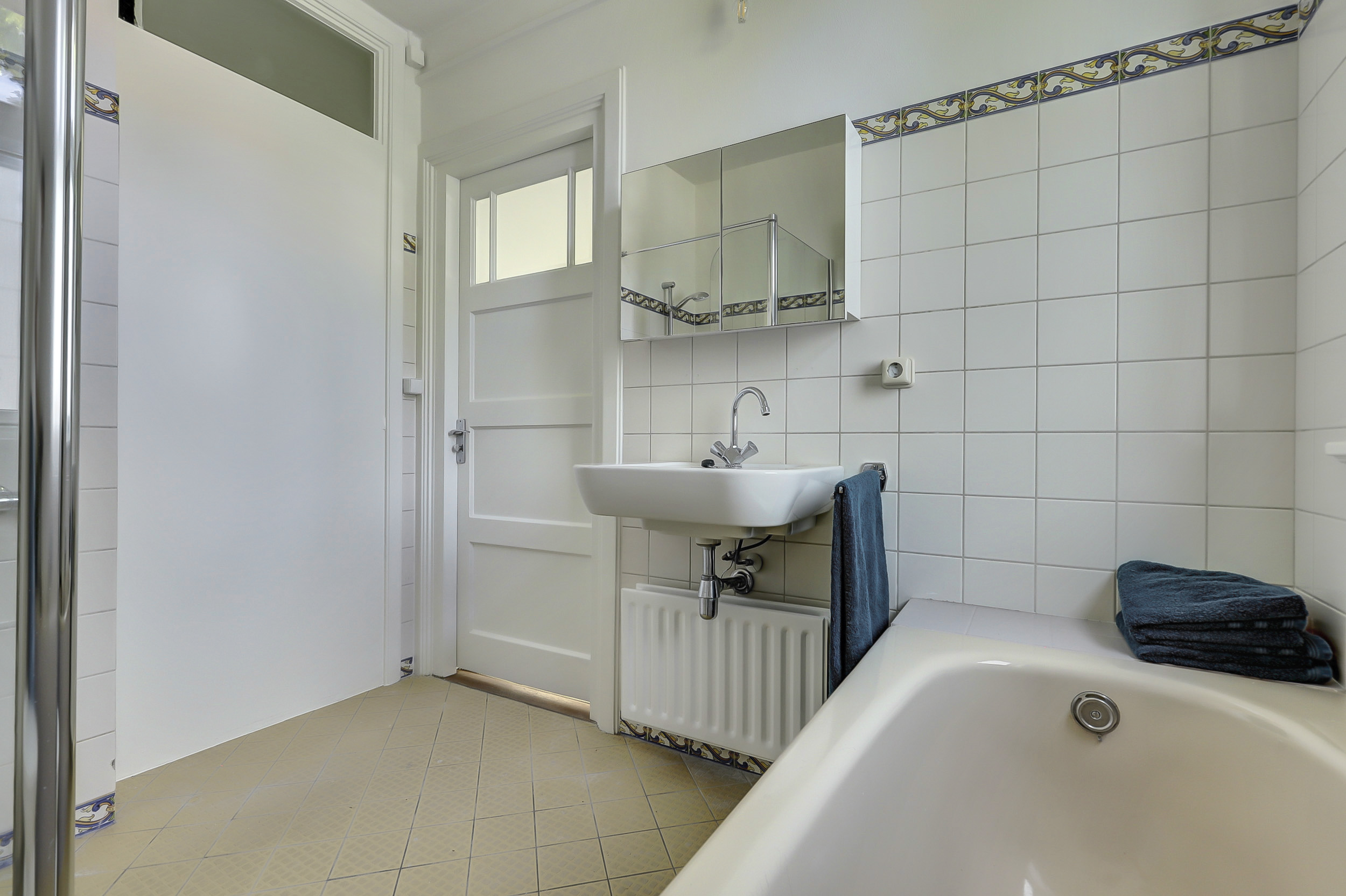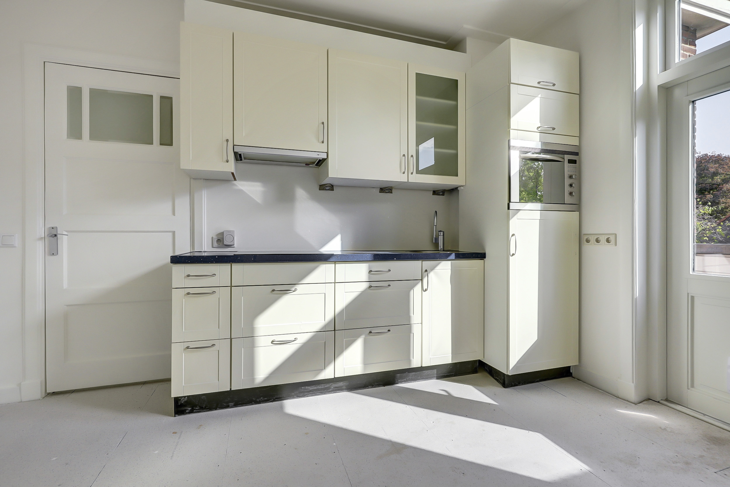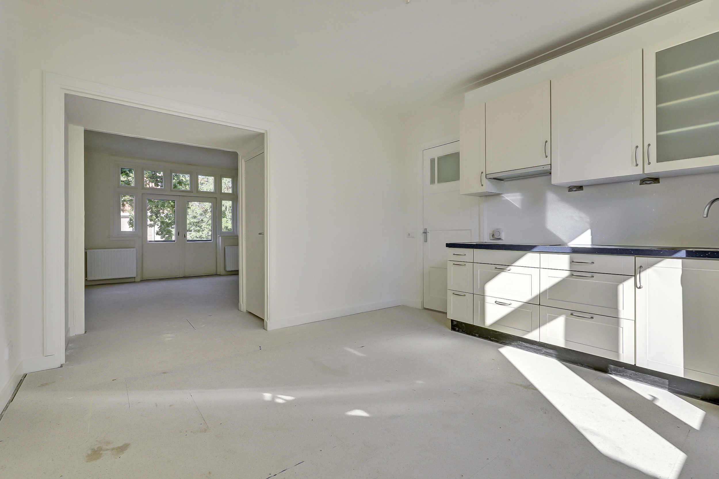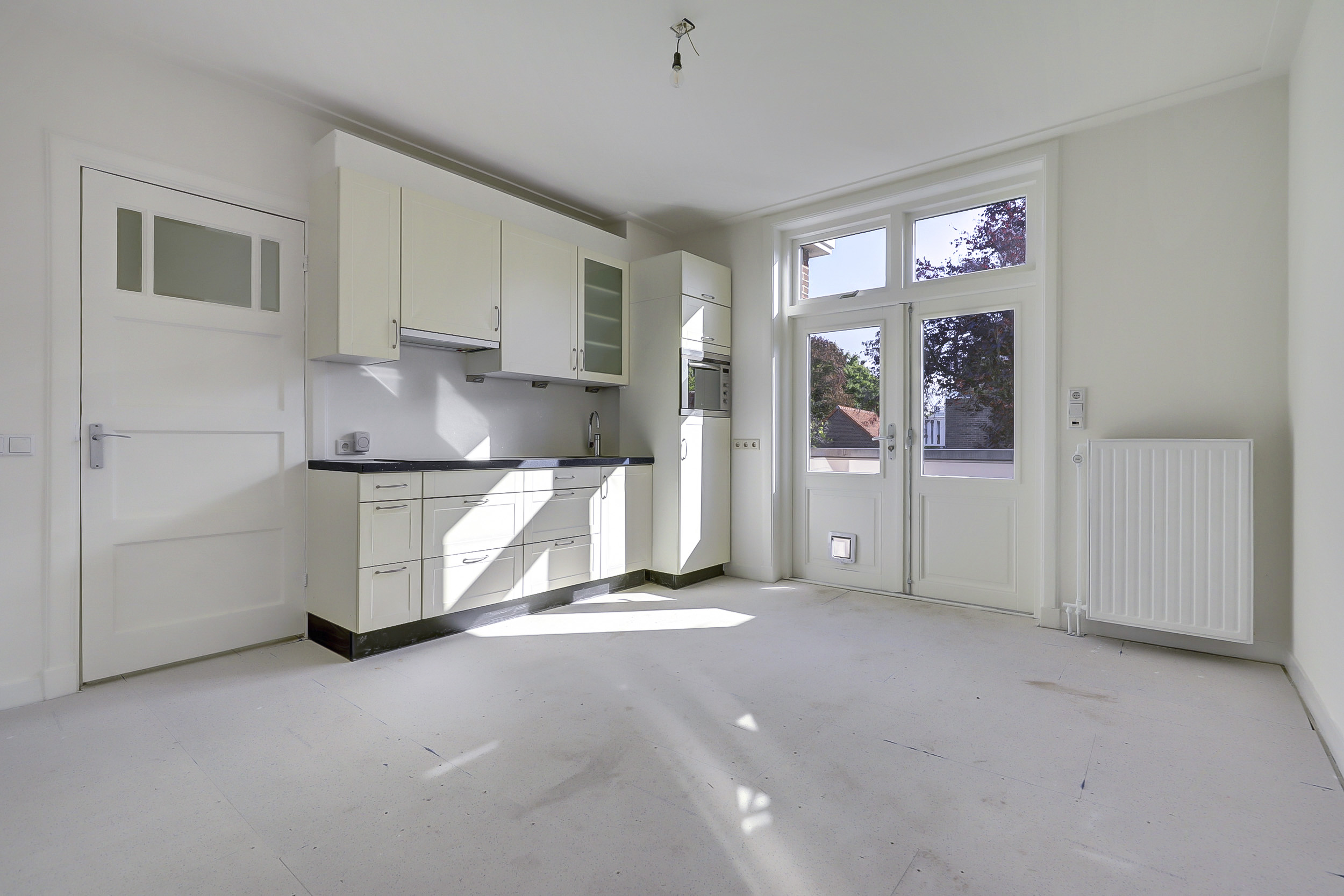 Je komt binnen via de gezamenlijke toegangsdeur en wordt meteen verrast door het imposante trappenhuis met prachtige glas-in-looddetails — echte jaren ’30-charme. Vanuit hier bereik je de eerste verdieping, waar het appartement is gelegen. Op de overloop krijg je toegang tot de royale woonkamer en suite. Dankzij de openslaande deuren naar de balkons aan zowel de voor- als achterzijde geniet je van een overvloed aan licht en een fijne, open sfeer. De woonkeuken is praktisch ingericht met een inductiekookplaat, spoelbak, koelkast met vriesvak en combioven, en biedt toegang tot het balkon aan de achterzijde. Tot slot beschikt de woning over een slaapkamer met vaste muurkast en een badkamer met ligbad, inloopdouche, wastafel en toilet.