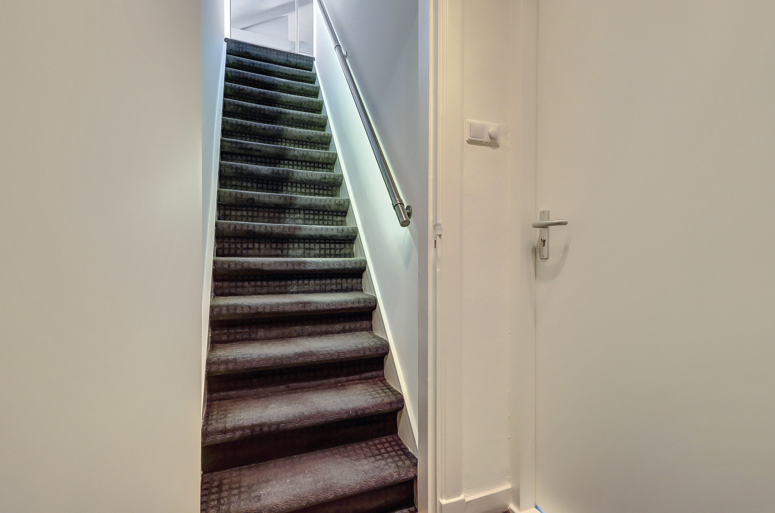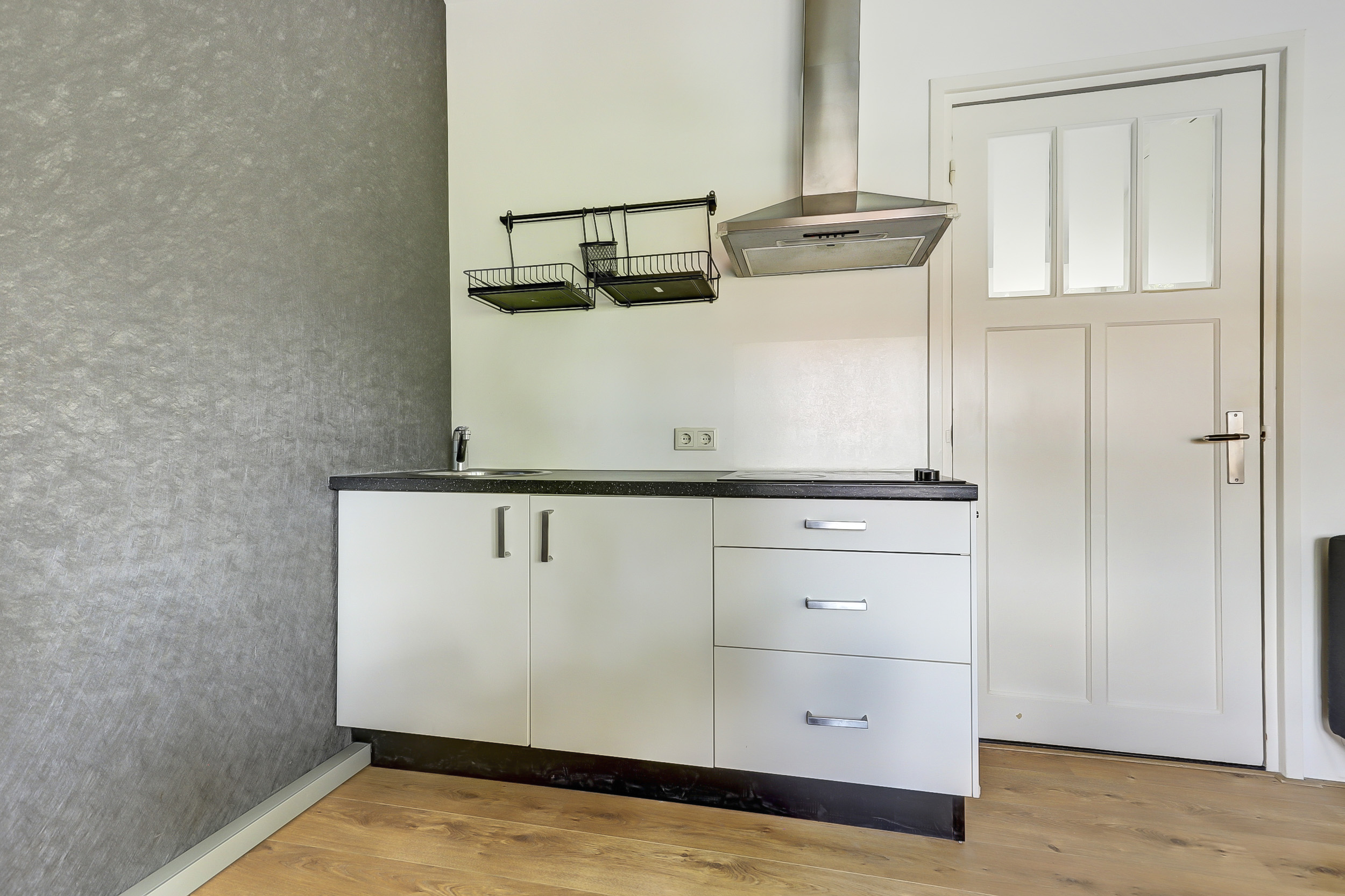 Je komt binnen via de gezamenlijke toegangsdeur en wordt meteen verrast door het imposante trappenhuis met prachtige glas-in-looddetails — echte jaren ’30-charme. Via de gezamenlijke entree en trapopgang bereik je de tweede verdieping, waar de studio is gelegen. De woonruimte is praktisch en compleet ingericht met een keukenblok voorzien van een 3-pits keramische kookplaat, afzuigkap, spoelbak en koelkast. Ook is er een witgoedaansluiting aanwezig. Dankzij de dakkapellen aan de voor- en achterzijde geniet je van extra licht en ruimte, terwijl rolluiken zorgen voor privacy en comfort.