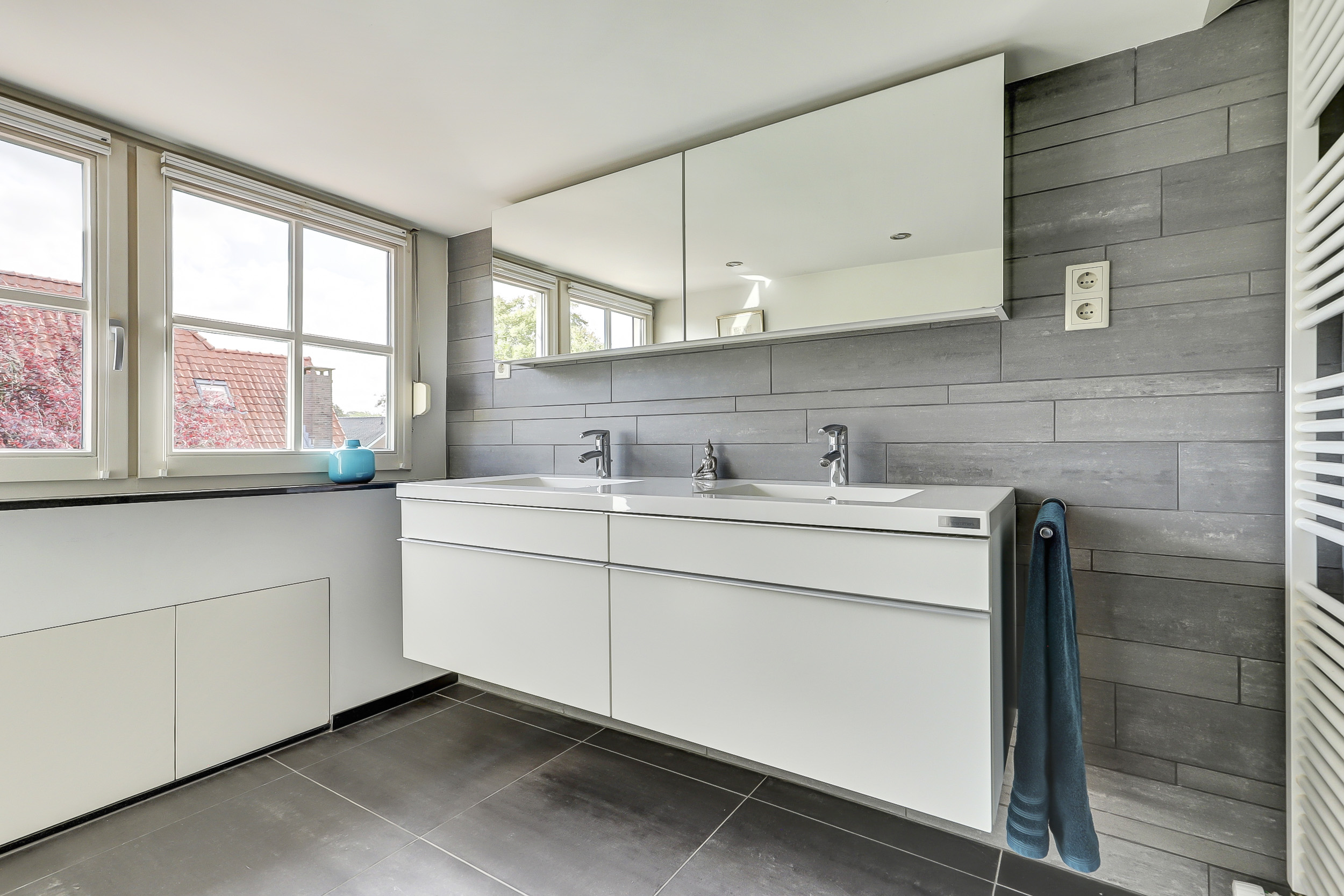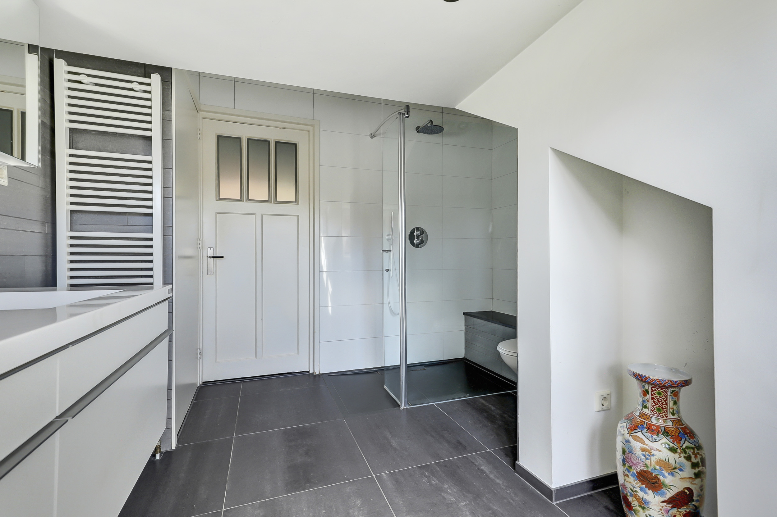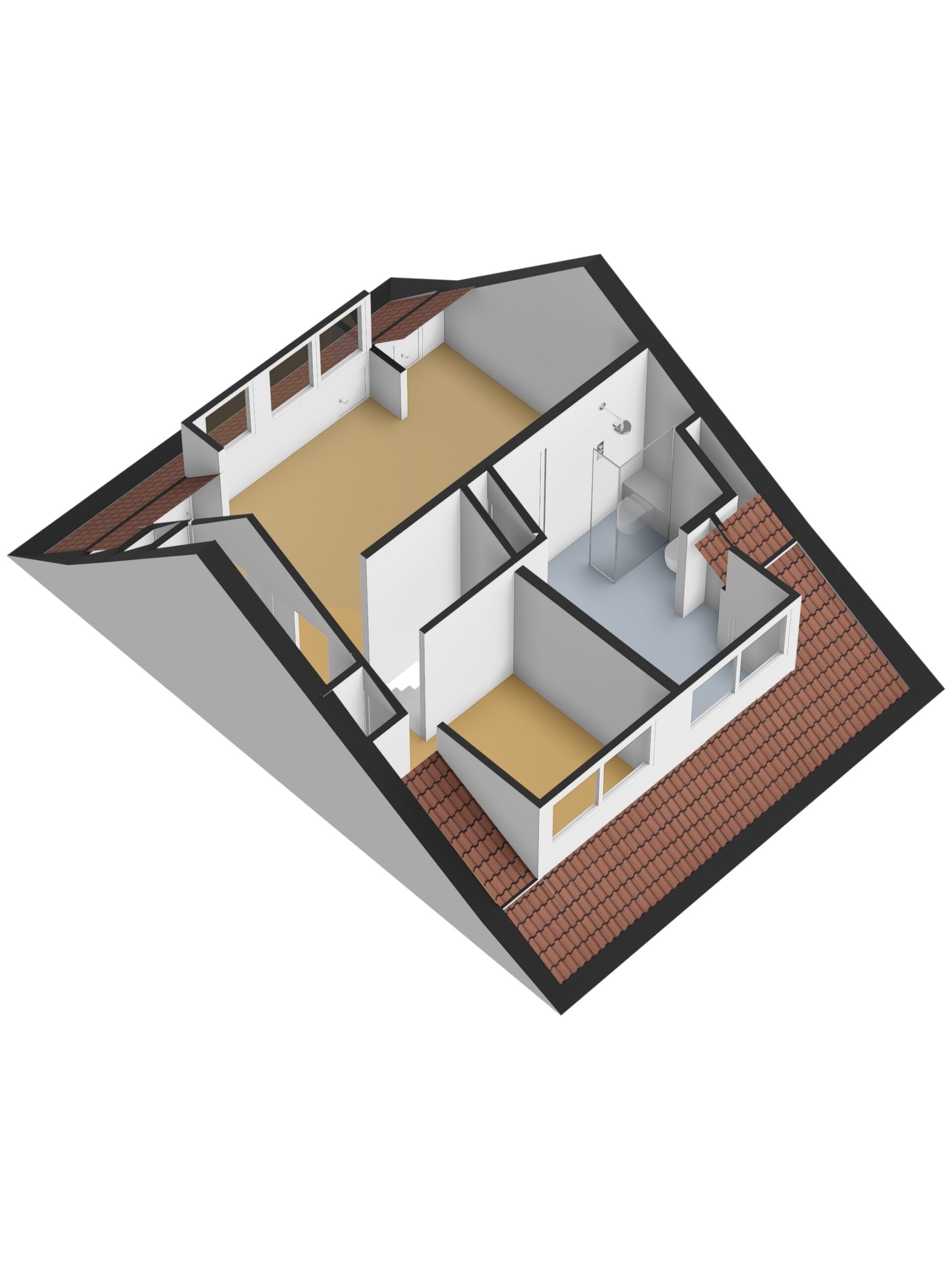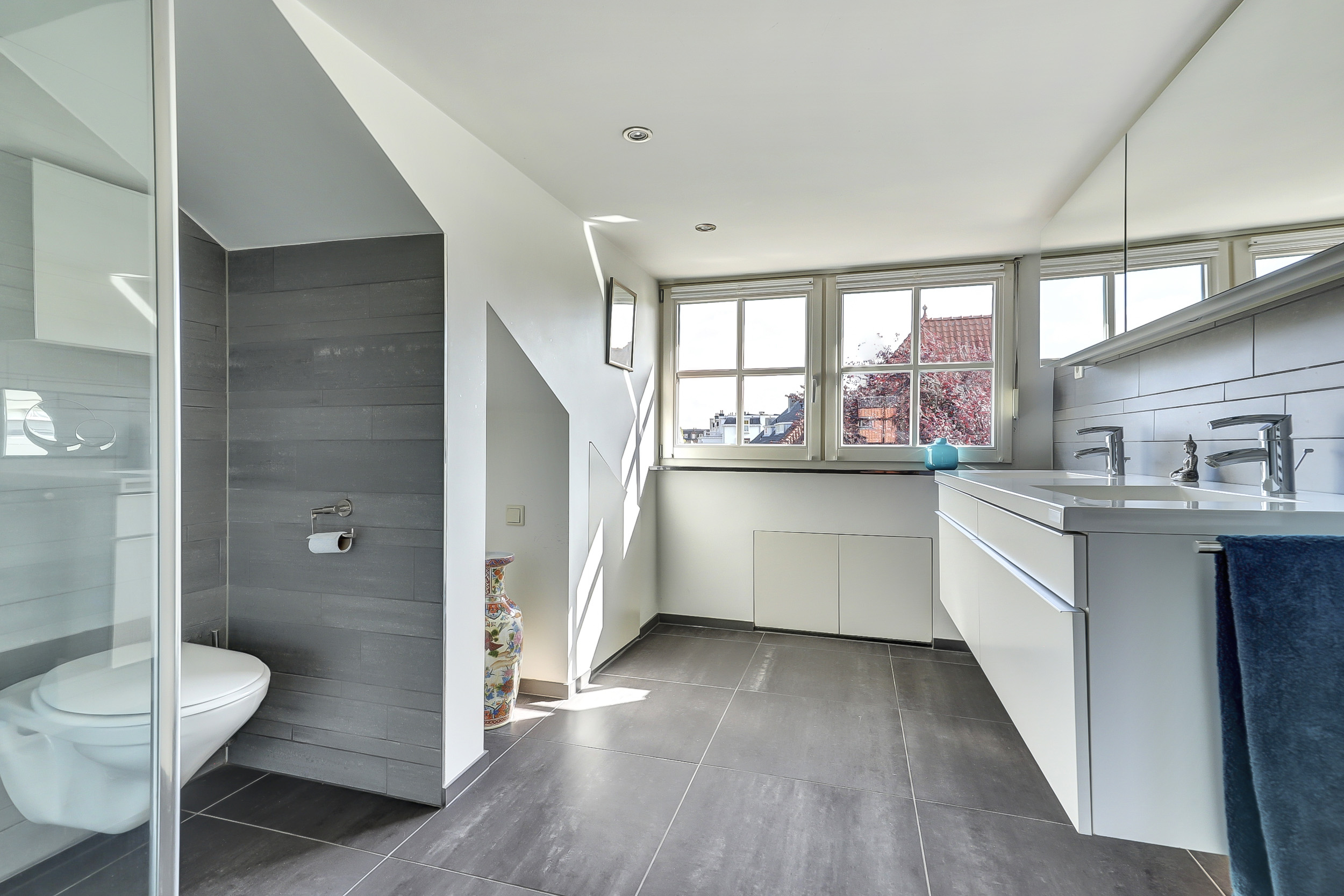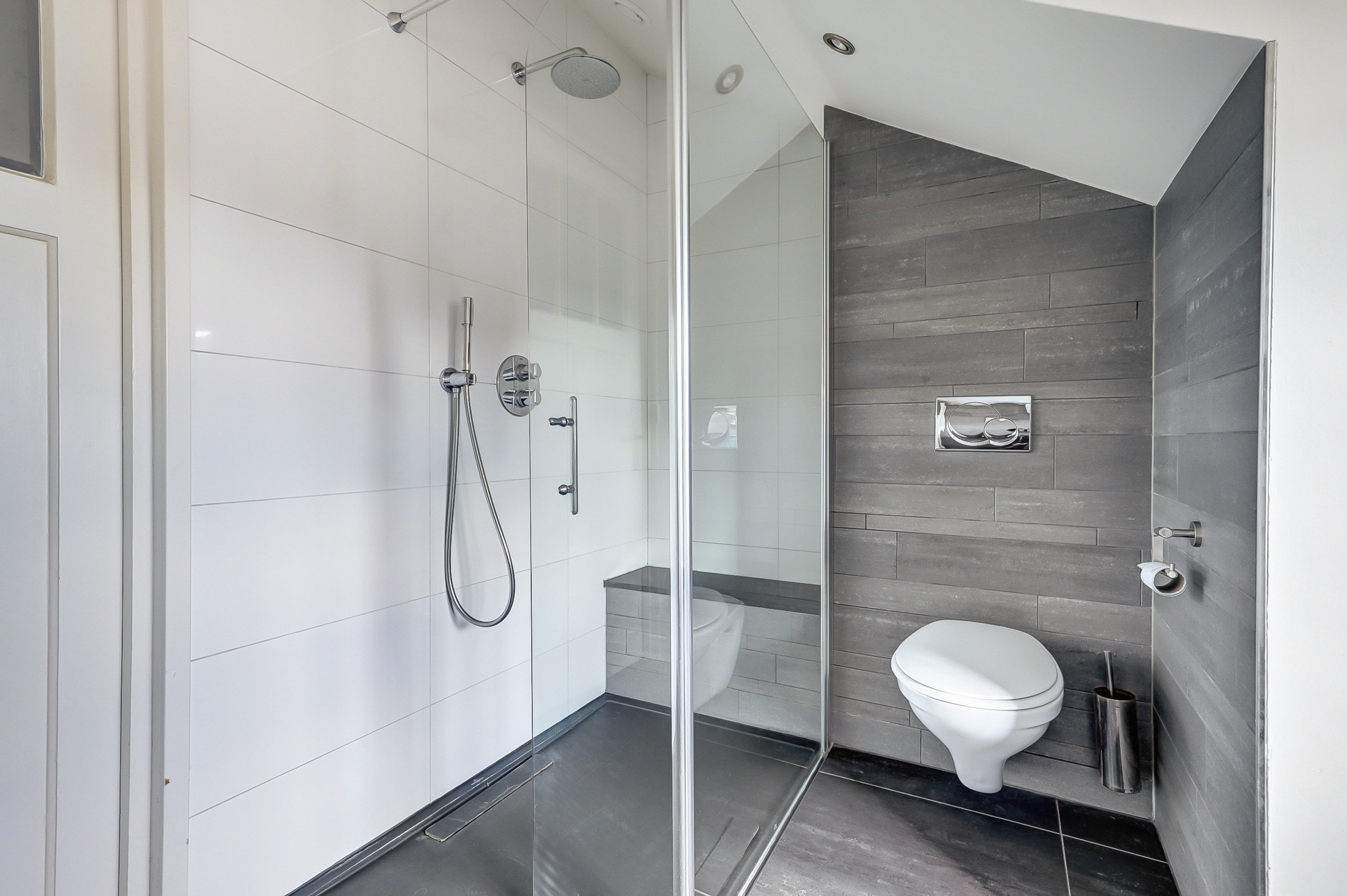 De badkamer beschikt over een douche, toilet en een dubbel wastafelmeubel. Onder de schuine dakvlakken zijn knieschotten aanwezig, ideaal voor extra bergruimte.