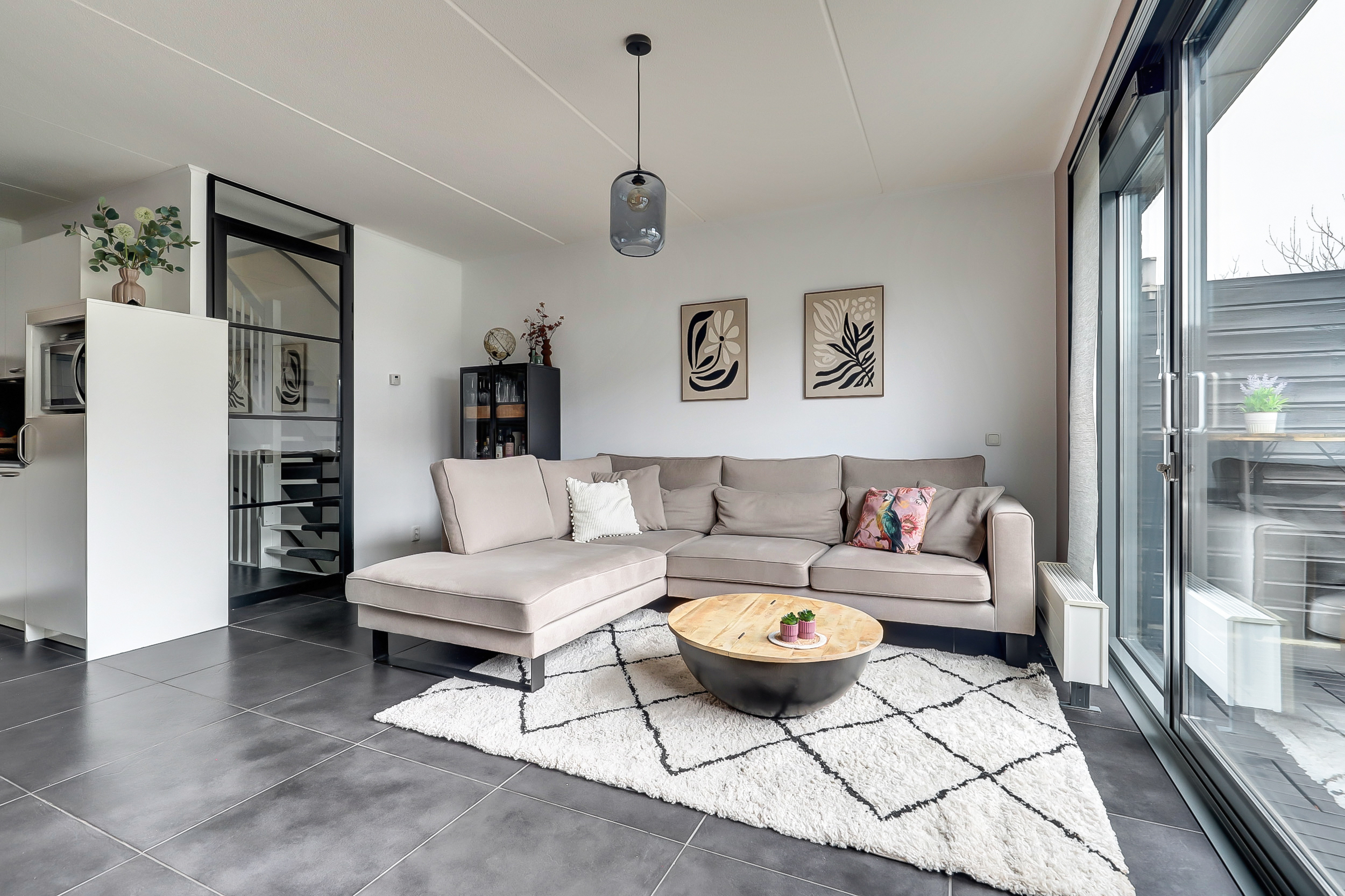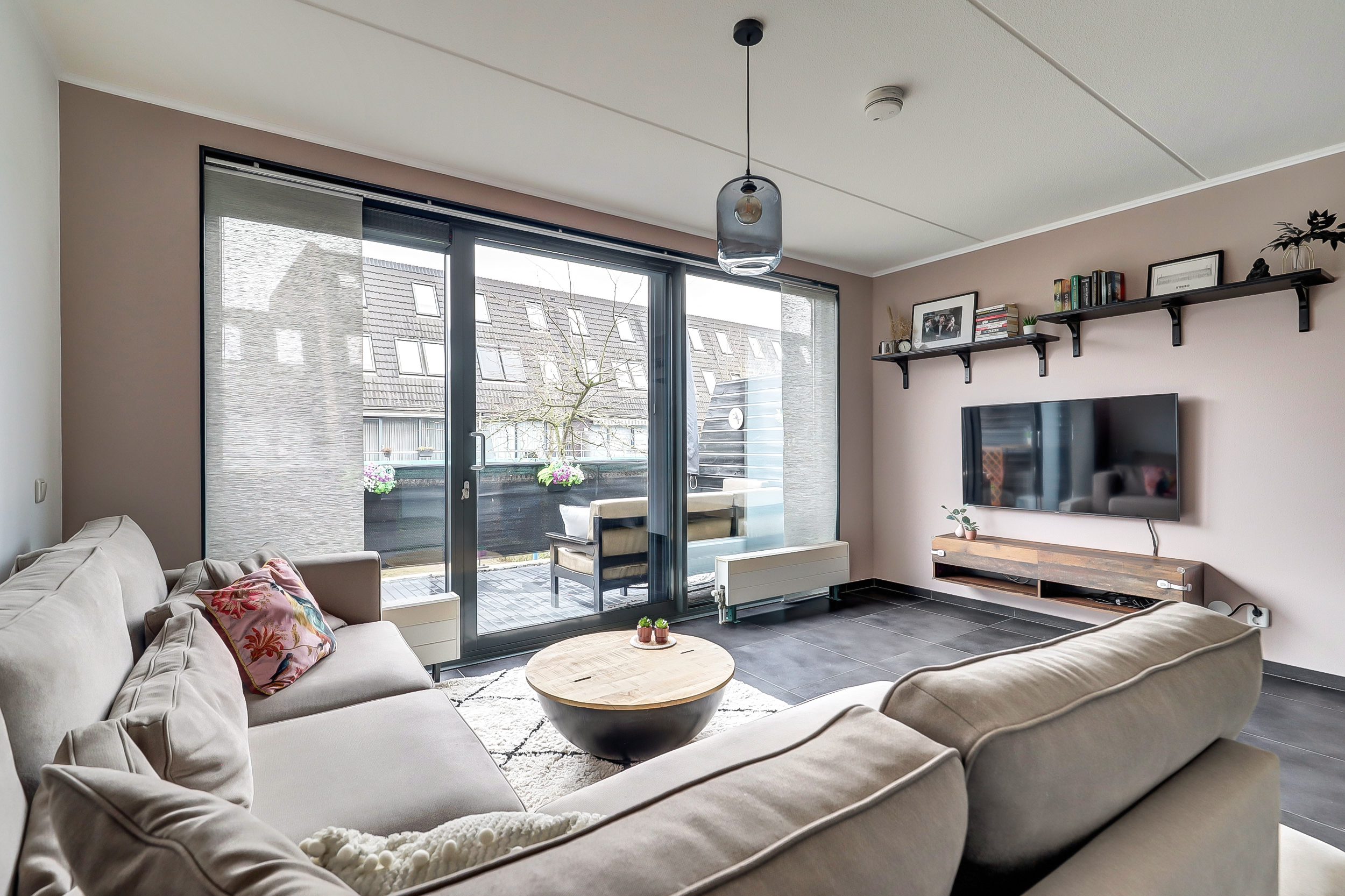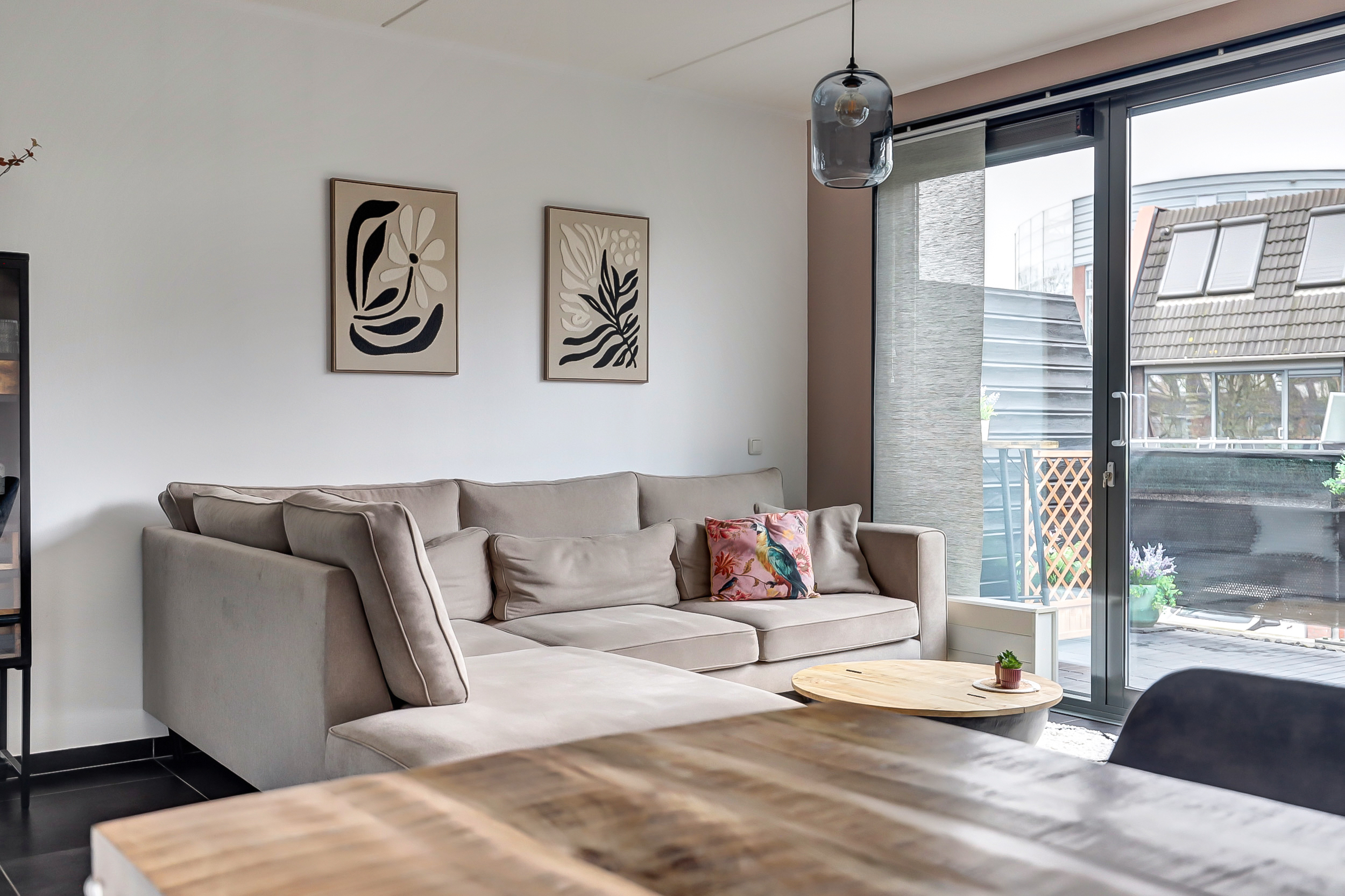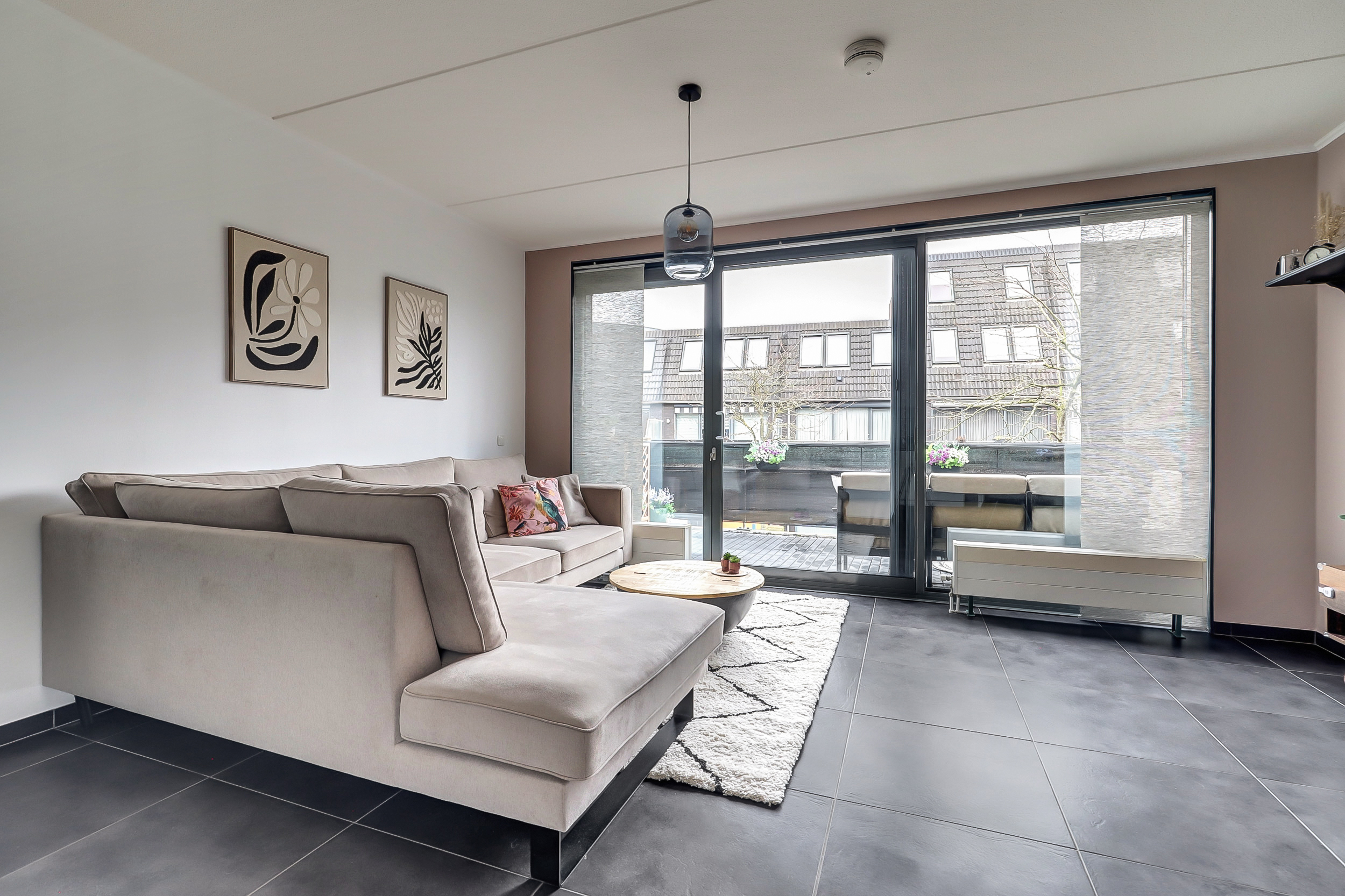 Boven kom je uit op de overloop met toilet en fonteintje. De woonkamer ligt aan de achterzijde en trekt direct daglicht naar binnen dankzij de schuifpui. Die schuifpui opent het balkon en geeft je dat fijne binnen-buitengevoel.