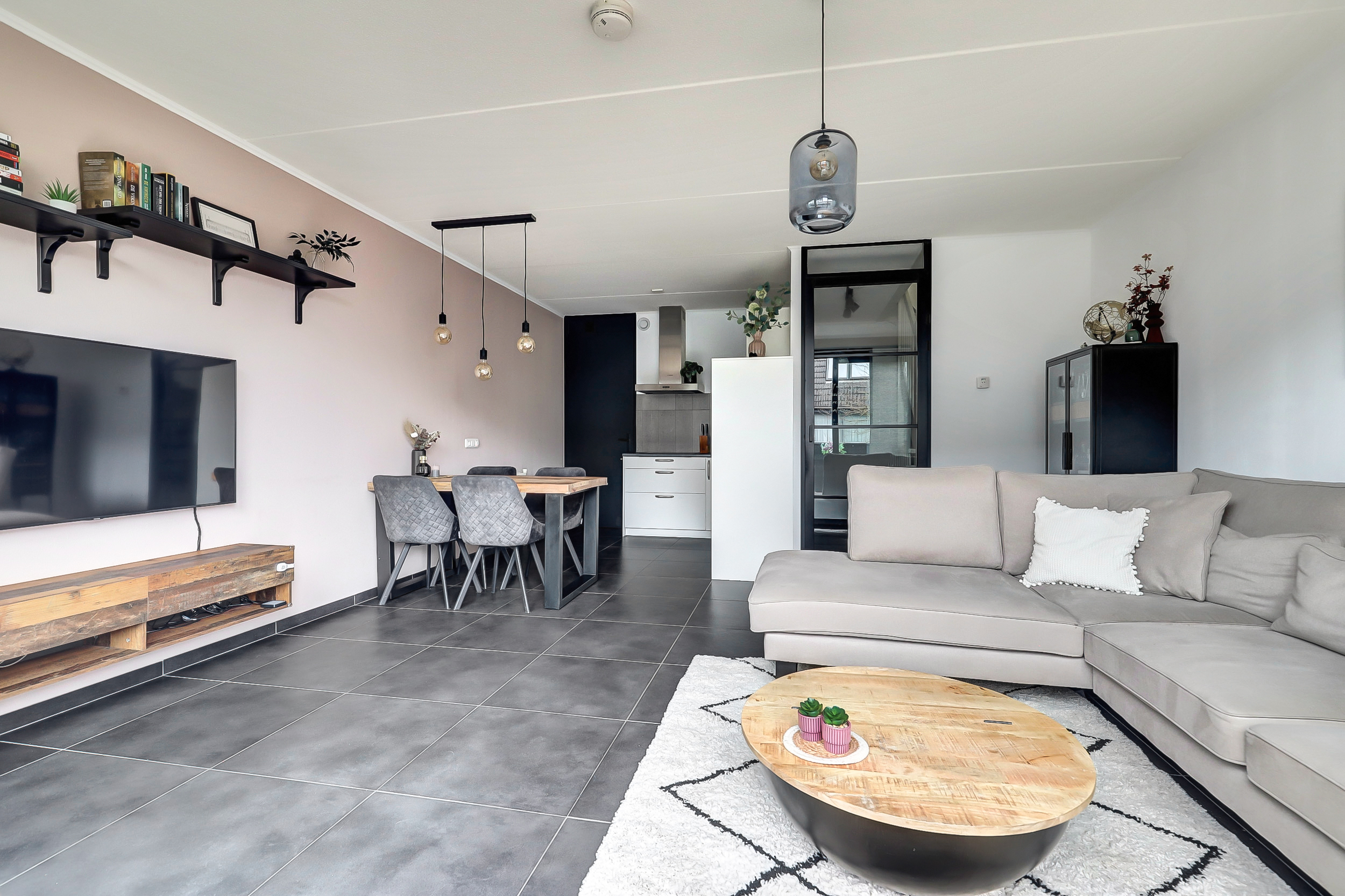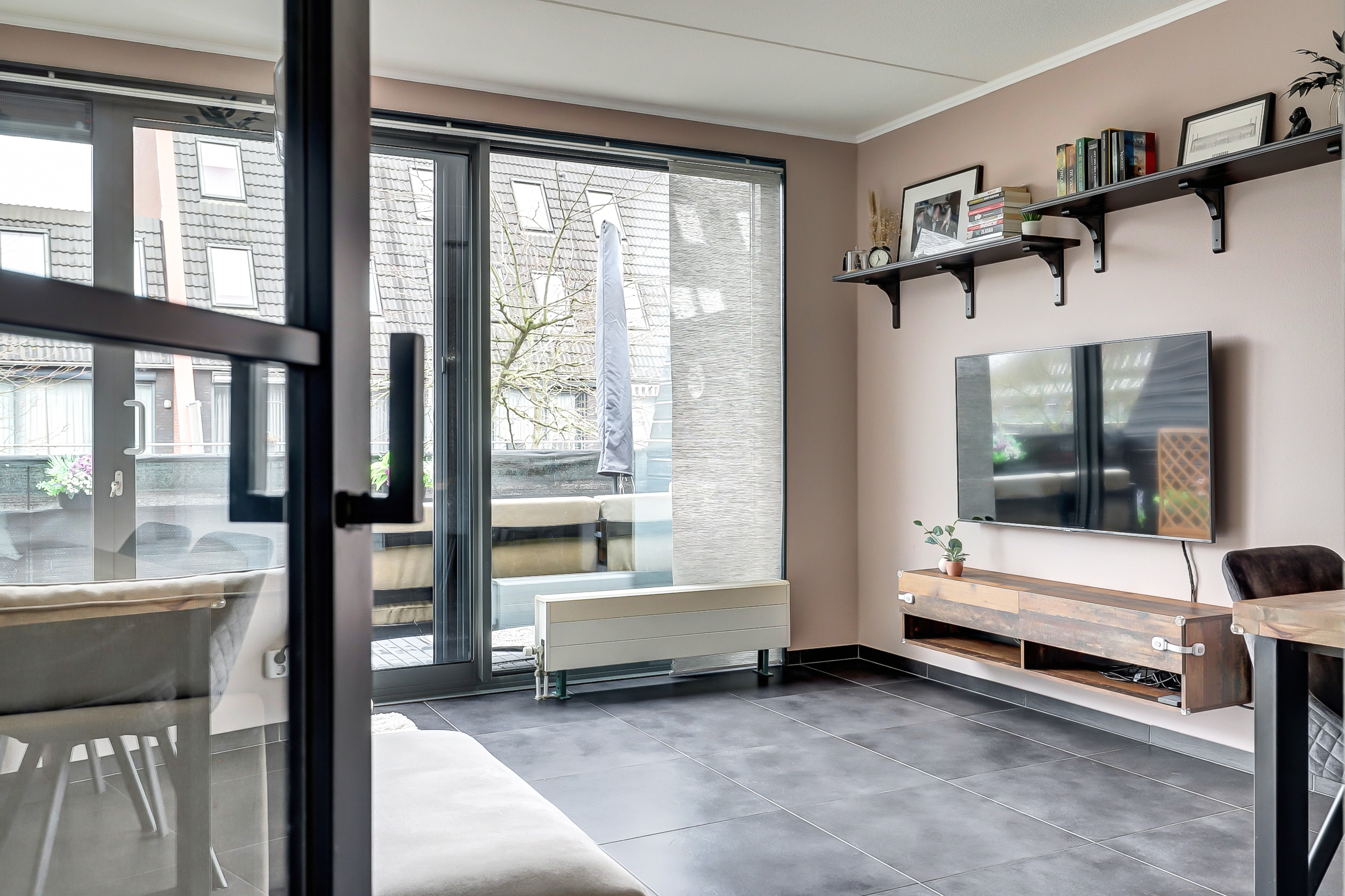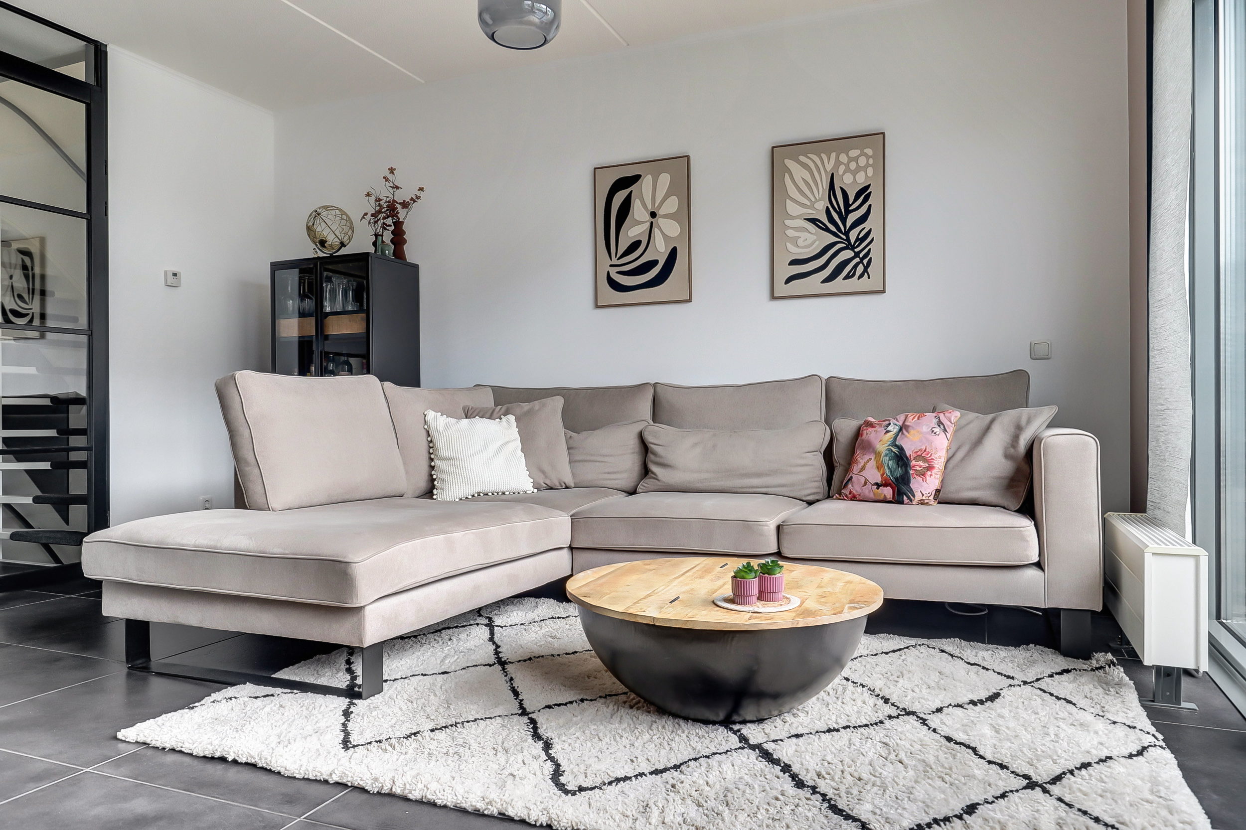 Boven kom je uit op de overloop met toilet en fonteintje. De woonkamer ligt aan de achterzijde en trekt direct daglicht naar binnen dankzij de schuifpui. Die schuifpui opent het balkon en geeft je dat fijne binnen-buitengevoel.