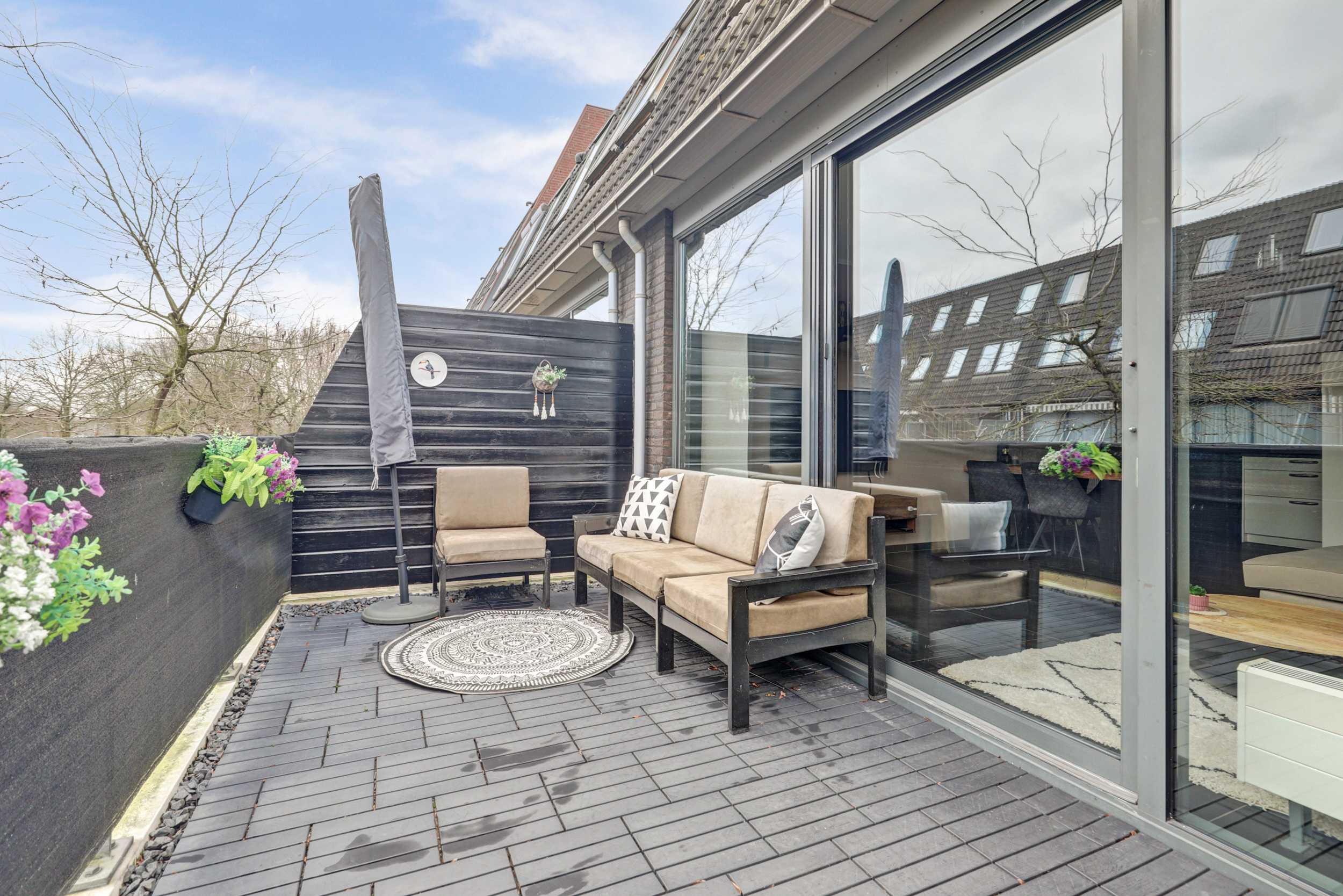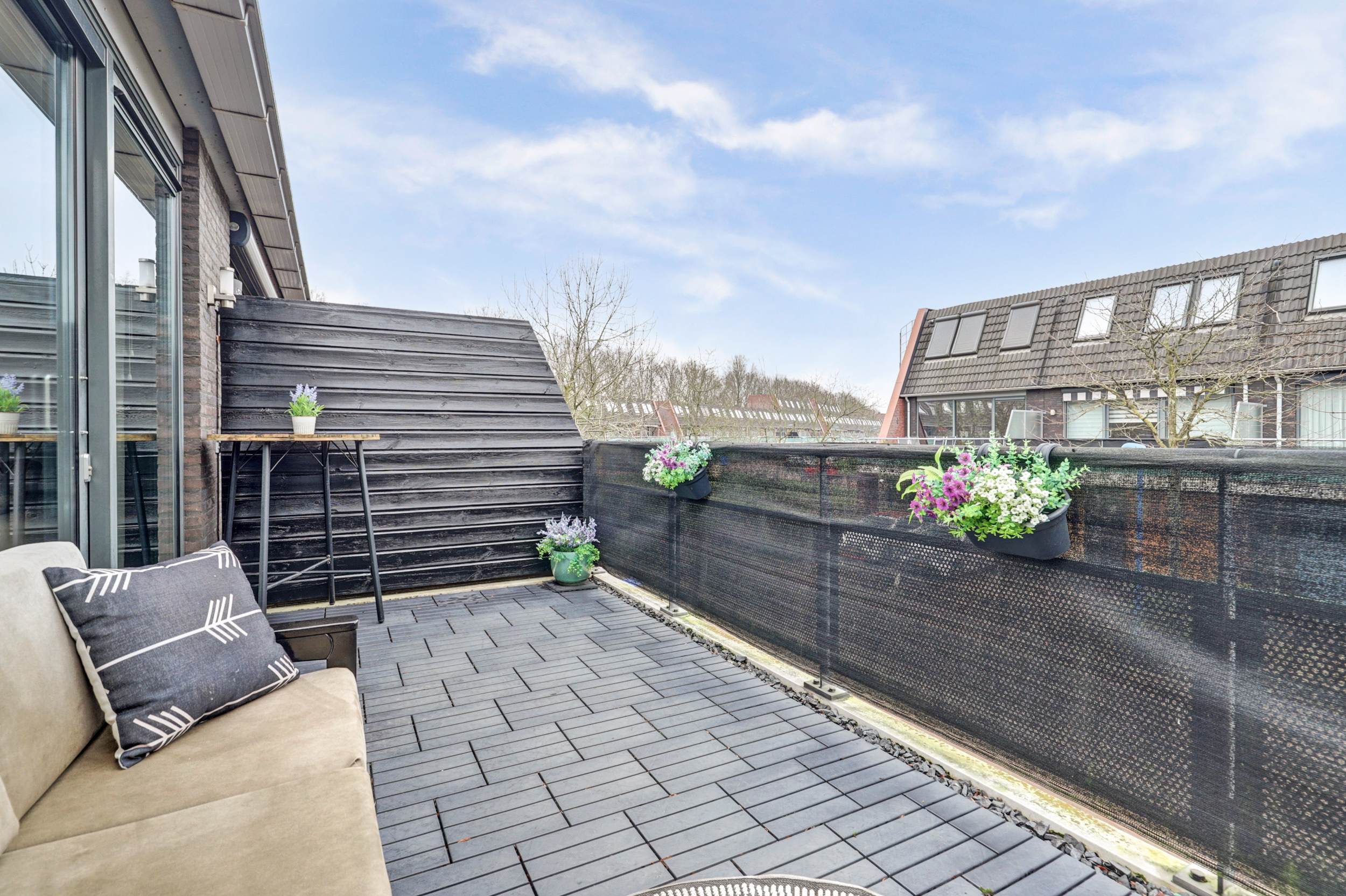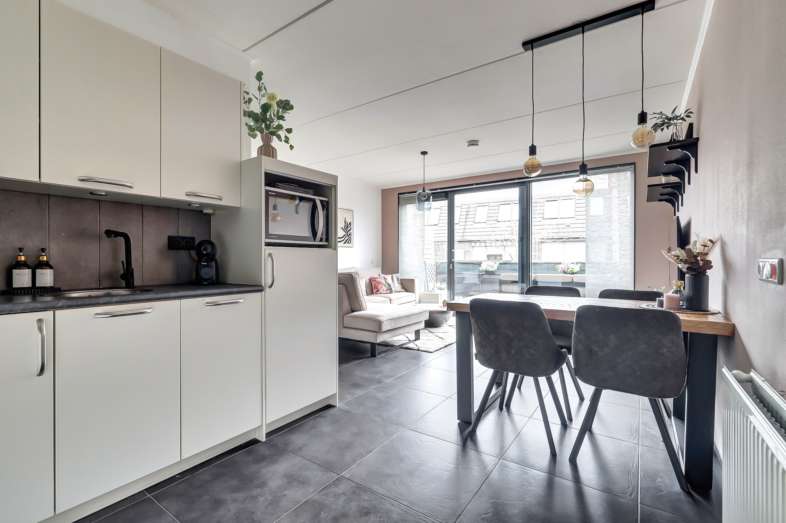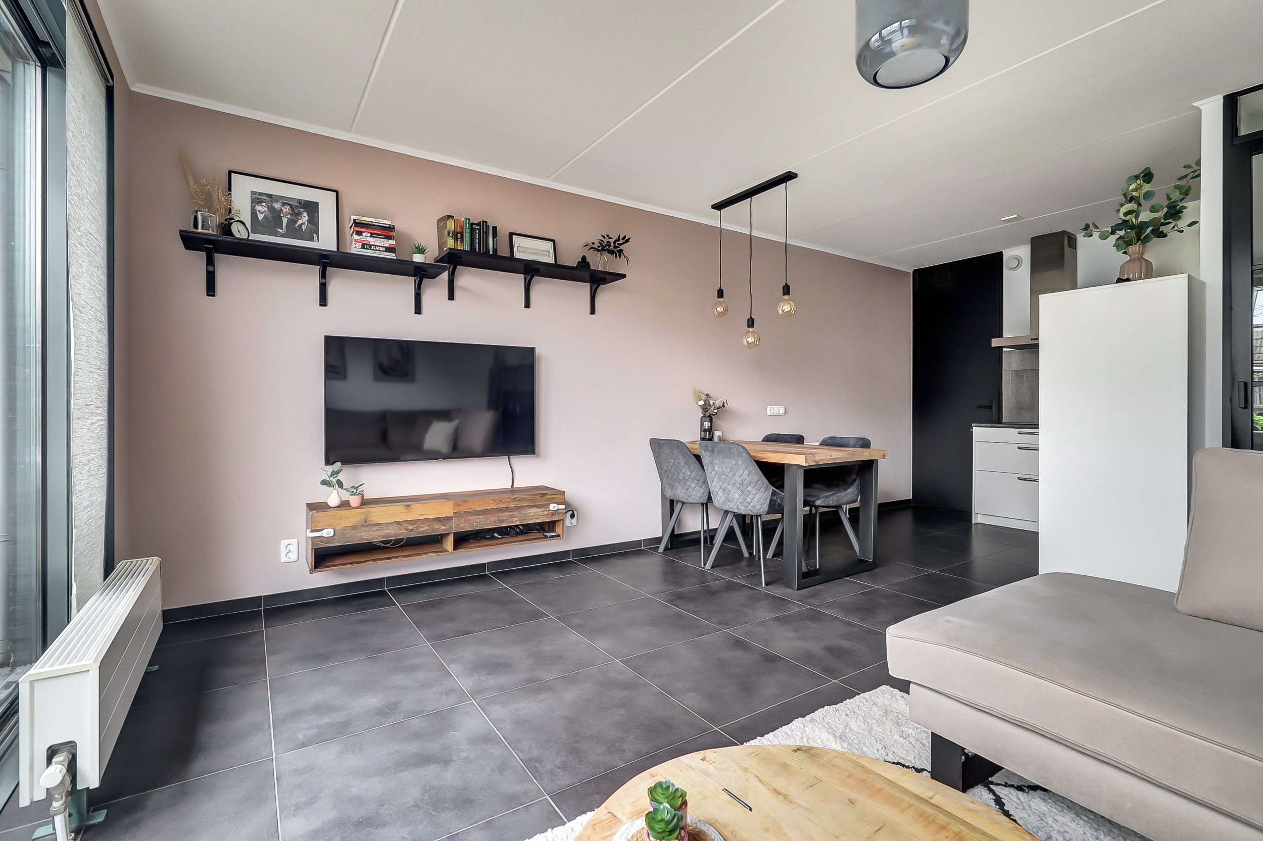 Boven kom je uit op de overloop met toilet en fonteintje. De woonkamer ligt aan de achterzijde en trekt direct daglicht naar binnen dankzij de schuifpui. Die schuifpui opent het balkon en geeft je dat fijne binnen-buitengevoel.