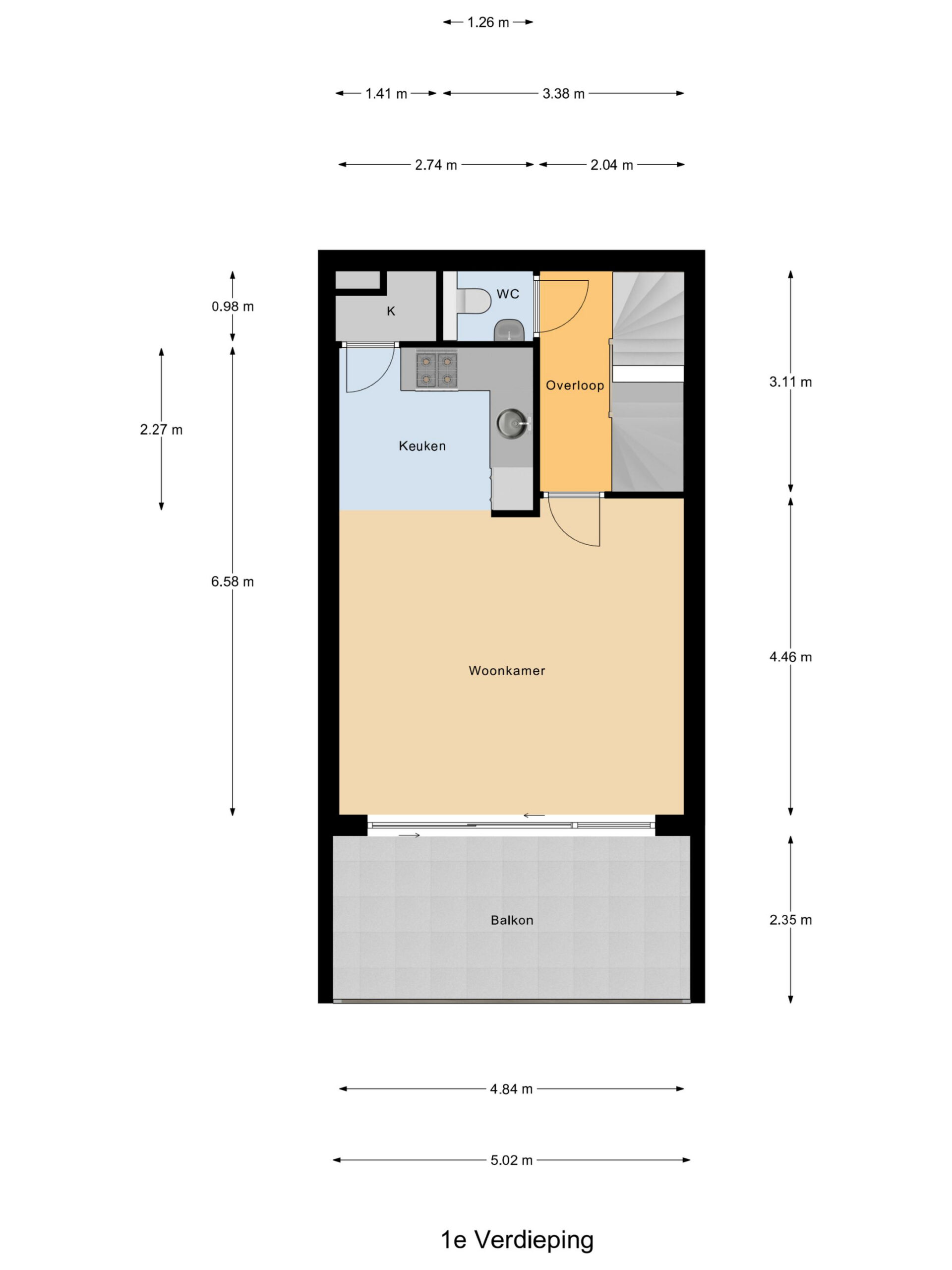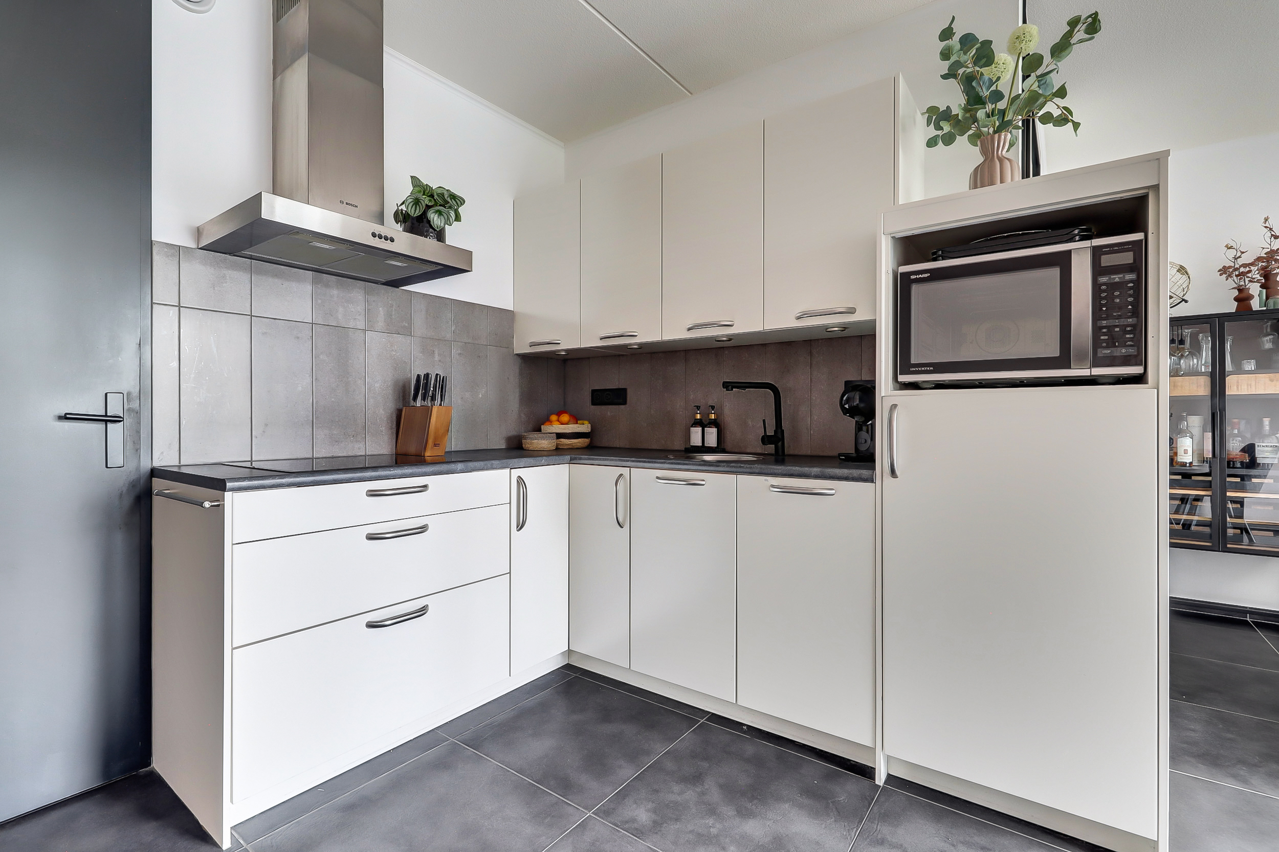 Het balkon ligt op het oosten: perfect om de dag te starten met koffie in de zon. Aan de voorzijde bevindt zich de keuken, uitgerust met een inductiekookplaat (2008), koelkast (2018) en spoelbak. Ook hier is extra bergruimte aanwezig.