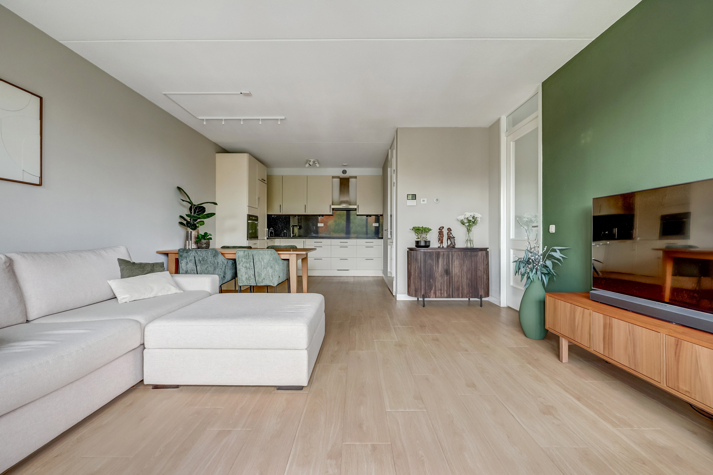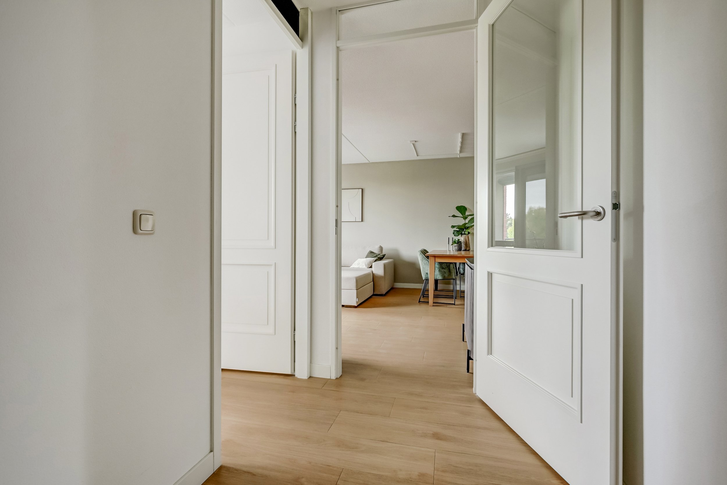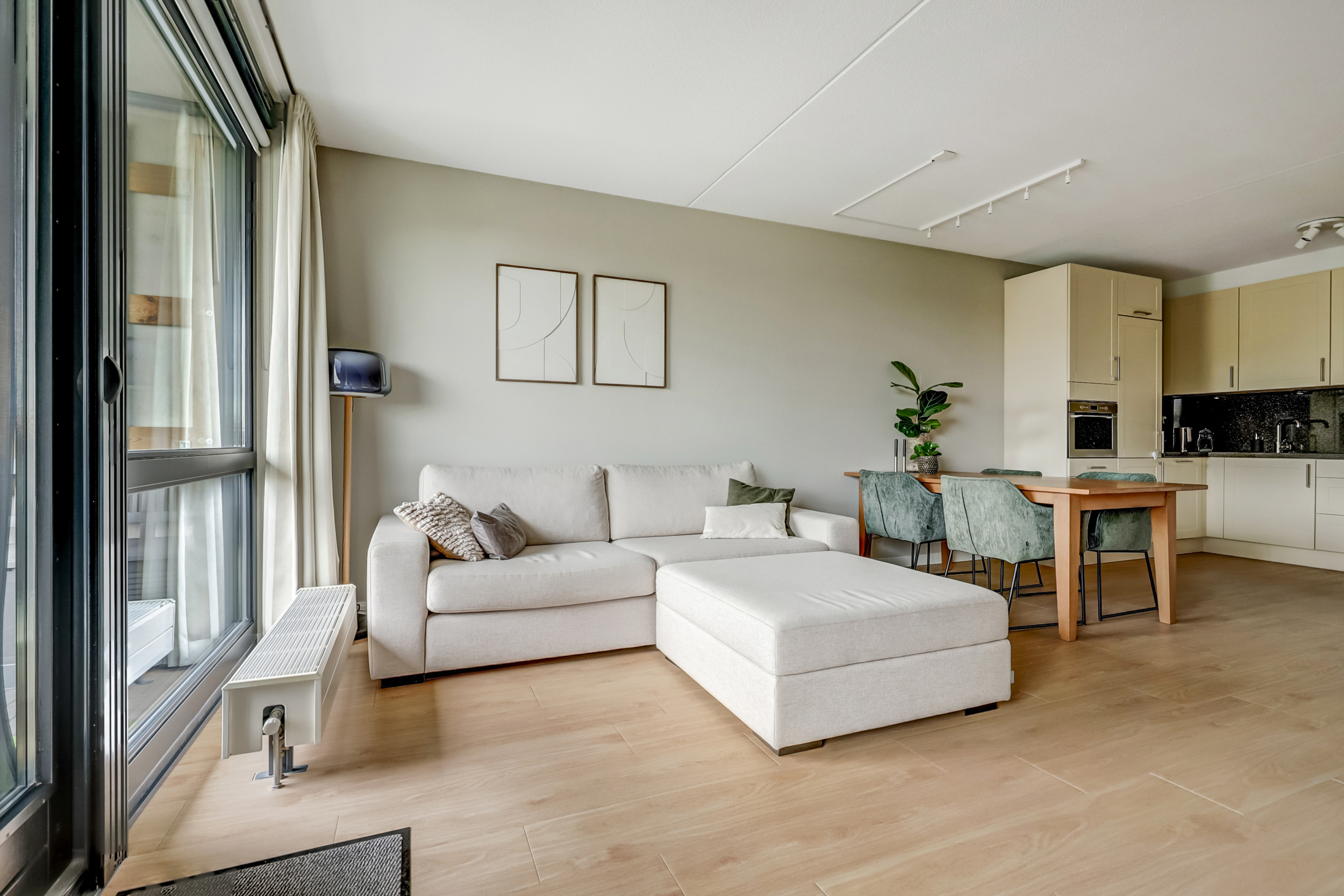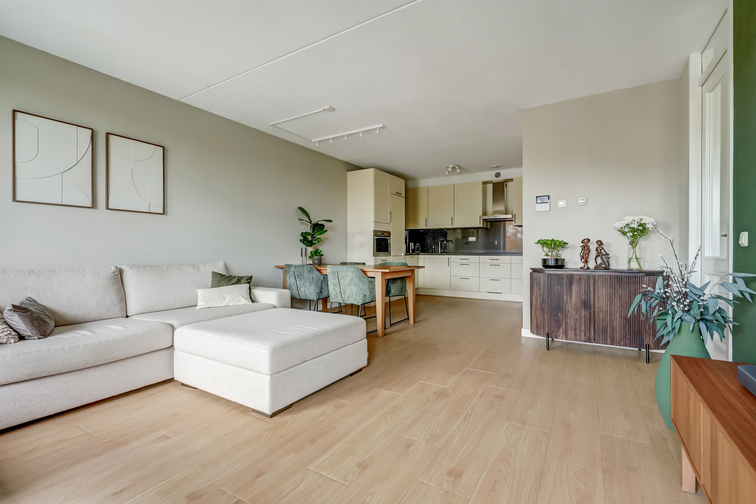 Entree/hal met meterkast, welke toegang geeft tot alle ruimten in het appartement. Lichte woonkamer met deur naar het ruime balkon, elektrische screens en zonnescherm. De open keuken heeft een L-vormige keukenopstelling en is van alle gemakken voorzien, o.a. veel kastruimte/lades en diverse inbouwapparatuur, o.a. vaatwasser, combioven, 4-pits inductiekookplaat, koelkast en 3-vriesladen. Vanuit de keuken is de praktische bijkeuken/berging met witgoedaansluitingen te bereiken. 2 slaapkamers welke zijn voorzien van draaikiepramen. De royale master bedroom ligt aan de voorzijde en beschikt over grote garderobekast en een elektrisch screen. De tweede slaapkamer ligt aan de achterzijde van het appartement en heeft zicht op het balkon en is voorzien van elektrische screen. De nette en moderne badkamer is in 2024 vernieuwd heeft een grote inloopdouche met hand- en regendouche en glazenwand, wastafelmeubel, spiegel, verwarming en is volledig betegeld. De separate toiletruimte is ook in 2024 vernieuwd en is voorzien van wandcloset, fontein en in lichte kleur betegeld. Praktische bergkast waarin de cv-ketel (Intergas, 2011) en de mechanische box (2019) zijn opgesteld. Het hele appartement is voorzien van een pvc vloerafwerking zonder dorpels, spuitwerk plafondafwerking en spachthelputz wandafwerking.