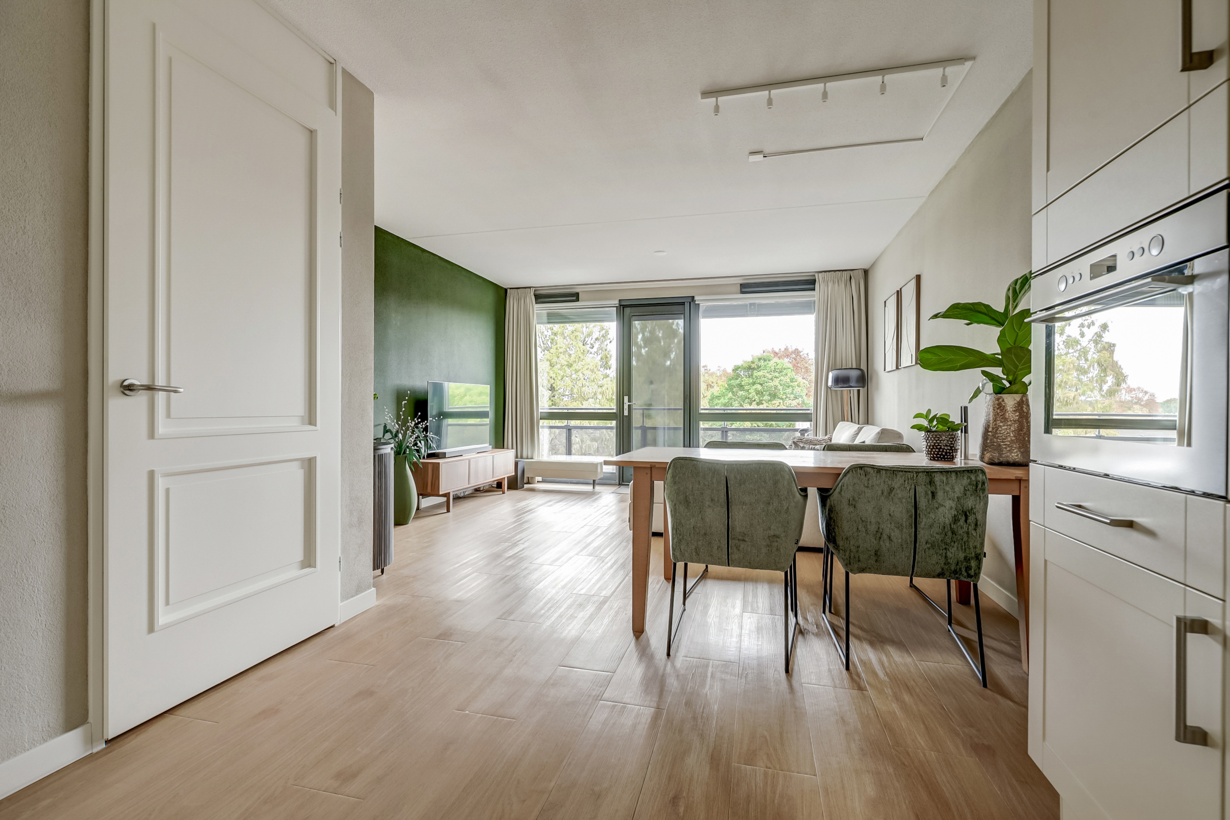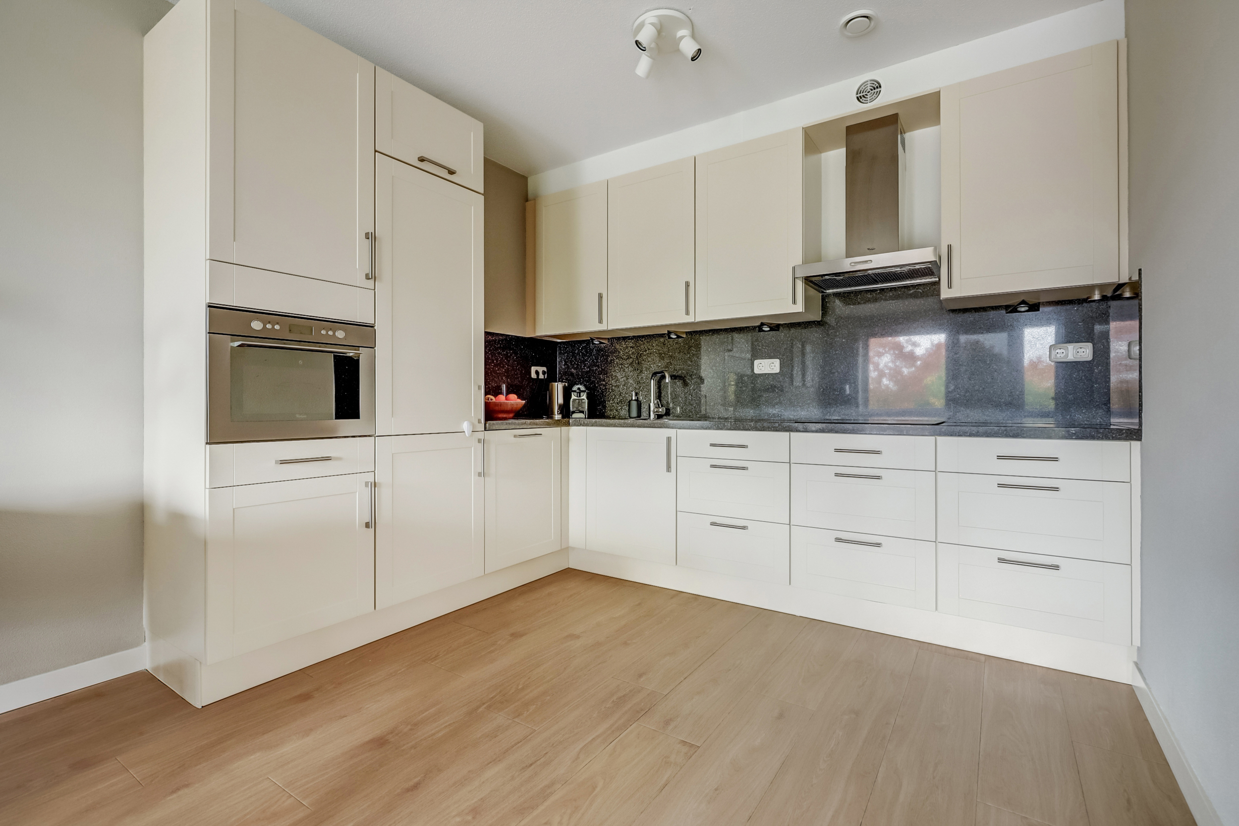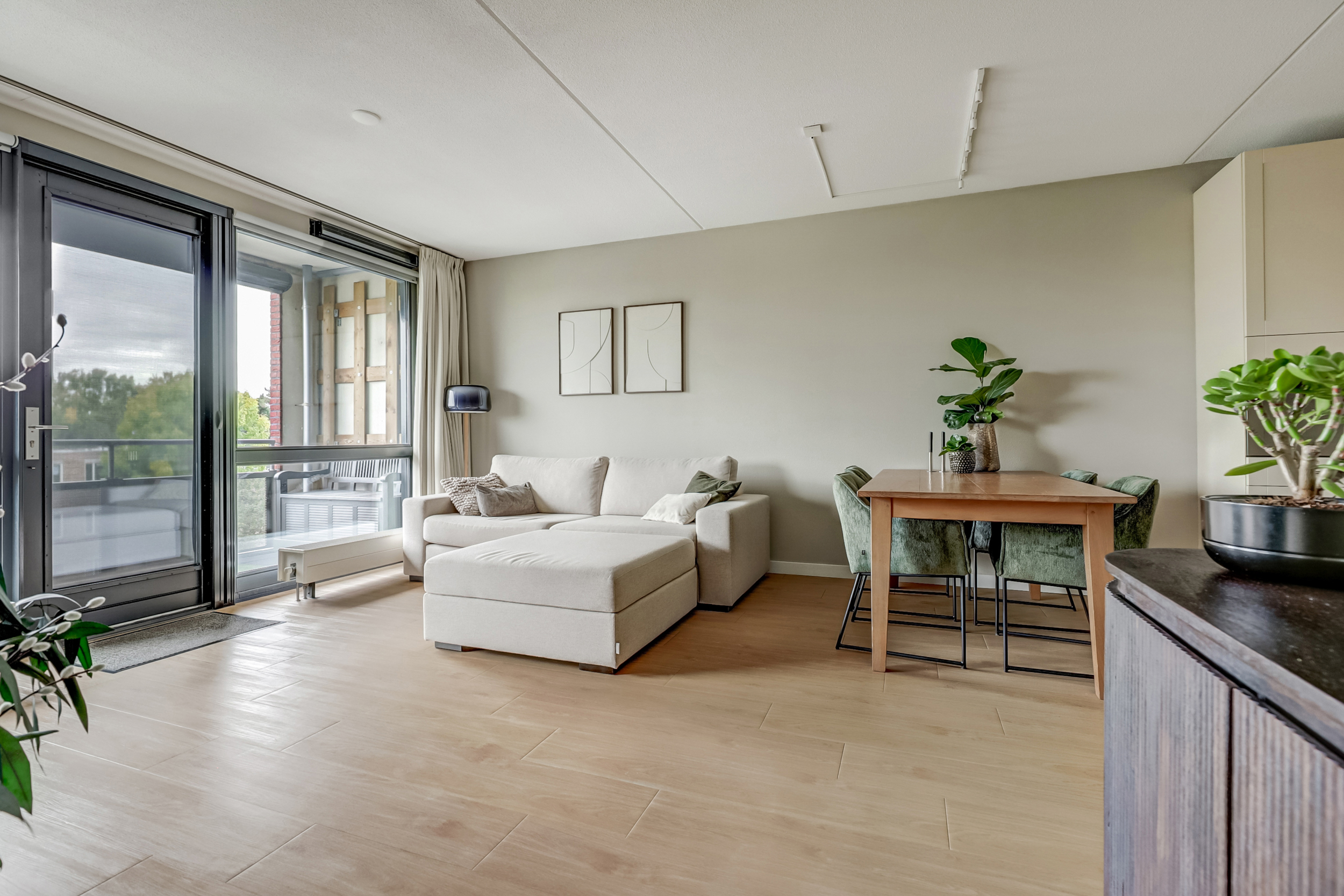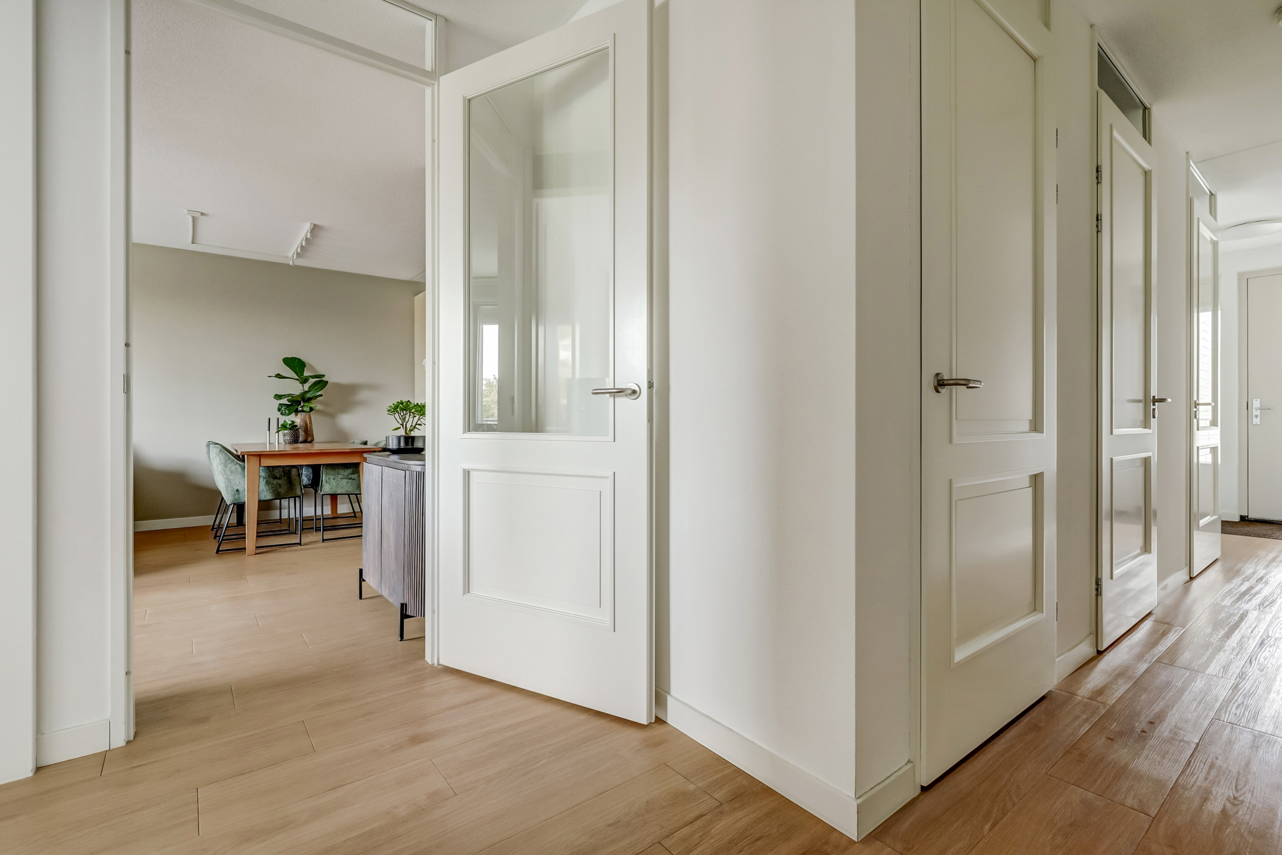 Entree/hal met meterkast, welke toegang geeft tot alle ruimten in het appartement. Lichte woonkamer met deur naar het ruime balkon, elektrische screens en zonnescherm. De open keuken heeft een L-vormige keukenopstelling en is van alle gemakken voorzien, o.a. veel kastruimte/lades en diverse inbouwapparatuur, o.a. vaatwasser, combioven, 4-pits inductiekookplaat, koelkast en 3-vriesladen. Vanuit de keuken is de praktische bijkeuken/berging met witgoedaansluitingen te bereiken. 2 slaapkamers welke zijn voorzien van draaikiepramen. De royale master bedroom ligt aan de voorzijde en beschikt over grote garderobekast en een elektrisch screen. De tweede slaapkamer ligt aan de achterzijde van het appartement en heeft zicht op het balkon en is voorzien van elektrische screen. De nette en moderne badkamer is in 2024 vernieuwd heeft een grote inloopdouche met hand- en regendouche en glazenwand, wastafelmeubel, spiegel, verwarming en is volledig betegeld. De separate toiletruimte is ook in 2024 vernieuwd en is voorzien van wandcloset, fontein en in lichte kleur betegeld. Praktische bergkast waarin de cv-ketel (Intergas, 2011) en de mechanische box (2019) zijn opgesteld. Het hele appartement is voorzien van een pvc vloerafwerking zonder dorpels, spuitwerk plafondafwerking en spachthelputz wandafwerking.
