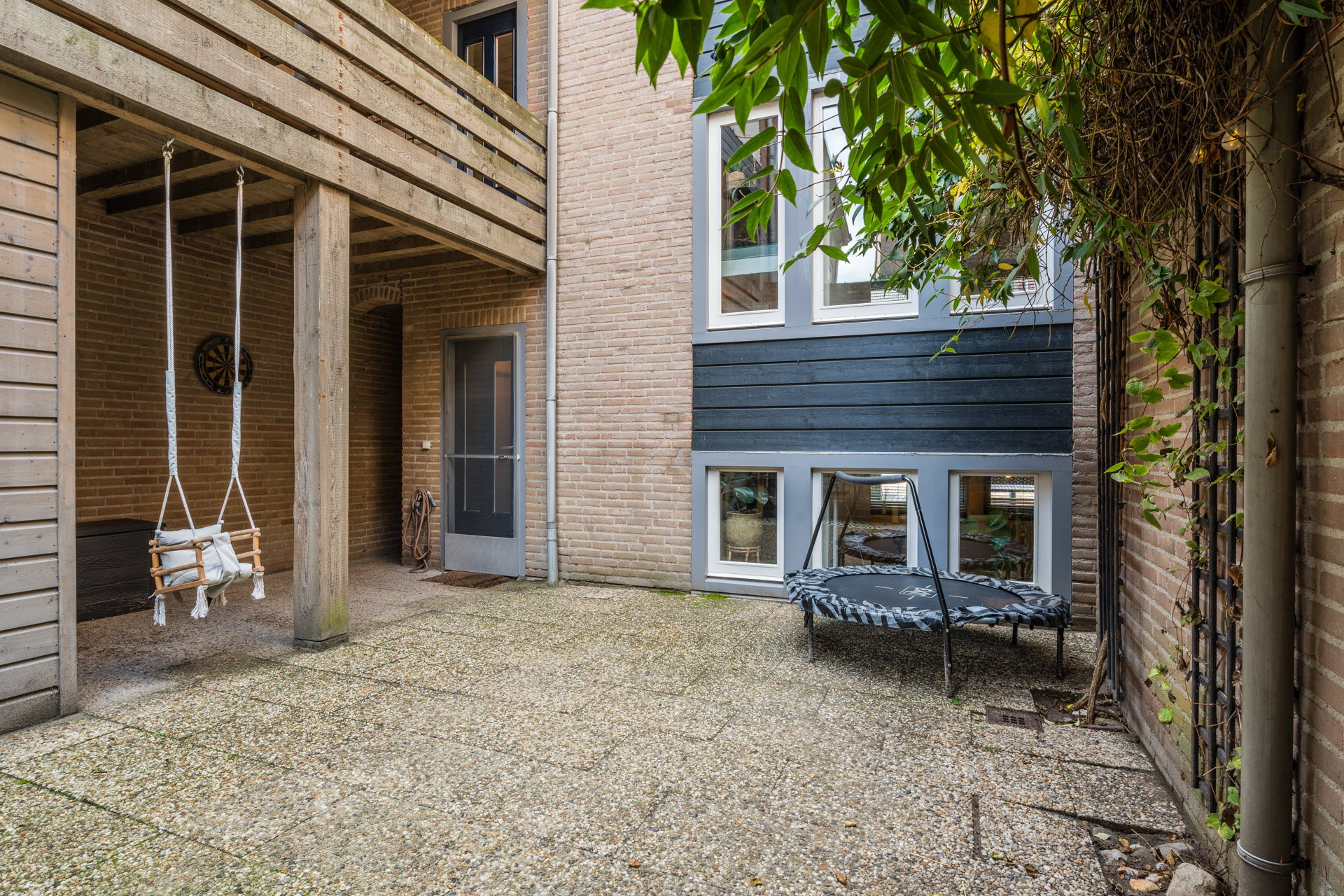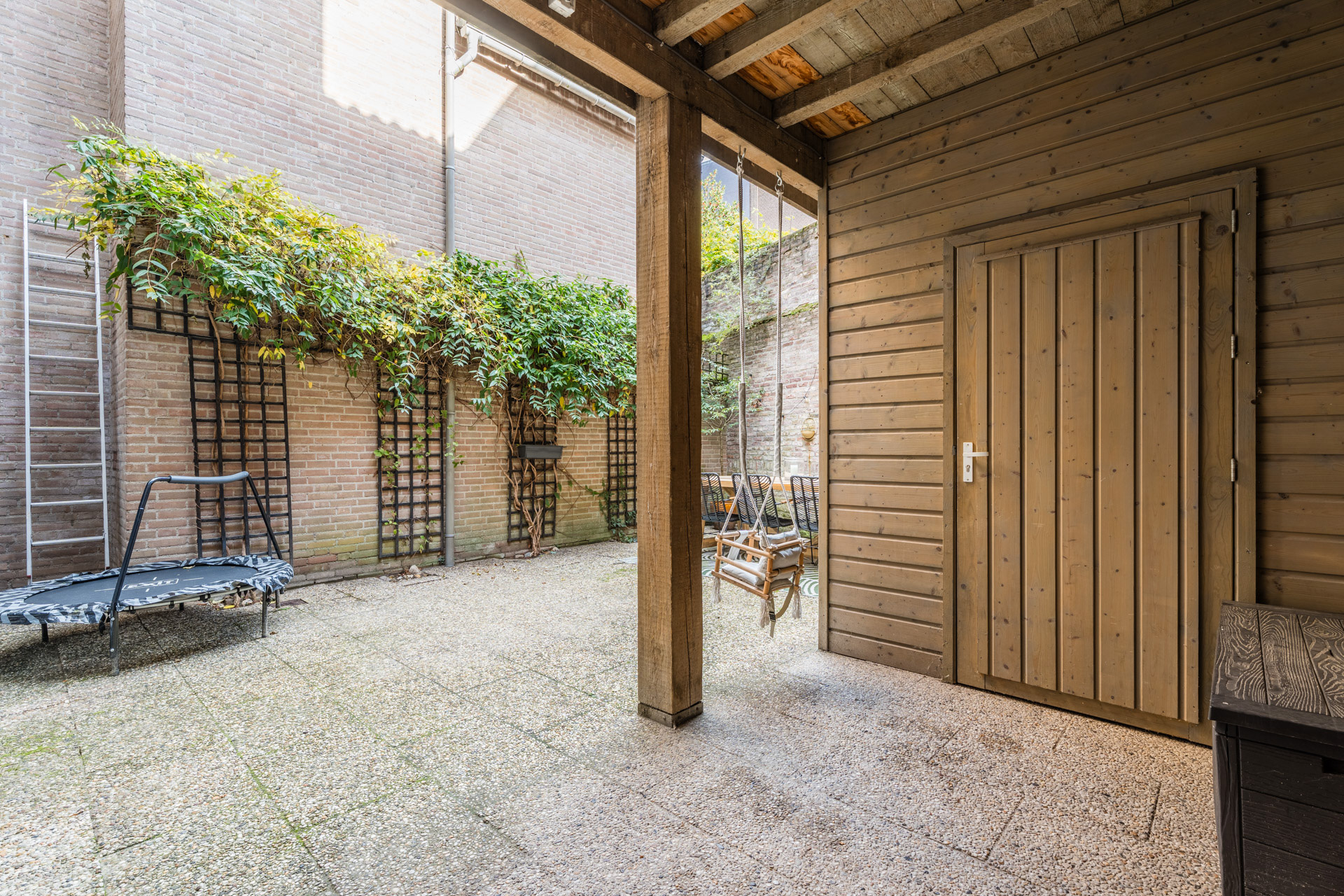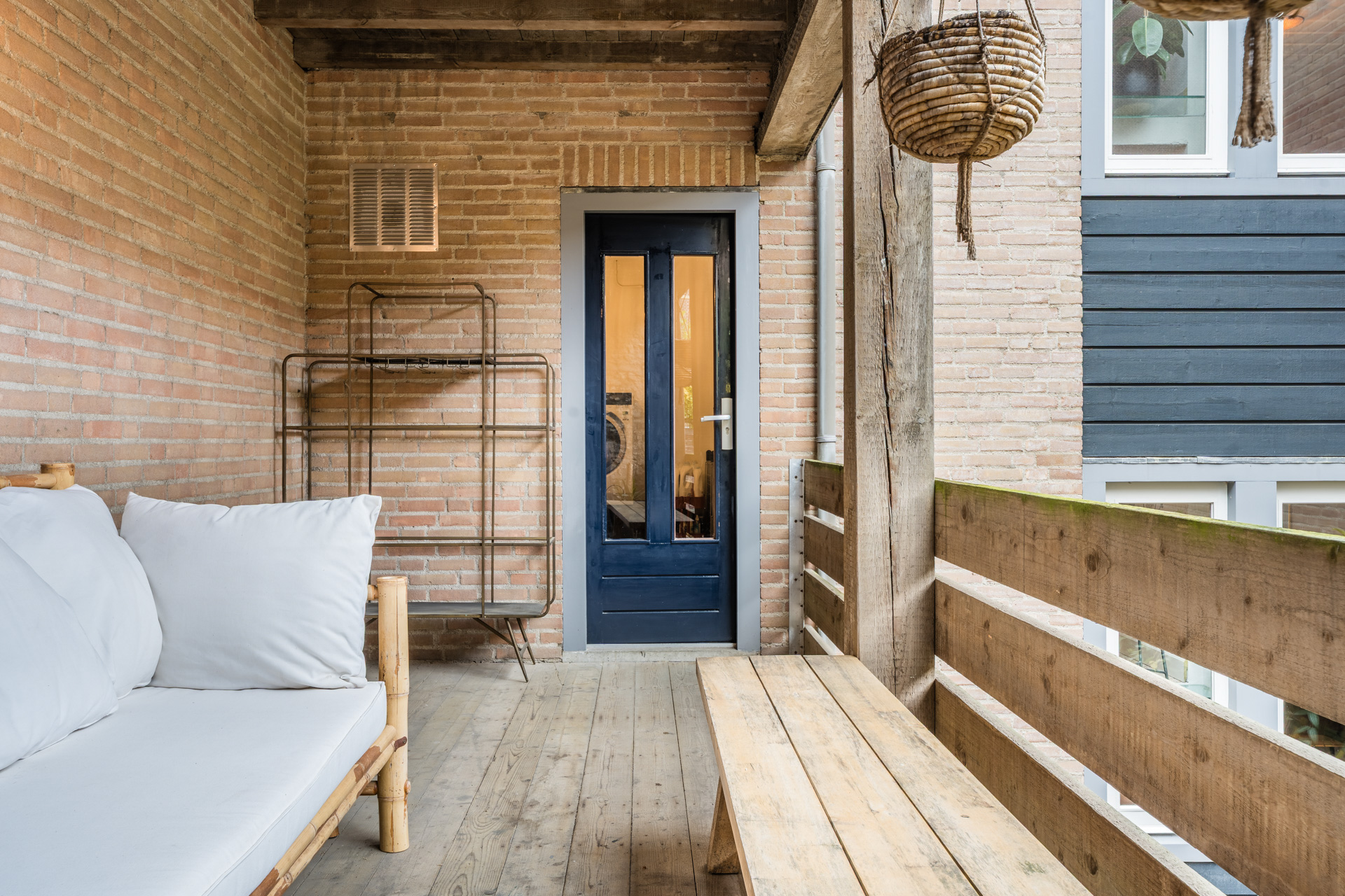 Vanuit de keuken kom je via de trap op de overloop. Hier is een toilet met fonteintje en de toegang naar de royale patio. Je zit hier heerlijk privé in de binnentuin. De patio is ook toegankelijk via de eigen achterom met toegangspoort. Je kunt de fietsen stallen in de berging.