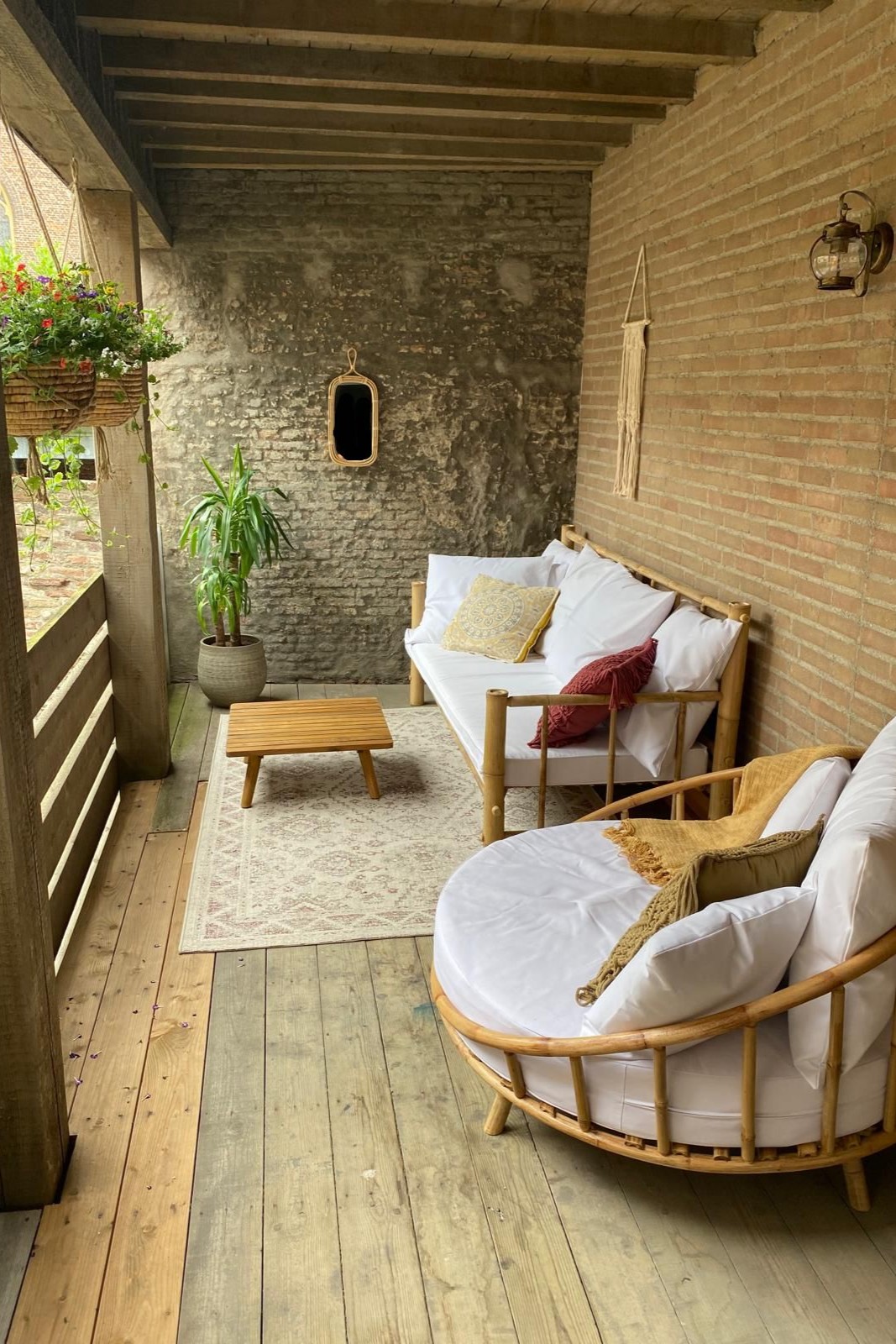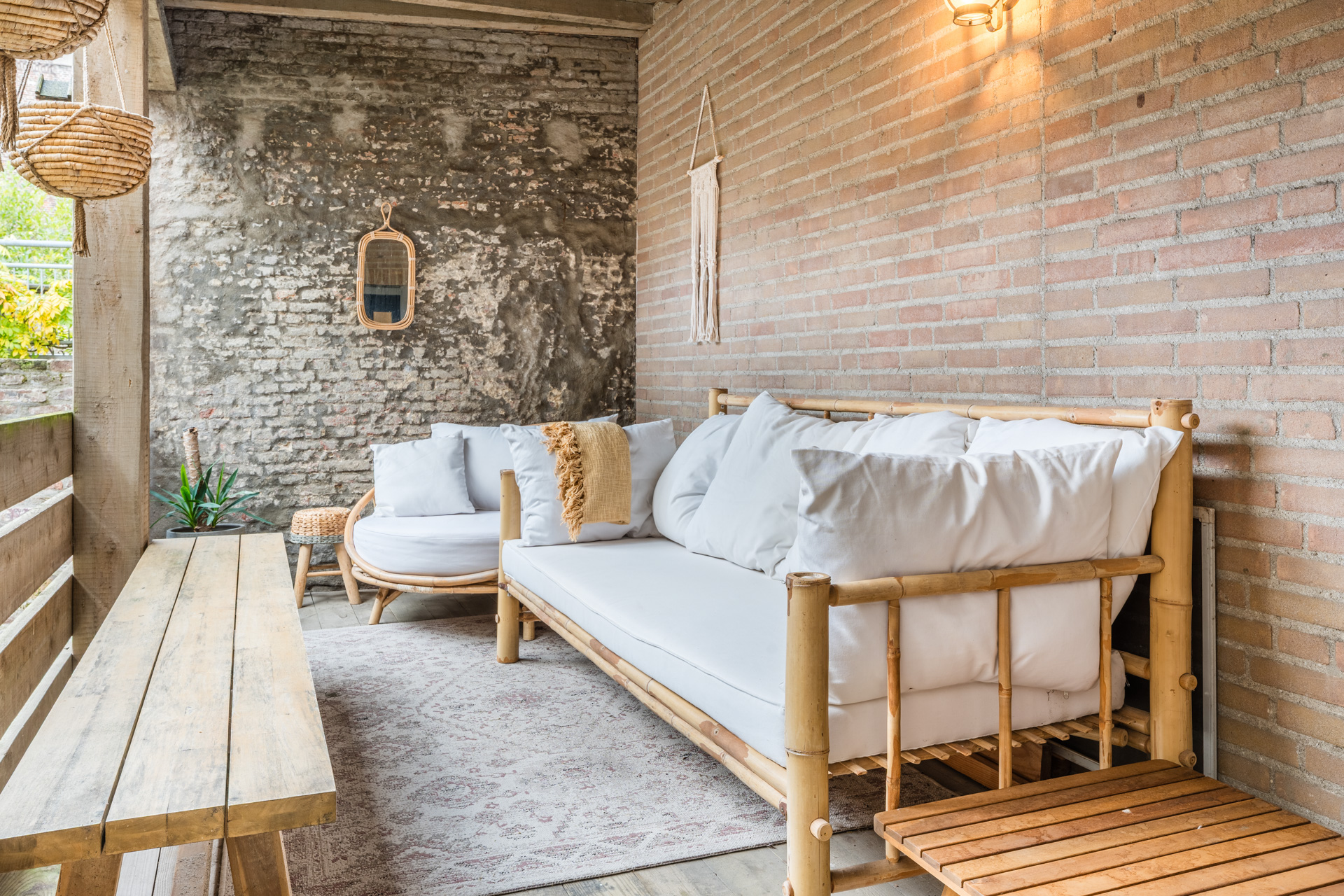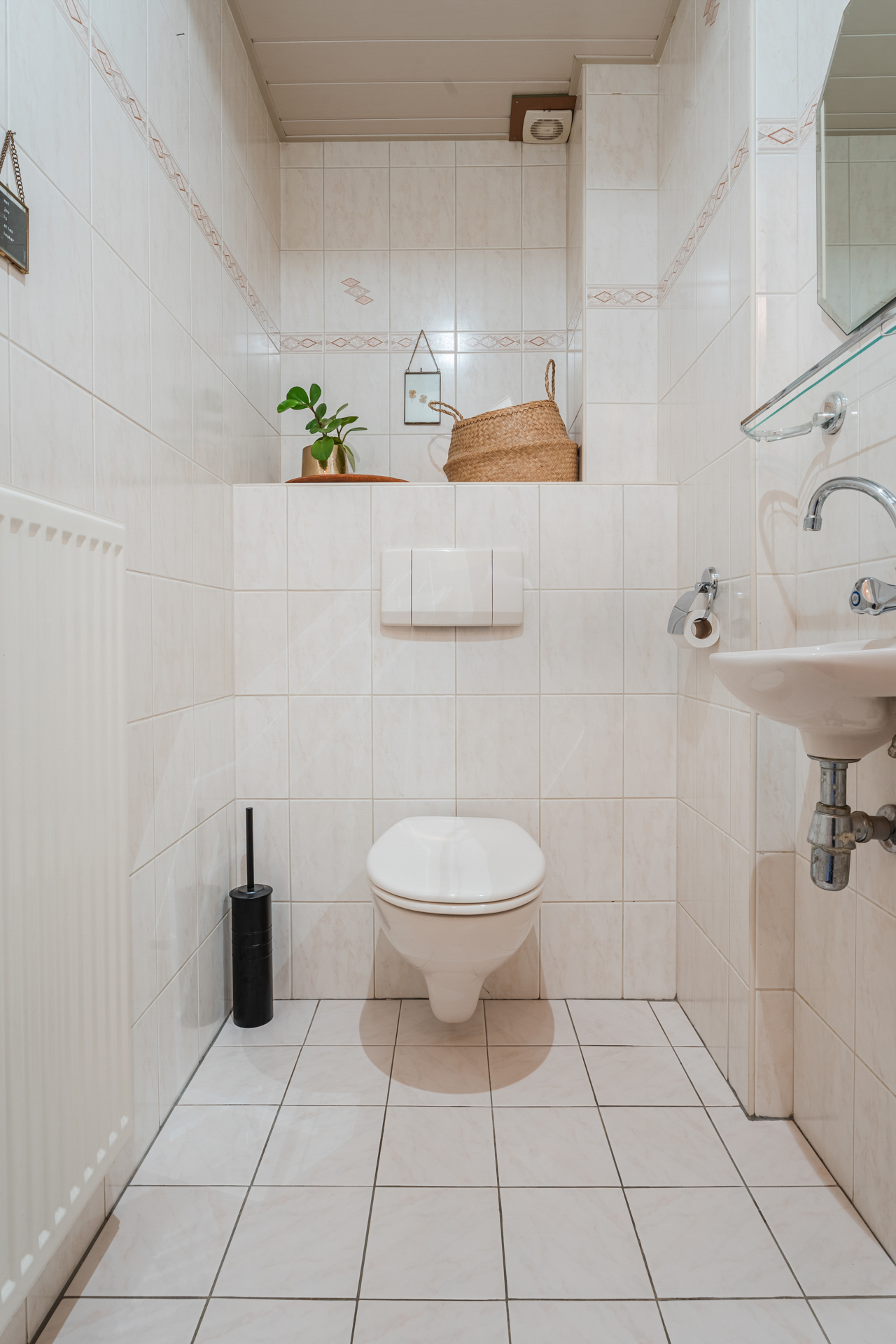 Vanuit de keuken kom je via de trap op de overloop. Hier is een toilet met fonteintje en de toegang naar de royale patio. Je zit hier heerlijk privé in de binnentuin. De patio is ook toegankelijk via de eigen achterom met toegangspoort. Je kunt de fietsen stallen in de berging.