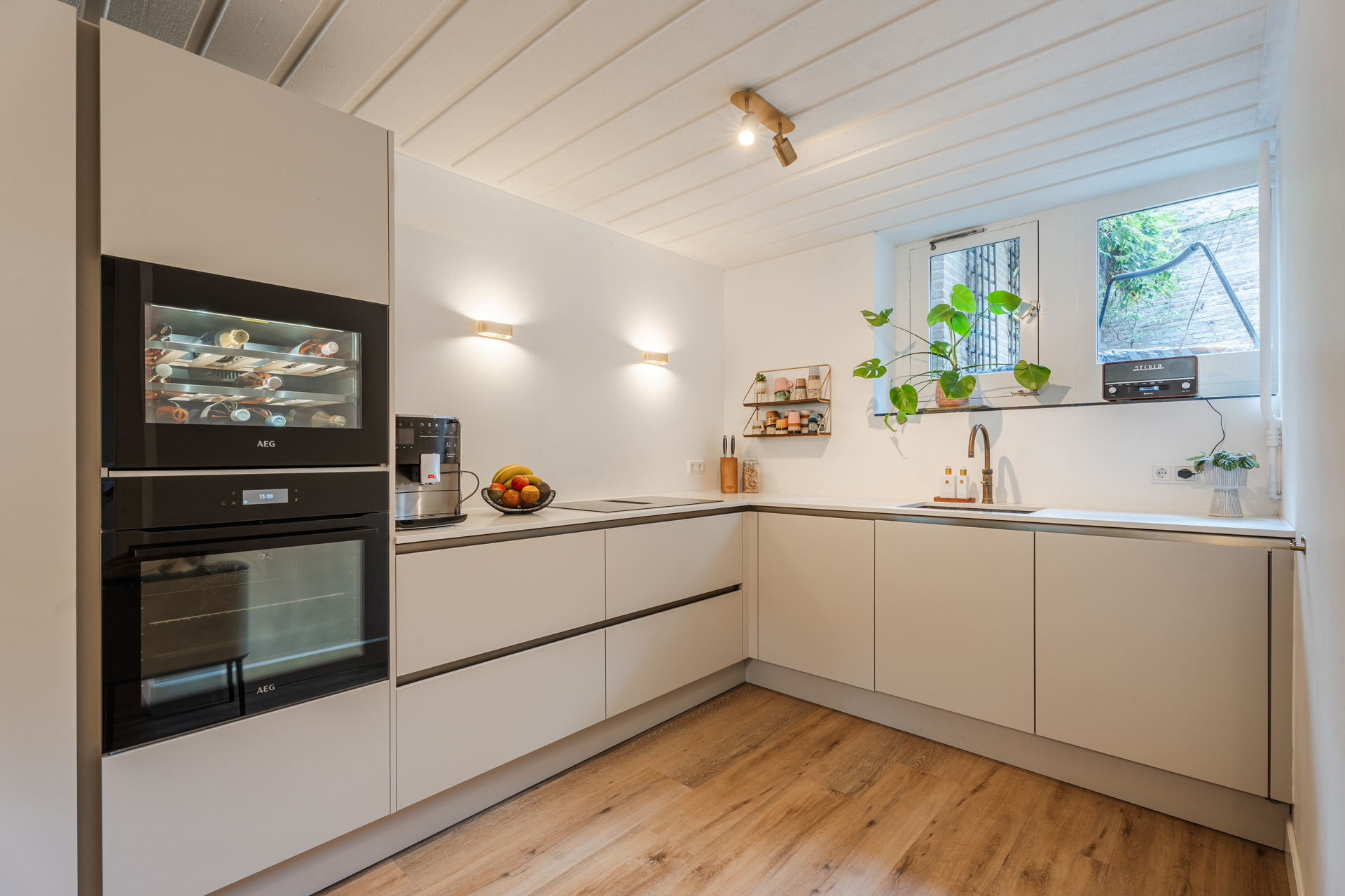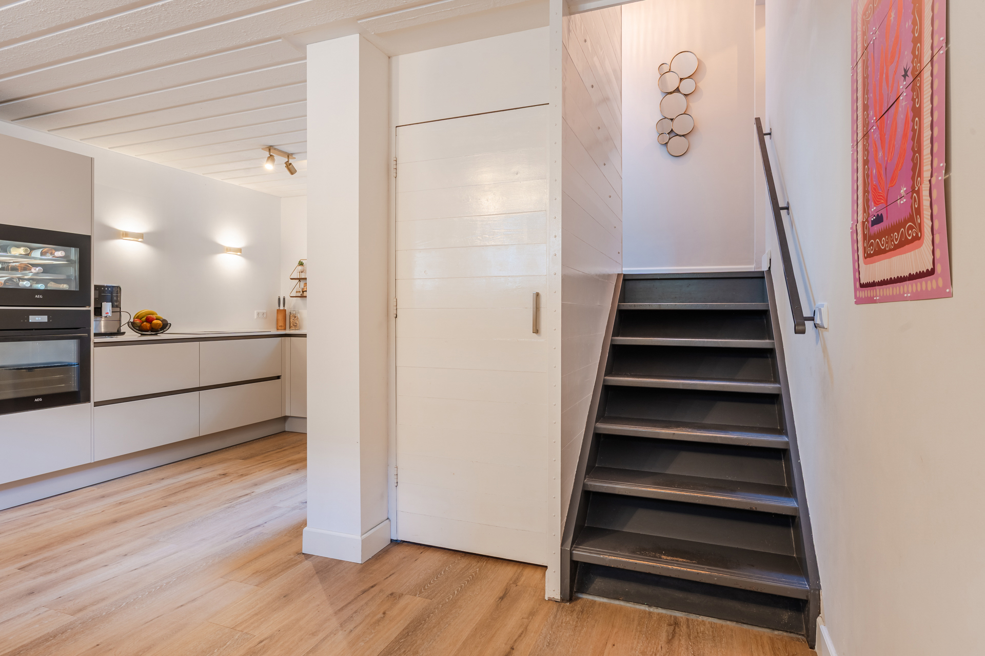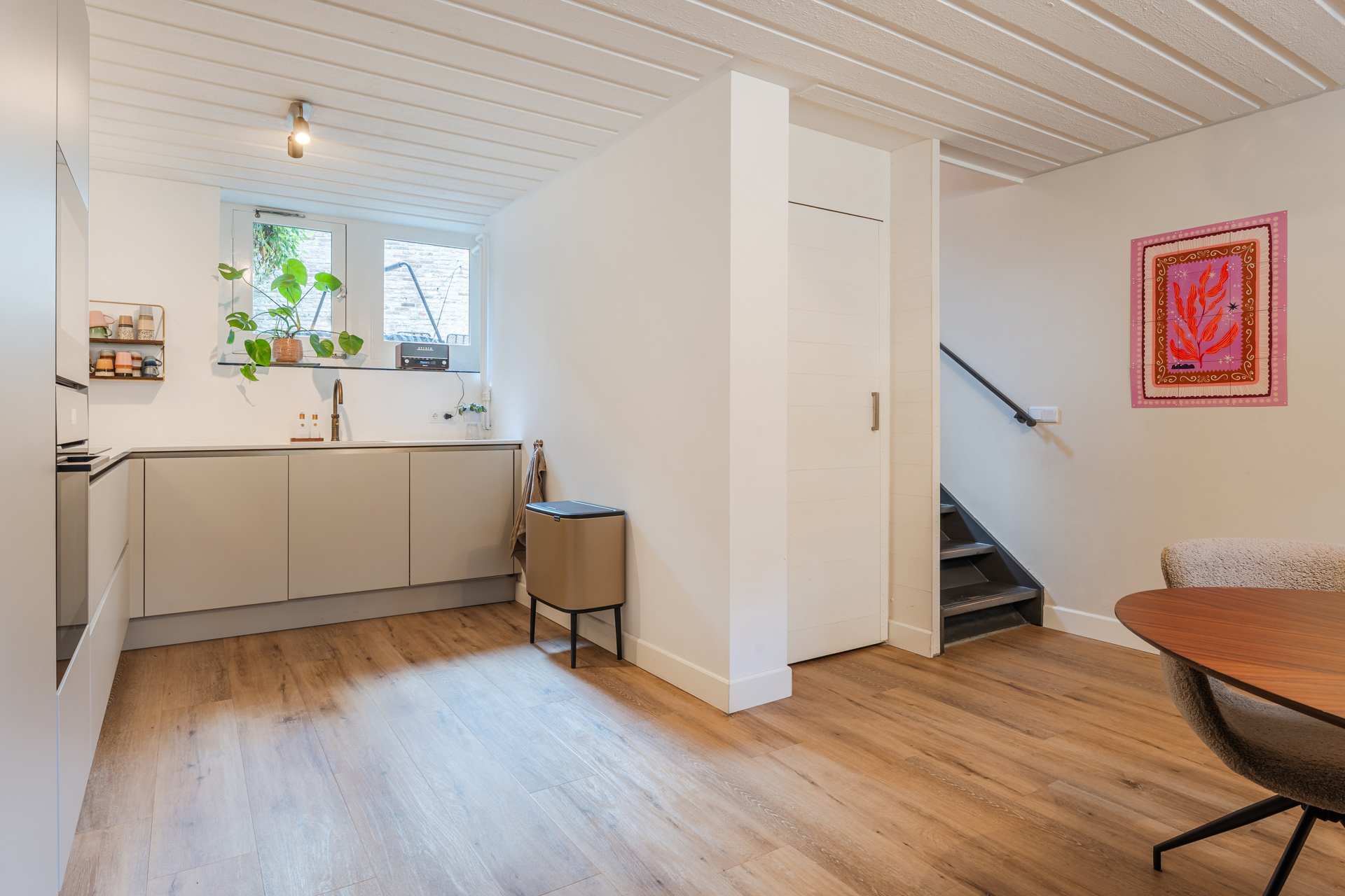 De ingang van de woning is in het souterrain. Je komt hier uit in de sfeervolle woonkeuken met vloerverwarming. De luxe keuken is in 2024 vernieuwd en voorzien van inbouwapparatuur (vaatwasser, koelkast, oven, wijnklimaatkast en inductiekookplaat met ingebouwde afzuigkap). Onder de trap is bergruimte aanwezig.