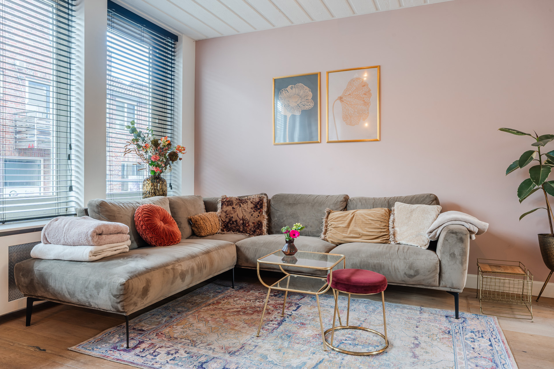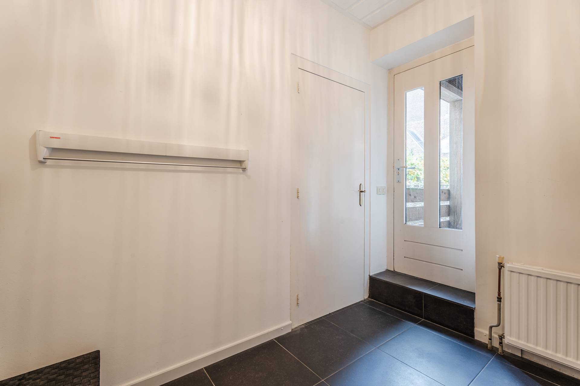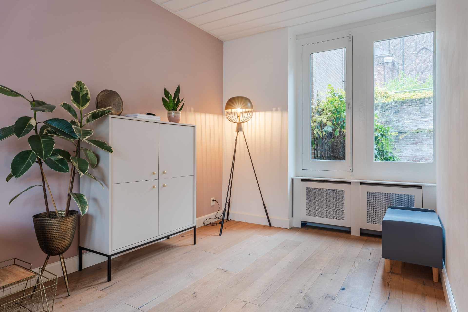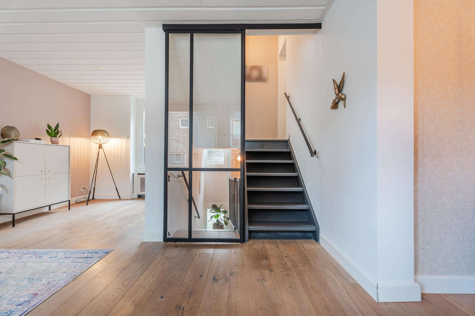 Op deze verdieping is de heerlijk lichte woonkamer. Deze is naar de trapgang af te sluiten met een moderne stalen schuifdeur (2020). Er is aan de buitenzijde een trapopgang met voordeur aanwezig, maar deze ingang is momenteel niet in gebruik. Daardoor is een ruimere woonkamer ontstaan. Door de ligging boven straat niveau heb je een mooi uitzicht naar buiten.