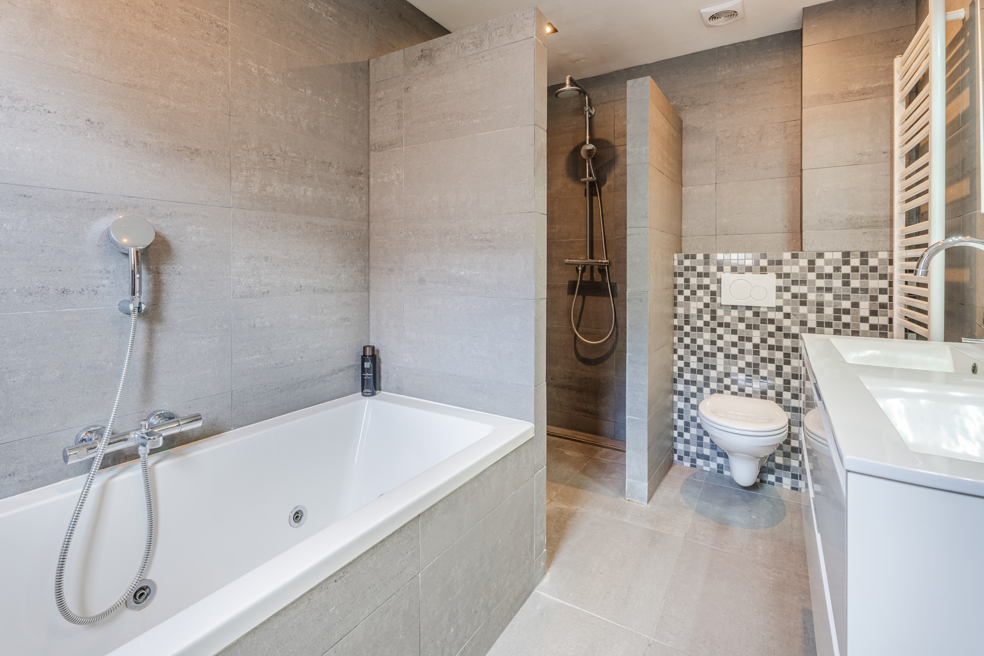 Ruime badkamer met whirlpool bad, inloop douche, toilet en dubbele wastafel met meubel.