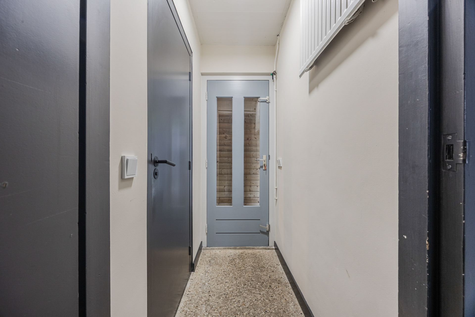 Overloop: bijkeuken voorzien van vaste kastenwand met witgoedaansluitingen, cv-installatie (Nefit Proline 2014) en toegang naar de zonnige buitenruimte welke deels overdekt is. Een heerlijk beschut plekje gericht op het zuiden, met volledige privacy en met zicht op de tuin van de St. Elisabethkerk.