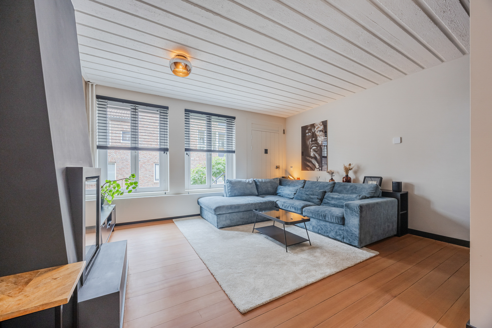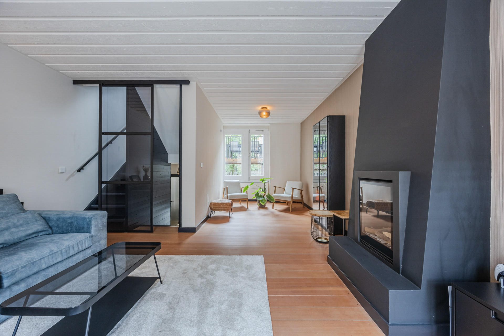 Beletage: woonkamer (ca. 30 m2) met gashaard, stalen schuifpui en houten vloer.