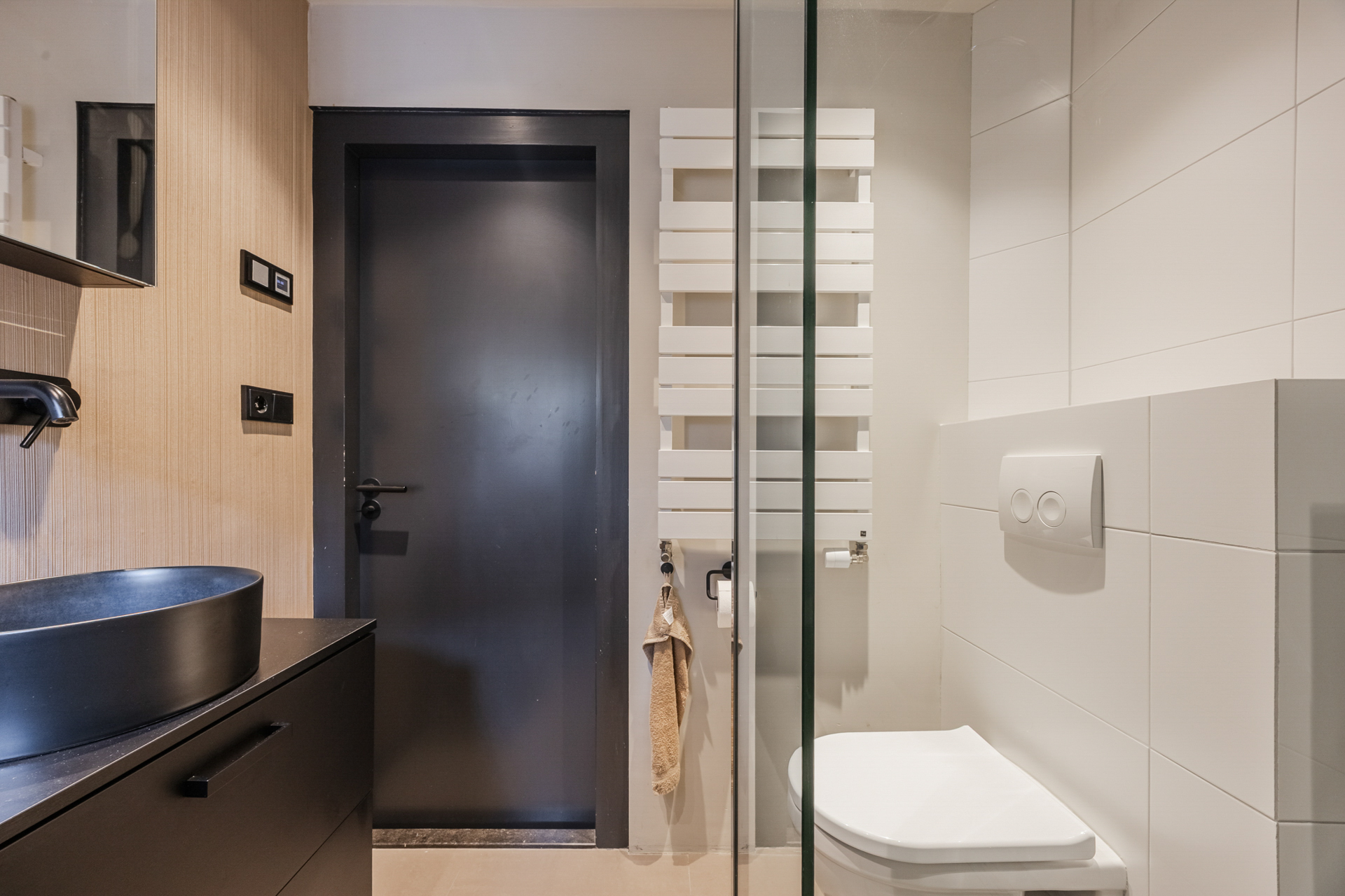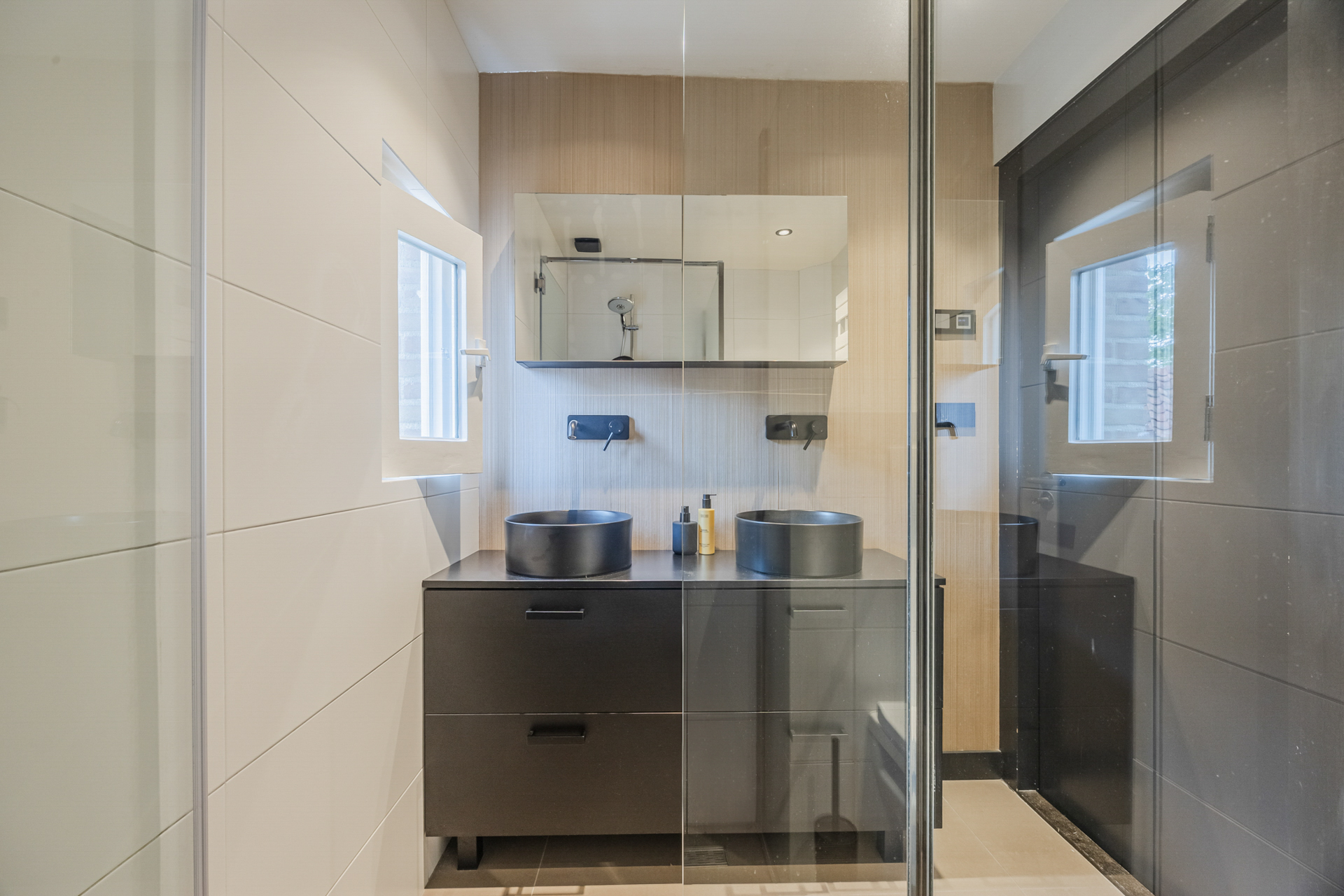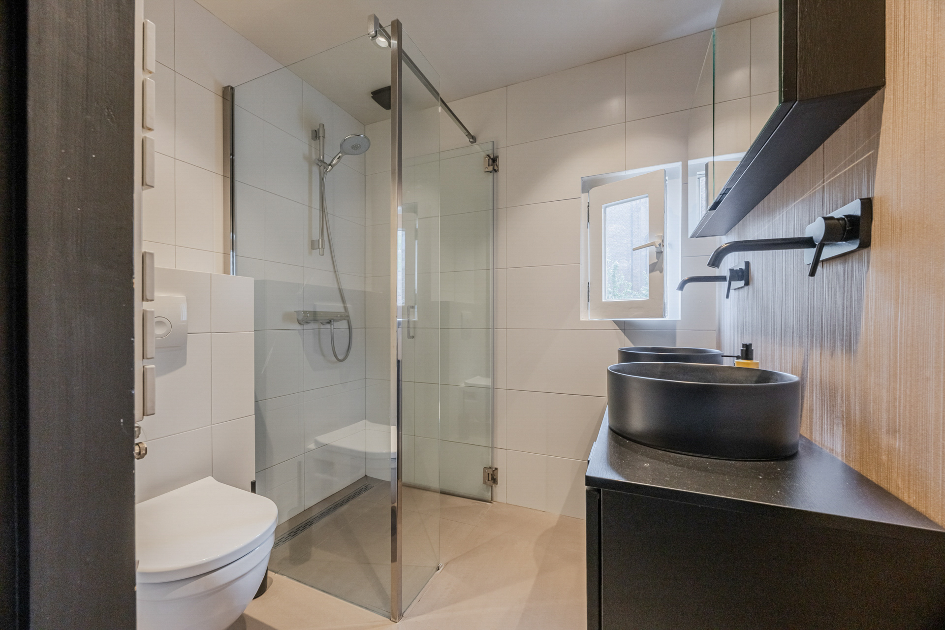 Overloop: badkamer met inloopdouche, op maat gemaakt wastafelmeubel met 2 waskommen en 2e toilet.