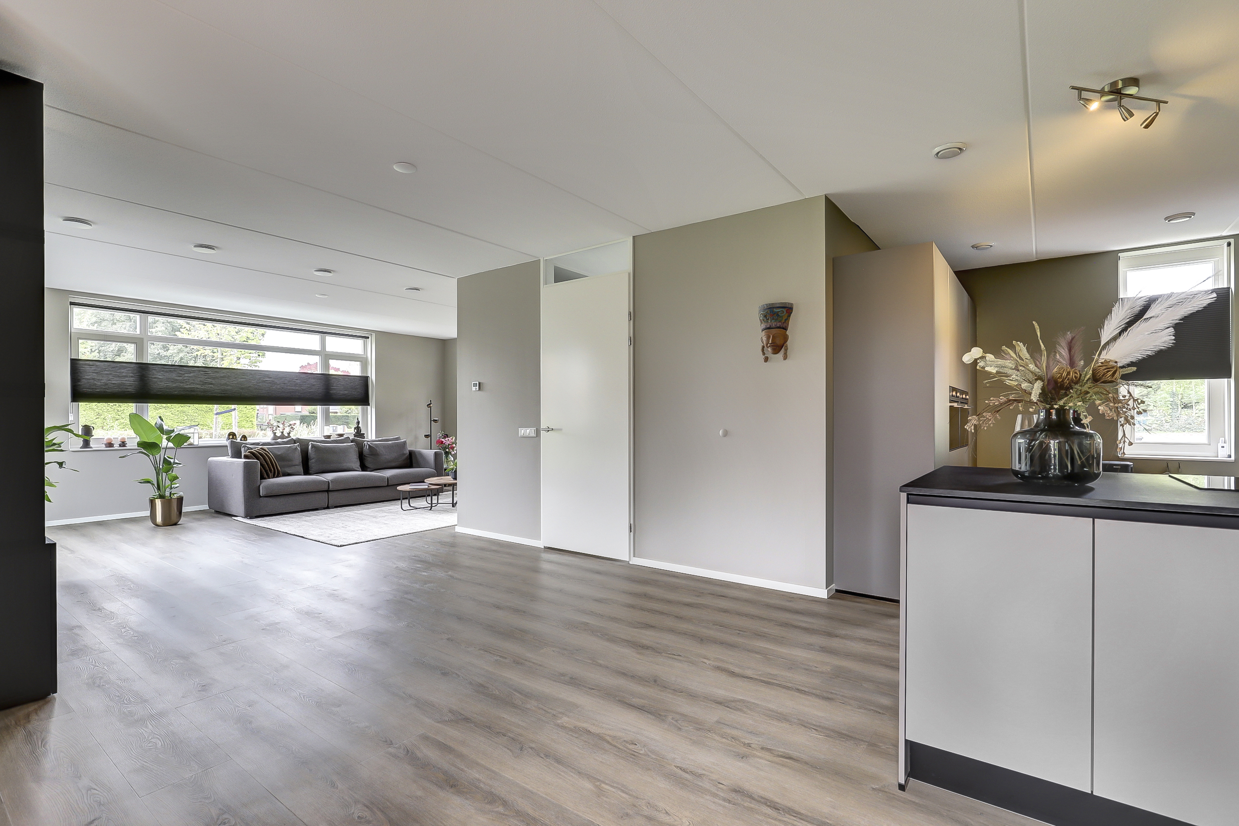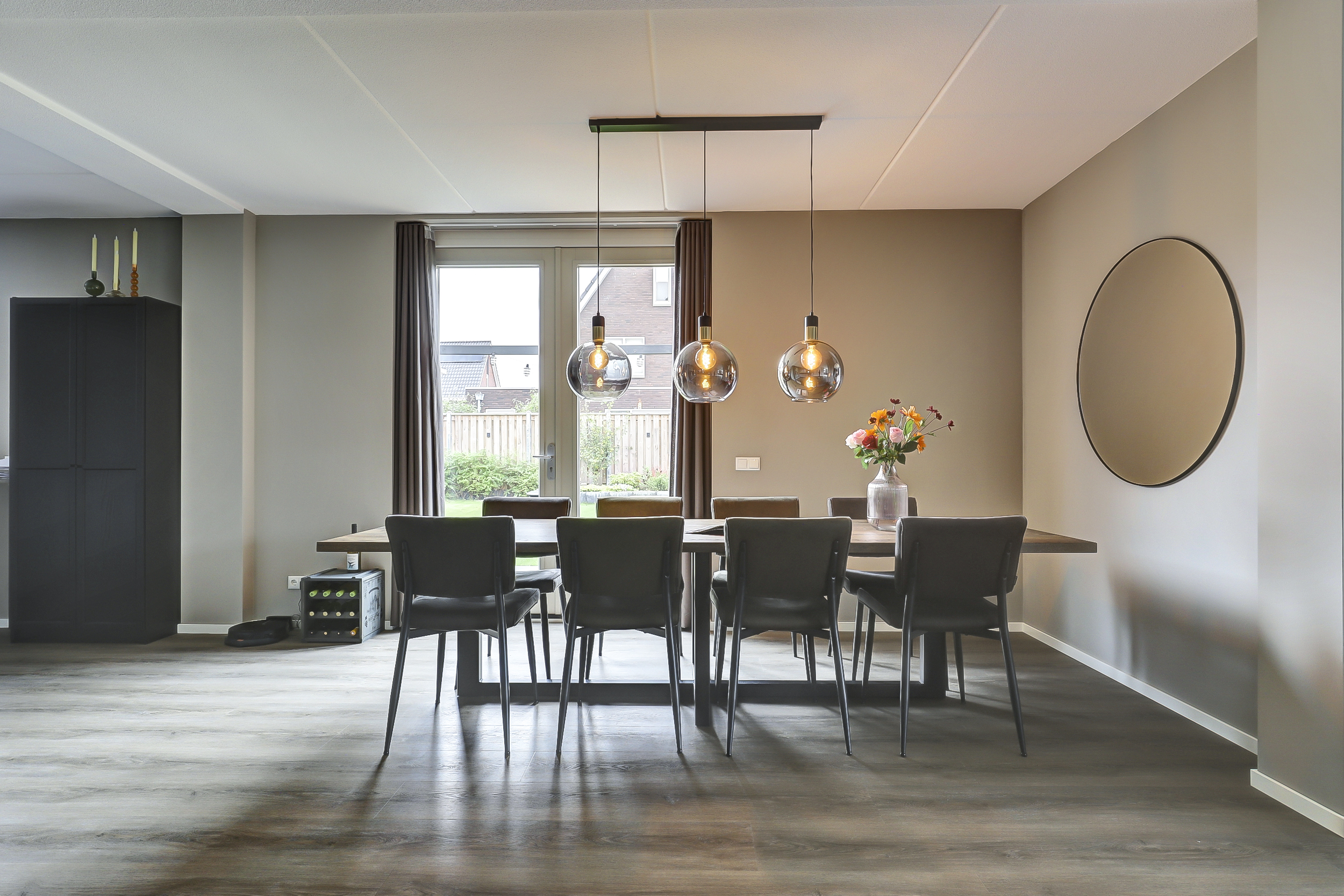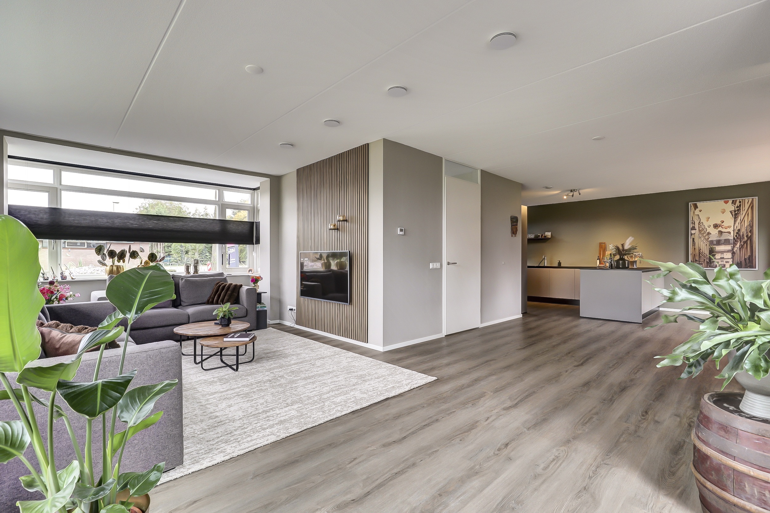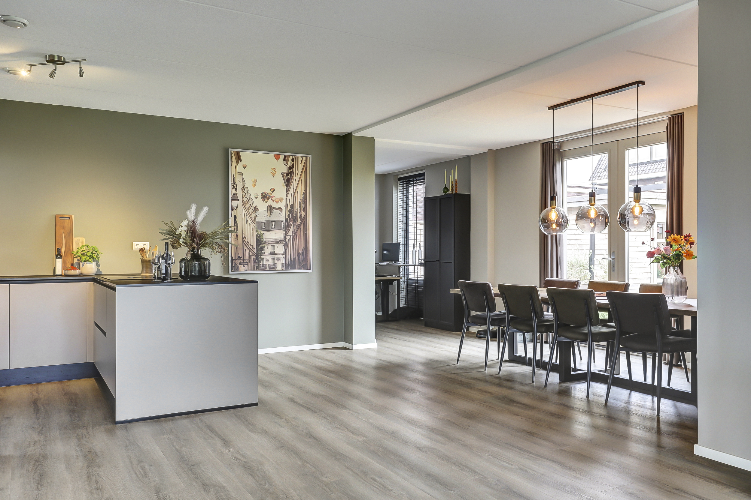 Entree met ruime hal, garderobe, moderne toiletruimte en trapopgang. De royale woonkamer is dankzij de grote raampartijen heerlijk licht en vormt samen met de open en ruime leefkeuken het hart van de woning. De keuken is luxe afgewerkt en voorzien van alle denkbare inbouwapparatuur, ideaal voor wie graag kookt en gezelligheid belangrijk vindt. Te denken valt aan een grote vriezer, koelkast, vaatwasser, een dubbele oven, een Bora kookplaat en een quooker. Direct grenzend aan de keuken is ruimte voor een leuke werkplek of speelhoek voor de kinderen. Fraaie details zijn de erker en de dubbele openslaande deuren aan de achterzijde van de woning; heerlijk om deze tijdens een feestje open te zetten. Aan de zijde van de woonkamer is een overkapping gerealiseerd met zicht op de tuin. Het is een zonnige tuin maar door de diverse terrassen kan ook altijd een schaduwplek worden gevonden!