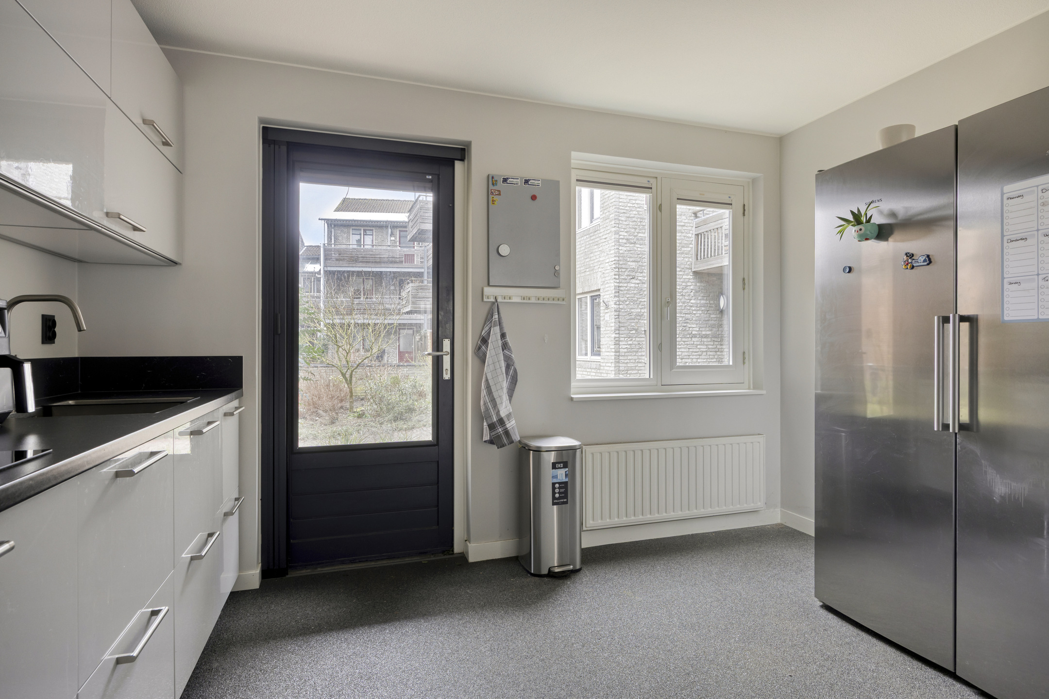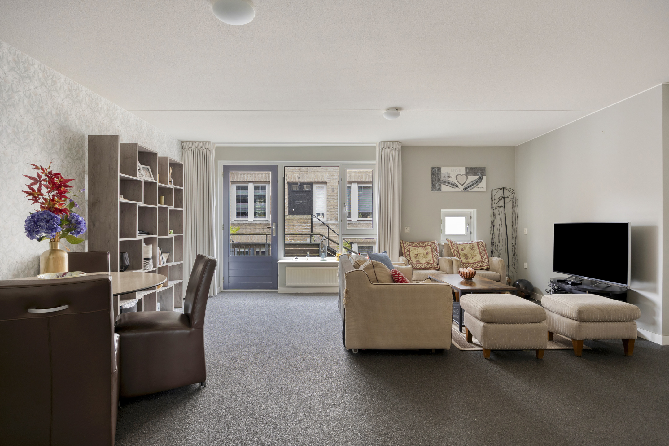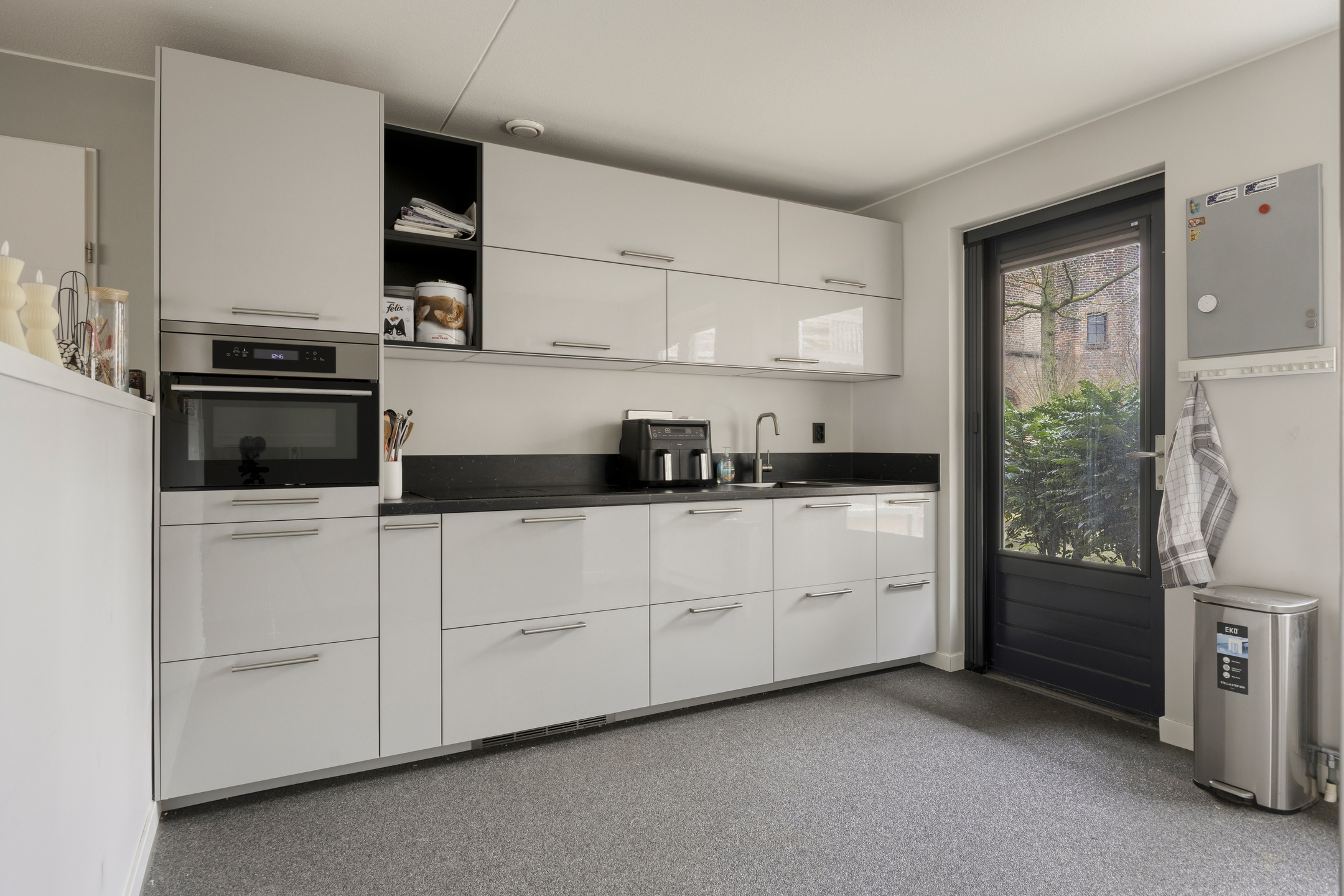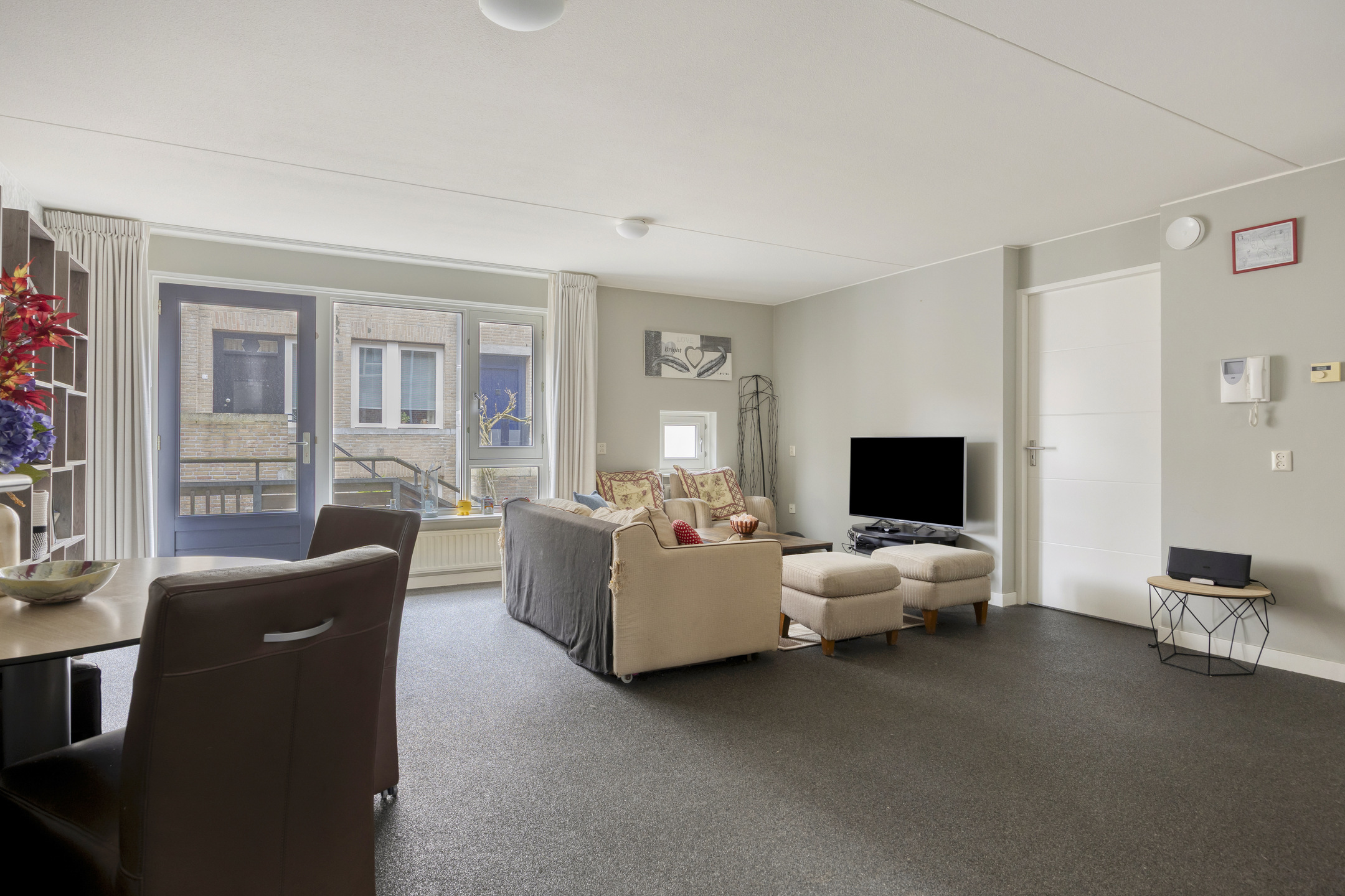 Je stapt zo het centrum van Grave in met gezellige terrasjes, winkels en historie aan je voeten, maar zodra je de voordeur van Infirmerie 15 opent, komt de rust je tegemoet. De hal is breed en uitnodigend, met direct zicht op de lichte woonkamer. Grote ramen vangen het daglicht, terwijl de moderne siergrindvloer zorgt voor een strak en verzorgd geheel. Alles op één niveau, alles af.
