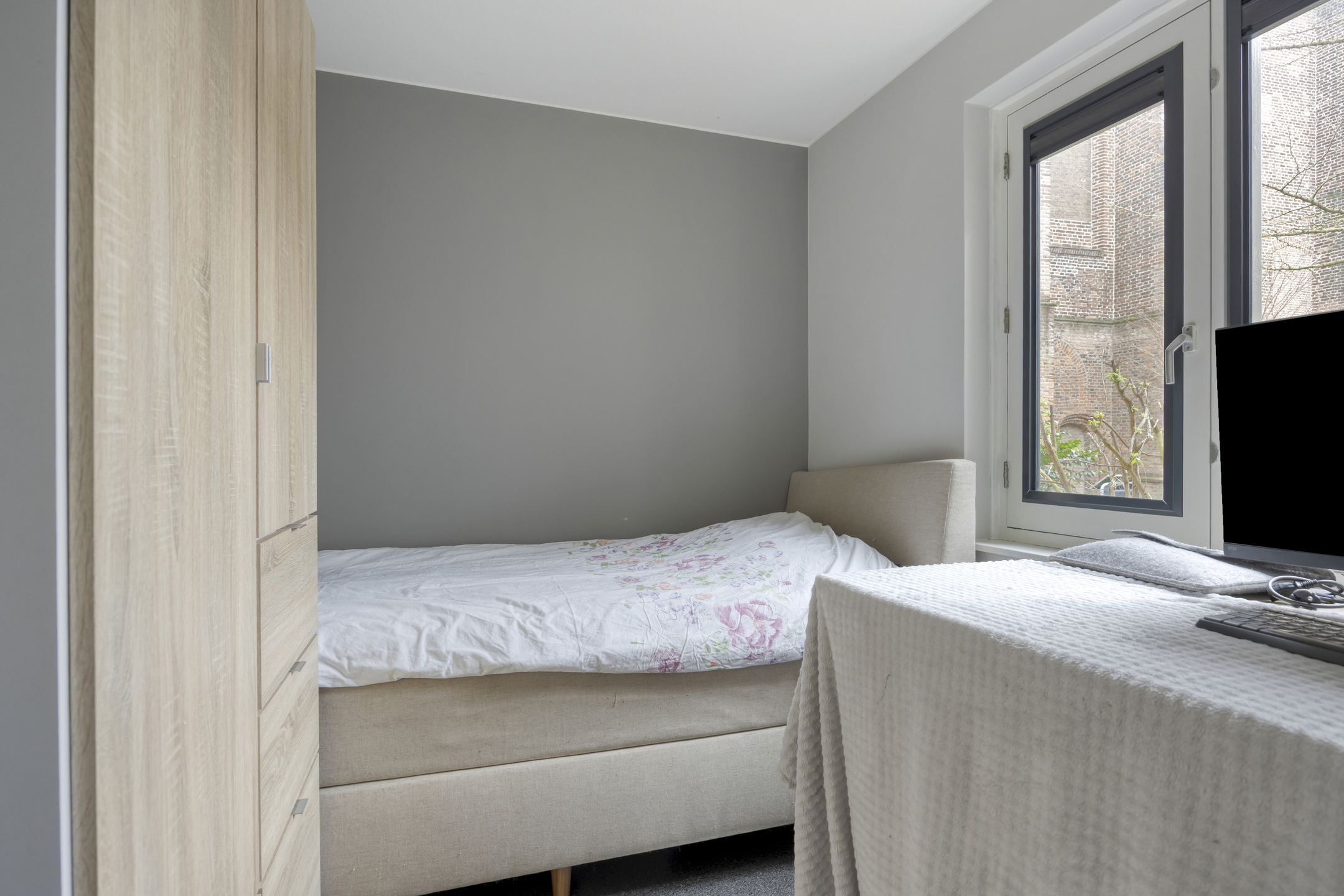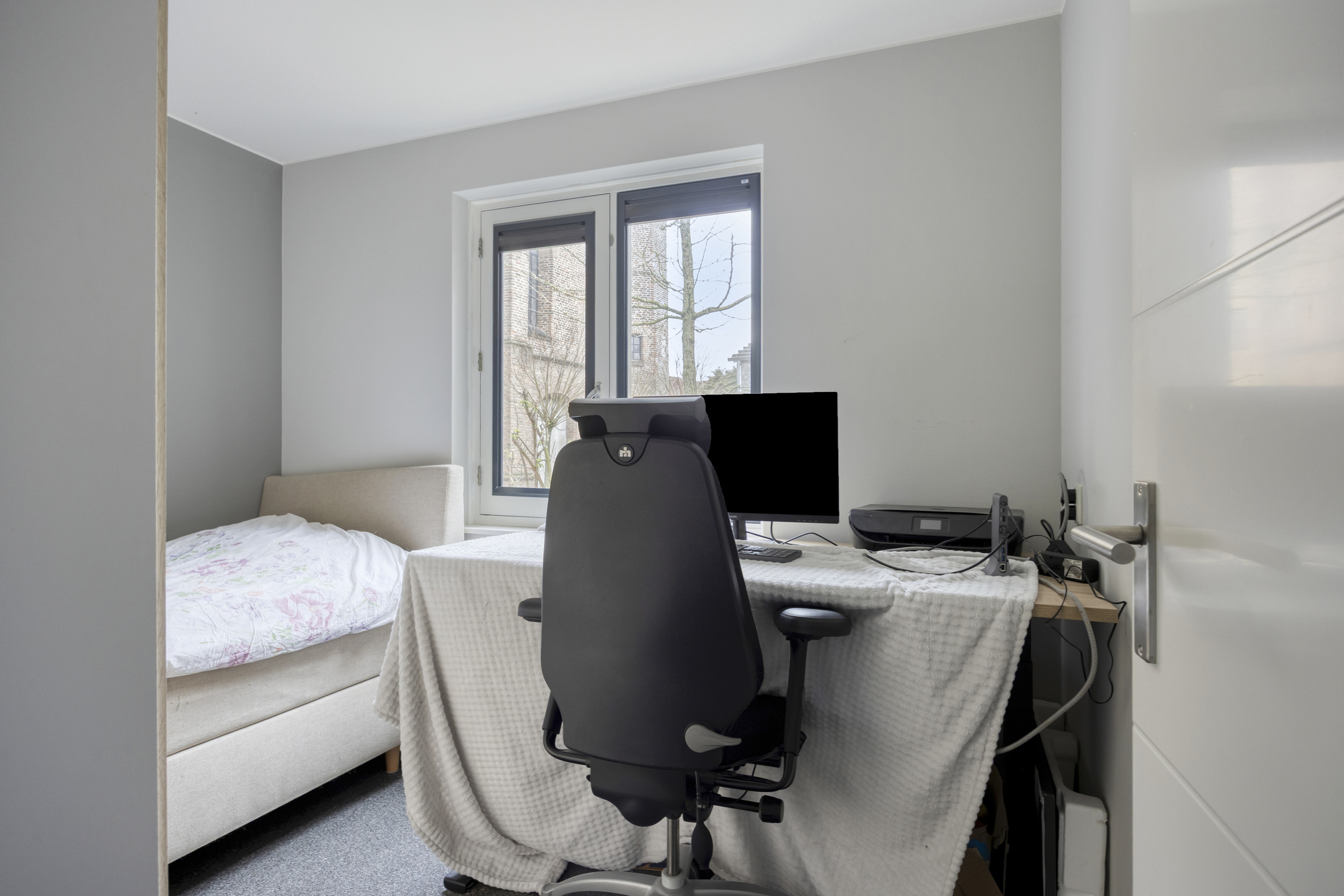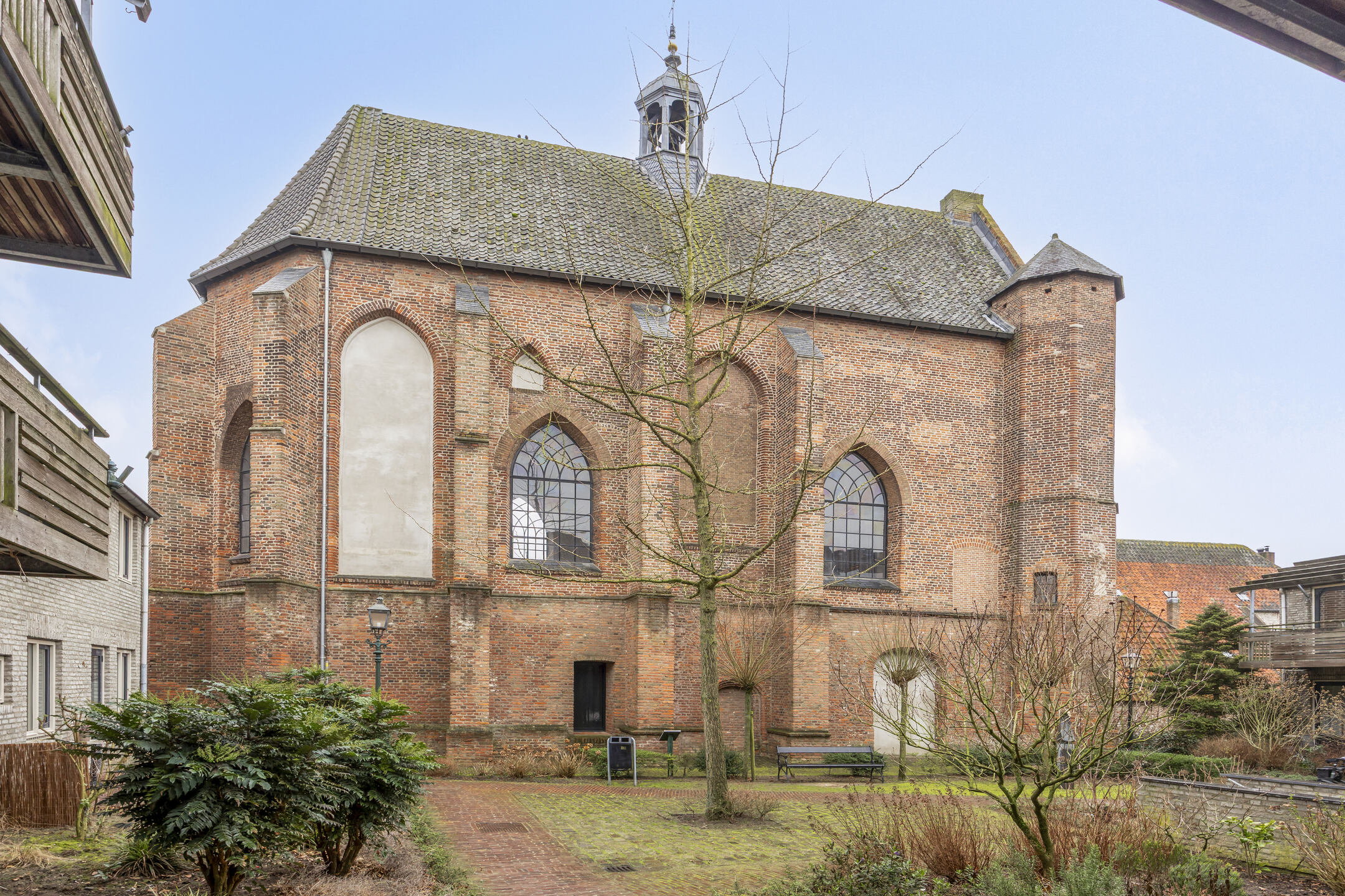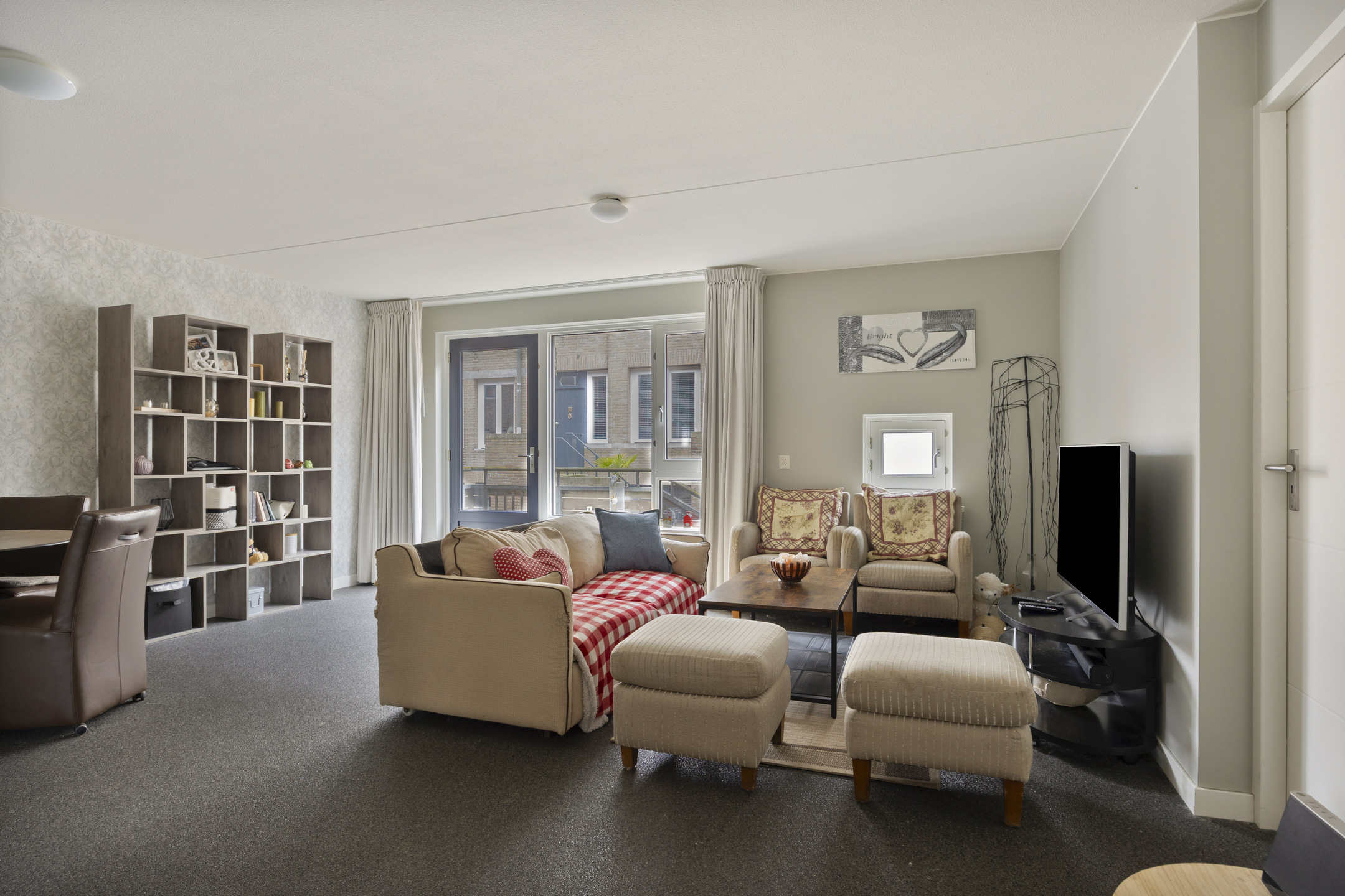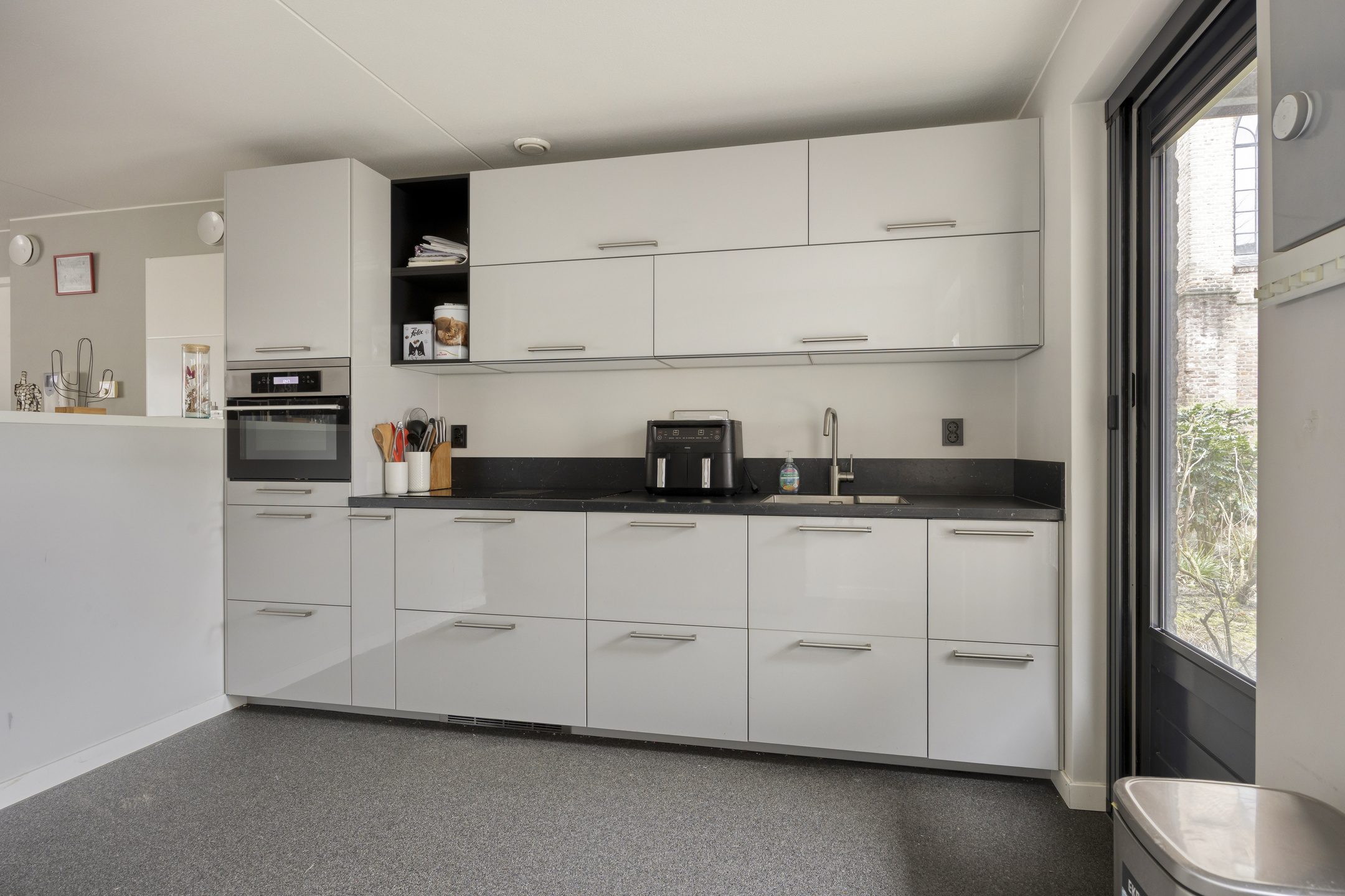 Je stapt zo het centrum van Grave in met gezellige terrasjes, winkels en historie aan je voeten, maar zodra je de voordeur van Infirmerie 15 opent, komt de rust je tegemoet. De hal is breed en uitnodigend, met direct zicht op de lichte woonkamer. Grote ramen vangen het daglicht, terwijl de moderne siergrindvloer zorgt voor een strak en verzorgd geheel. Alles op één niveau, alles af.