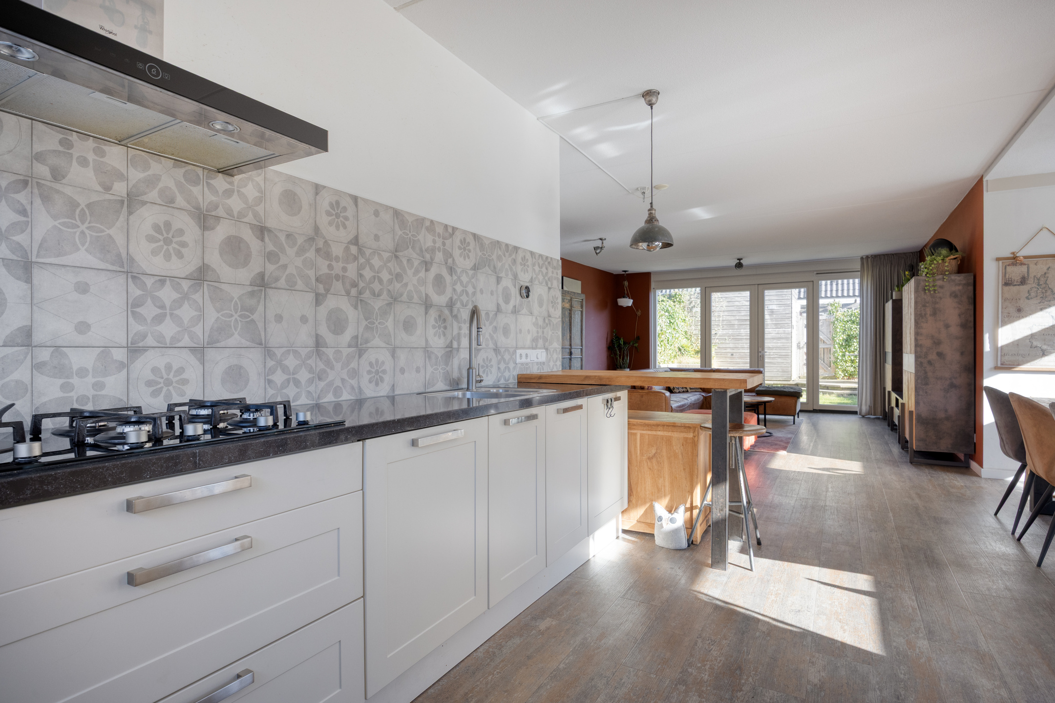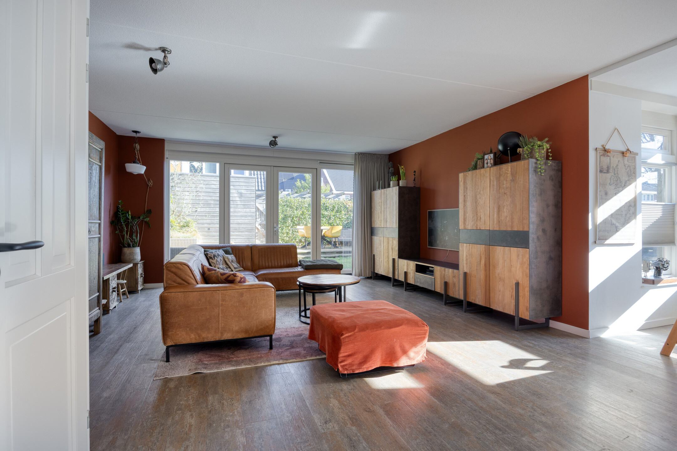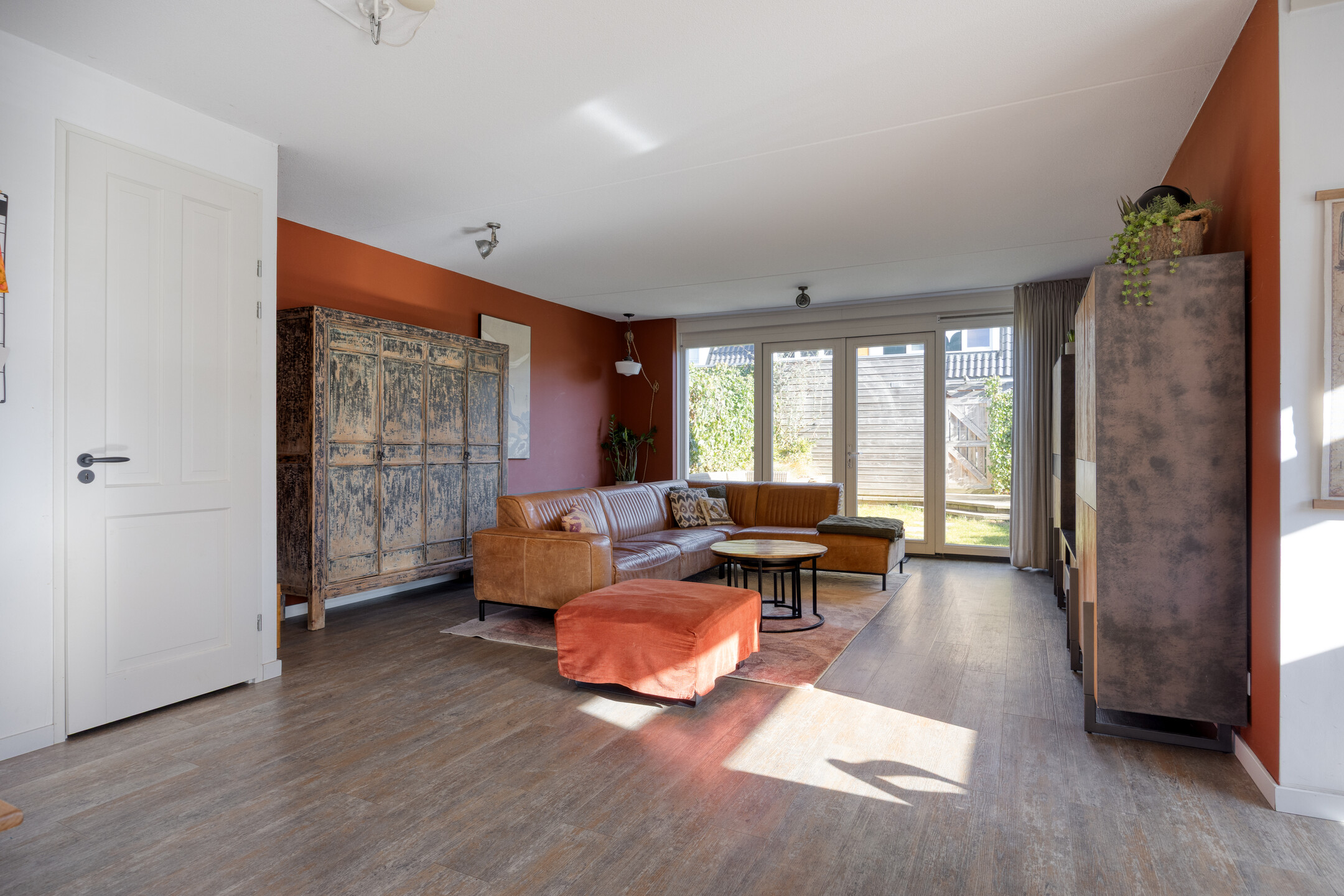 De woonkamer is royaal en profiteert van een zij erker die extra licht en ruimte toevoegt. Hier plaats je moeiteloos een gezellige eetkameropstelling en richting de openslaande deuren aan de achterkant is volop plek voor een royale zithoek. De indeling voelt logisch, open en prettig aan.
