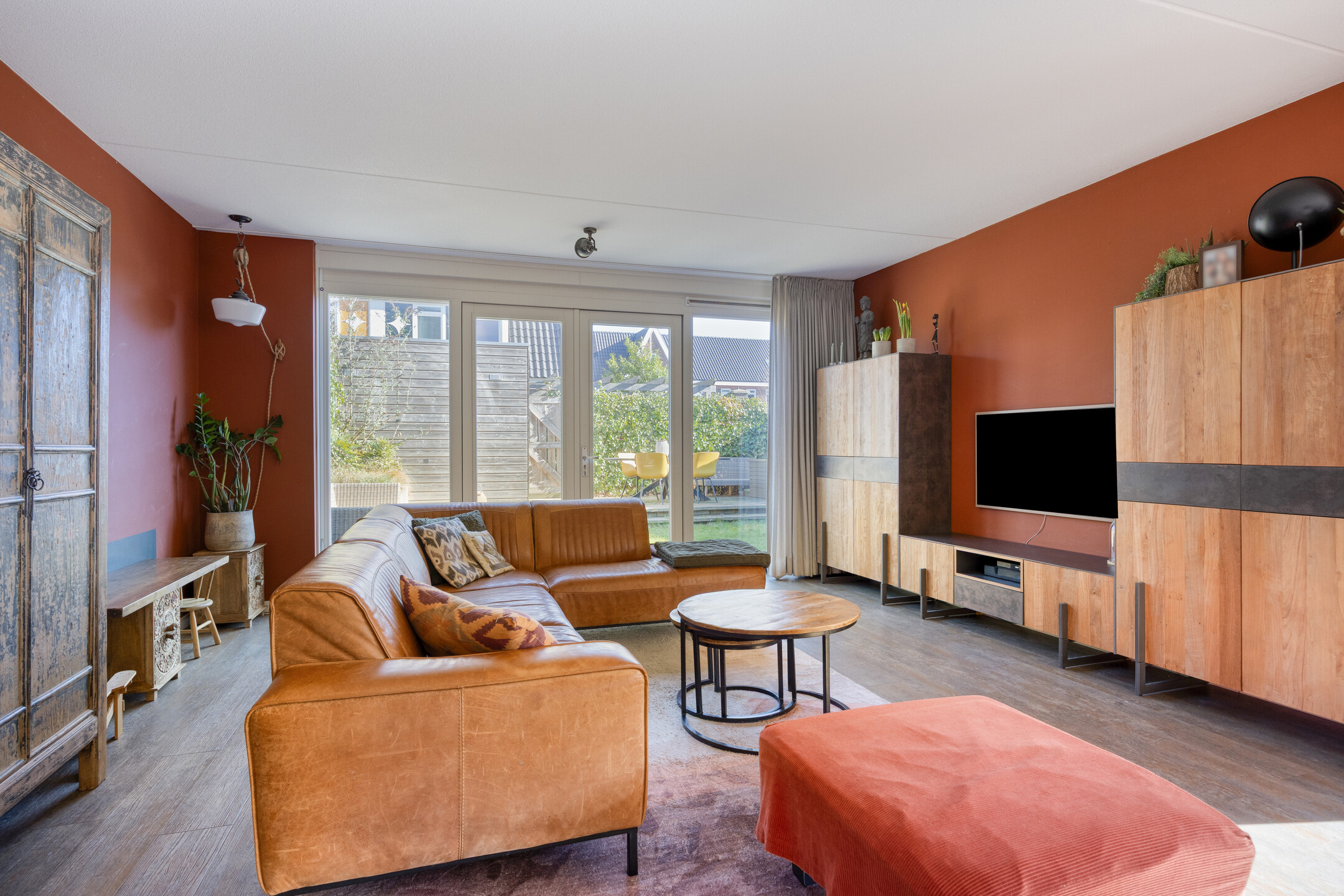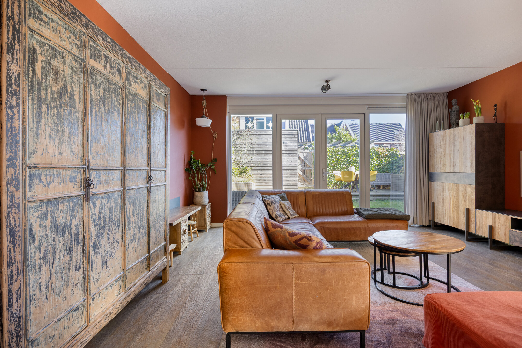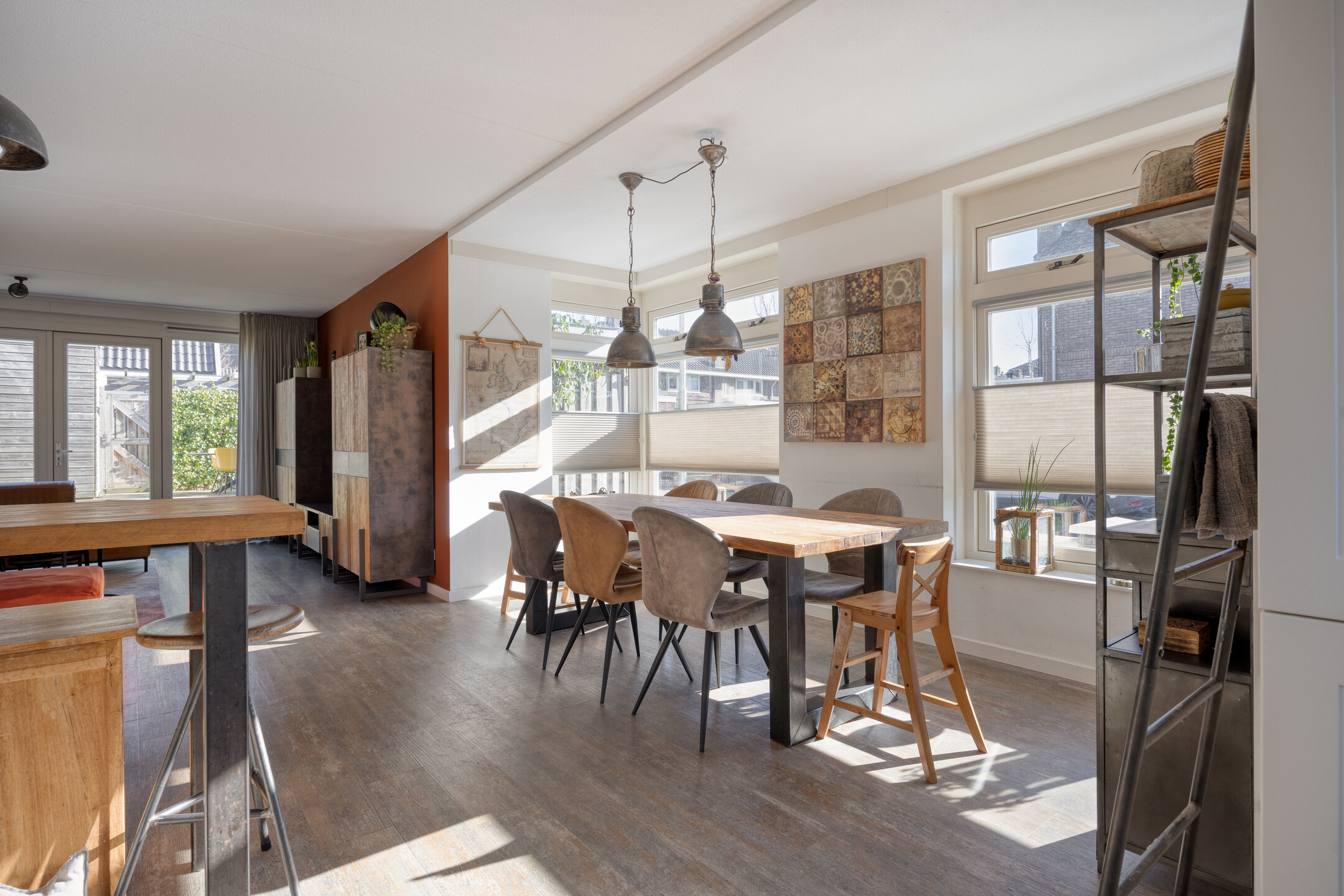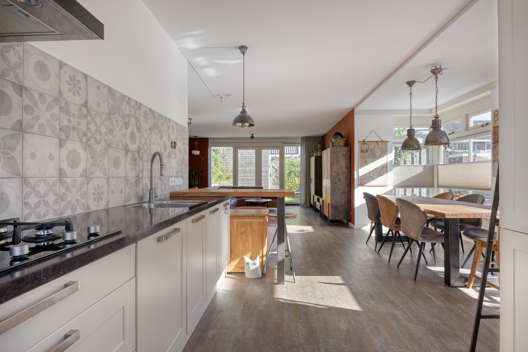 De woonkamer is royaal en profiteert van een zij erker die extra licht en ruimte toevoegt. Hier plaats je moeiteloos een gezellige eetkameropstelling en richting de openslaande deuren aan de achterkant is volop plek voor een royale zithoek. De indeling voelt logisch, open en prettig aan.