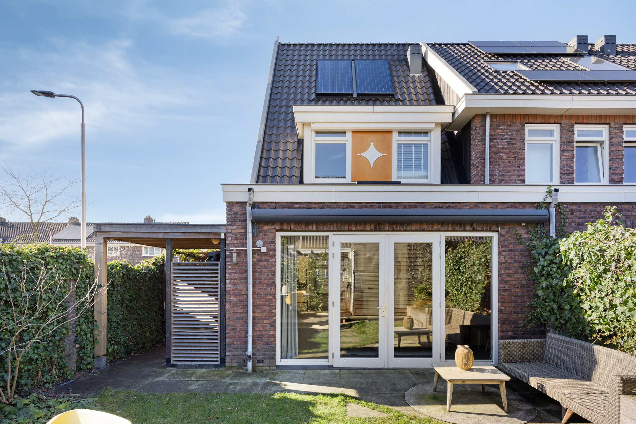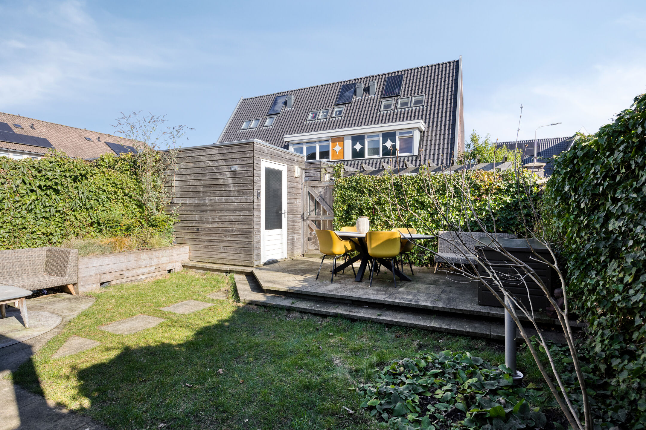 De woning beschikt over een heerlijke tuin aan de voor-, zij- en achterkant. De achtertuin ligt op het oosten en biedt volop privacy, een berging, overdekte opslag aan de zijkant en een praktische achterom. Hier start je de dag in de ochtendzon en geniet je in alle rust van het buitenleven.