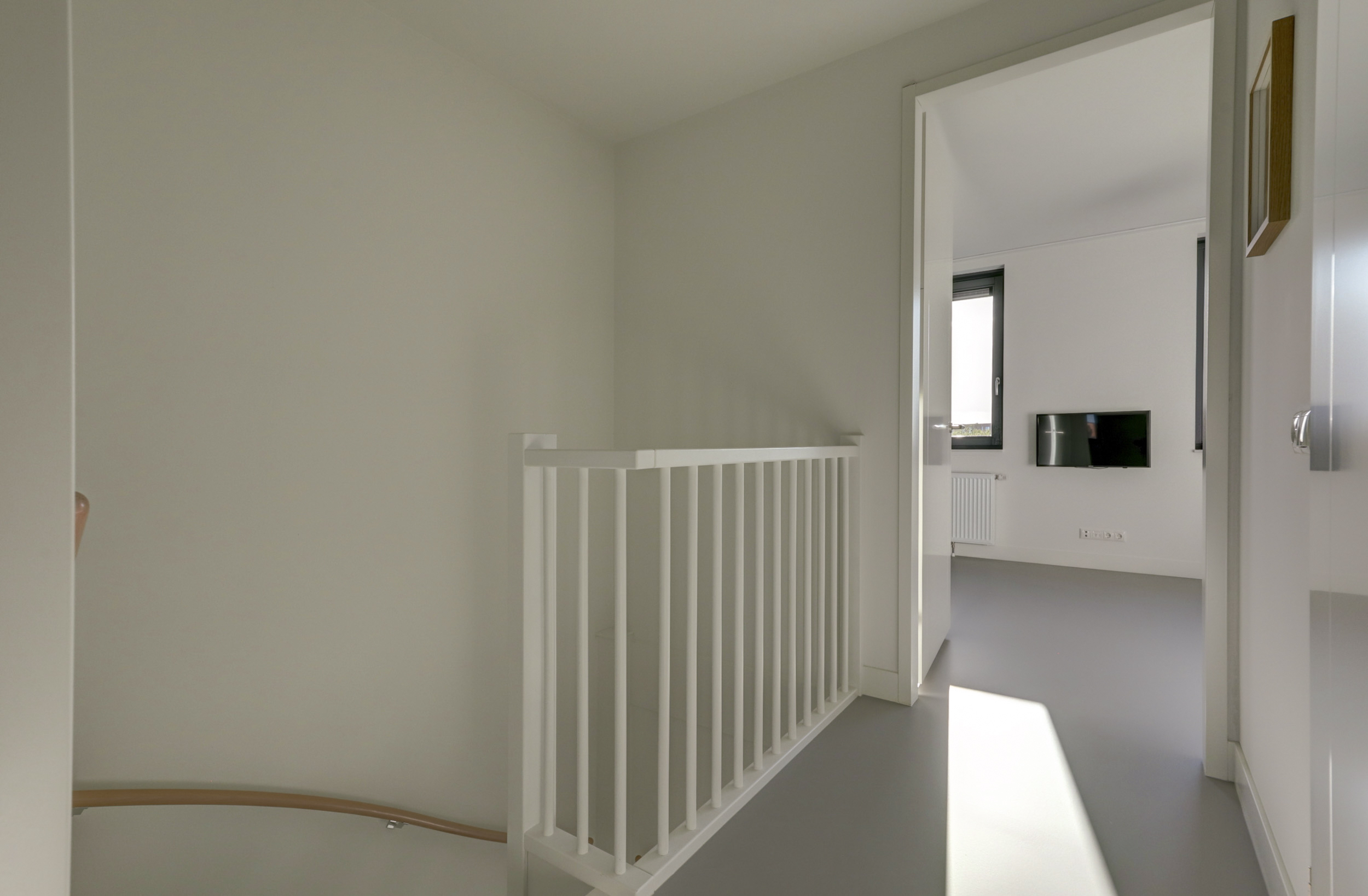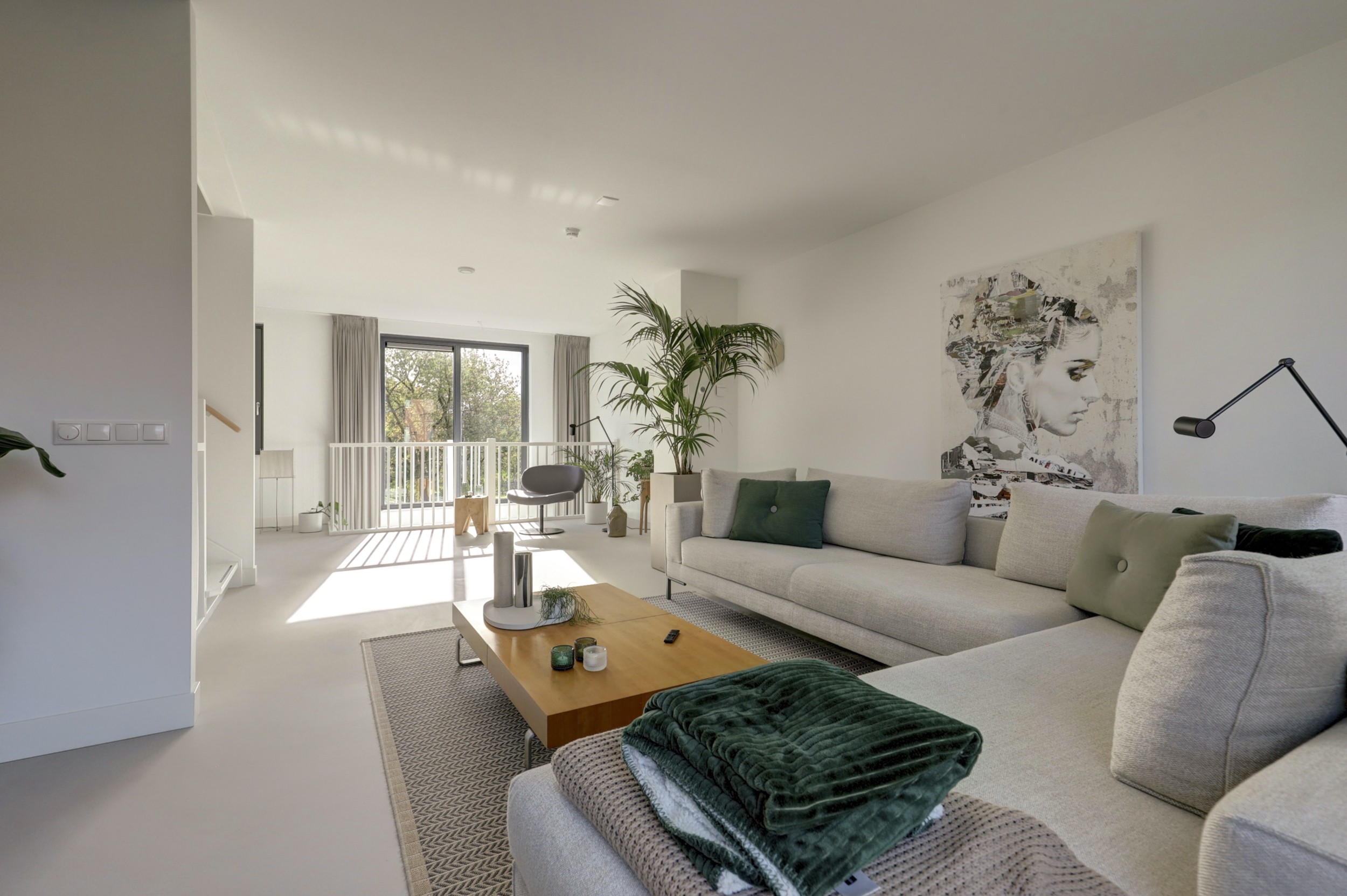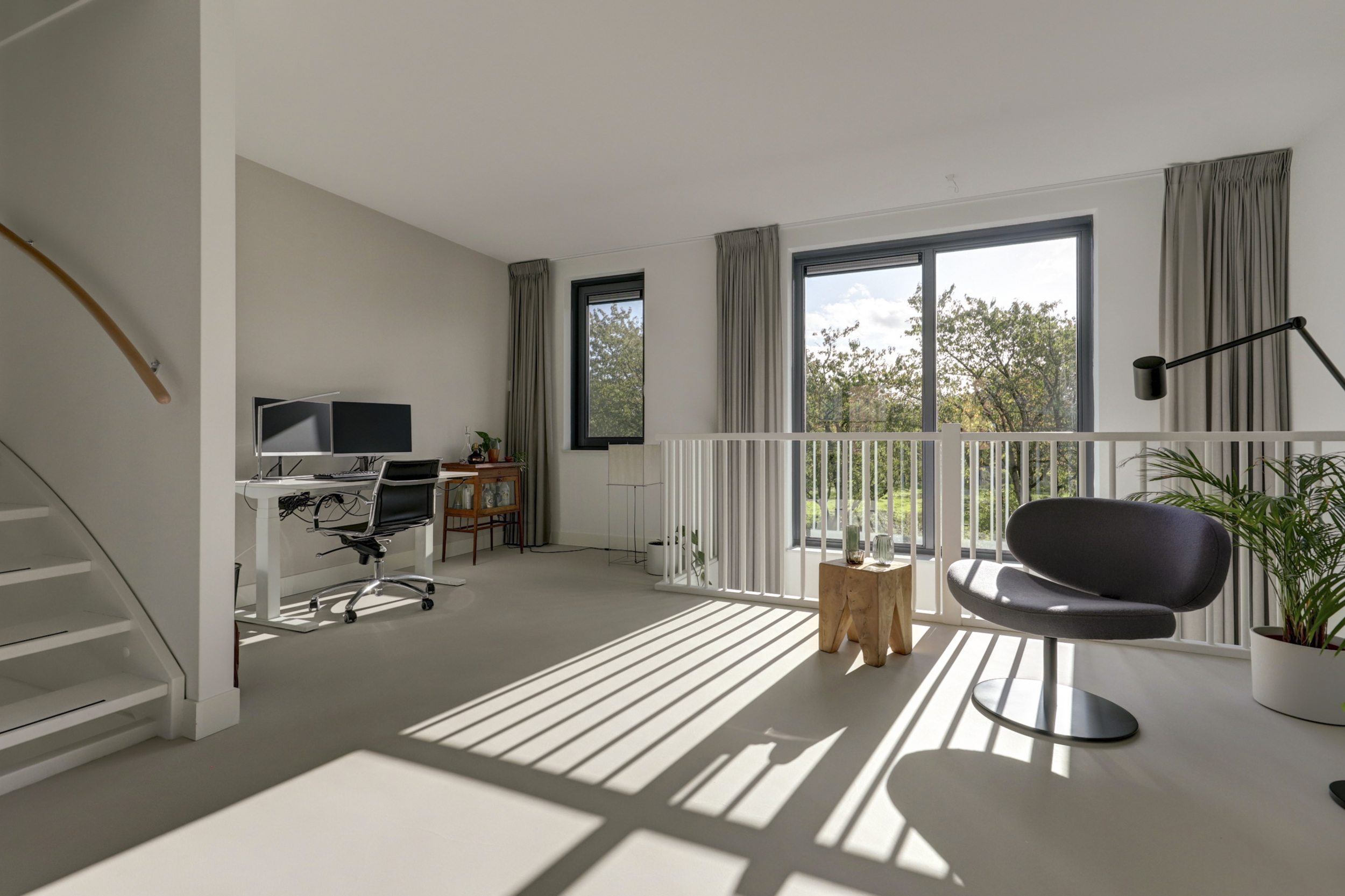 Op de eerste verdieping vind je de woonkamer, een indrukwekkende ruimte met vide en een plafondhoogte die direct een gevoel van vrijheid en licht oproept. De grote raampartijen zorgen voor een prettige lichtinval en een prachtig uitzicht over het park – ideaal voor wie houdt van openheid en rust.