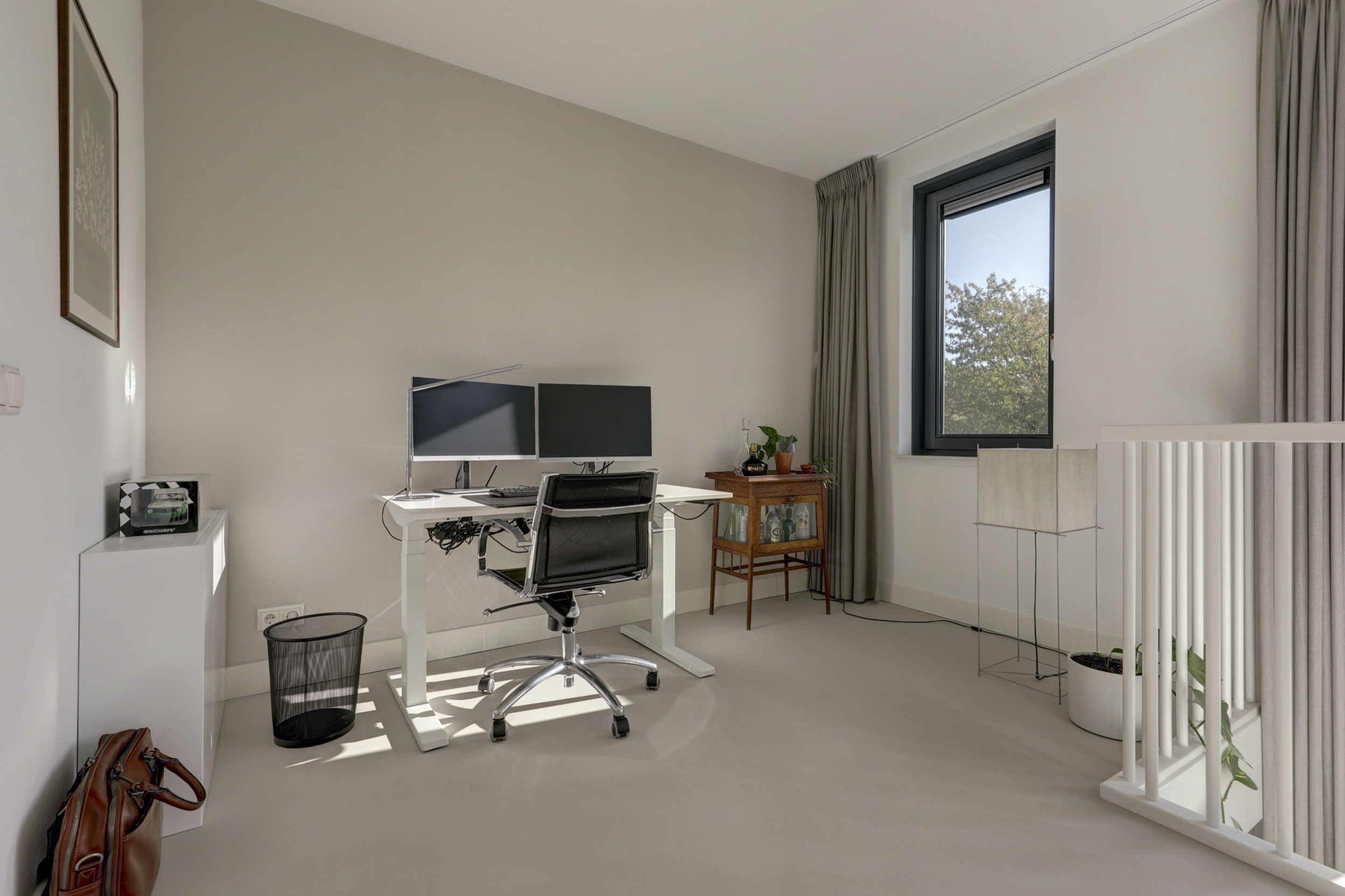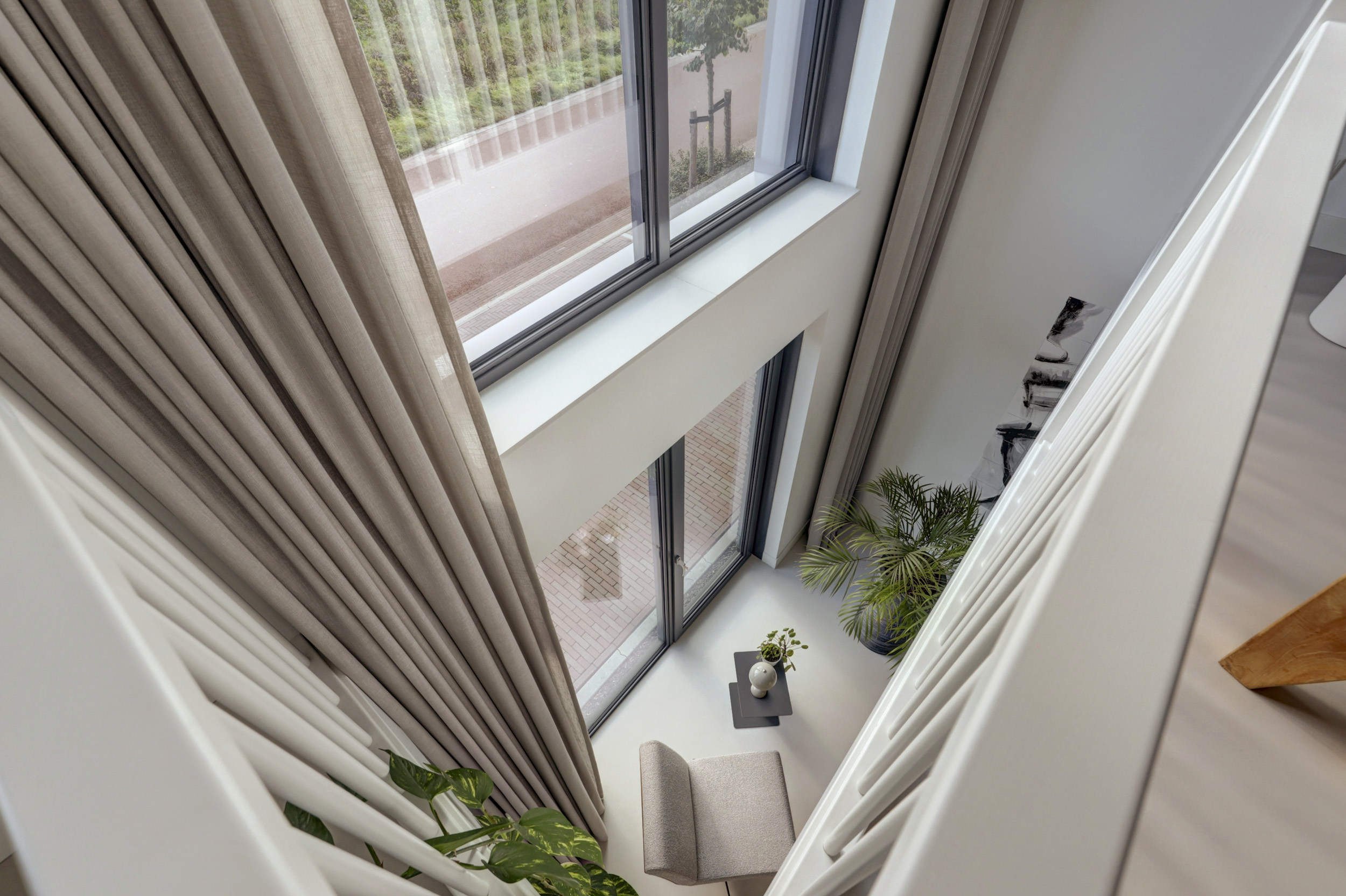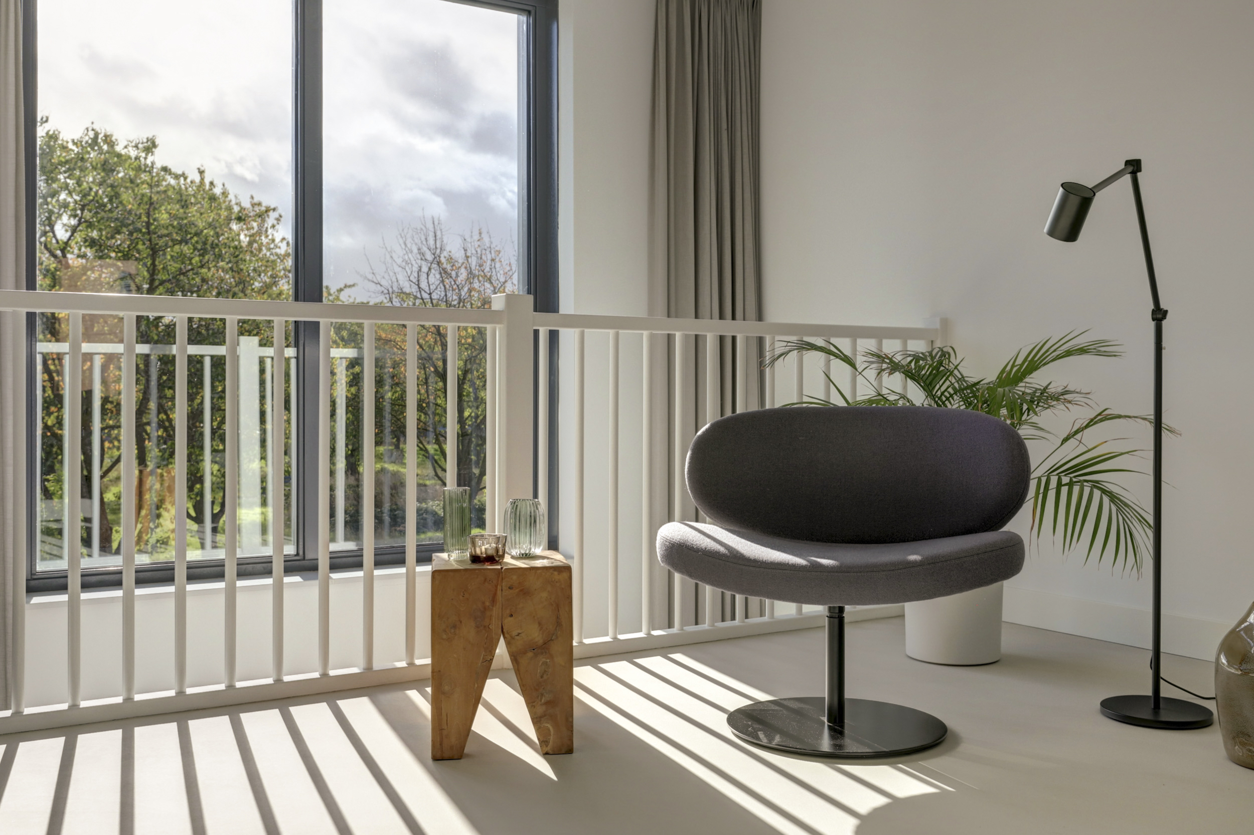 Op de eerste verdieping vind je de woonkamer, een indrukwekkende ruimte met vide en een plafondhoogte die direct een gevoel van vrijheid en licht oproept. De grote raampartijen zorgen voor een prettige lichtinval en een prachtig uitzicht over het park – ideaal voor wie houdt van openheid en rust.